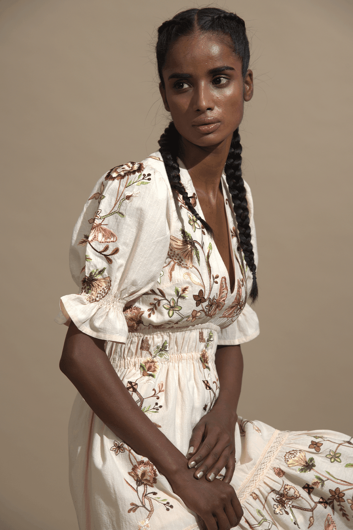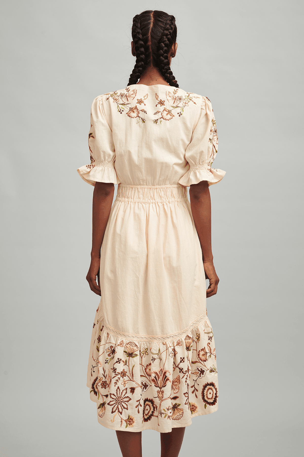 Tiered midi dress with multicolor floral embroidery. High-low hem. Ruching at the waist. Elasticated elbow-length sleeve.