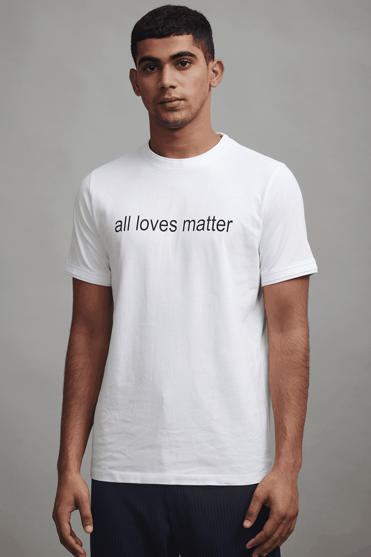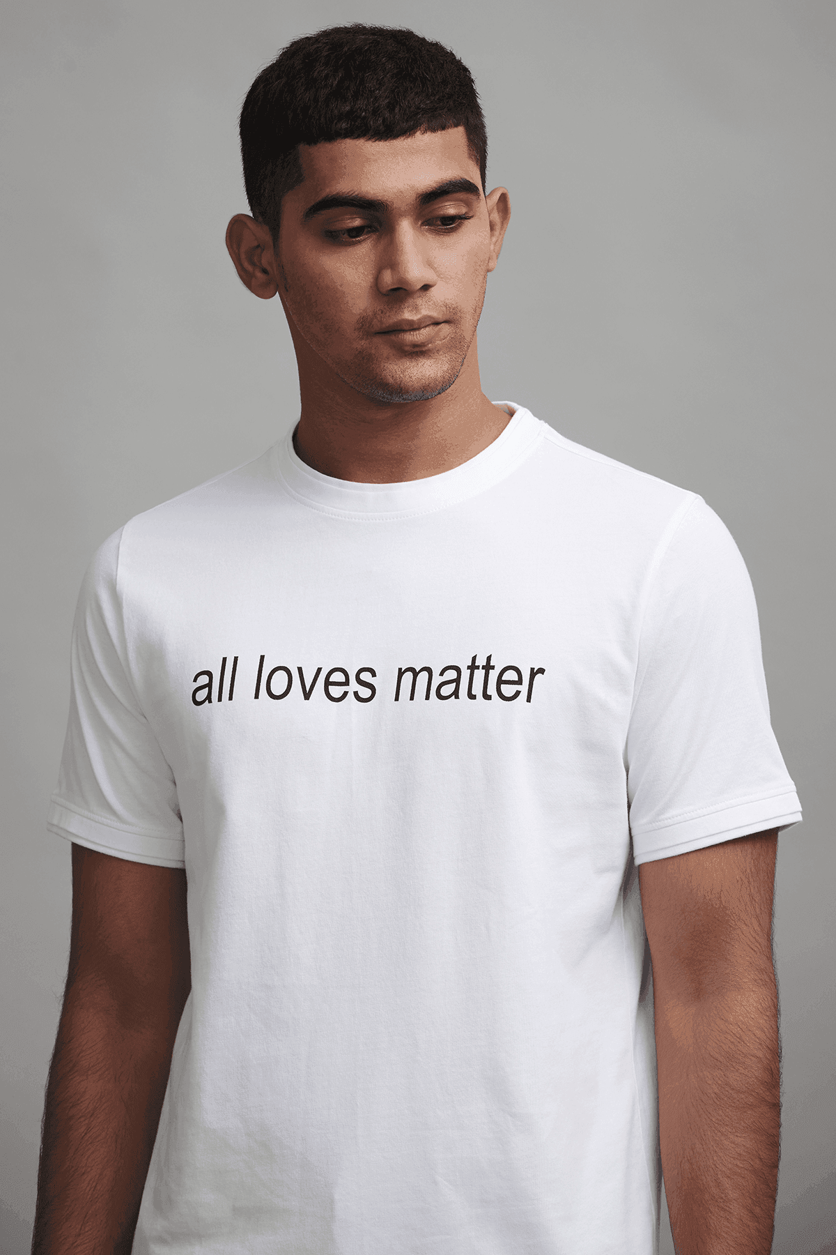 Basic, short sleeve crew-neck tee with contrast 'all loves matter' print. Sustainably sourced organic cotton.