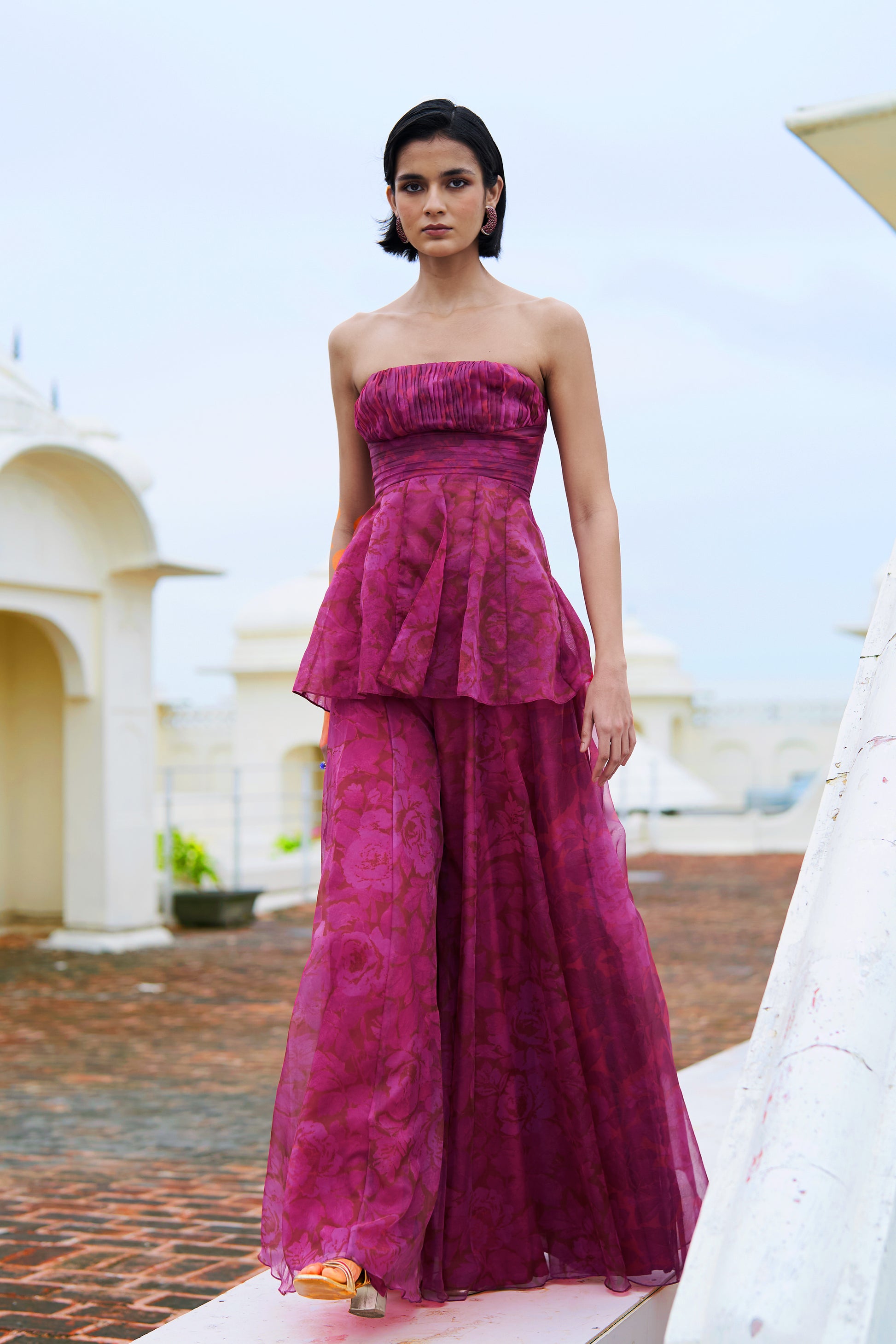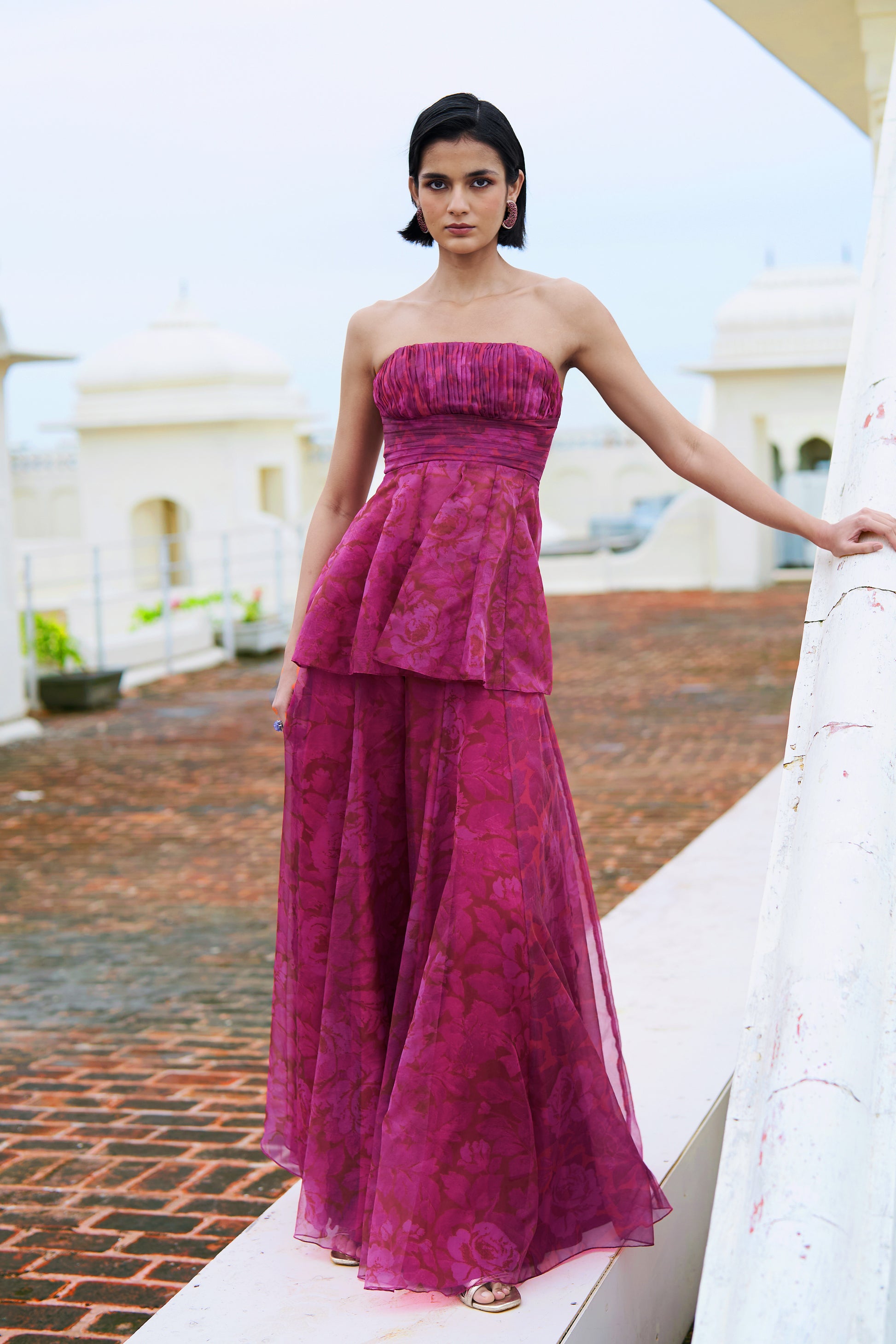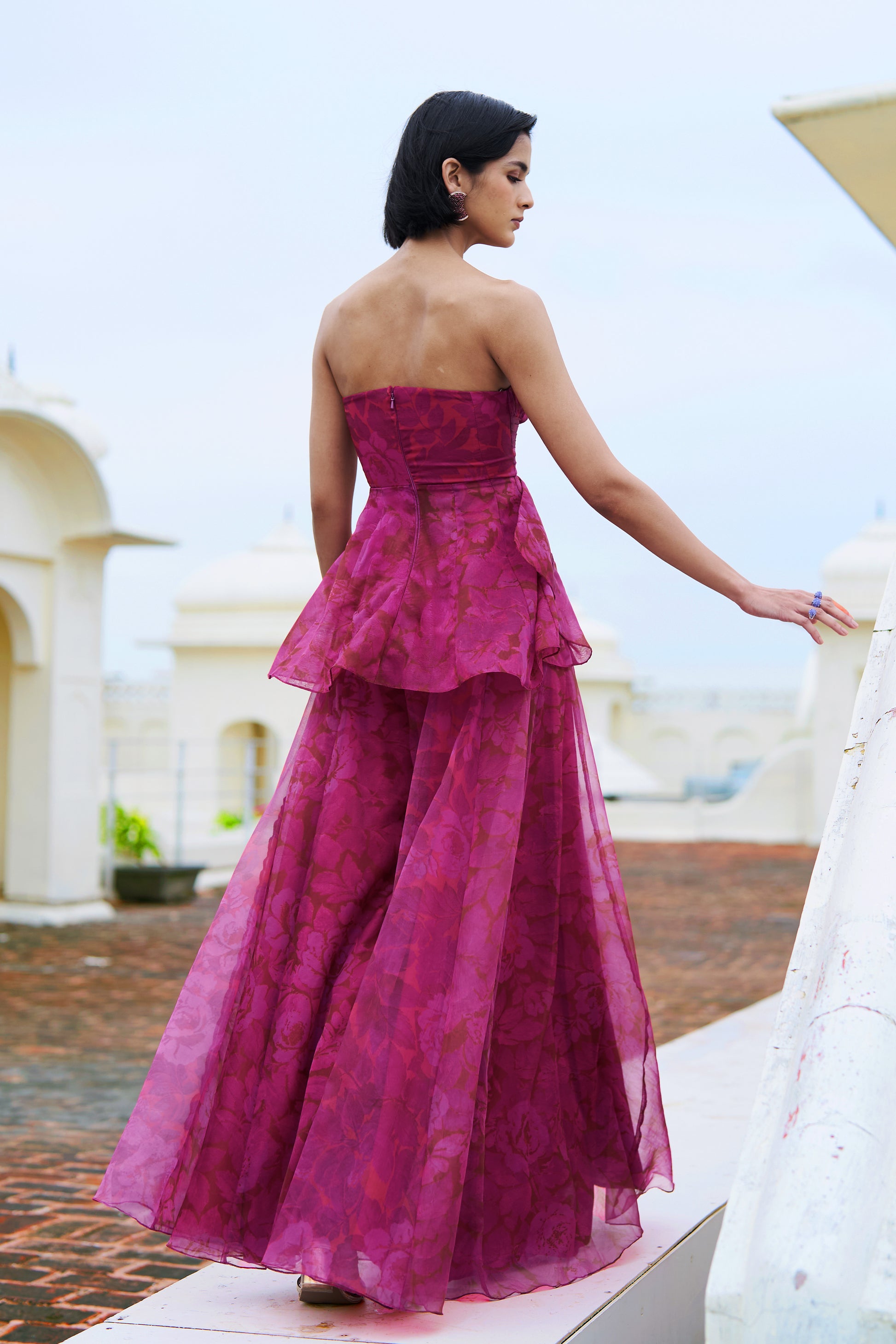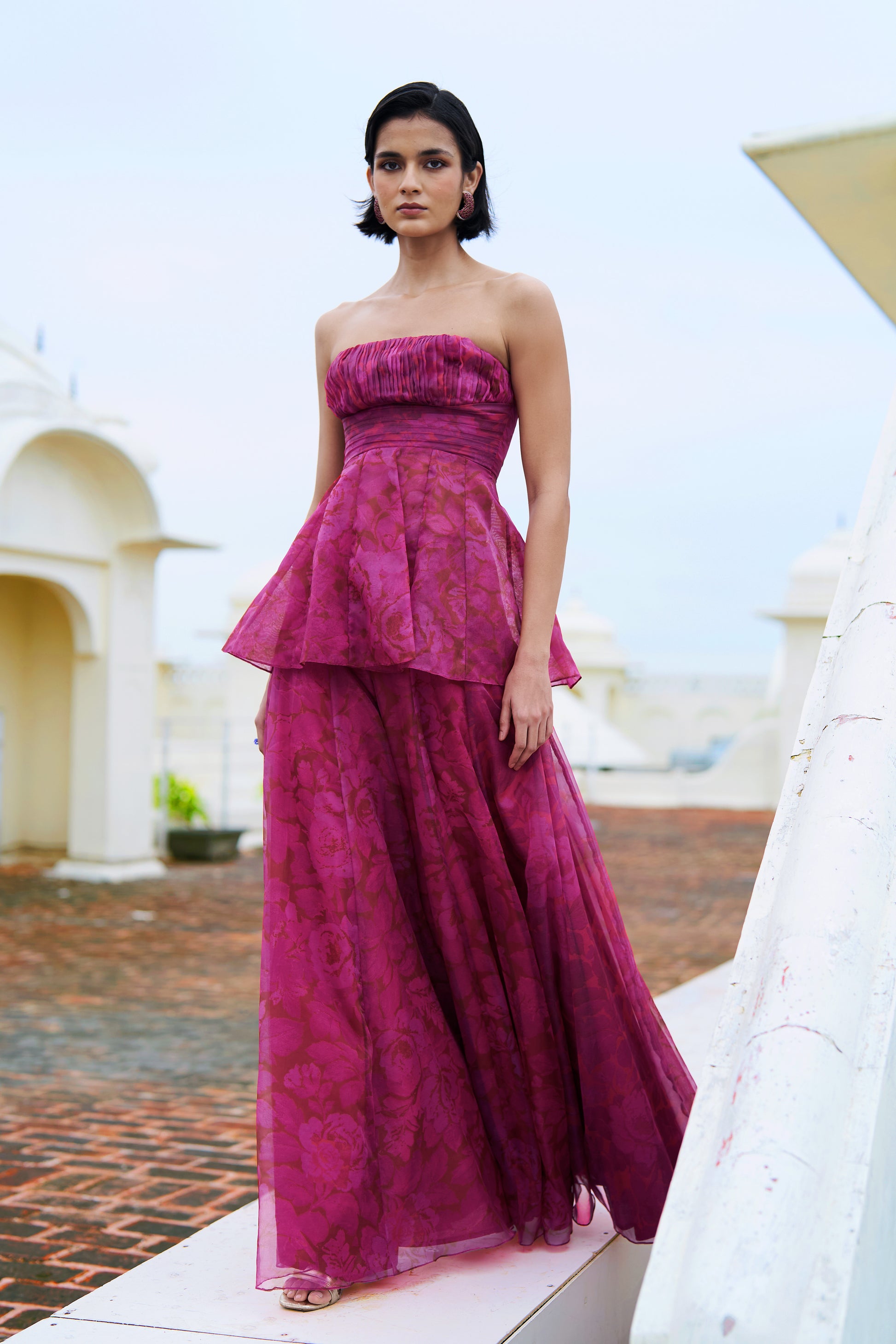 Off-shoulder peplum top in double-layered soft organza with an abstract rose watercolor print. Hand-applied pleats at the top with an A-line flare and a front slit. Back zipper closure. Garment is semi-lined.