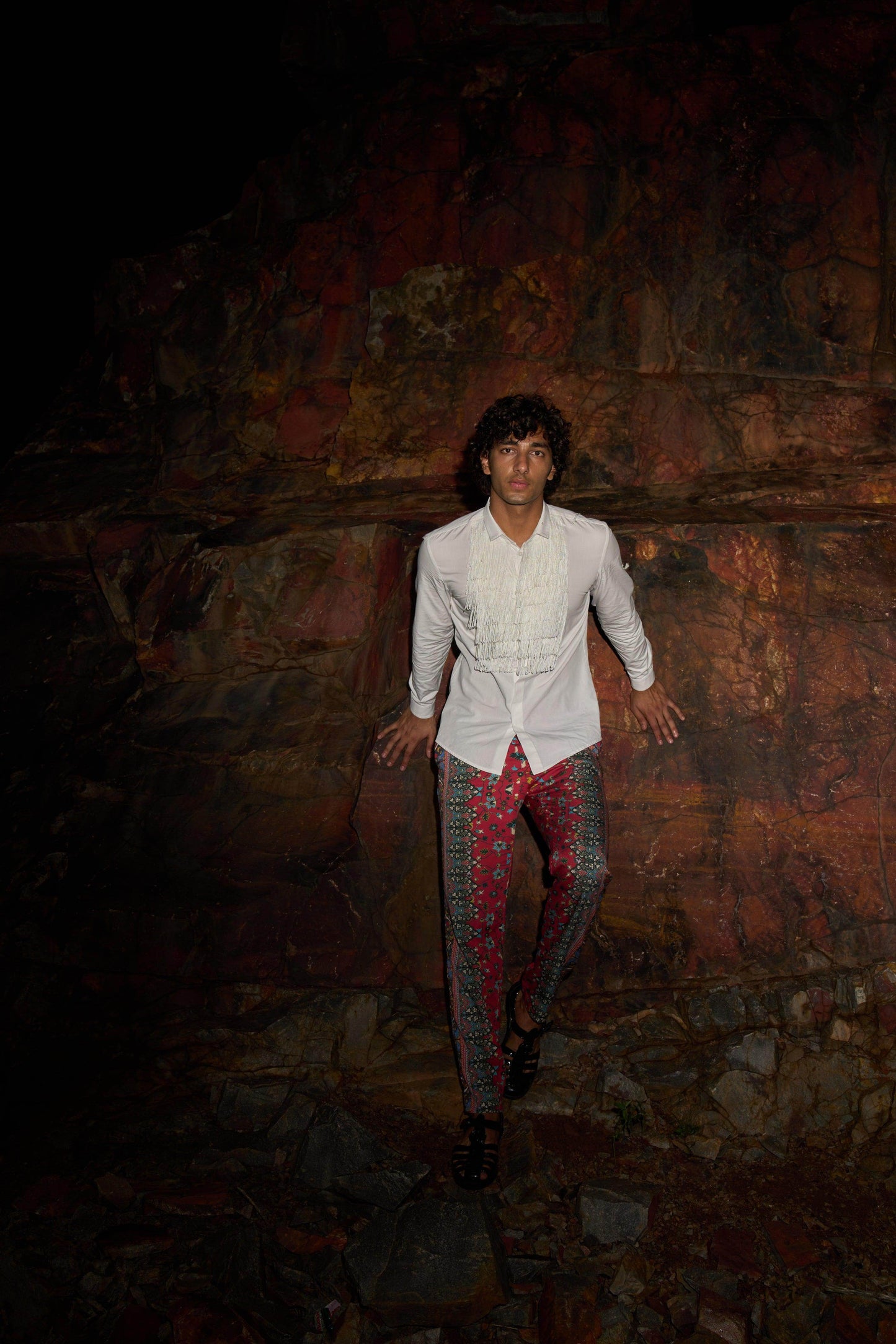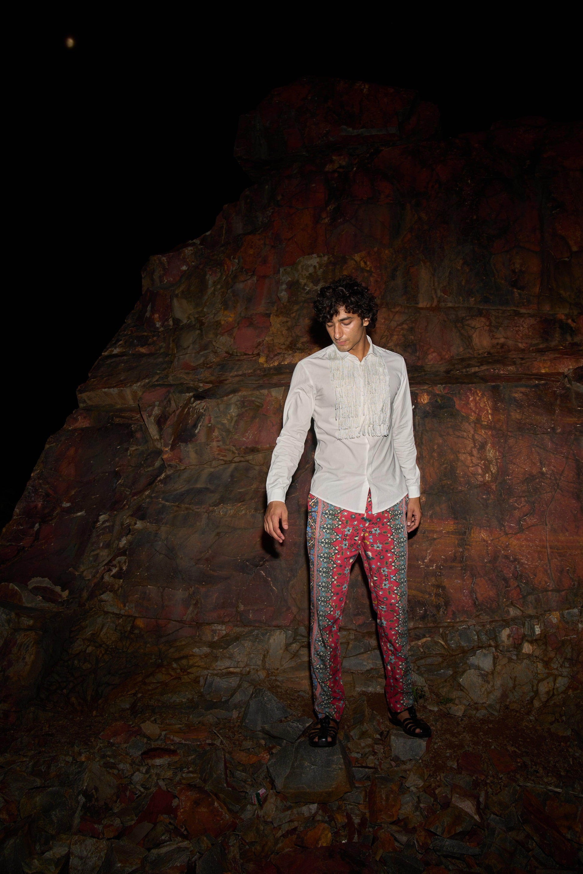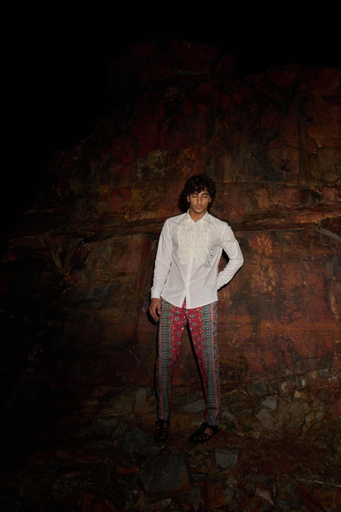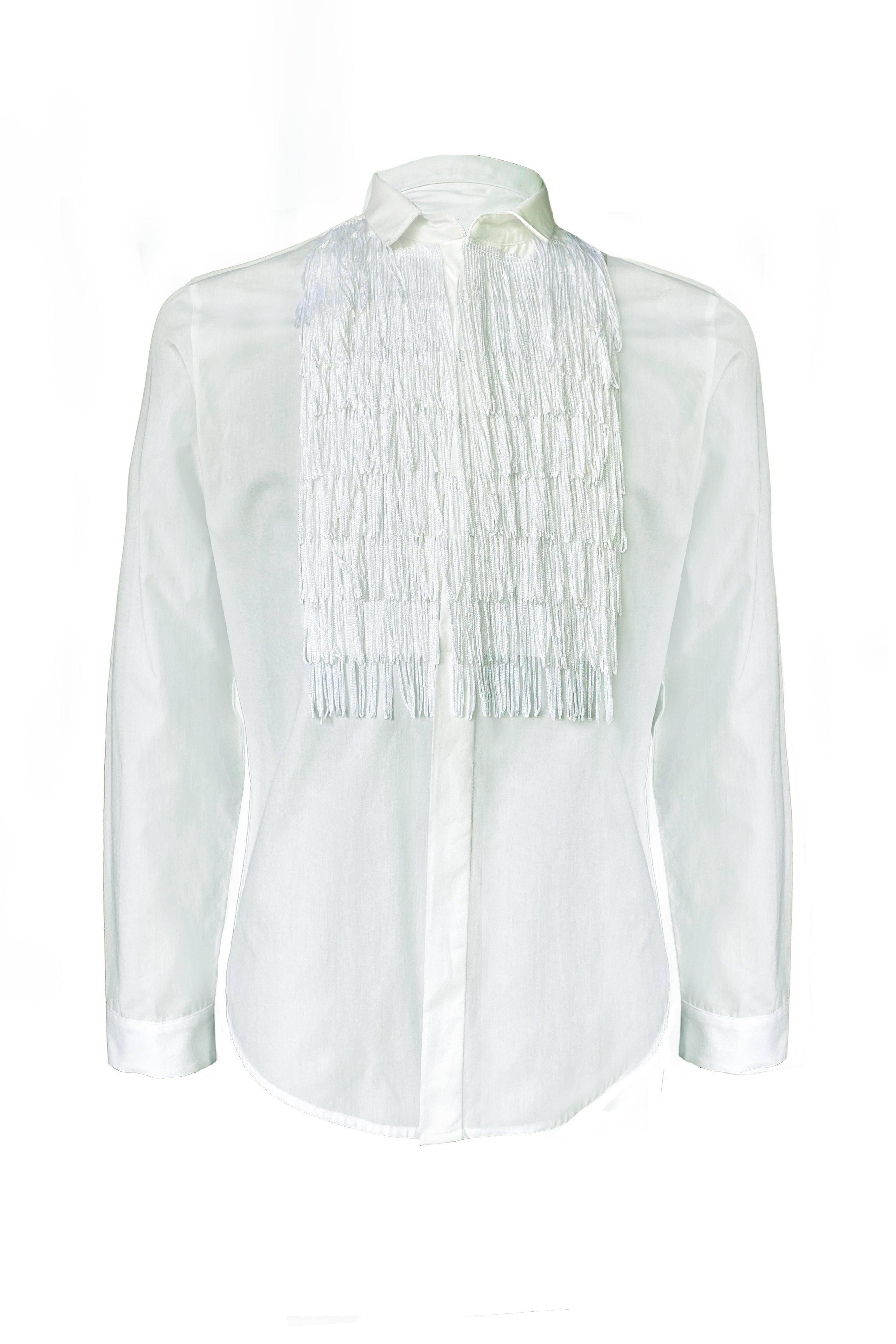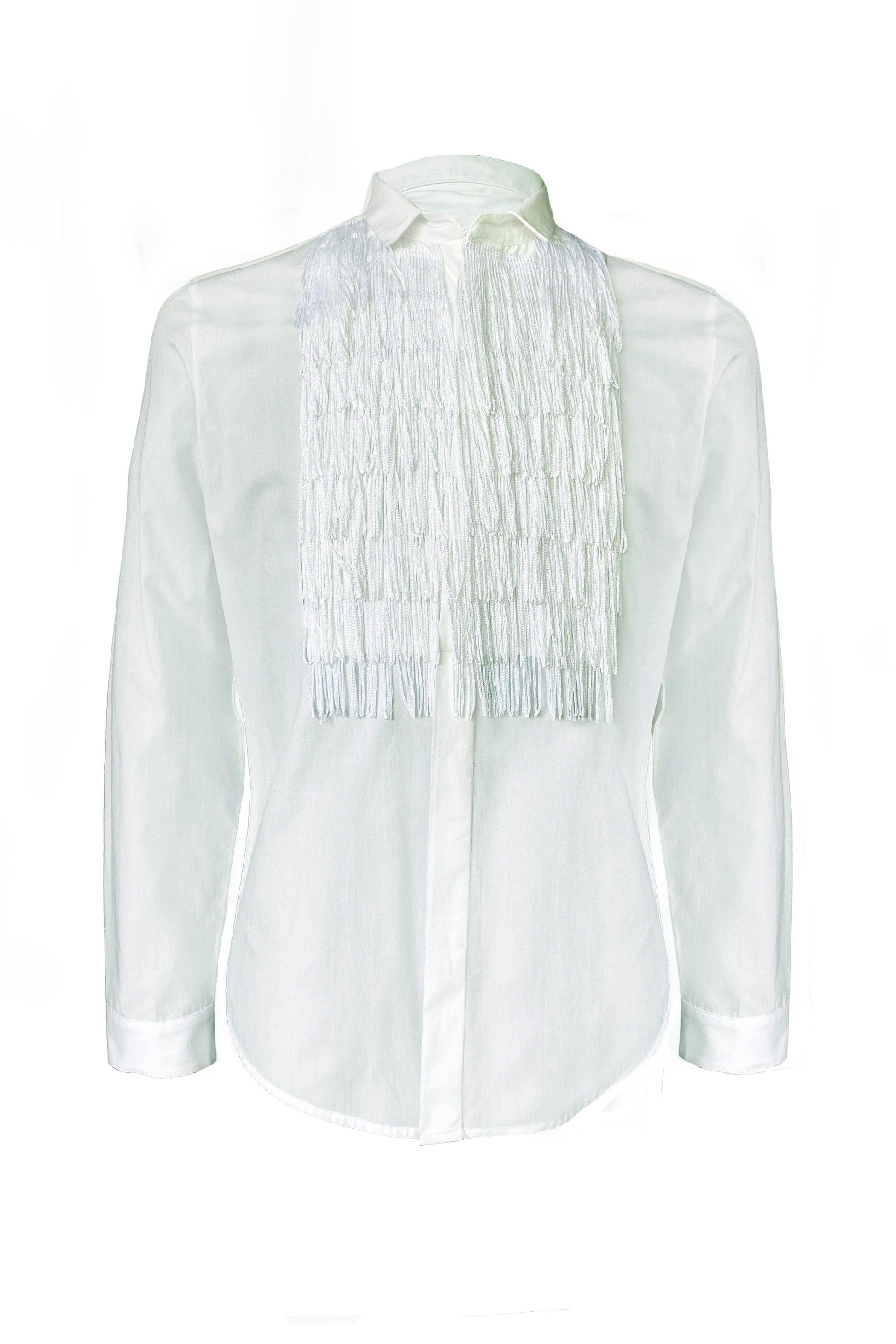 White button-down shirt with cascading layered fringe detailing at the bib. Concealed placket. Regulat fit poplin shirt.