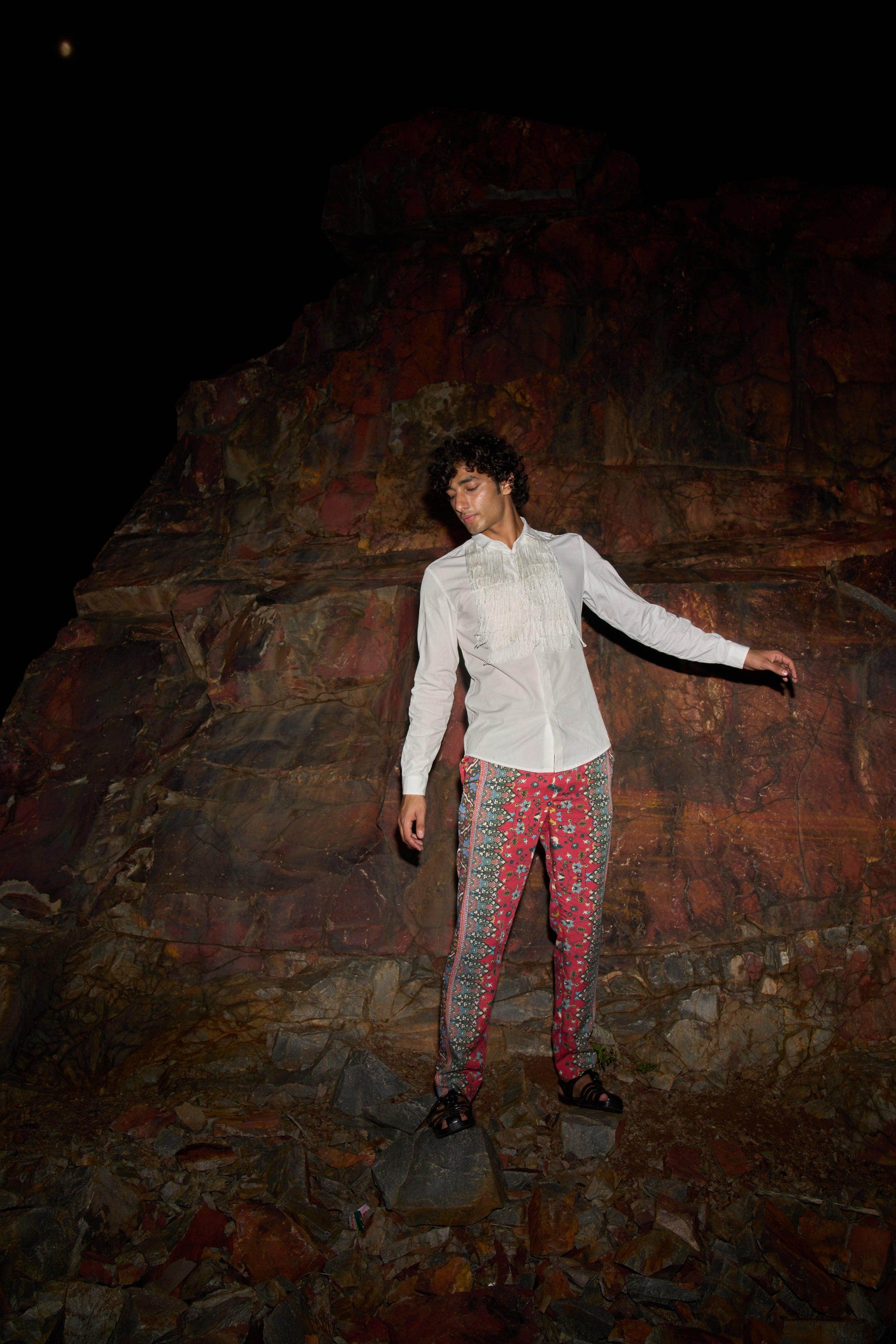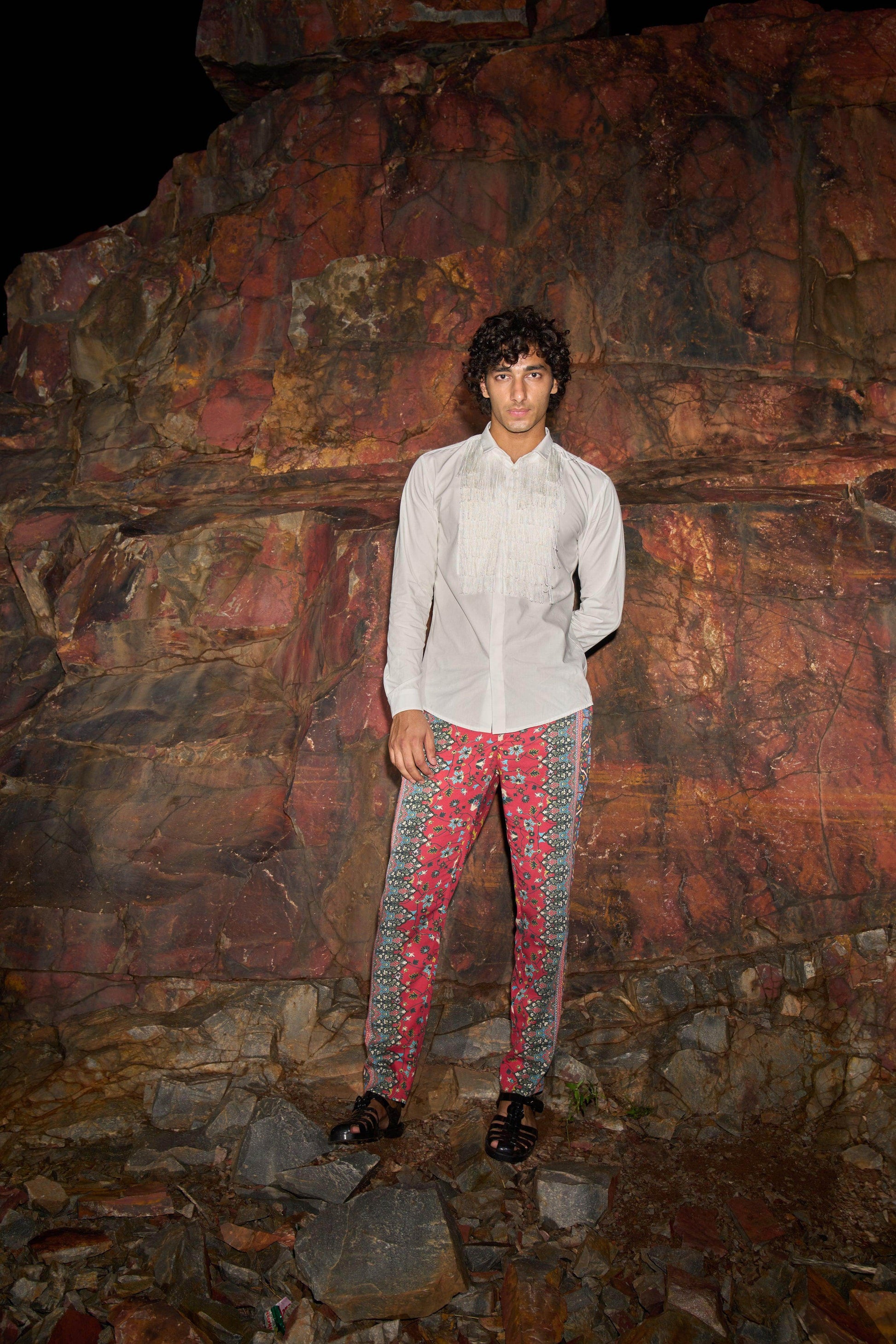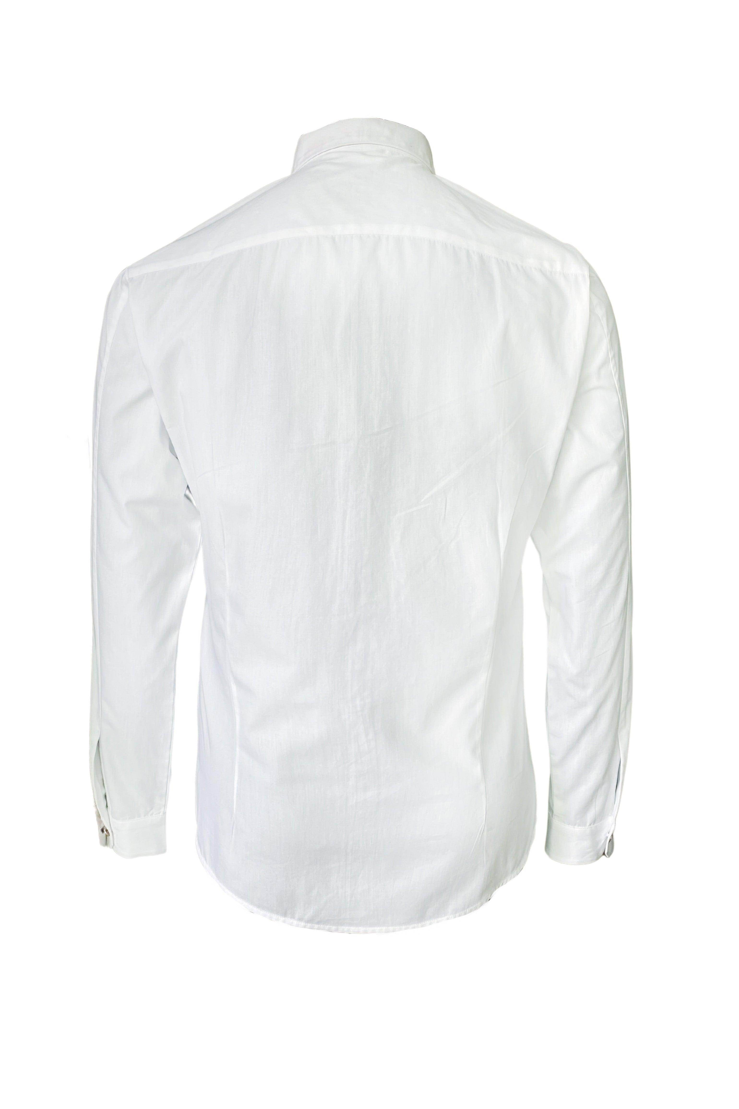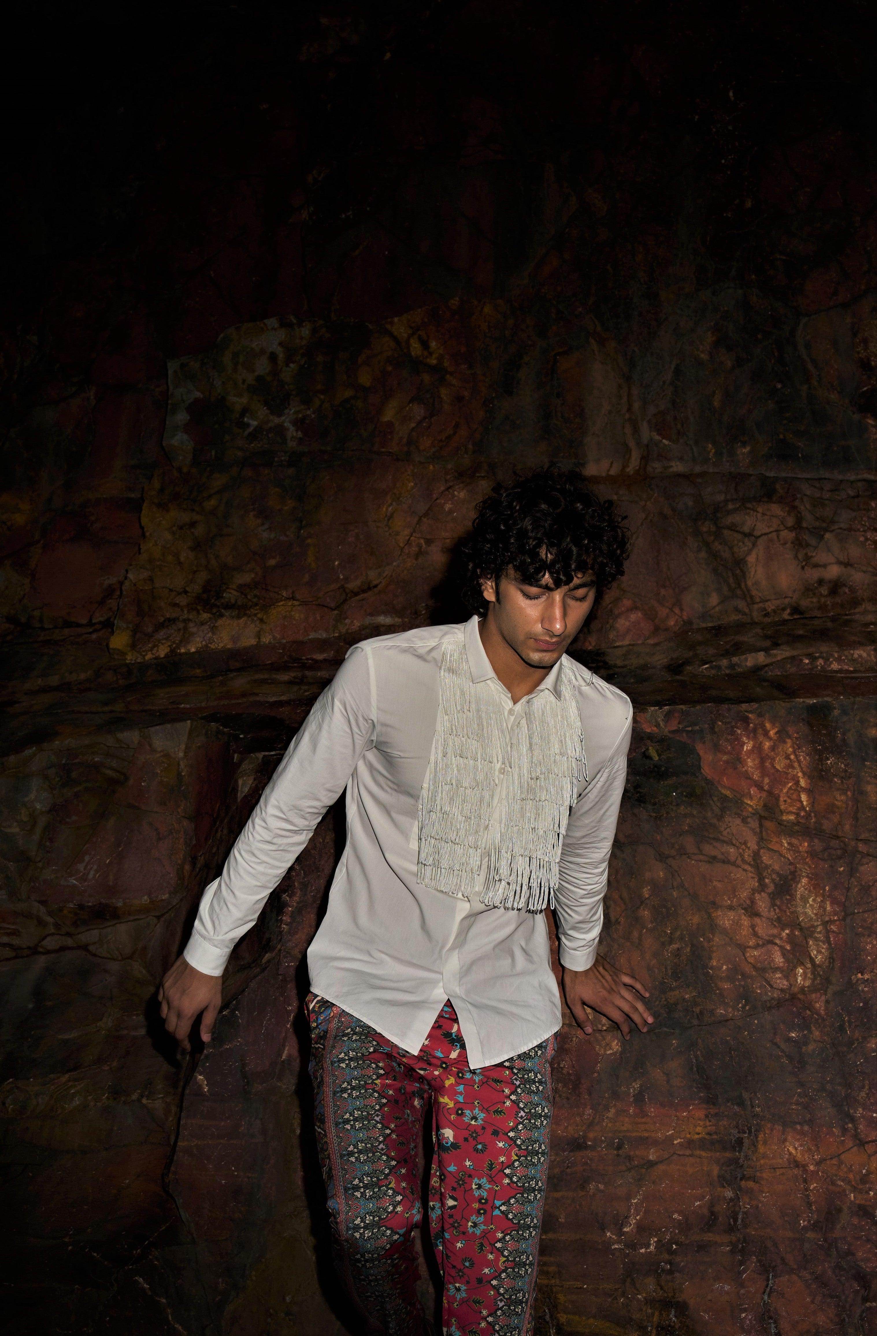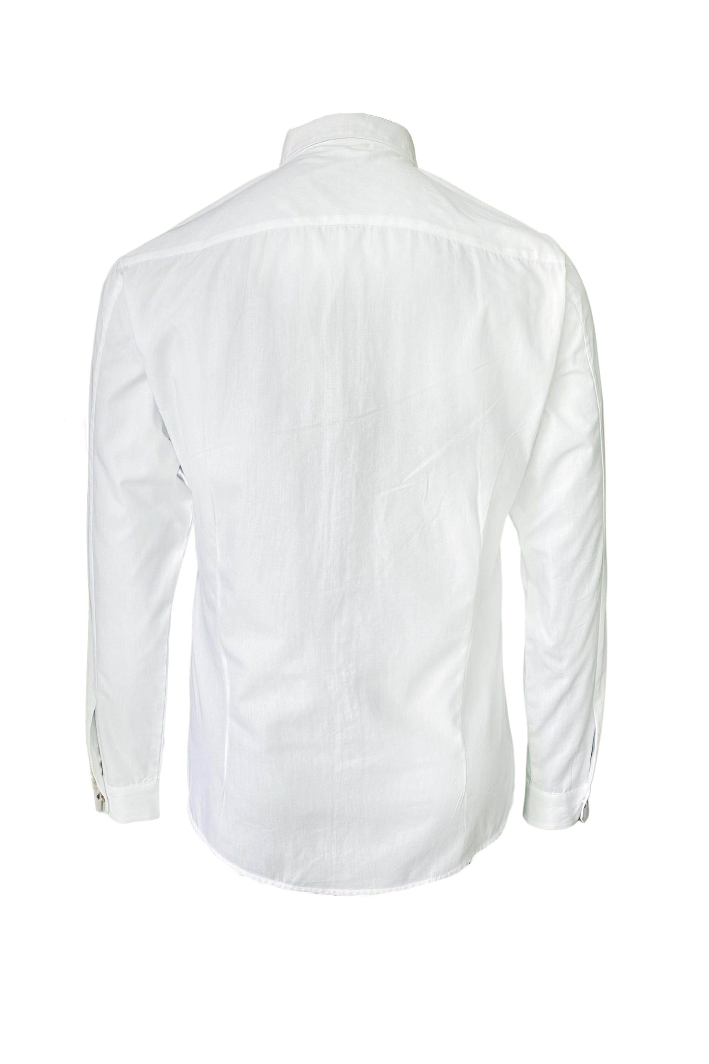 White button-down shirt with cascading layered fringe detailing at the bib. Concealed placket. Regulat fit poplin shirt.