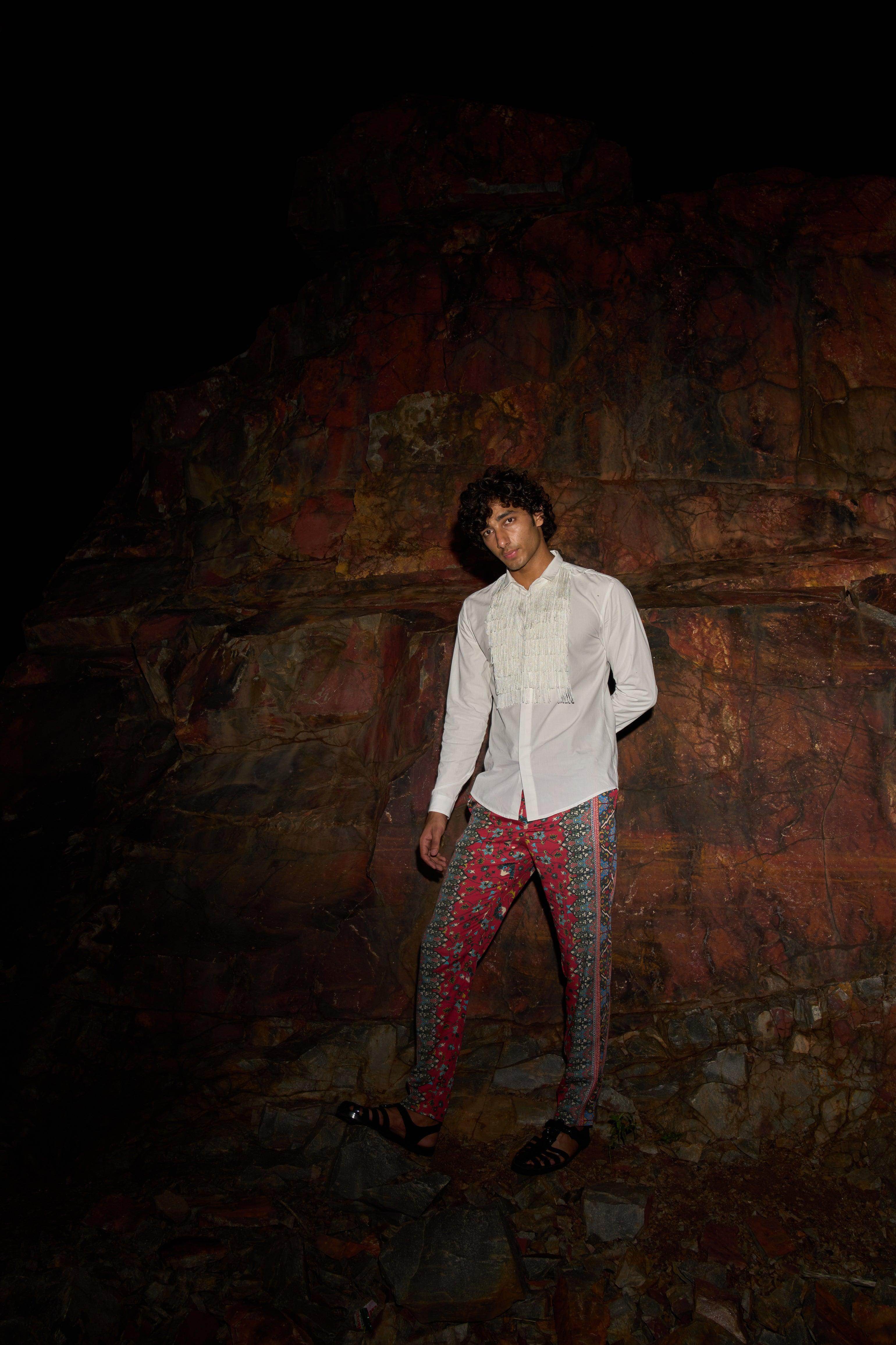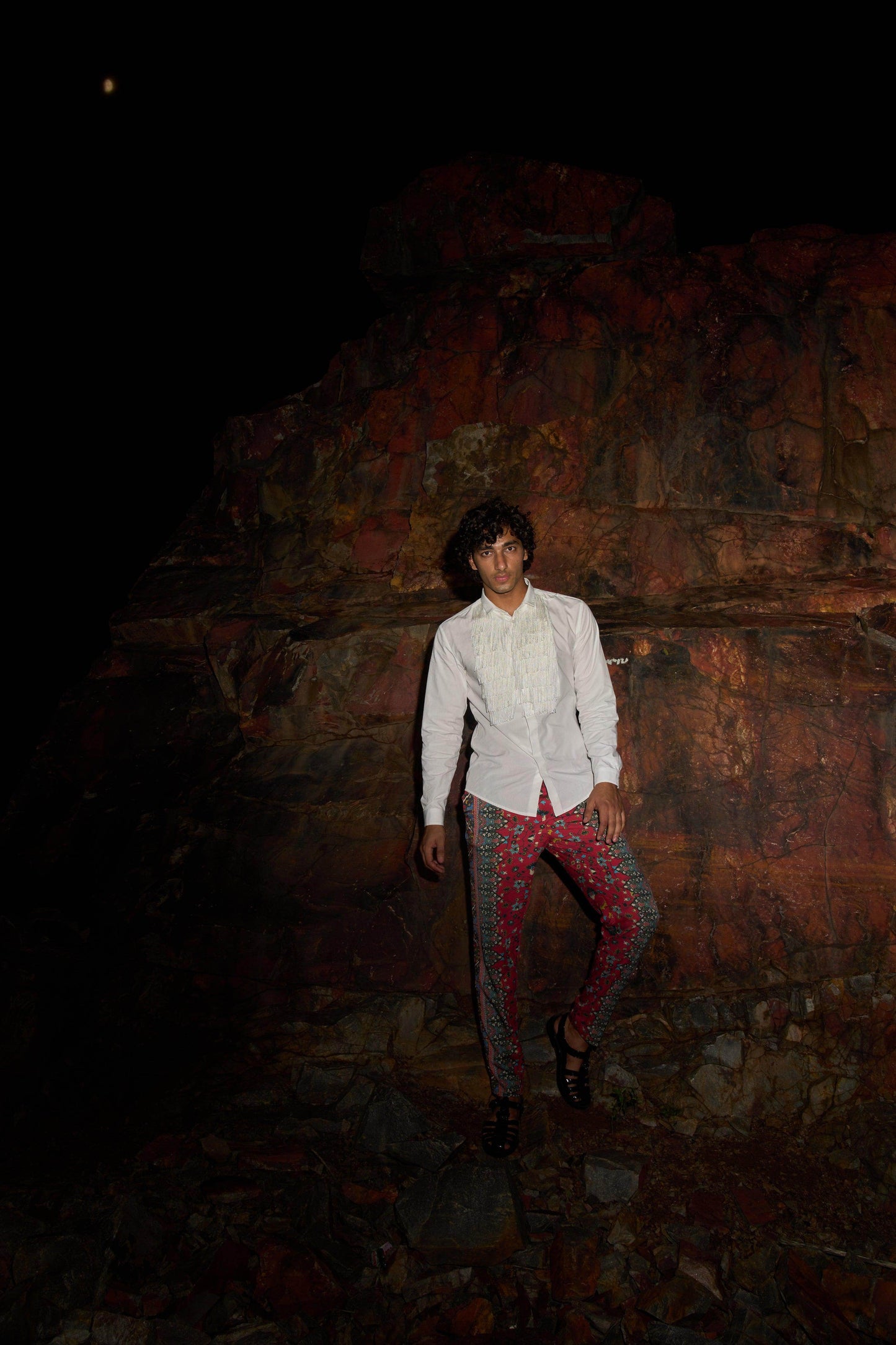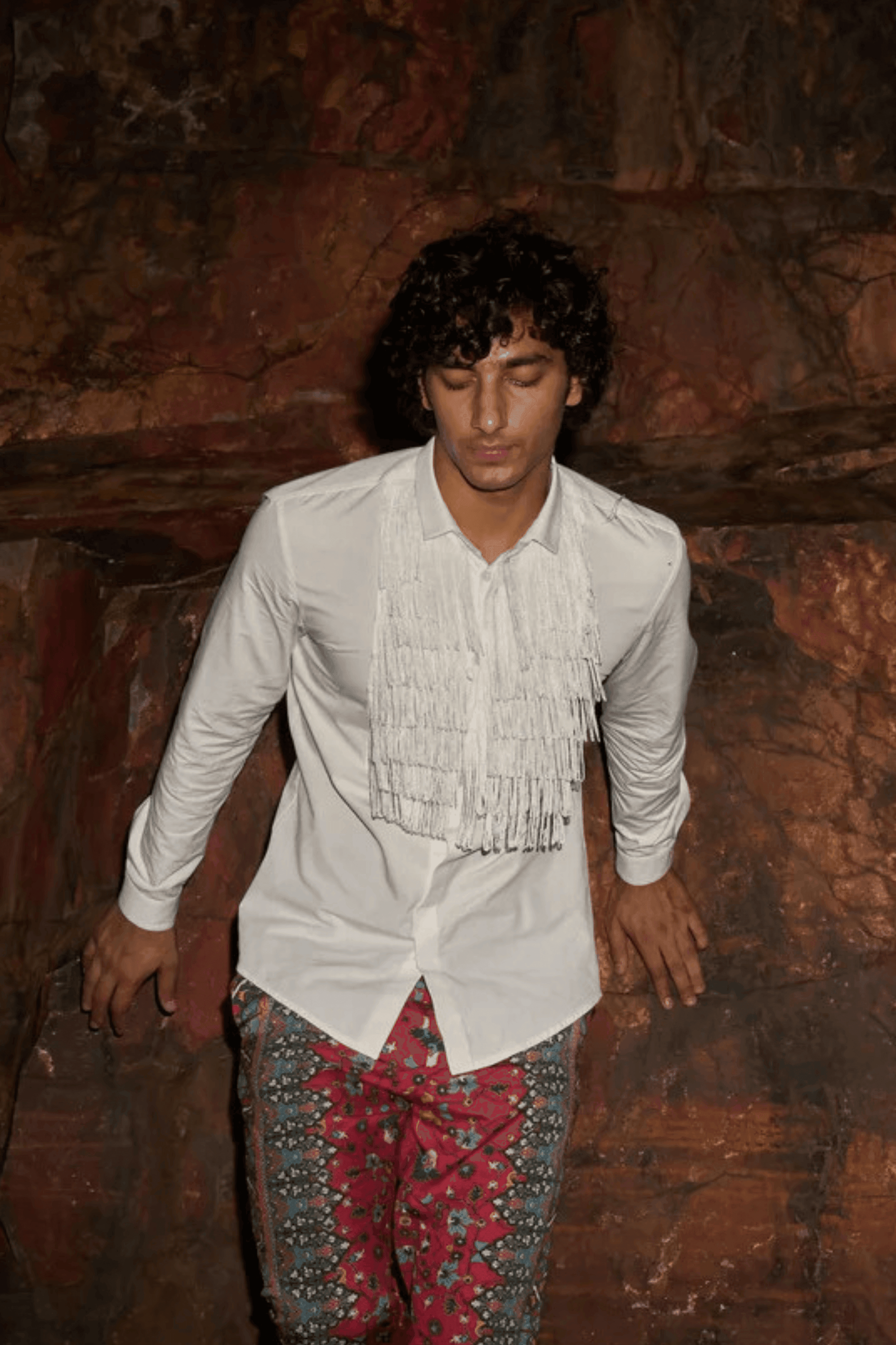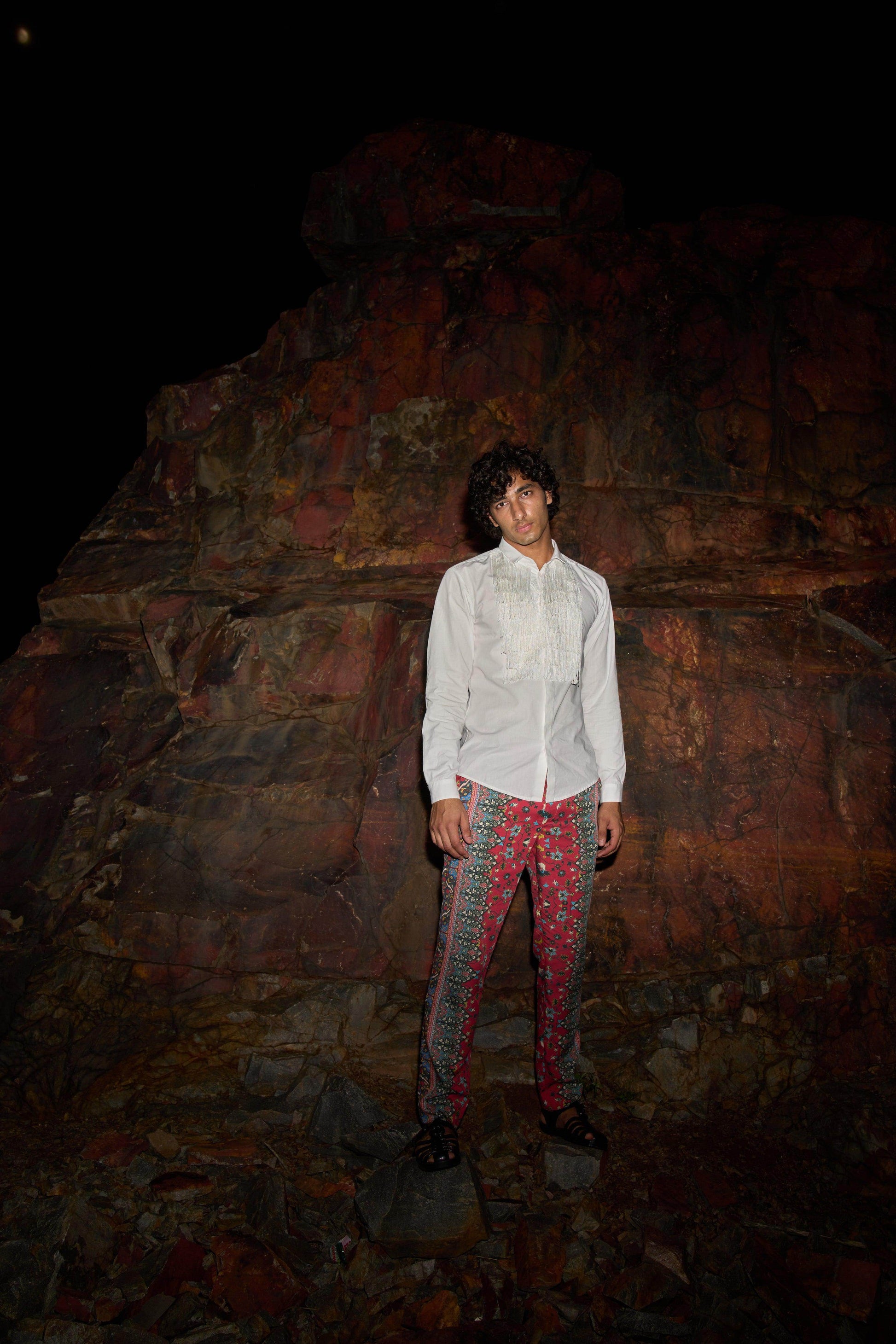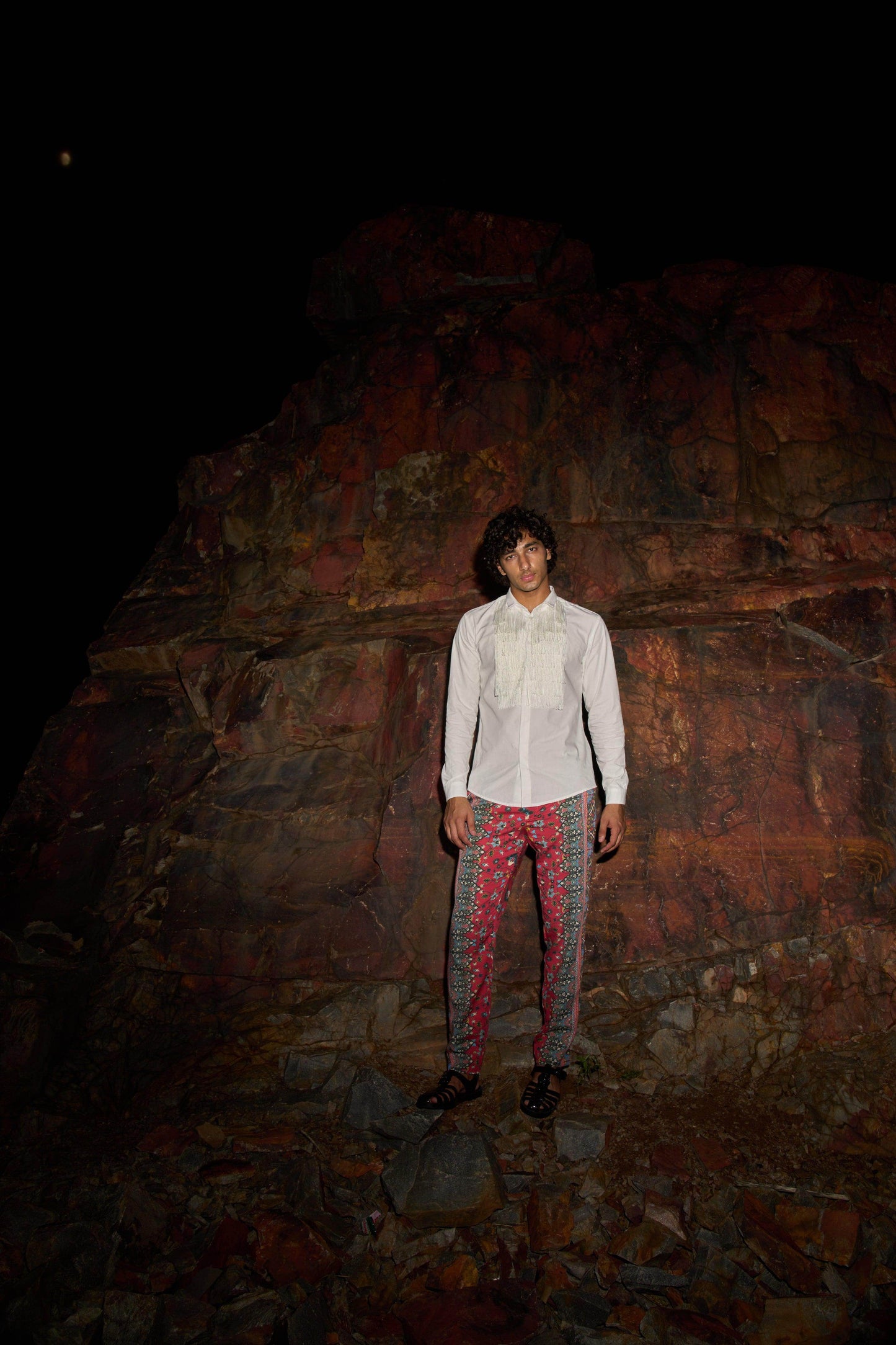 White button-down shirt with cascading layered fringe detailing at the bib. Concealed placket. Regulat fit poplin shirt.