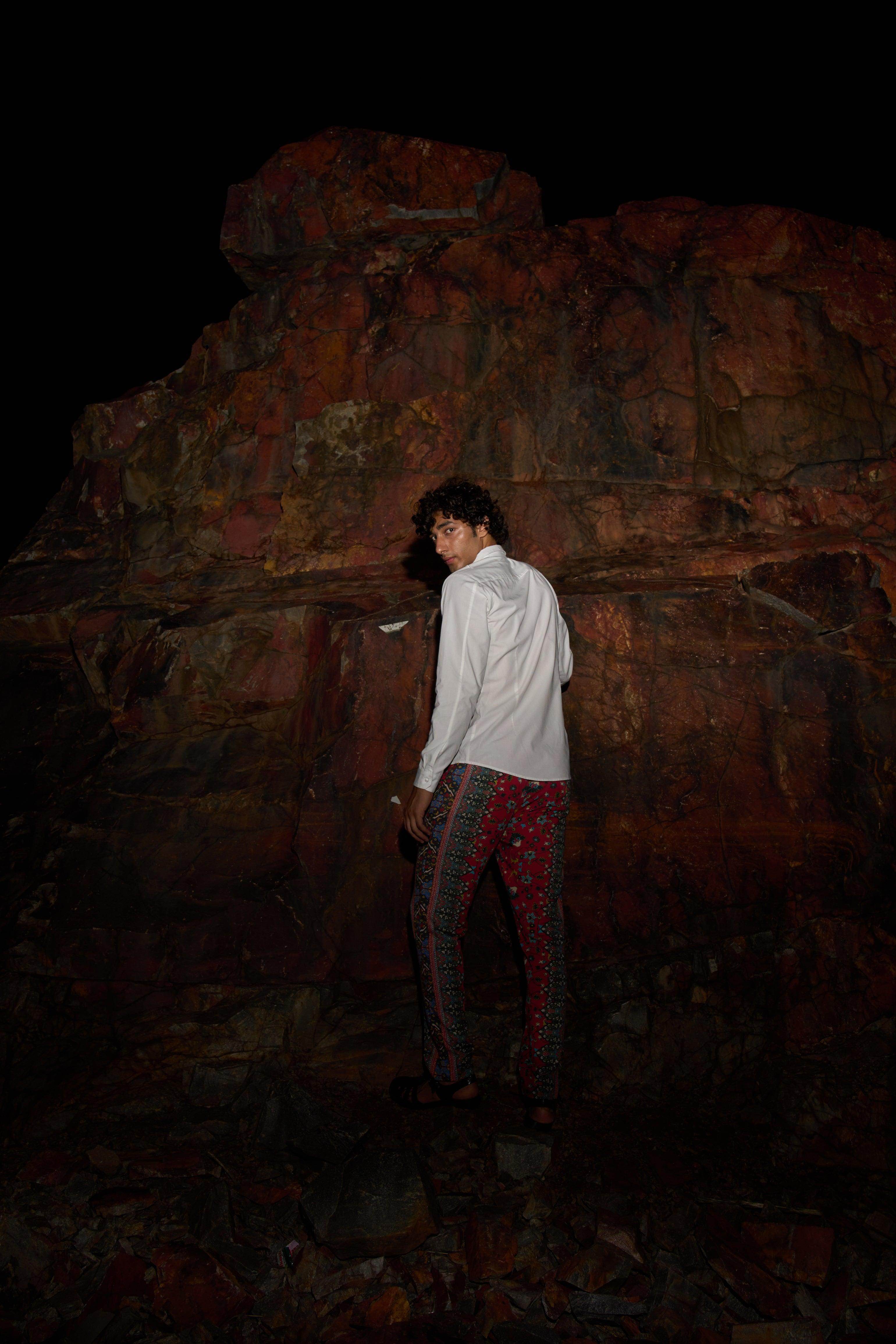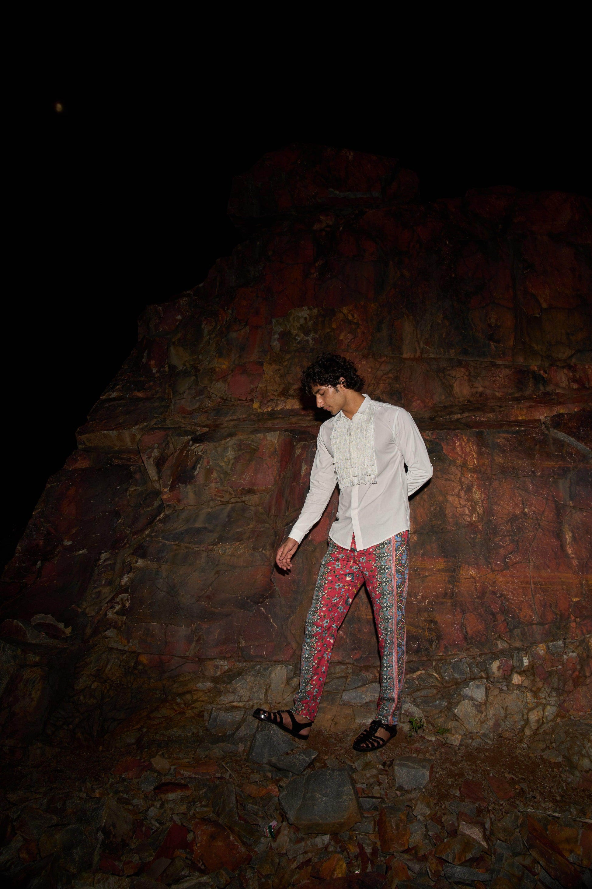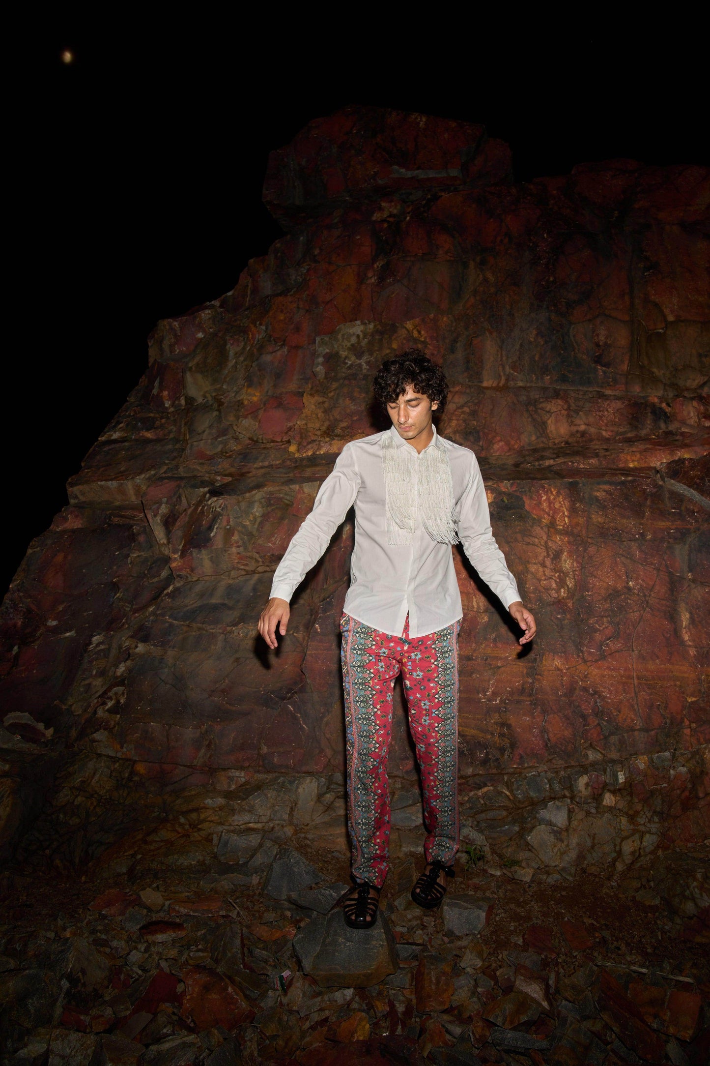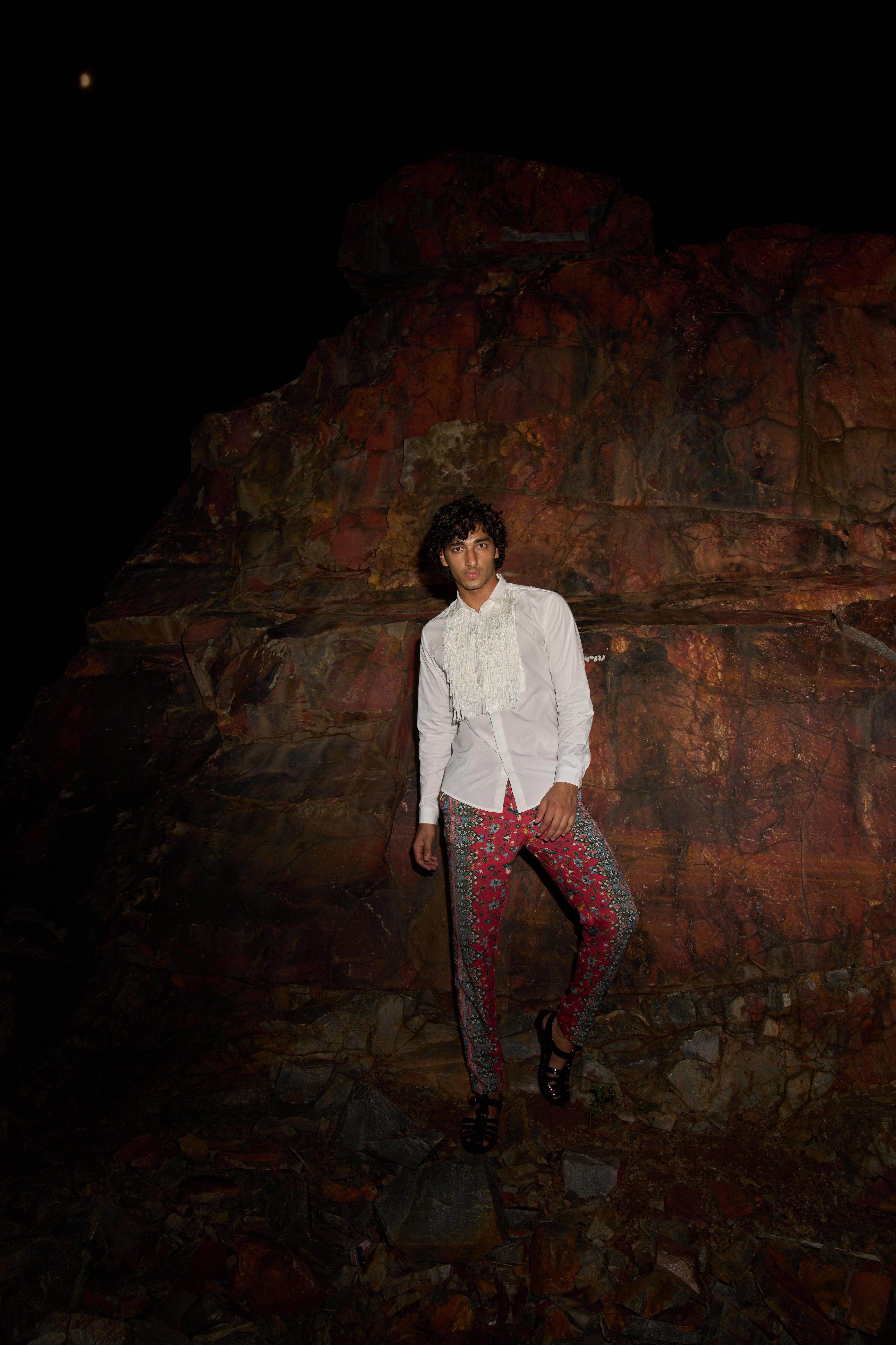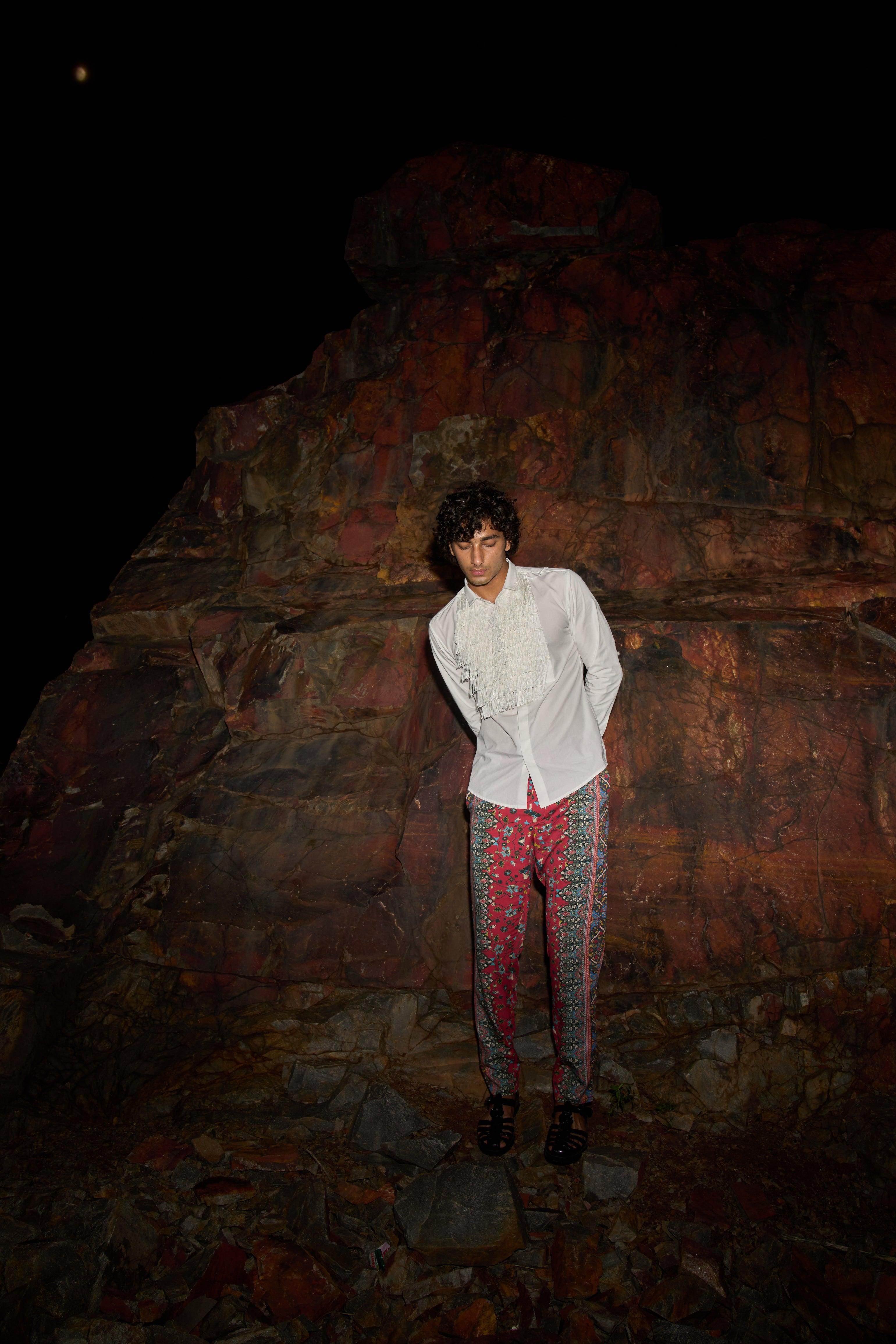 White button-down shirt with cascading layered fringe detailing at the bib. Concealed placket. Regulat fit poplin shirt.