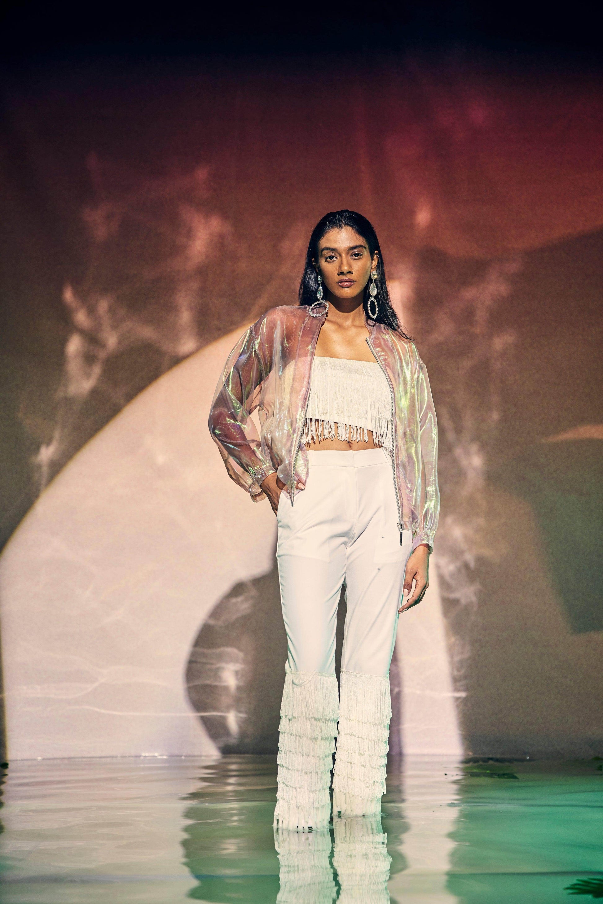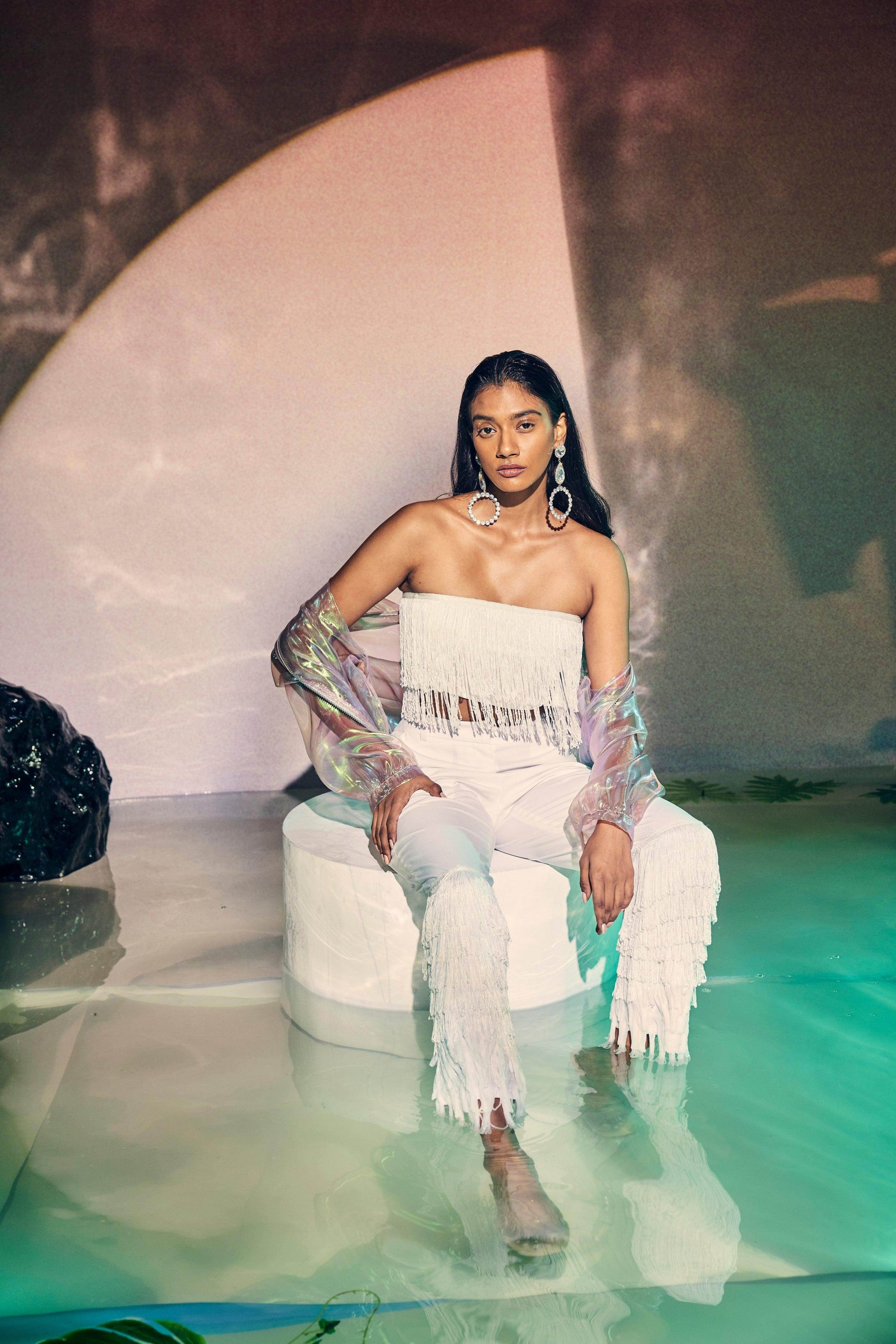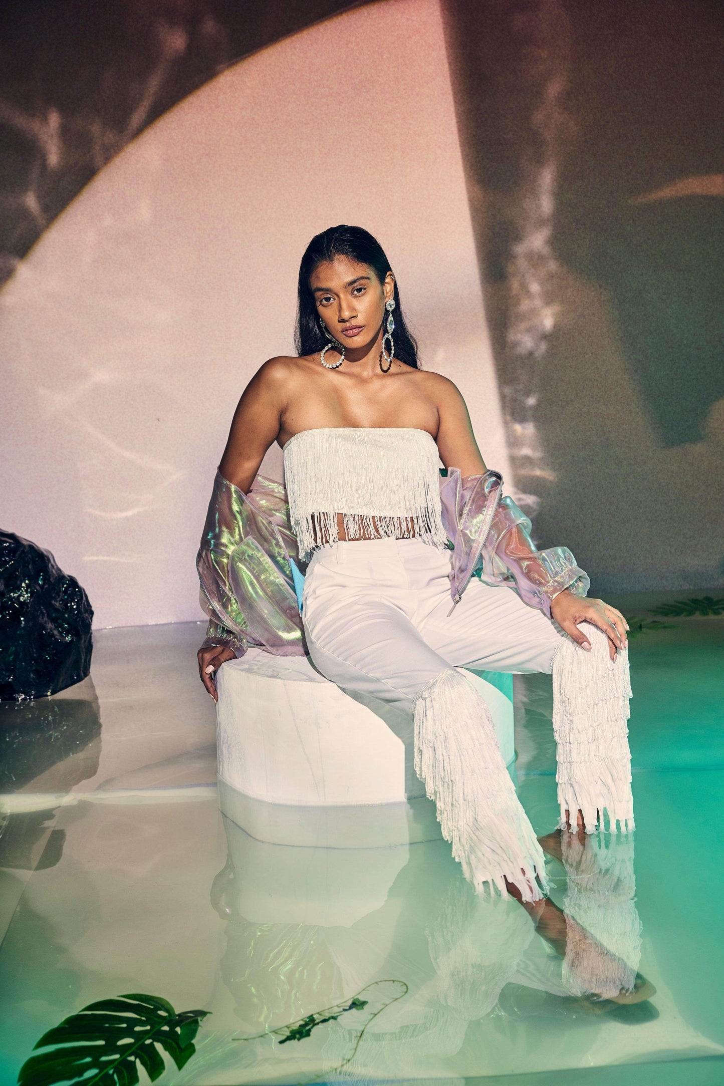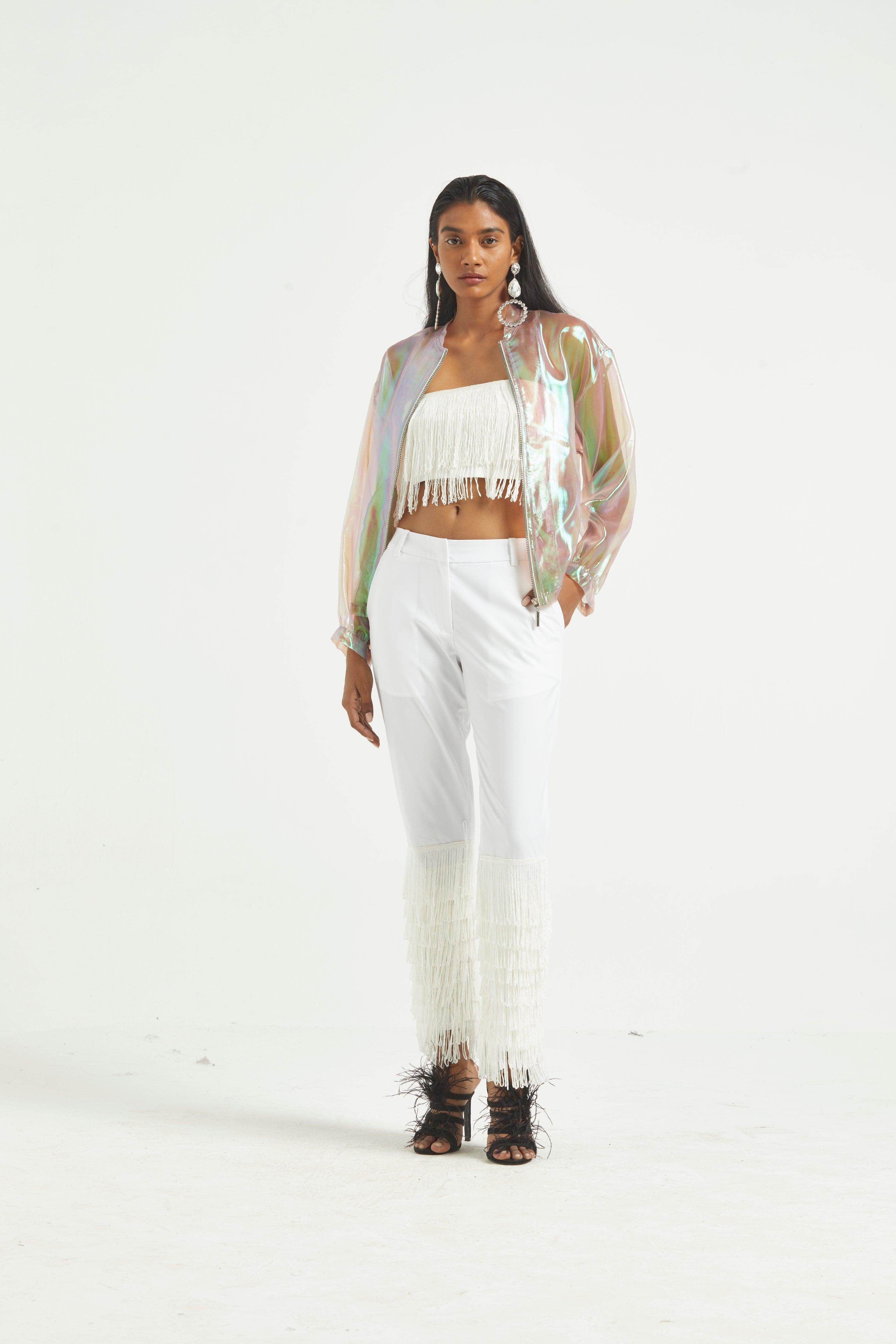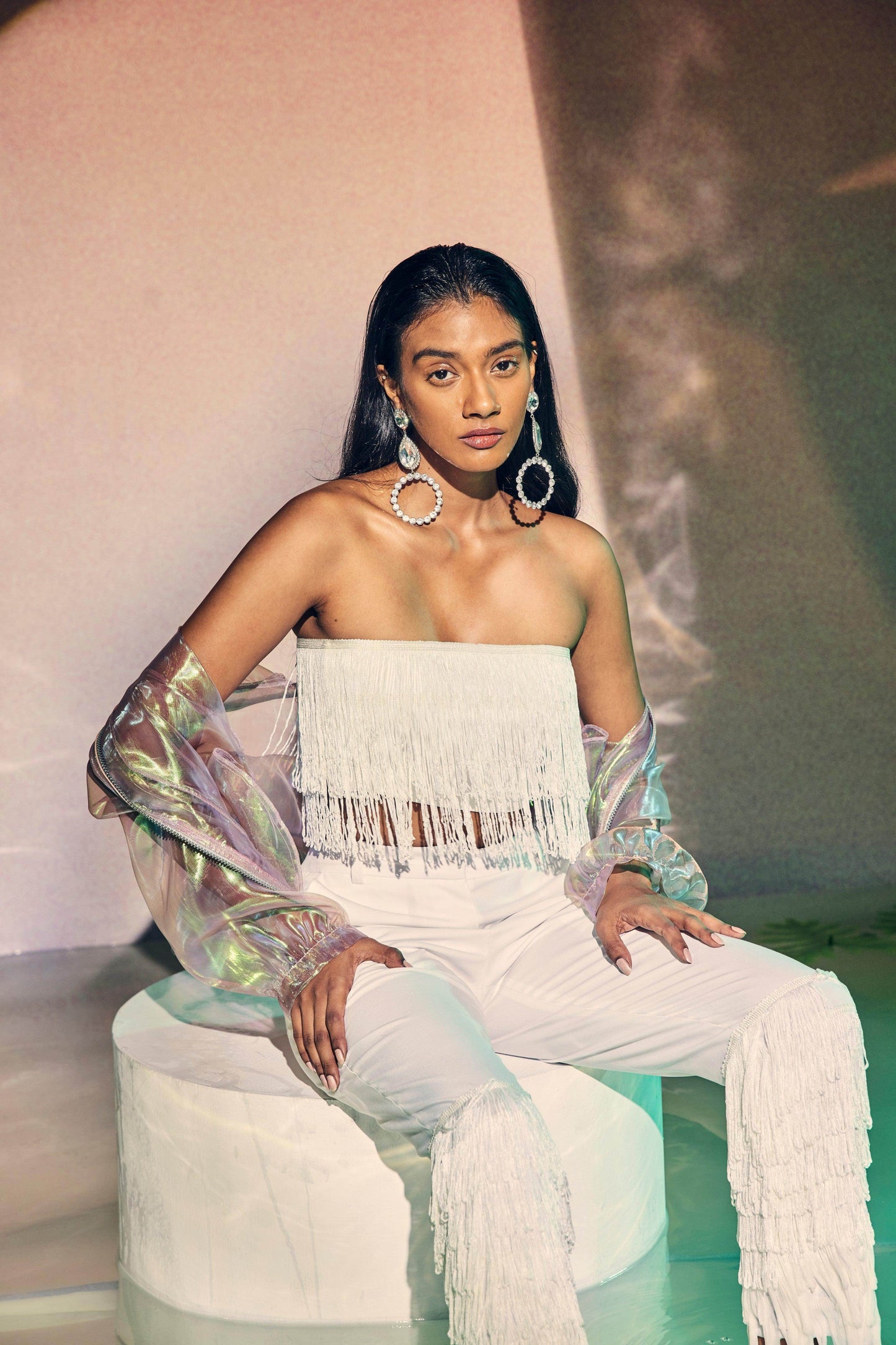 Strapless tube top with cascading white fringe detail. Paired with tapered fit cotton pant with cascading ivory fringe below the knees. Fringes create movement while walking. Pockets on the side. Zip fly, belt loops around the waist.