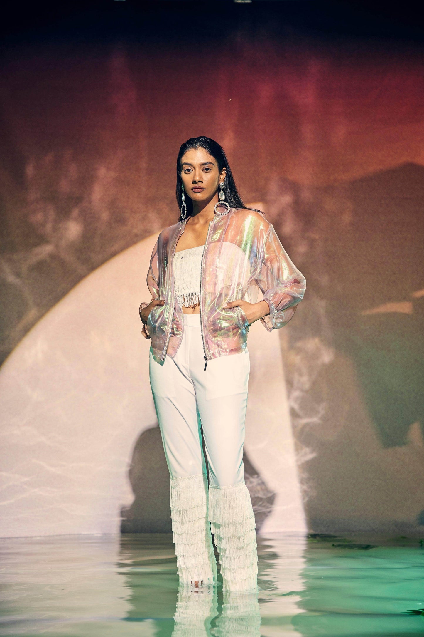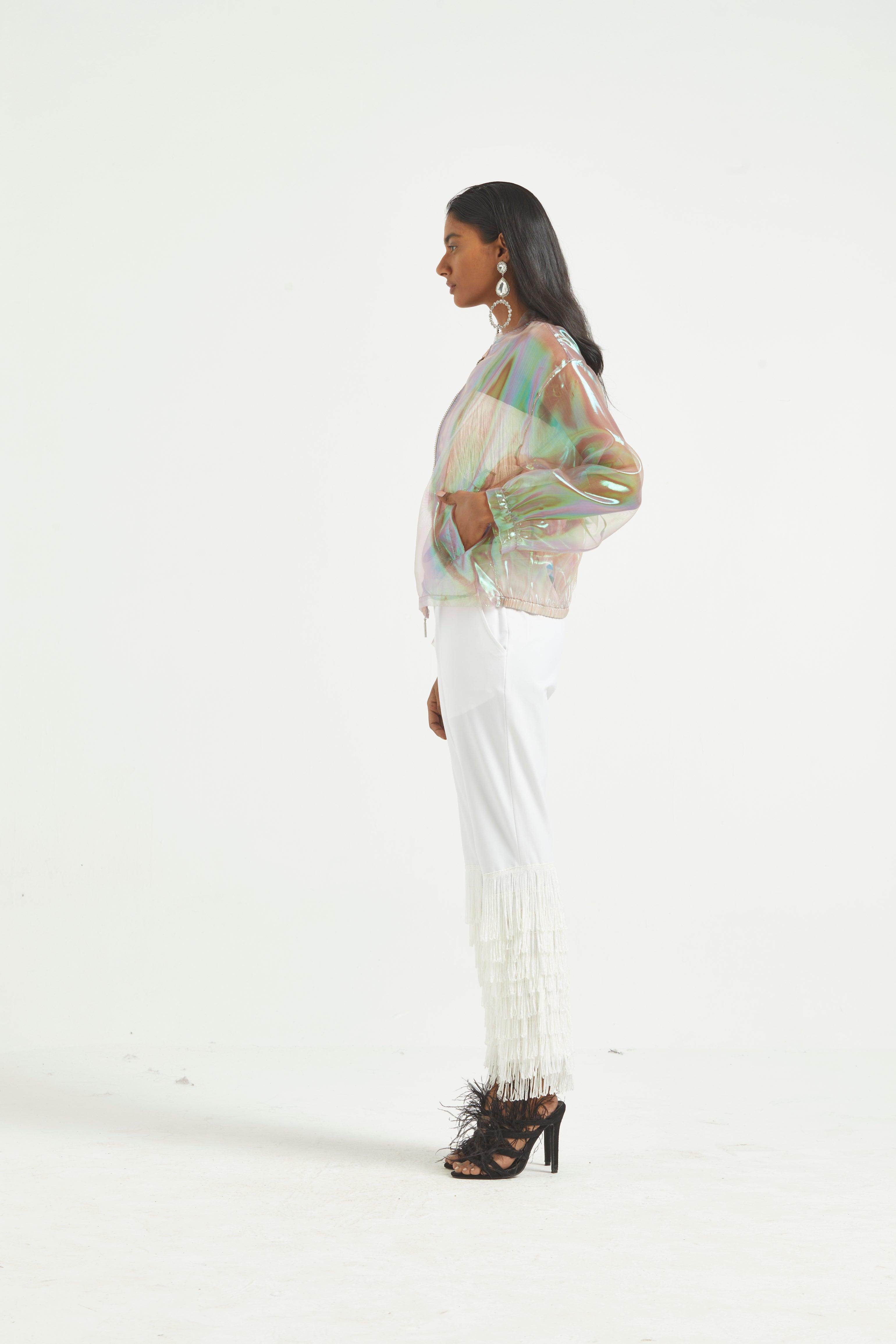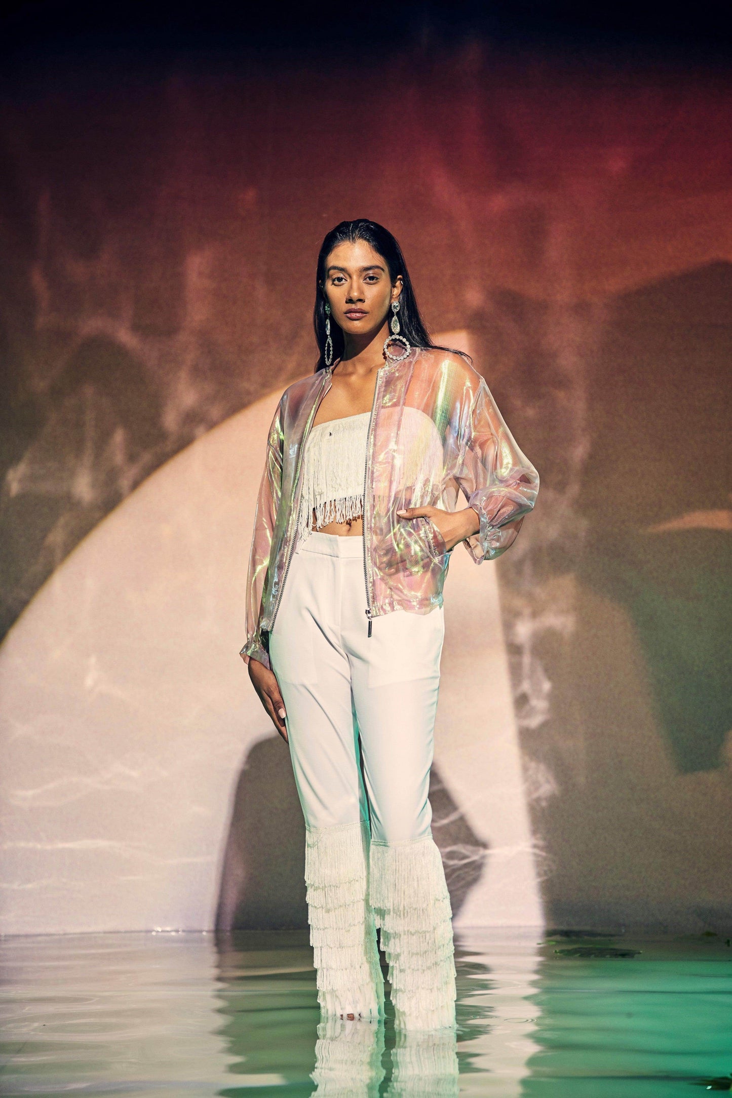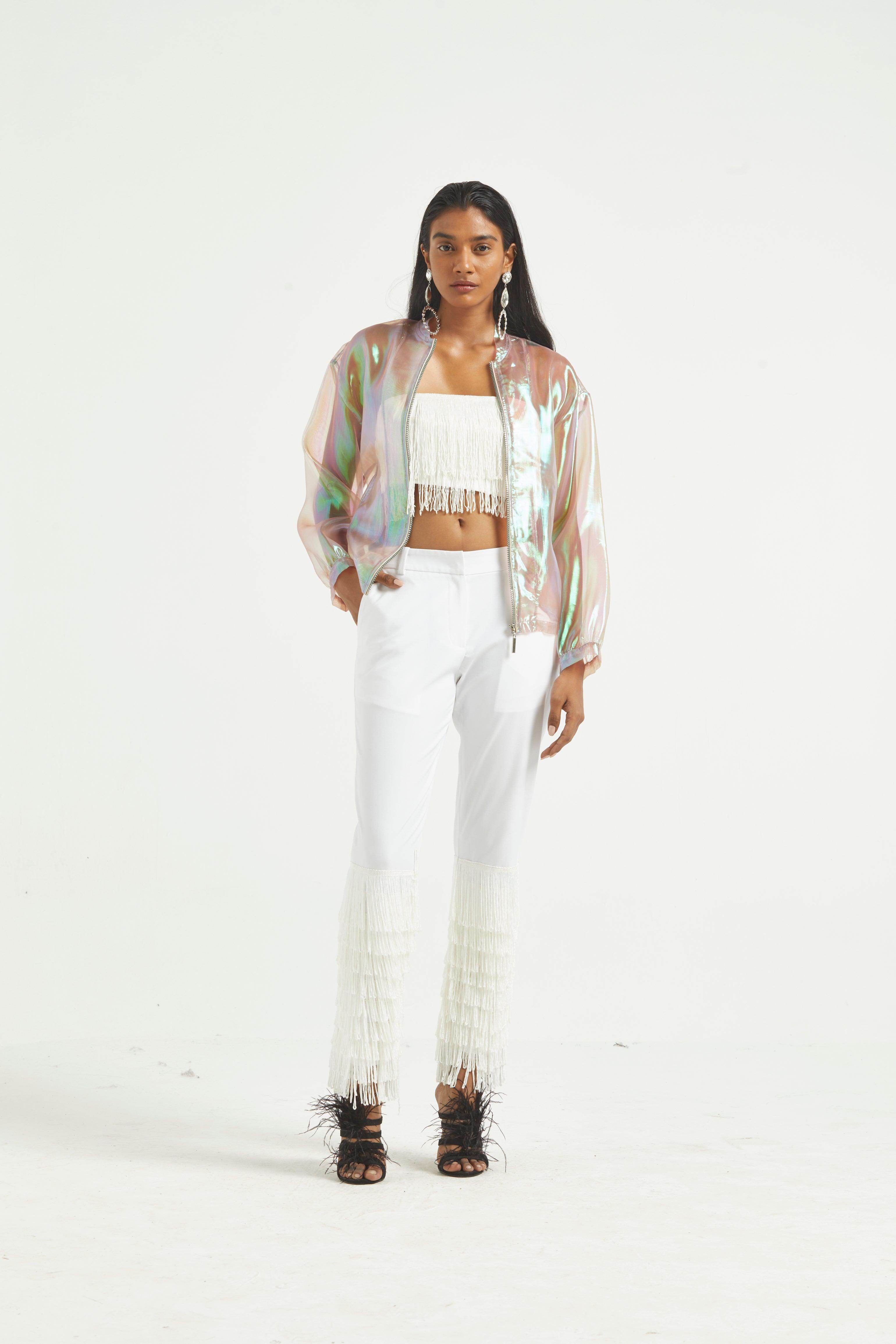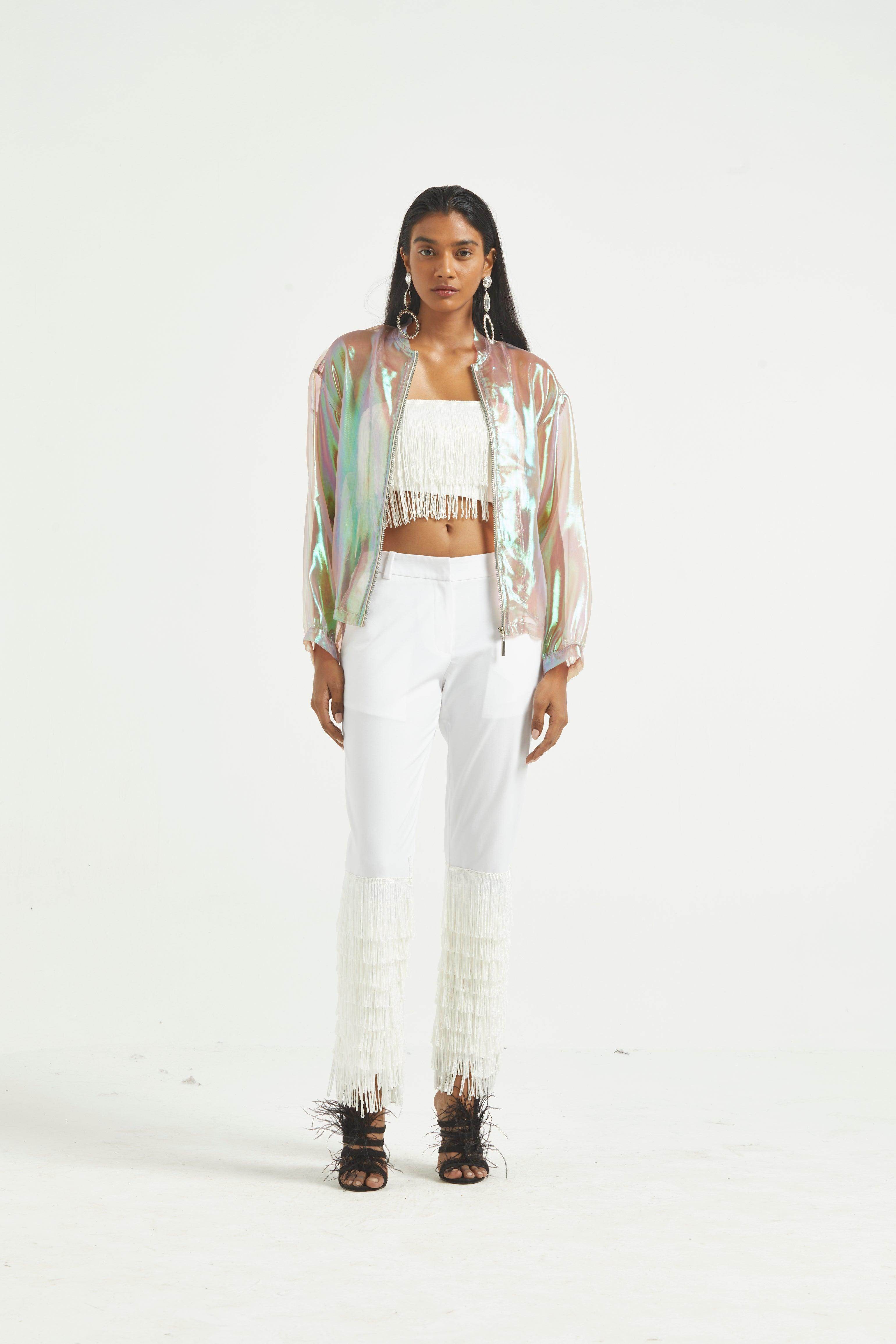 Strapless tube top with cascading white fringe detail. Paired with tapered fit cotton pant with cascading ivory fringe below the knees. Fringes create movement while walking. Pockets on the side. Zip fly, belt loops around the waist.