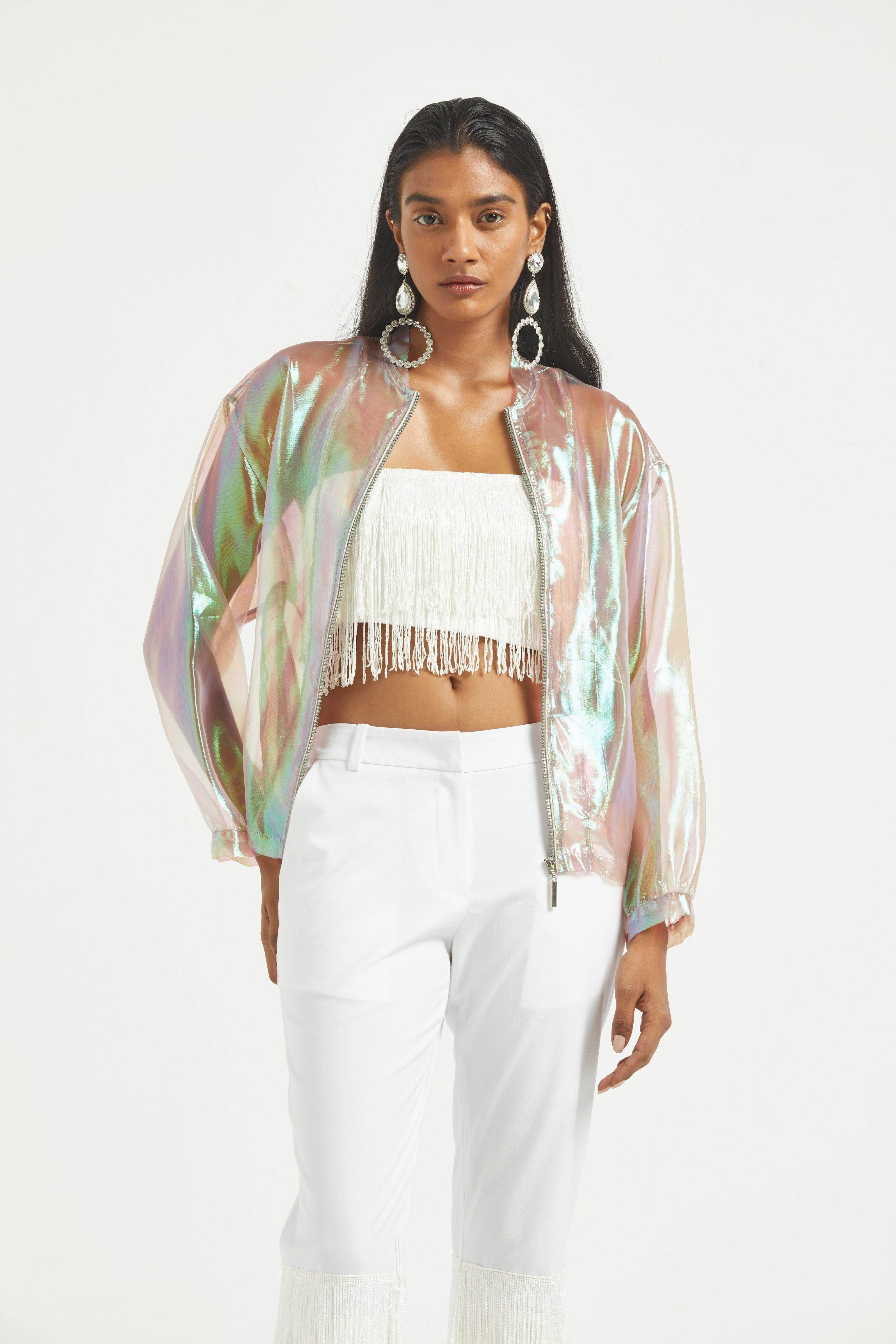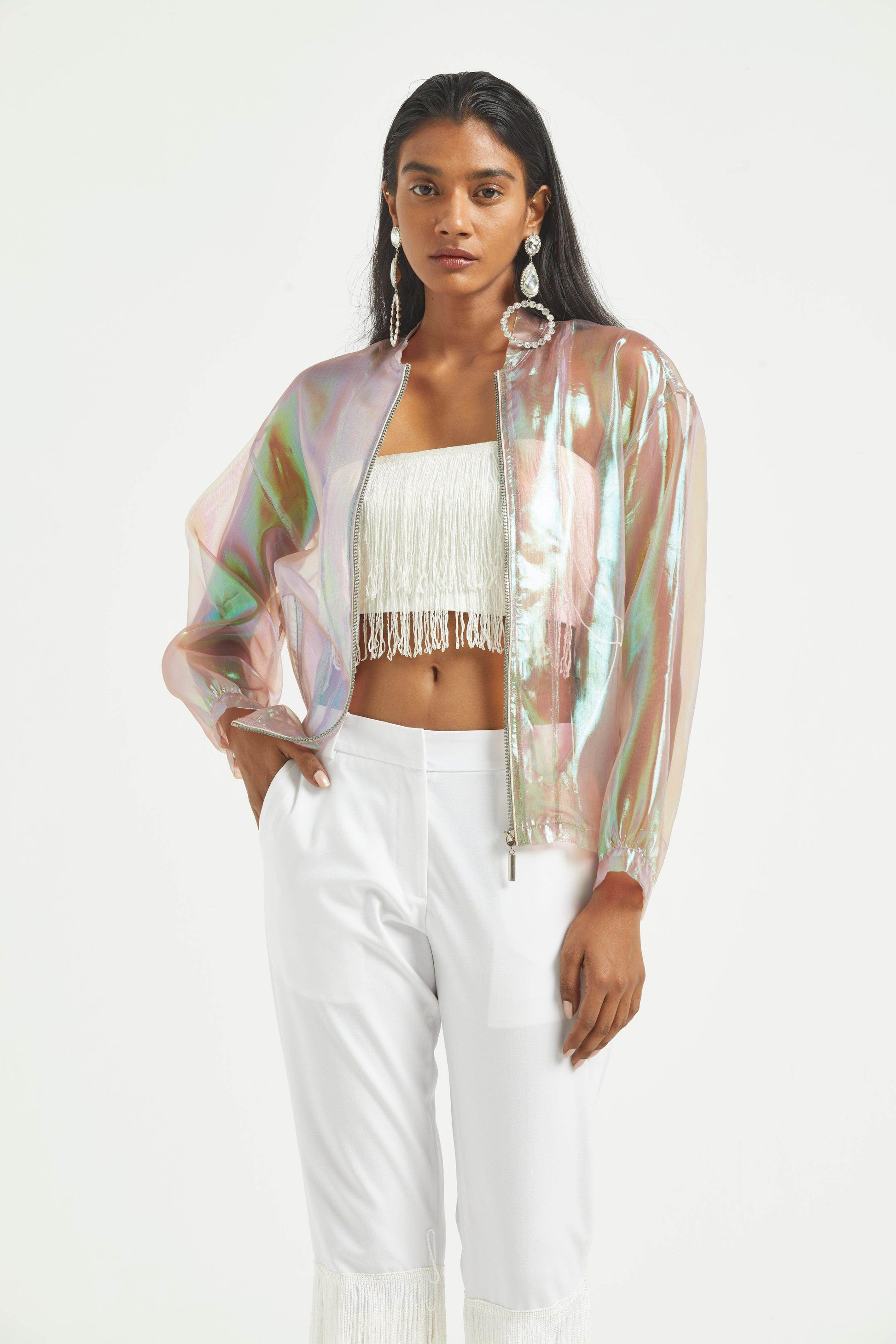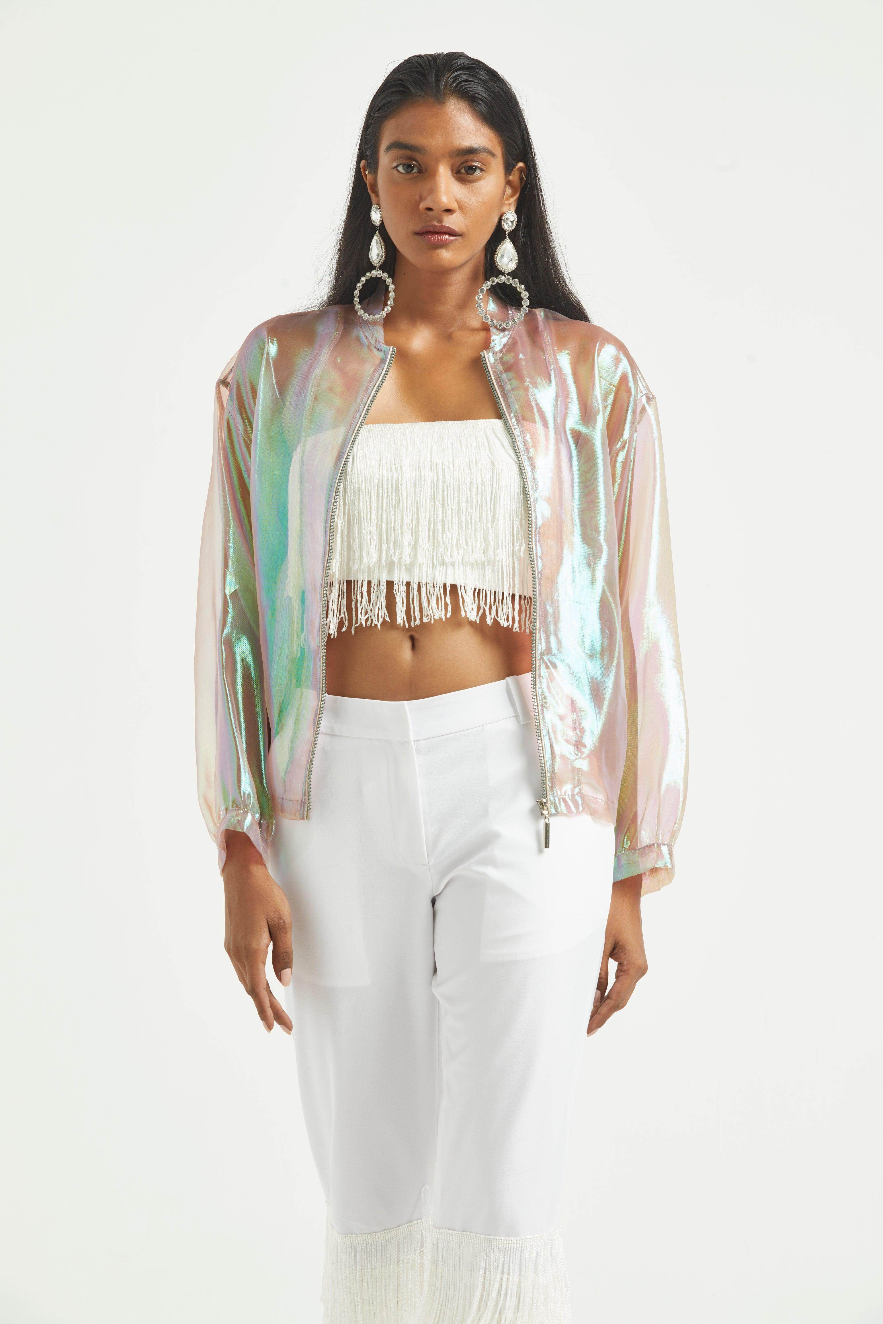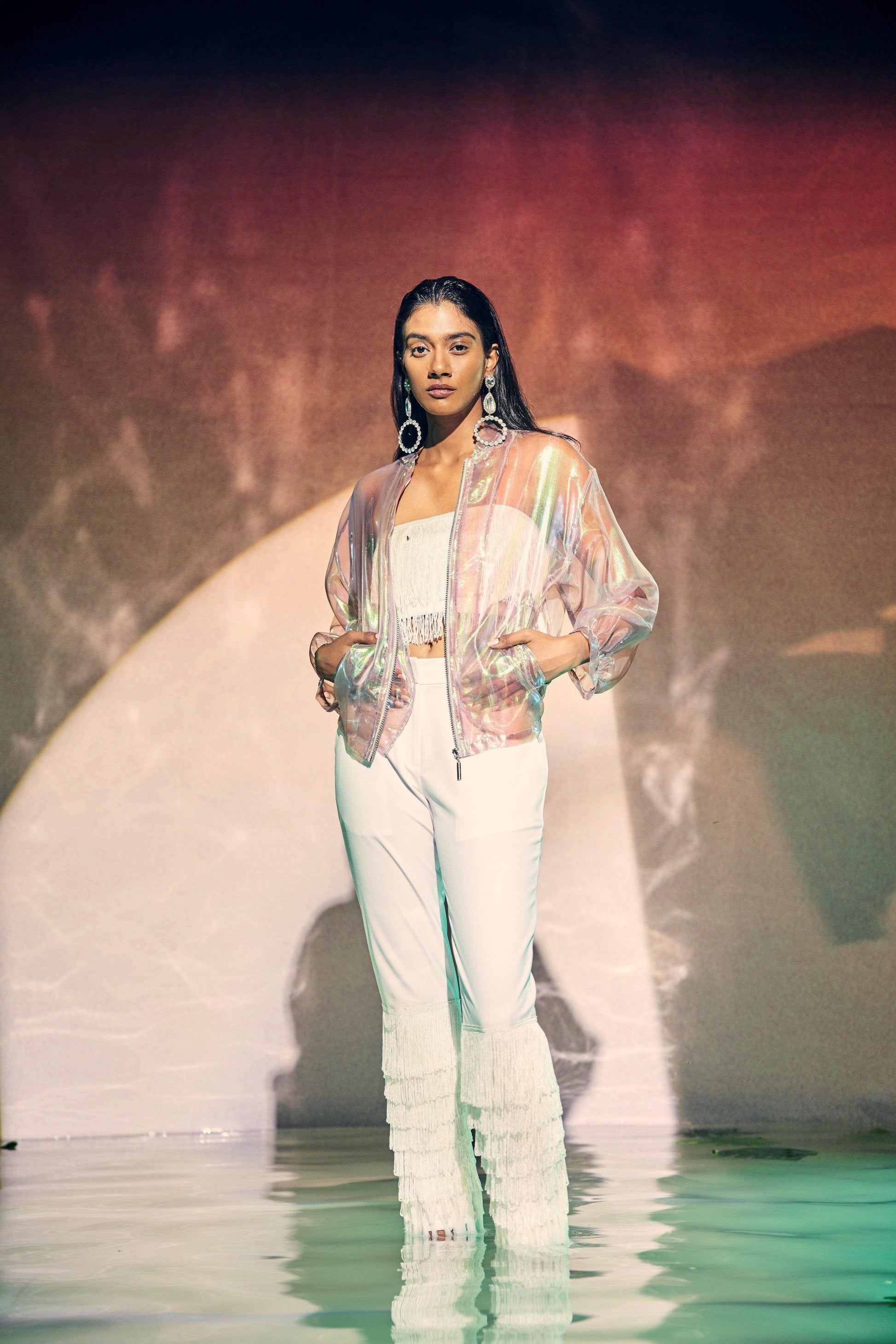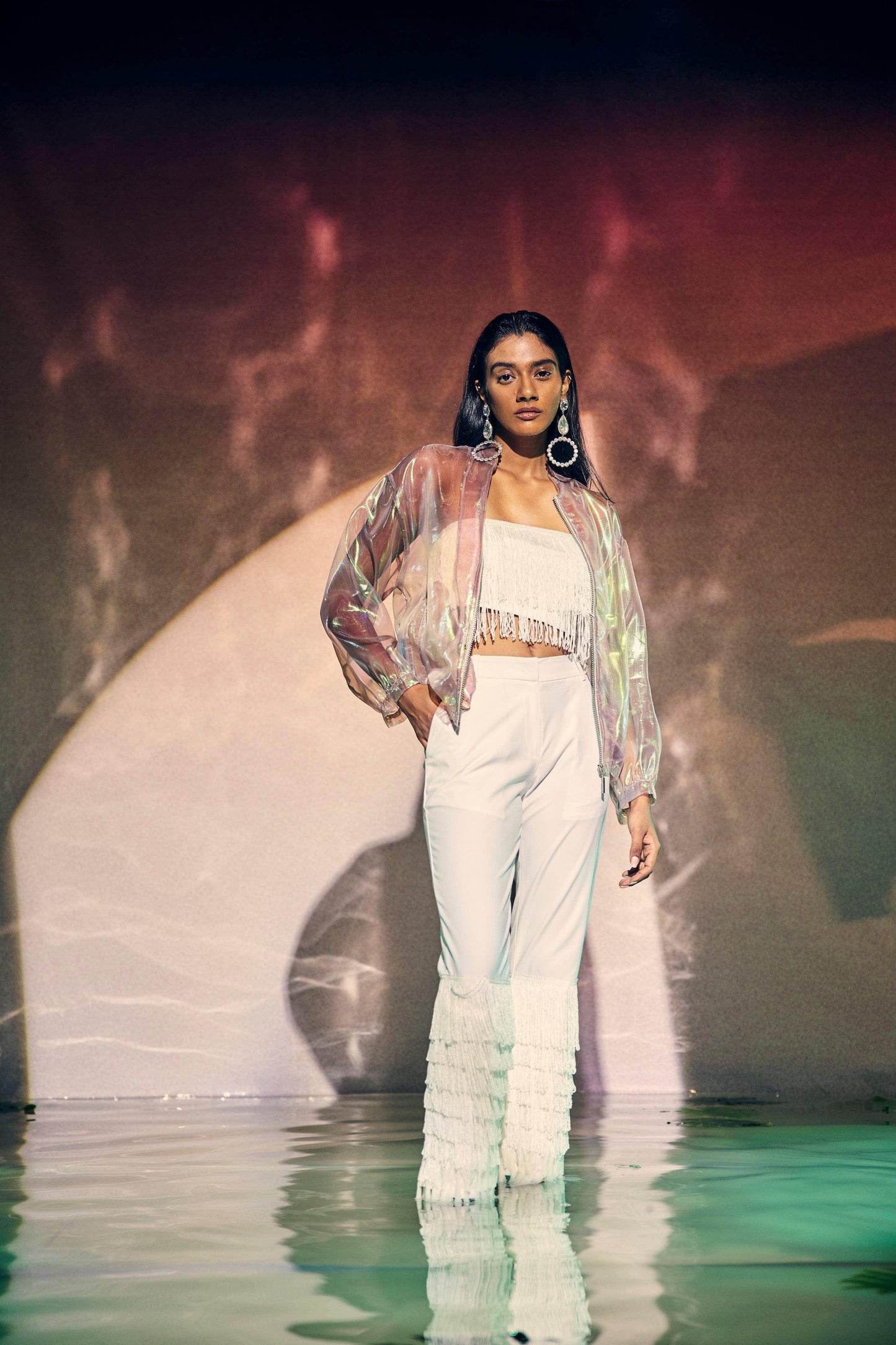 Strapless tube top with cascading white fringe detail. Paired with tapered fit cotton pant with cascading ivory fringe below the knees. Fringes create movement while walking. Pockets on the side. Zip fly, belt loops around the waist.