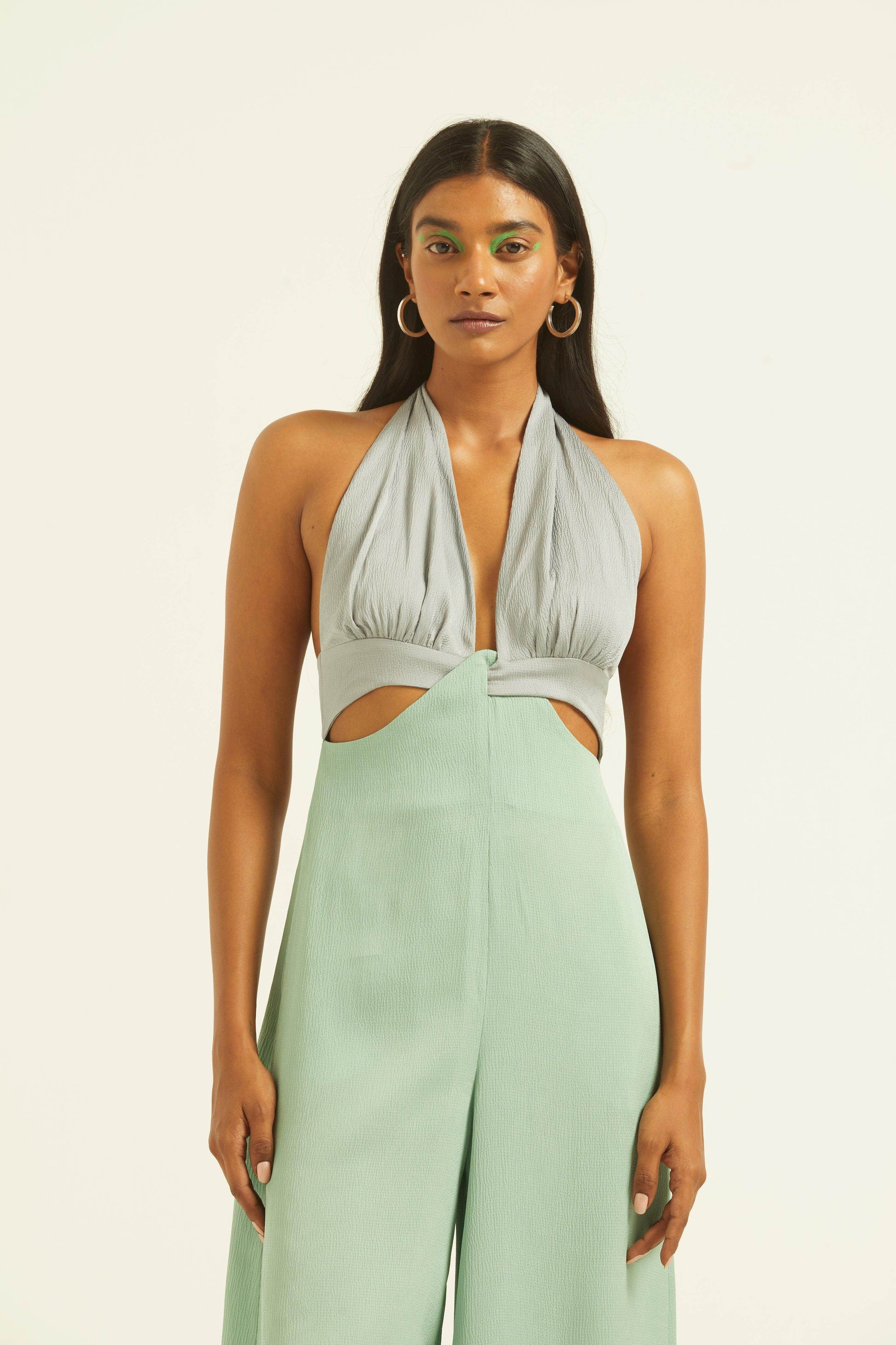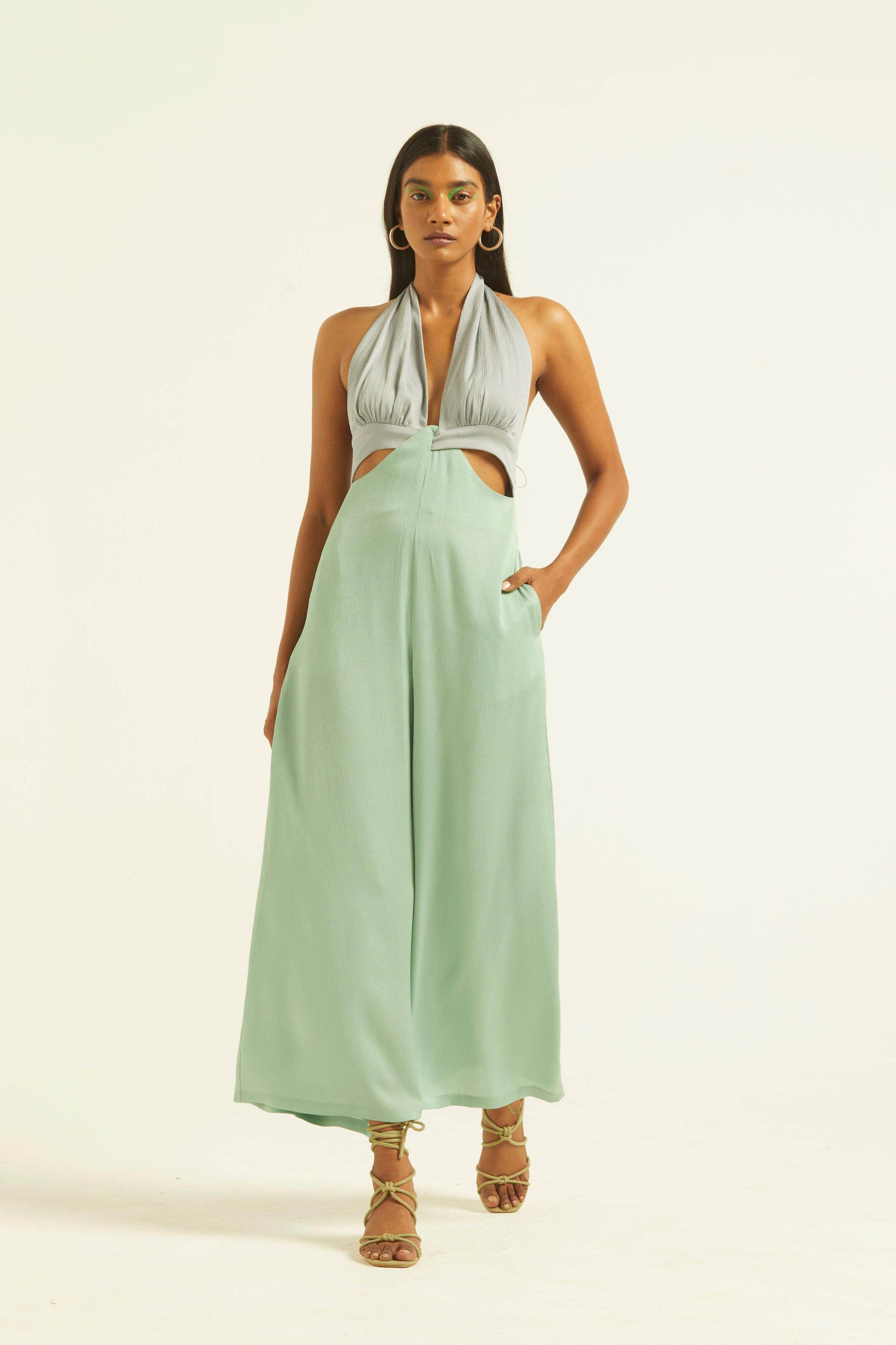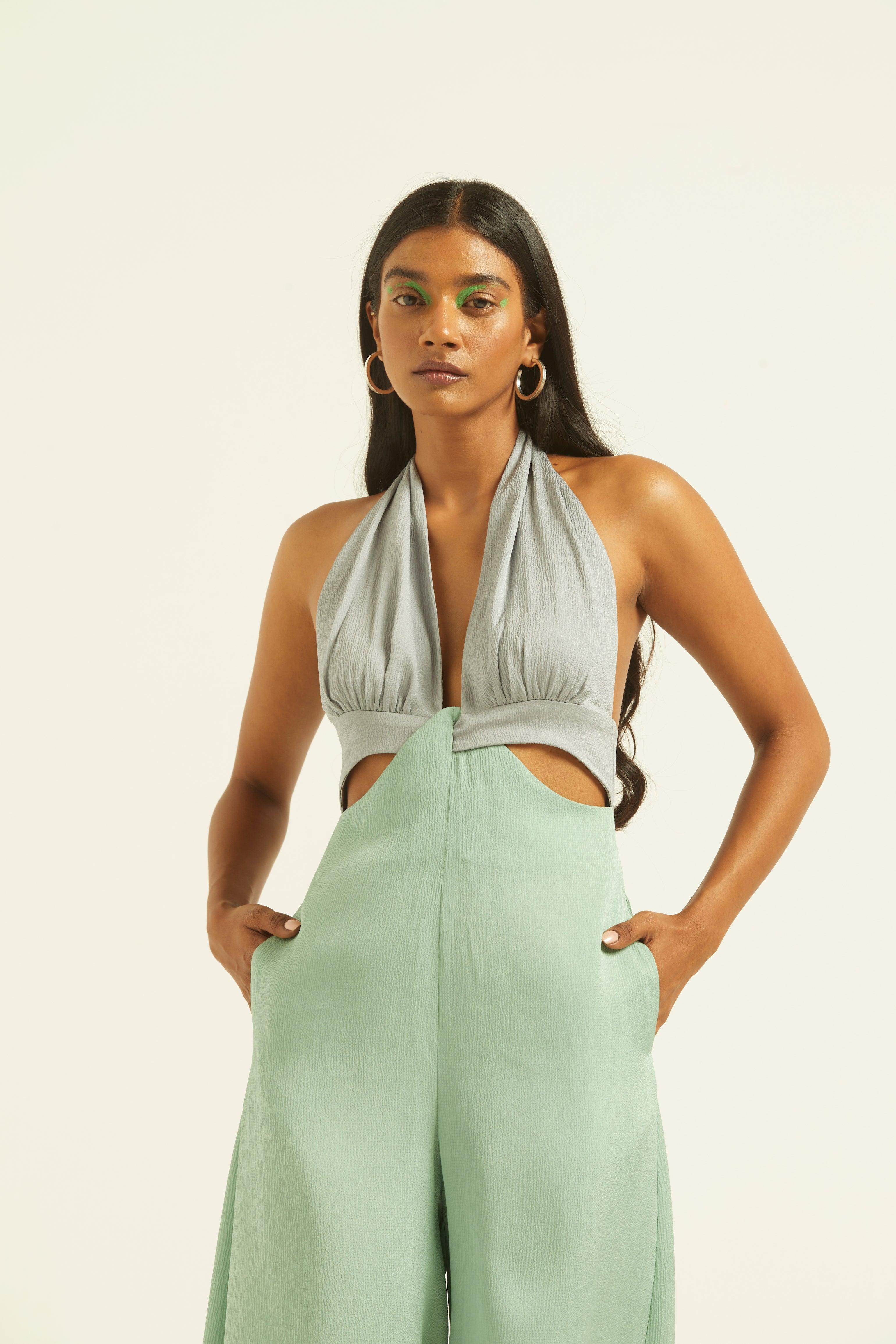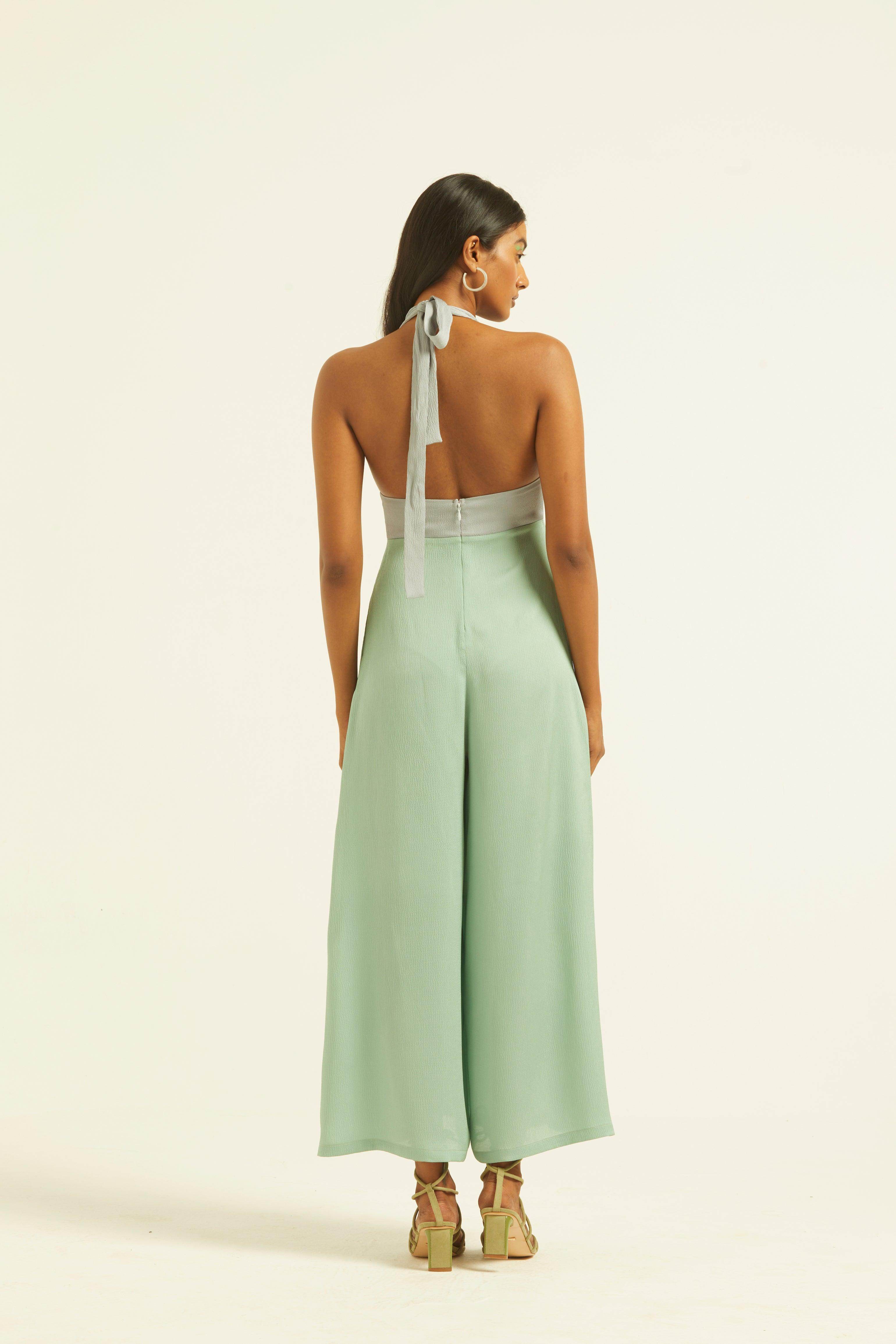 Seafoam and grey blocked jumpsuit in a flowy textured fabric. Wide-legged, halter neck with under bust cutout. Ties up behind the neck, zipper at the back, pockets on the side.