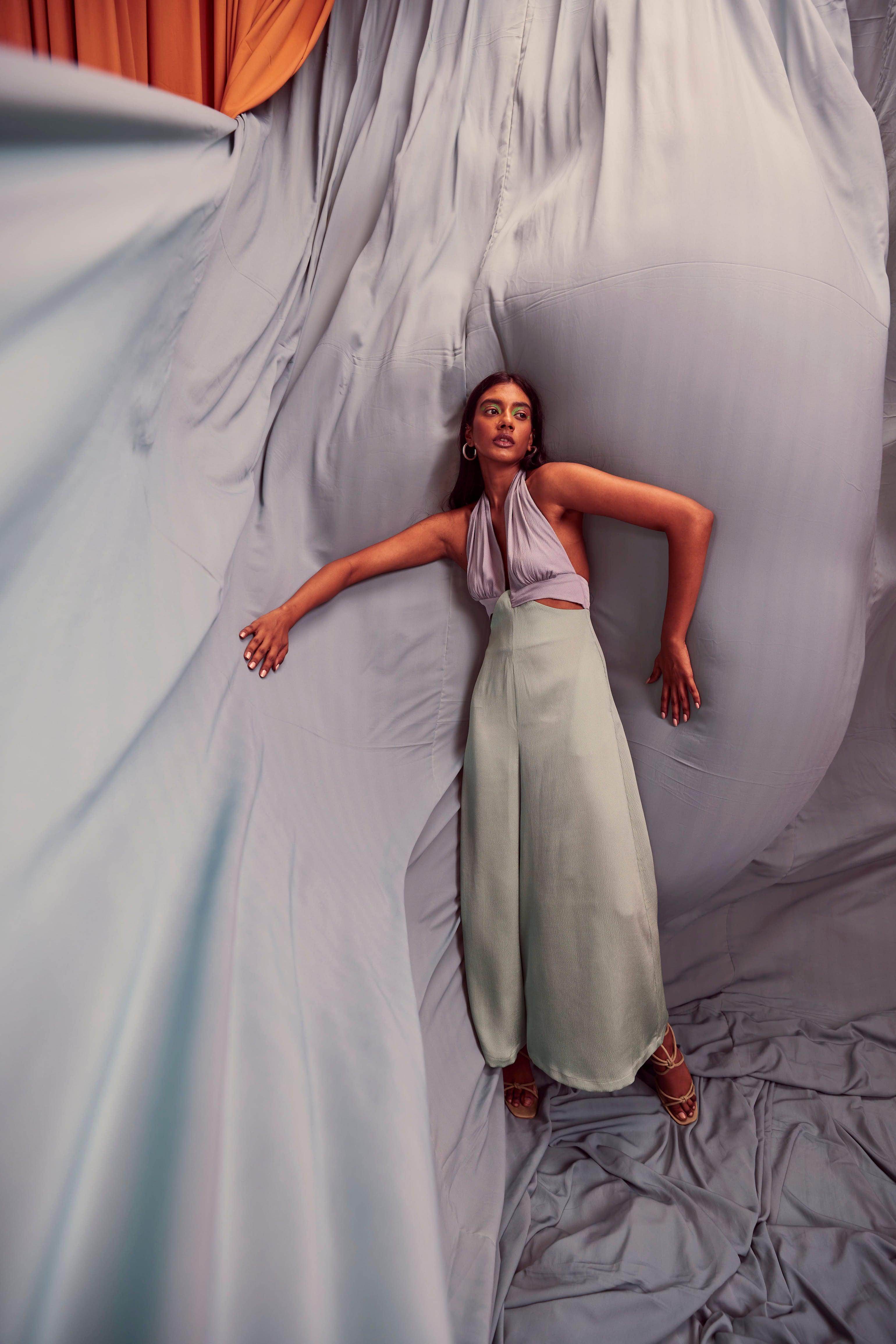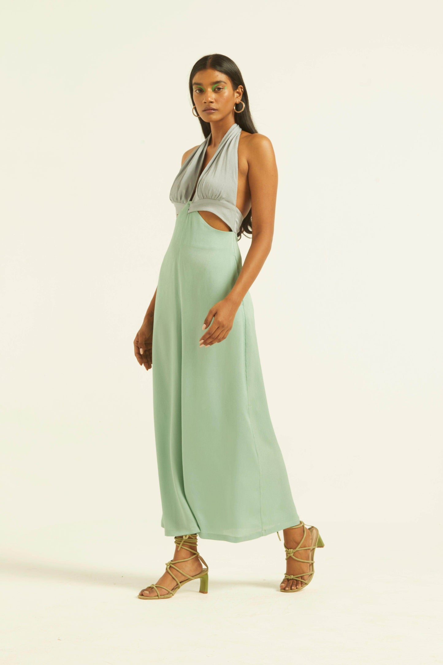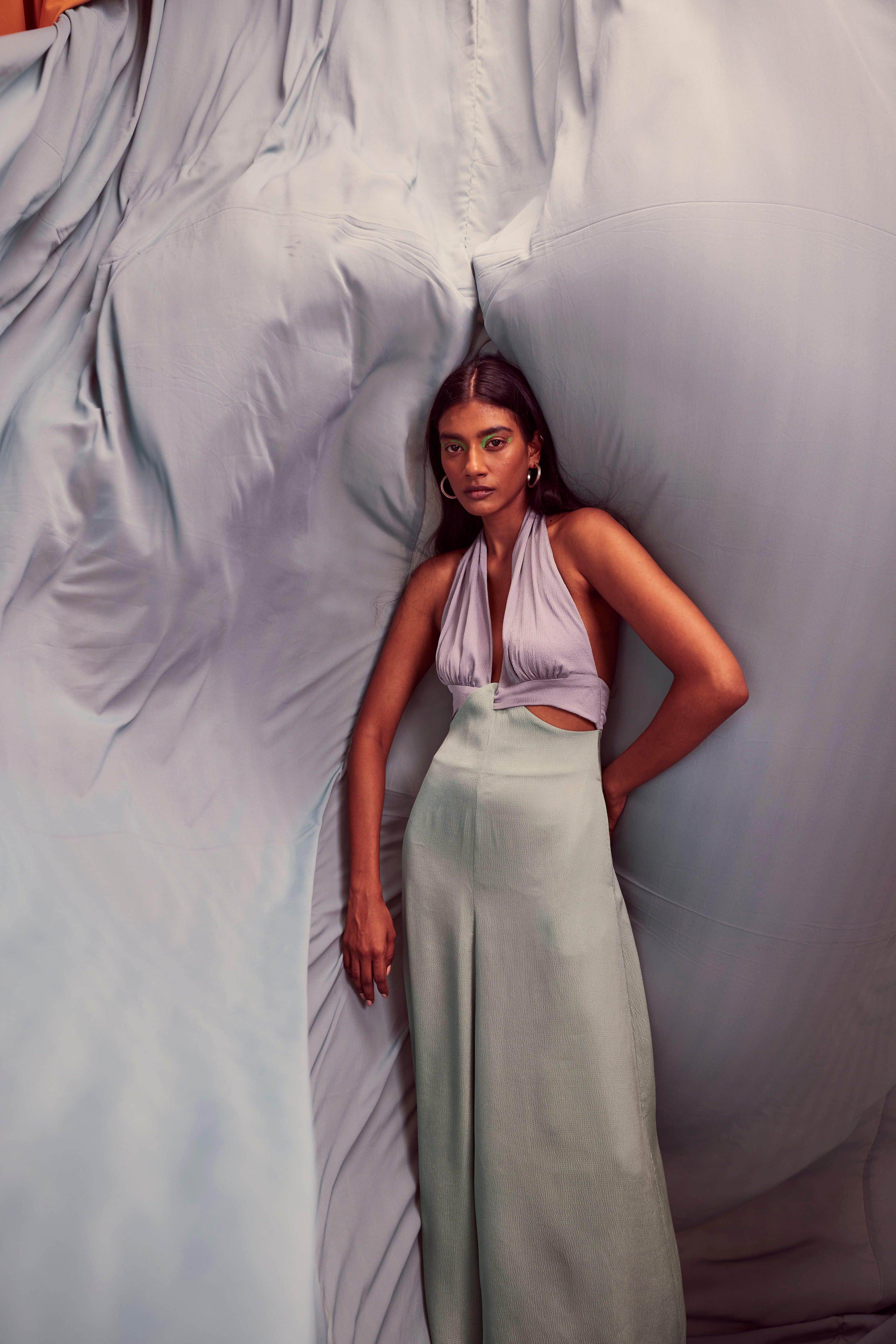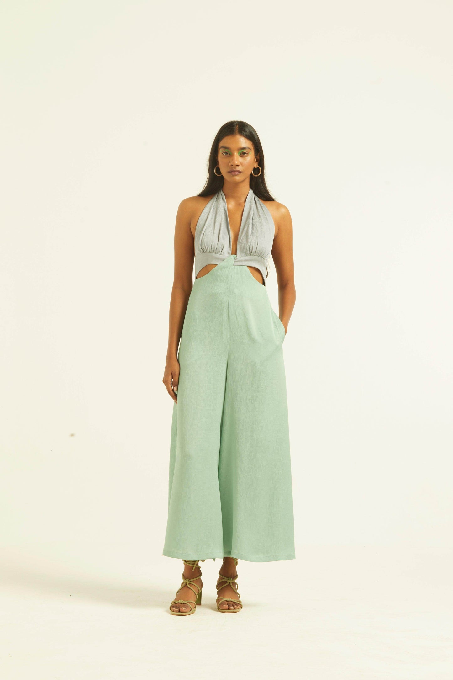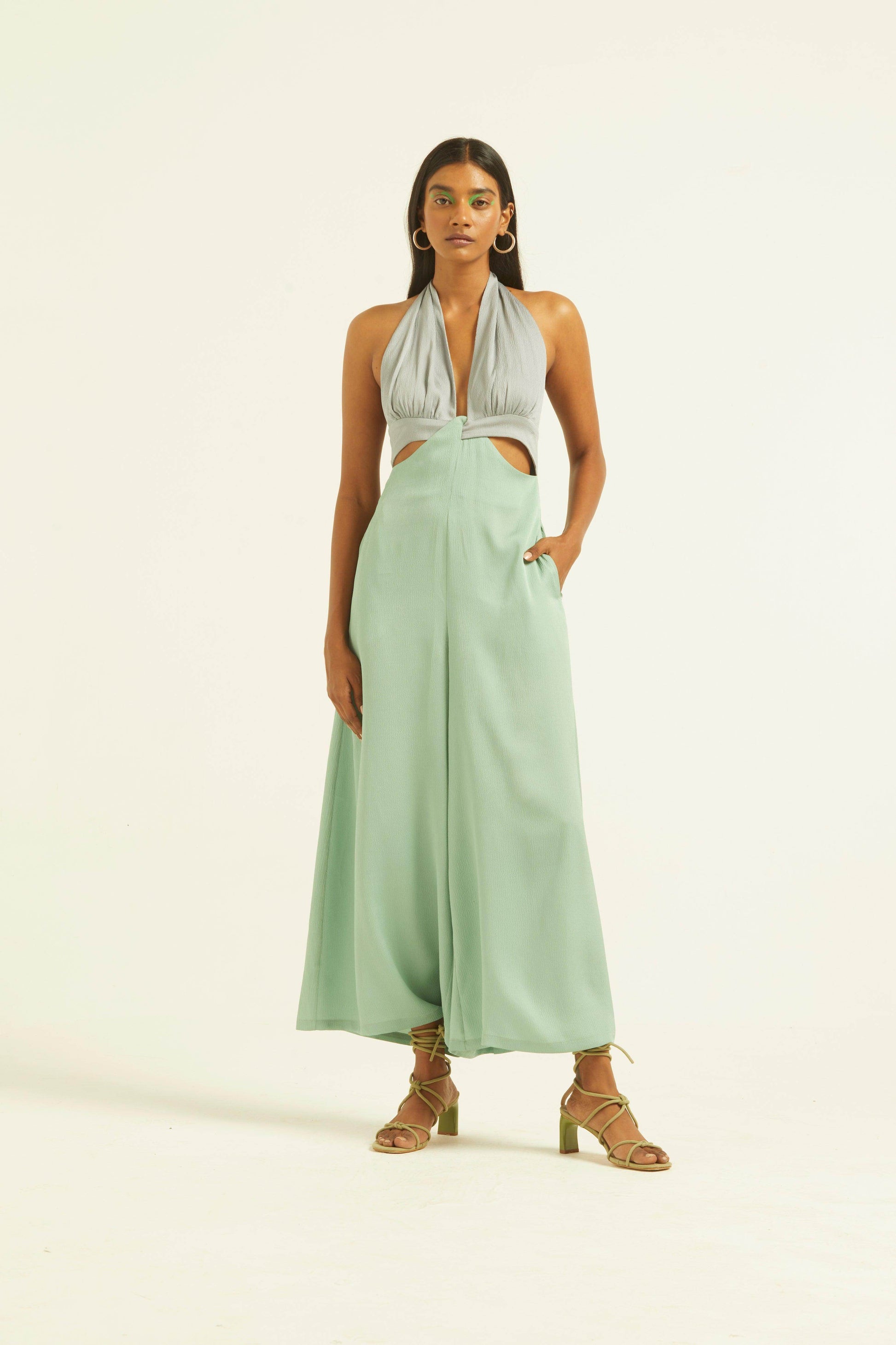 Seafoam and grey blocked jumpsuit in a flowy textured fabric. Wide-legged, halter neck with under bust cutout. Ties up behind the neck, zipper at the back, pockets on the side.