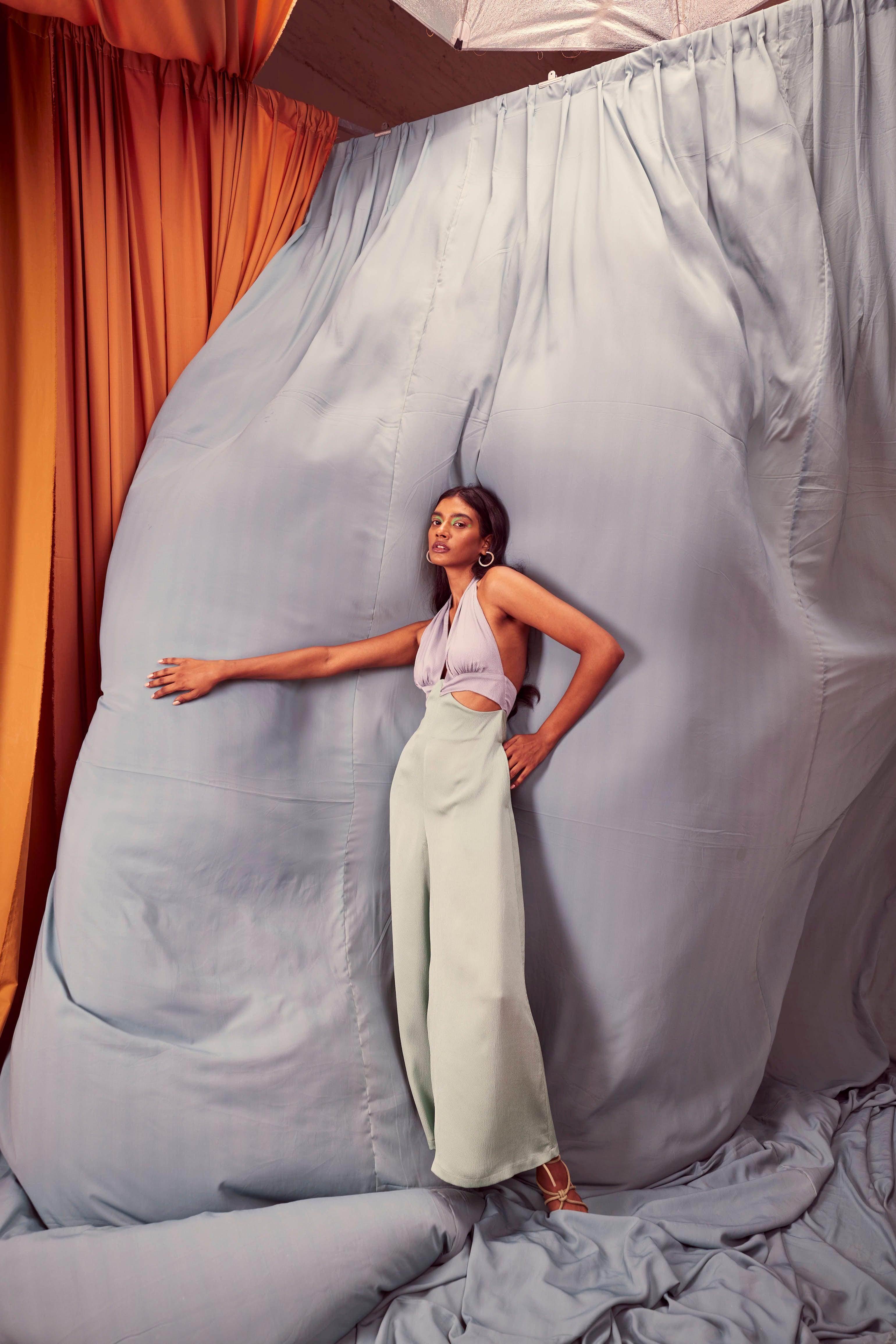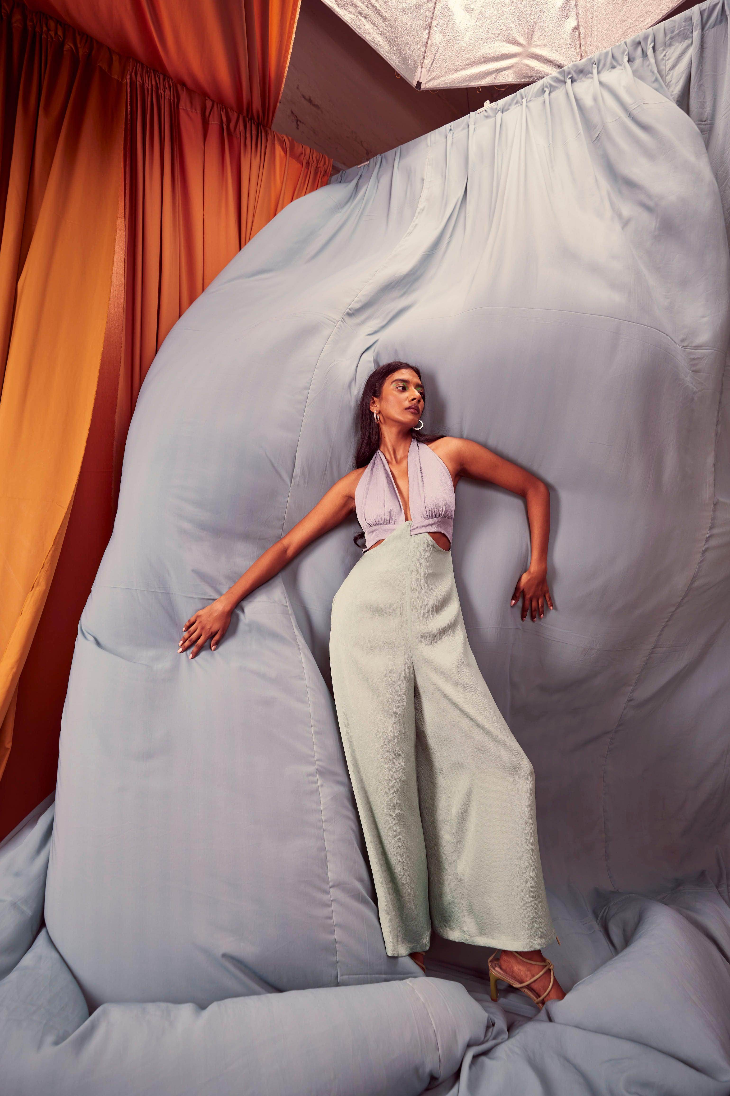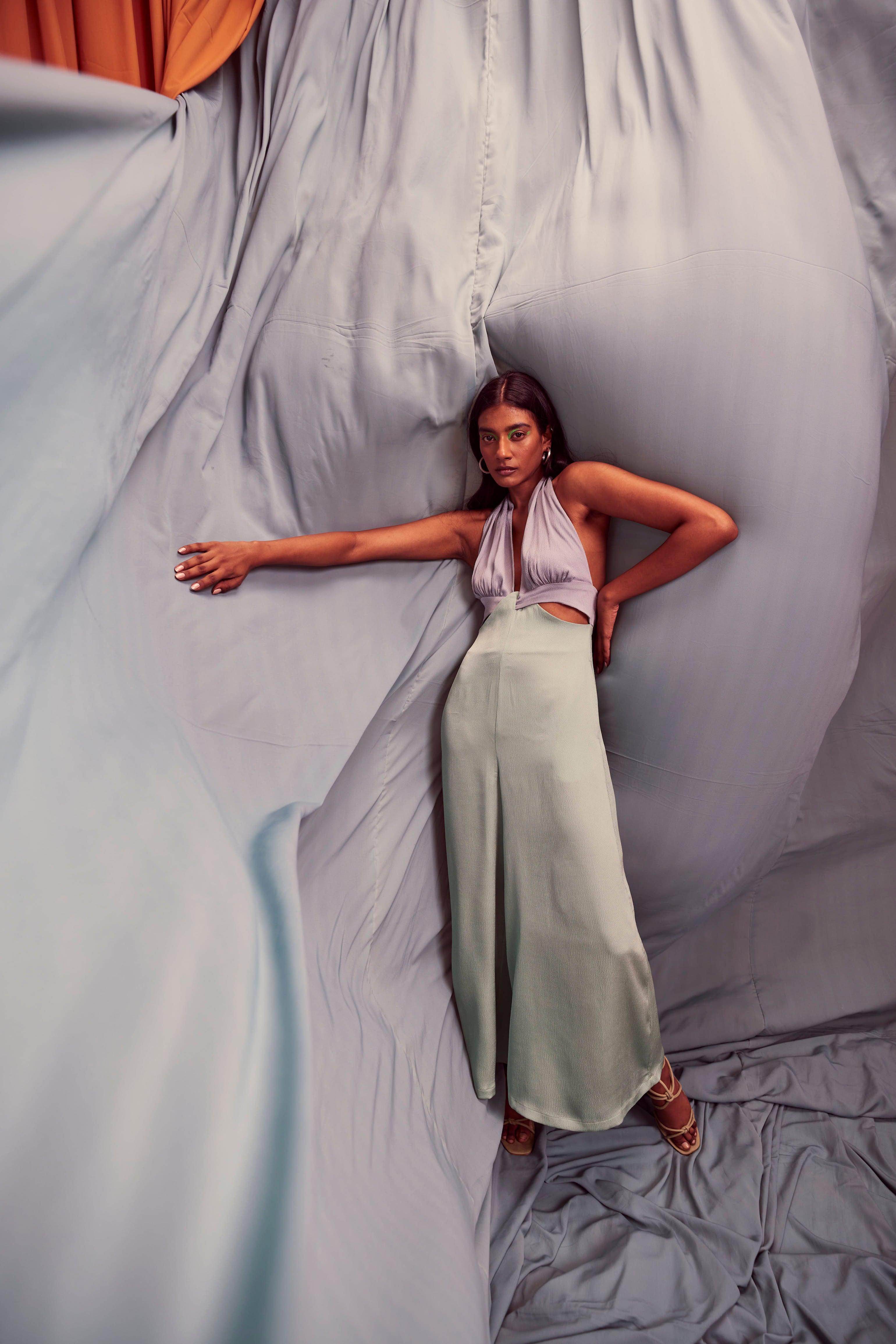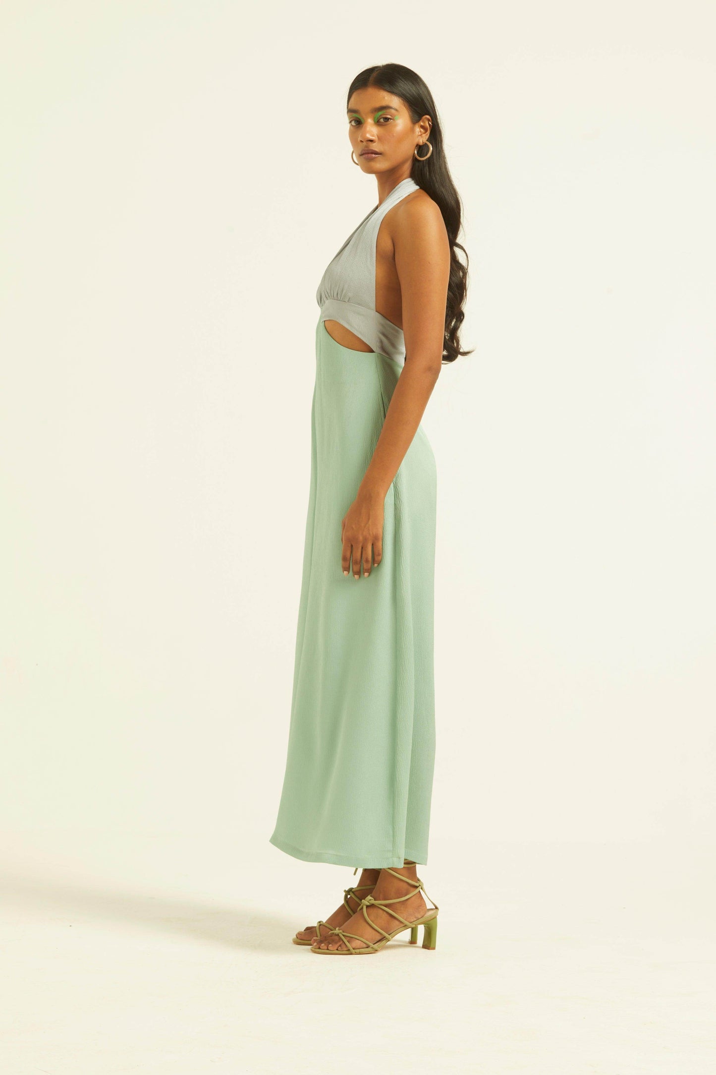 Seafoam and grey blocked jumpsuit in a flowy textured fabric. Wide-legged, halter neck with under bust cutout. Ties up behind the neck, zipper at the back, pockets on the side.