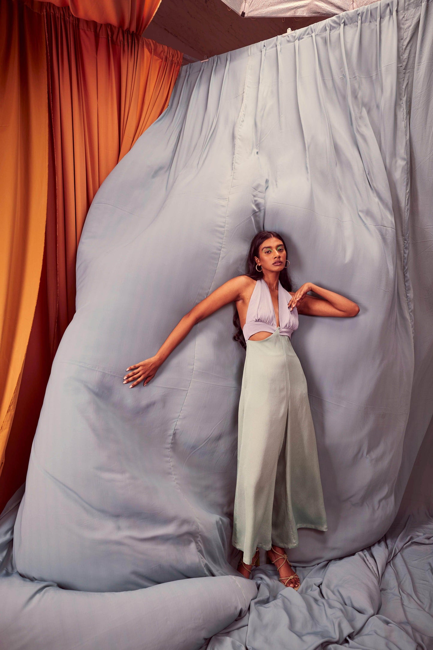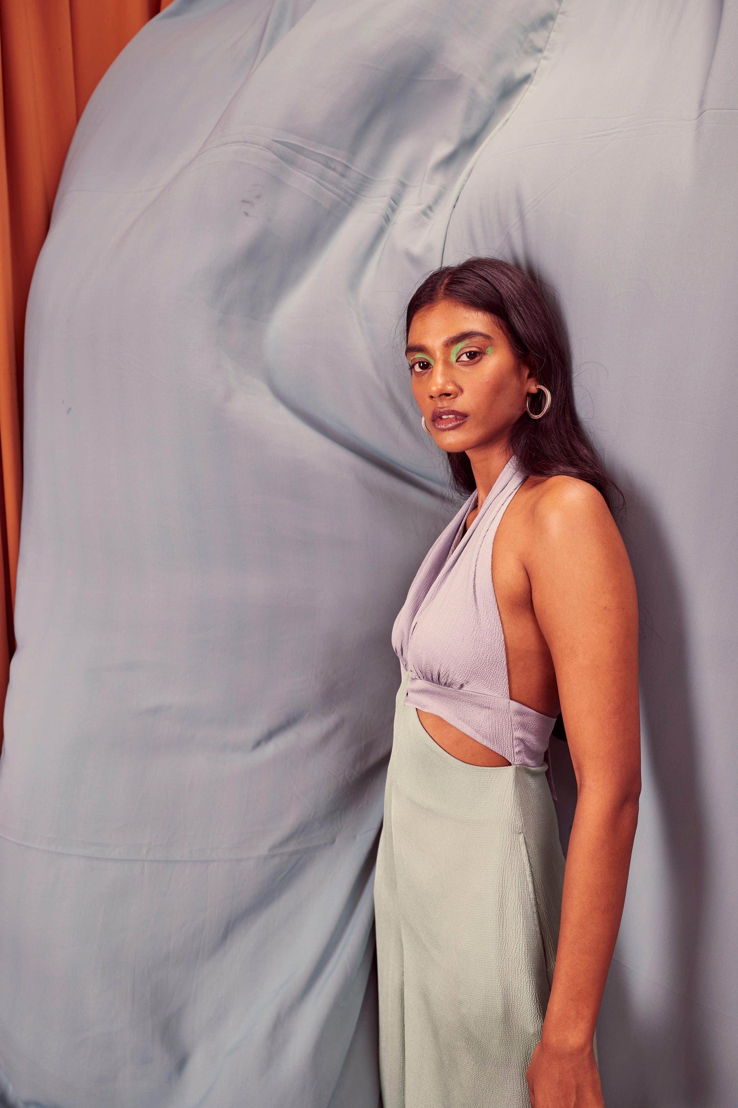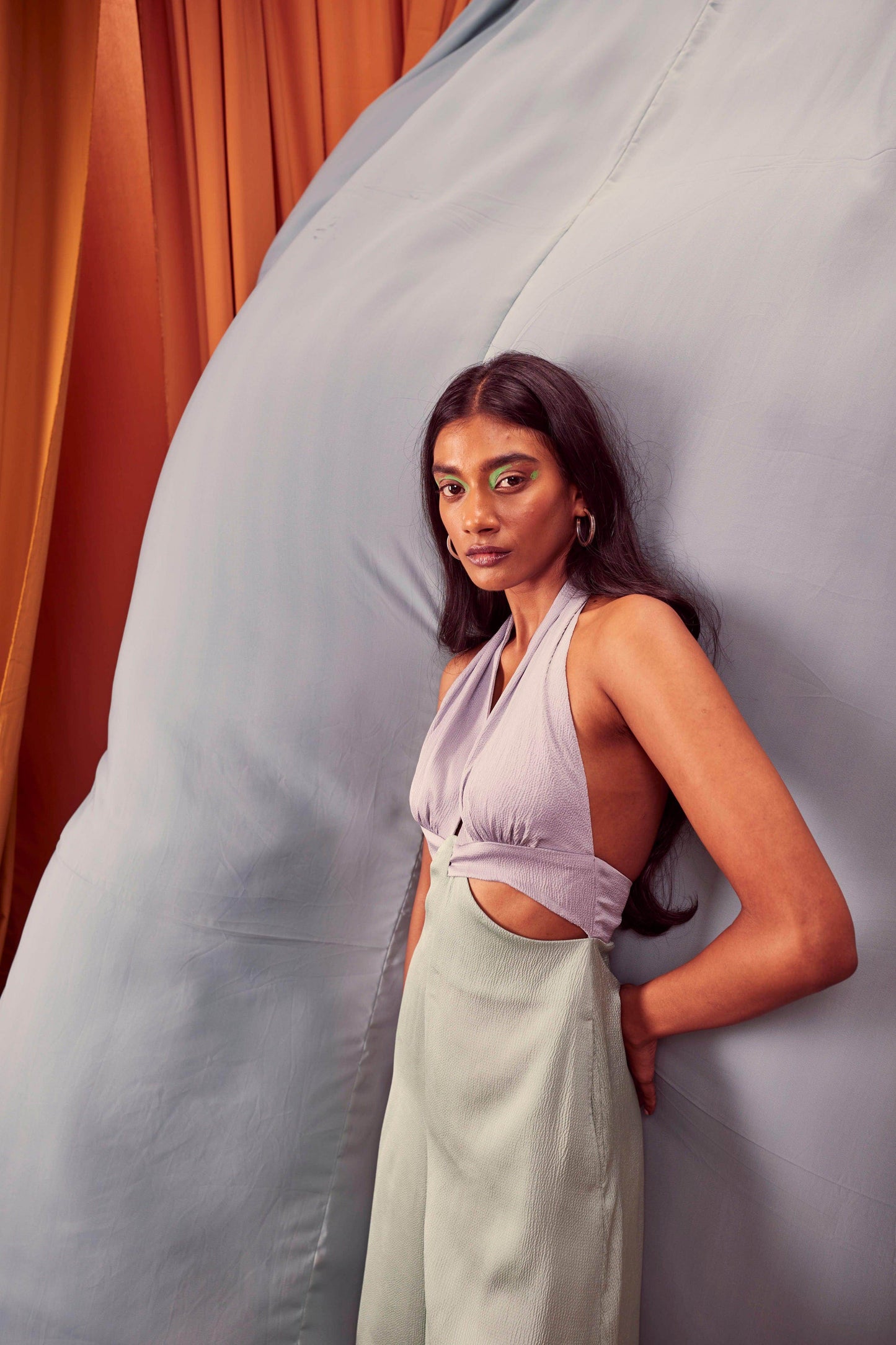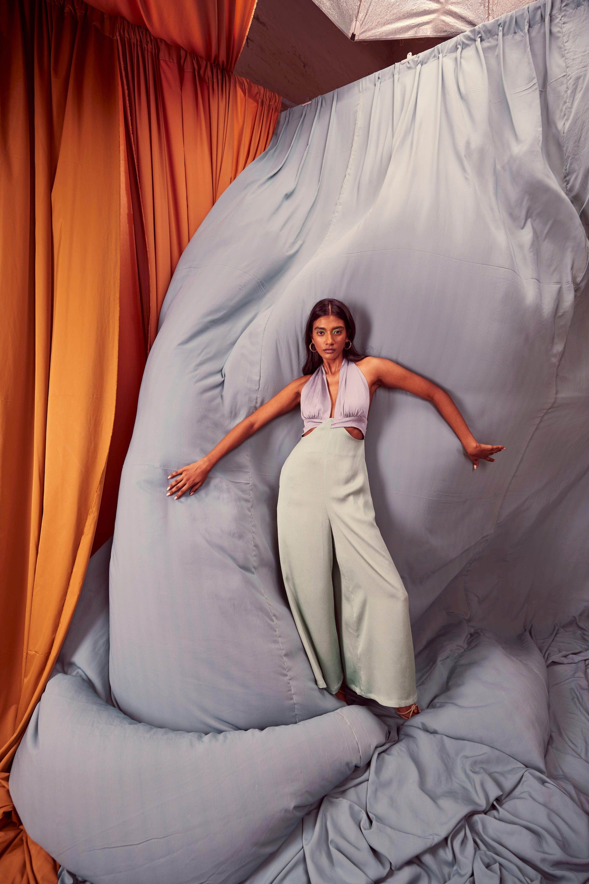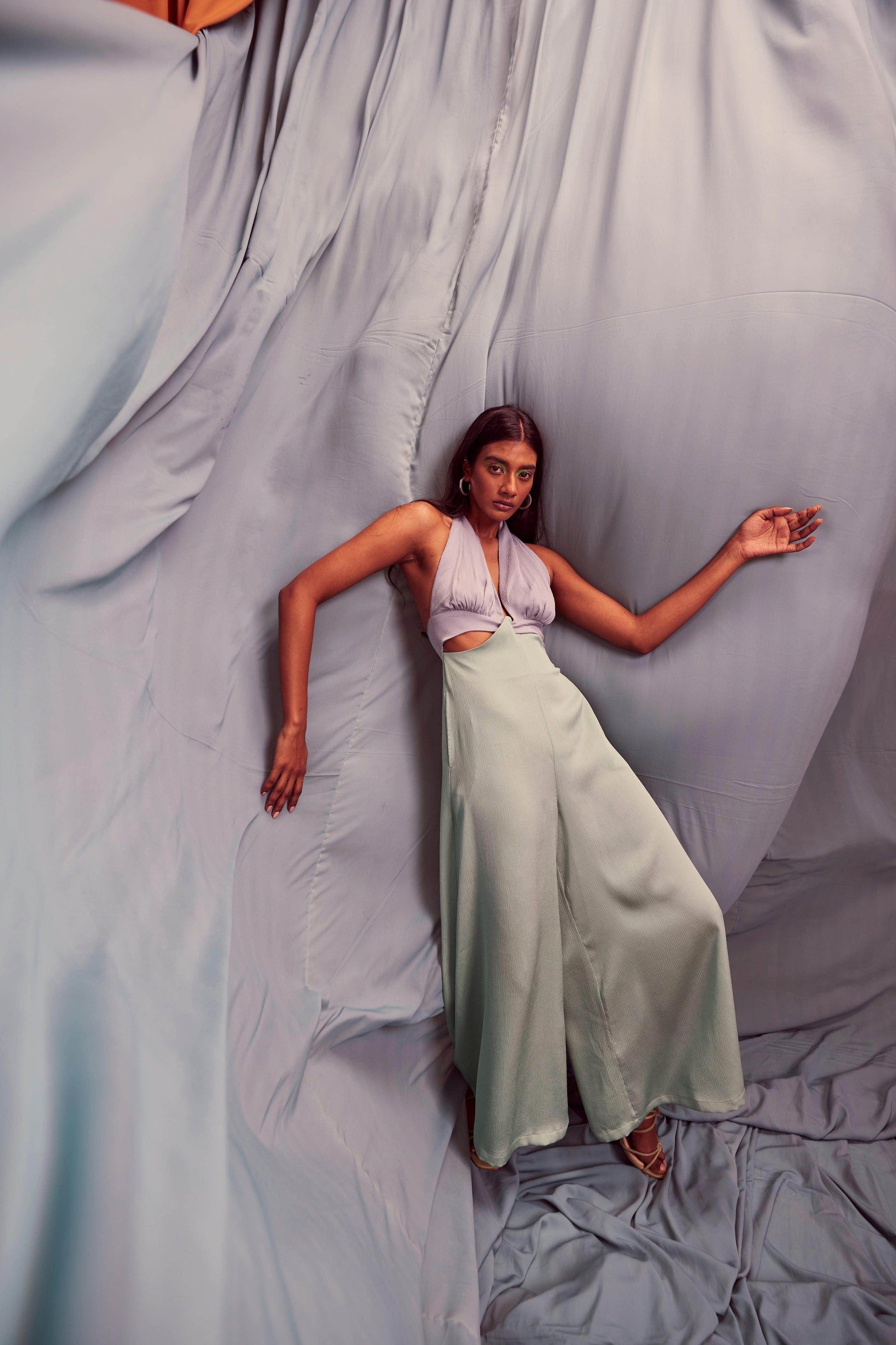 Seafoam and grey blocked jumpsuit in a flowy textured fabric. Wide-legged, halter neck with under bust cutout. Ties up behind the neck, zipper at the back, pockets on the side.