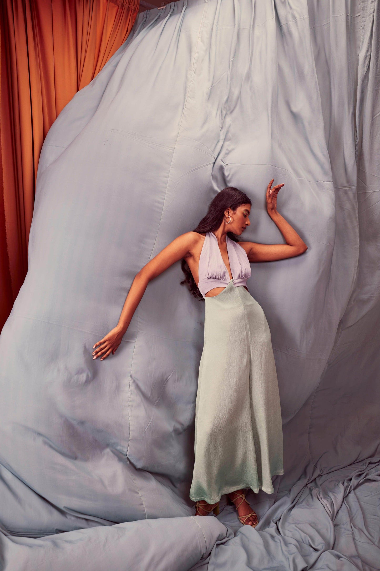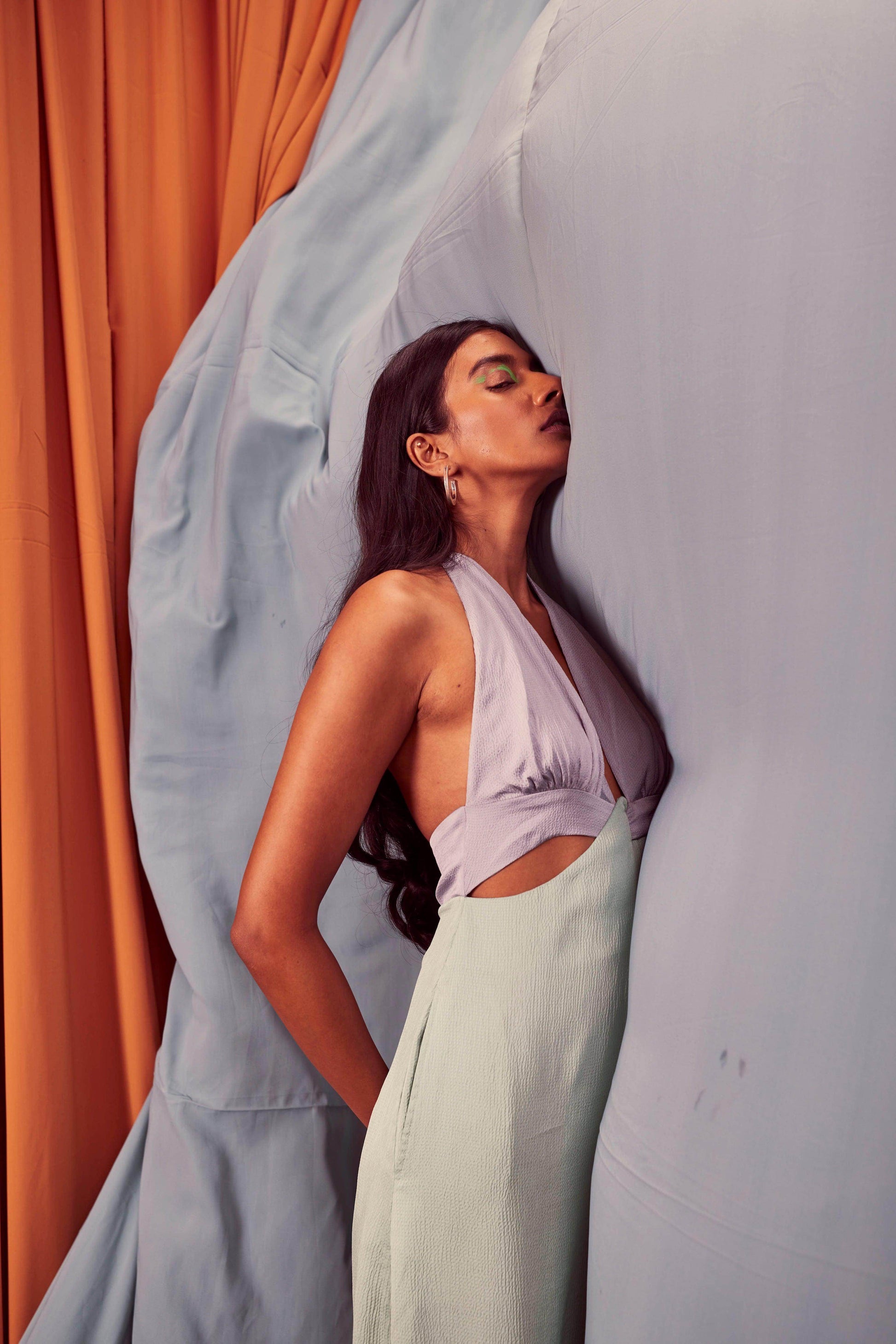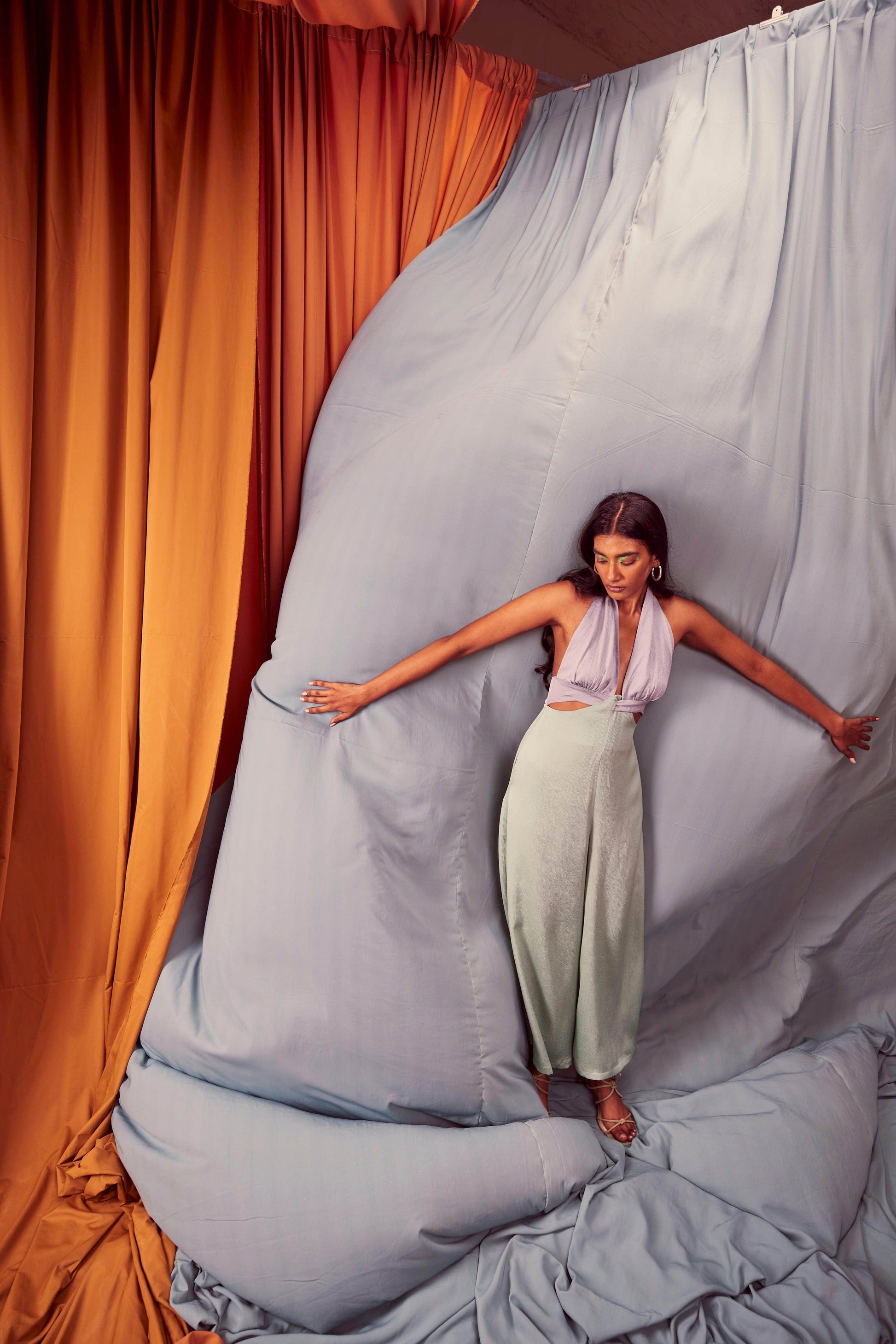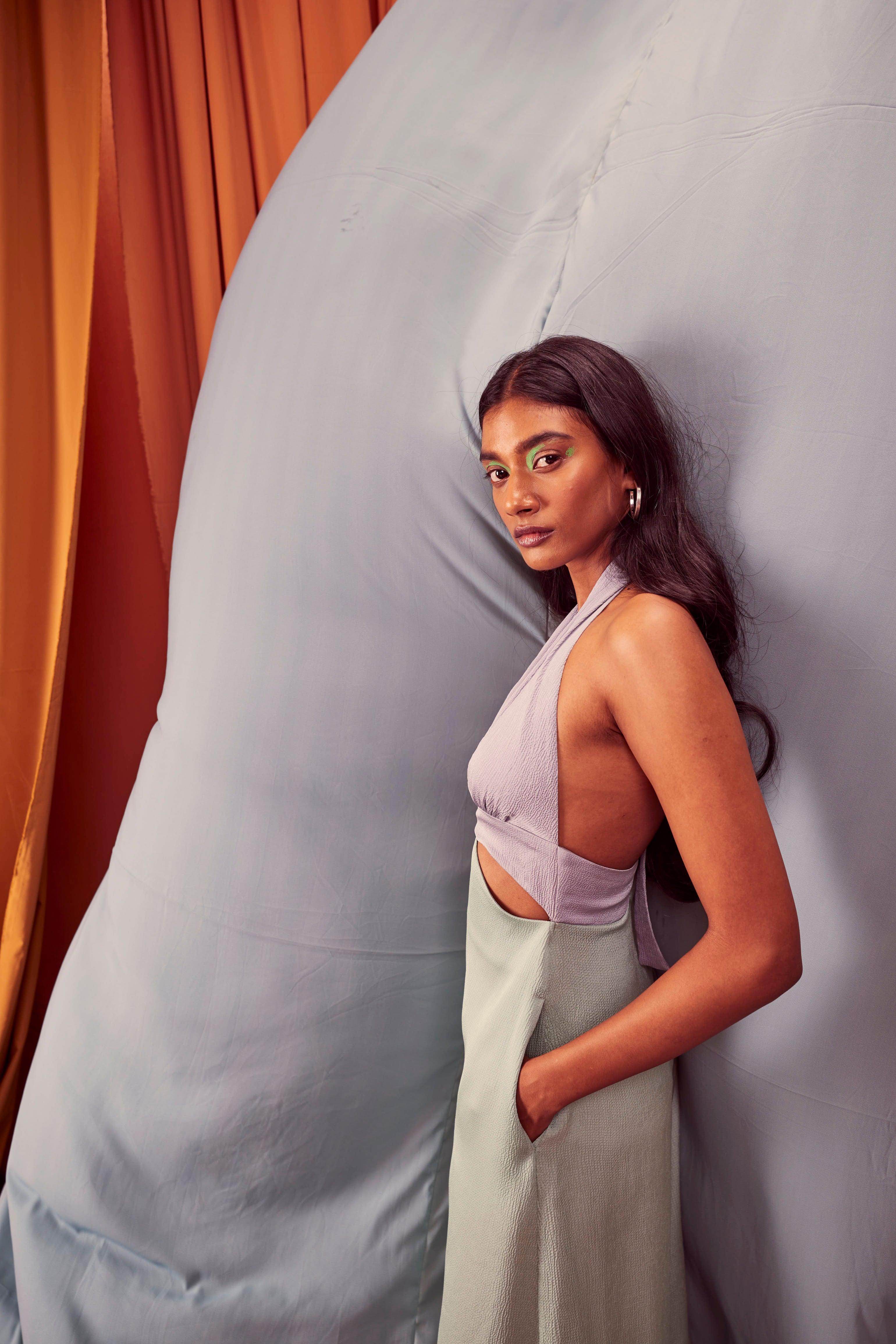 Seafoam and grey blocked jumpsuit in a flowy textured fabric. Wide-legged, halter neck with under bust cutout. Ties up behind the neck, zipper at the back, pockets on the side.