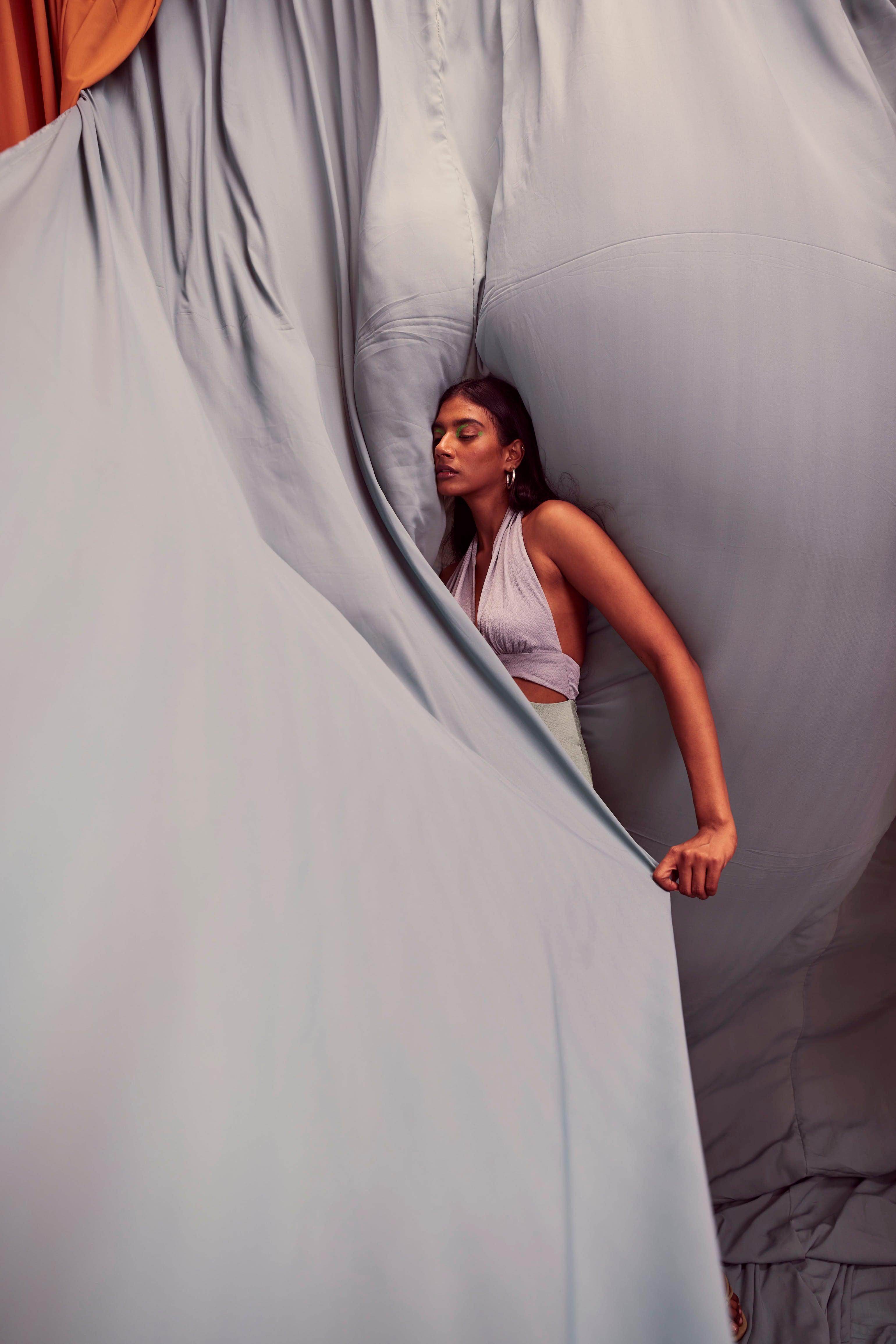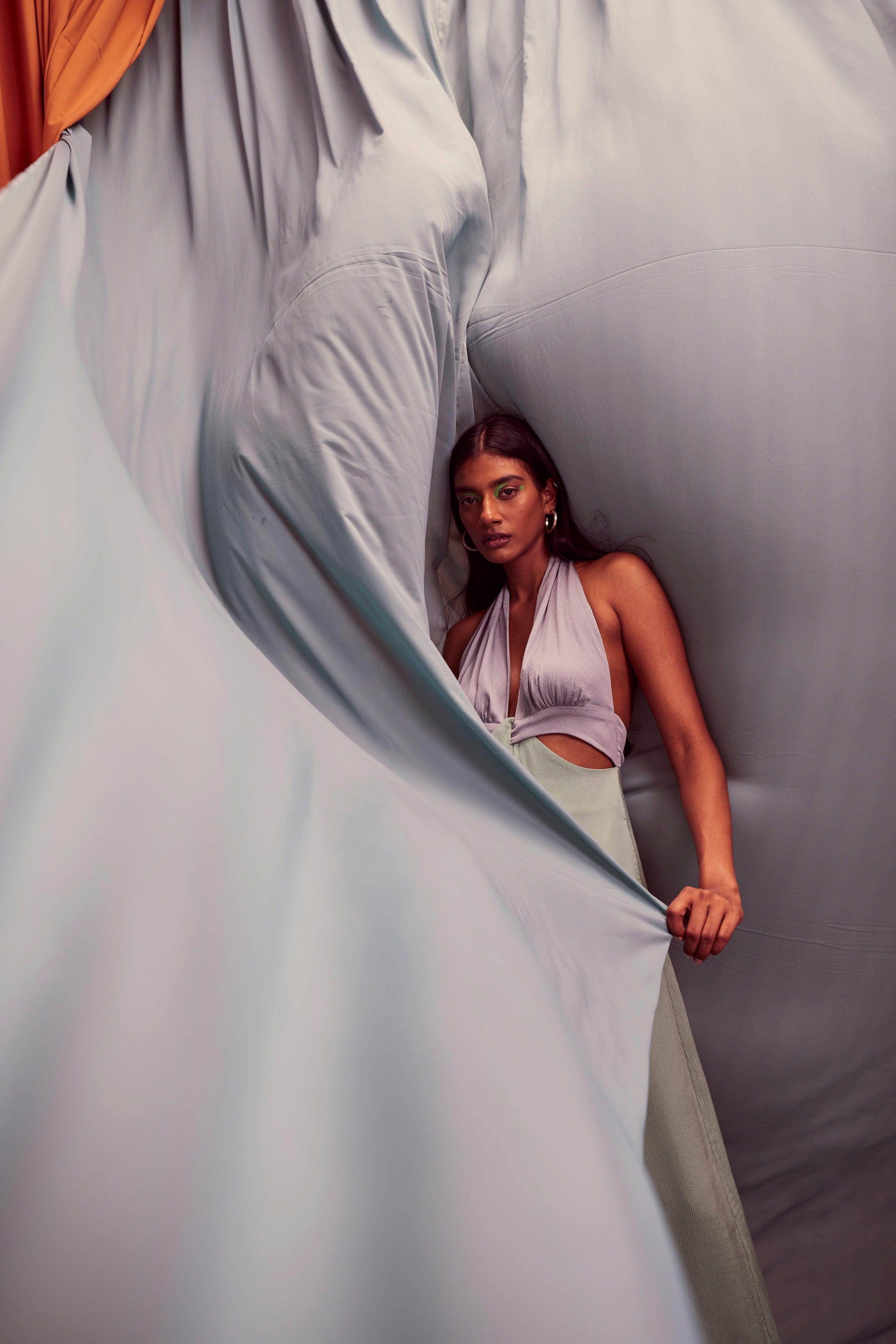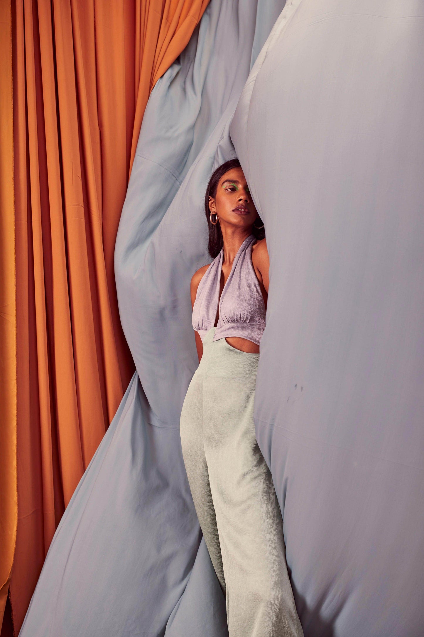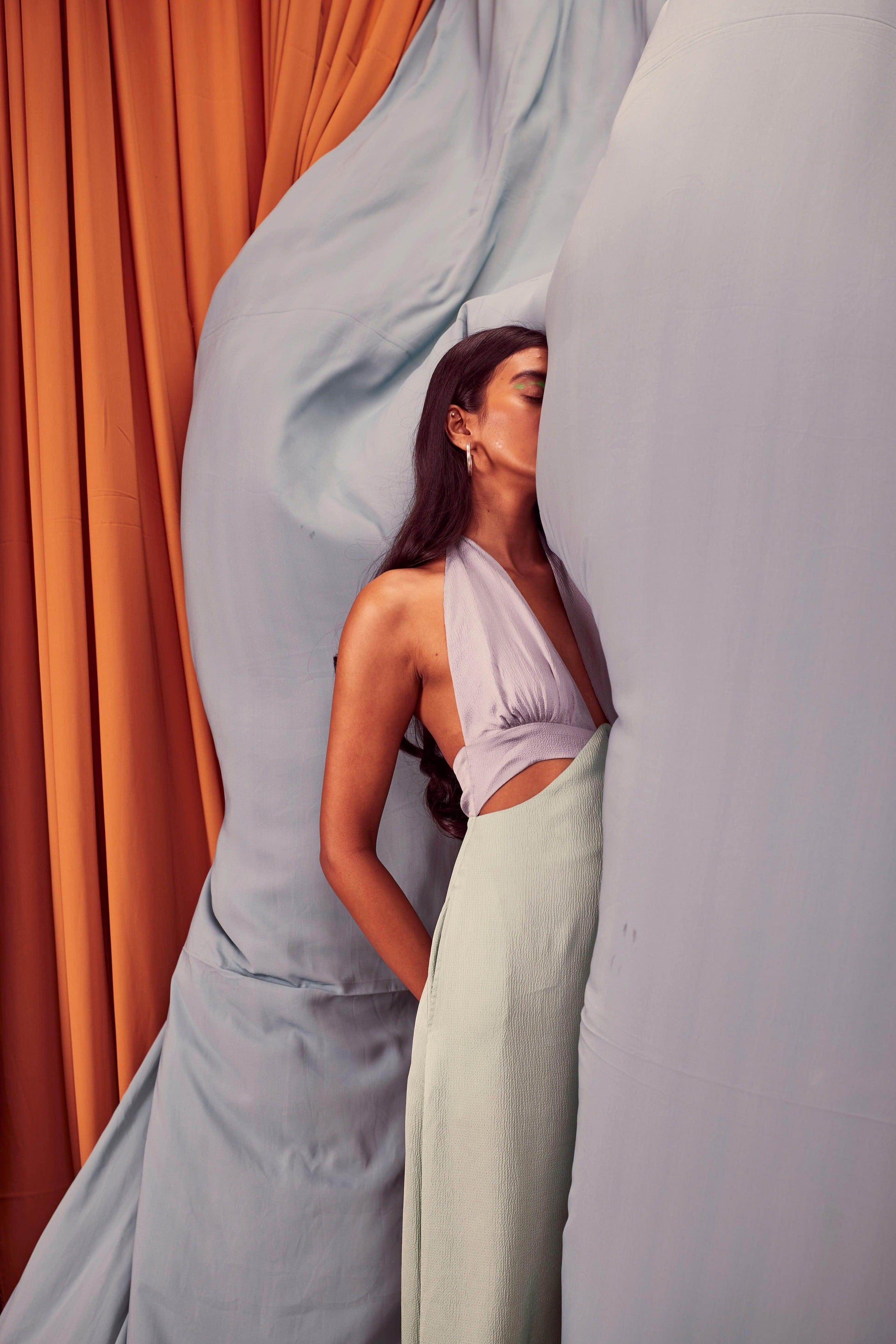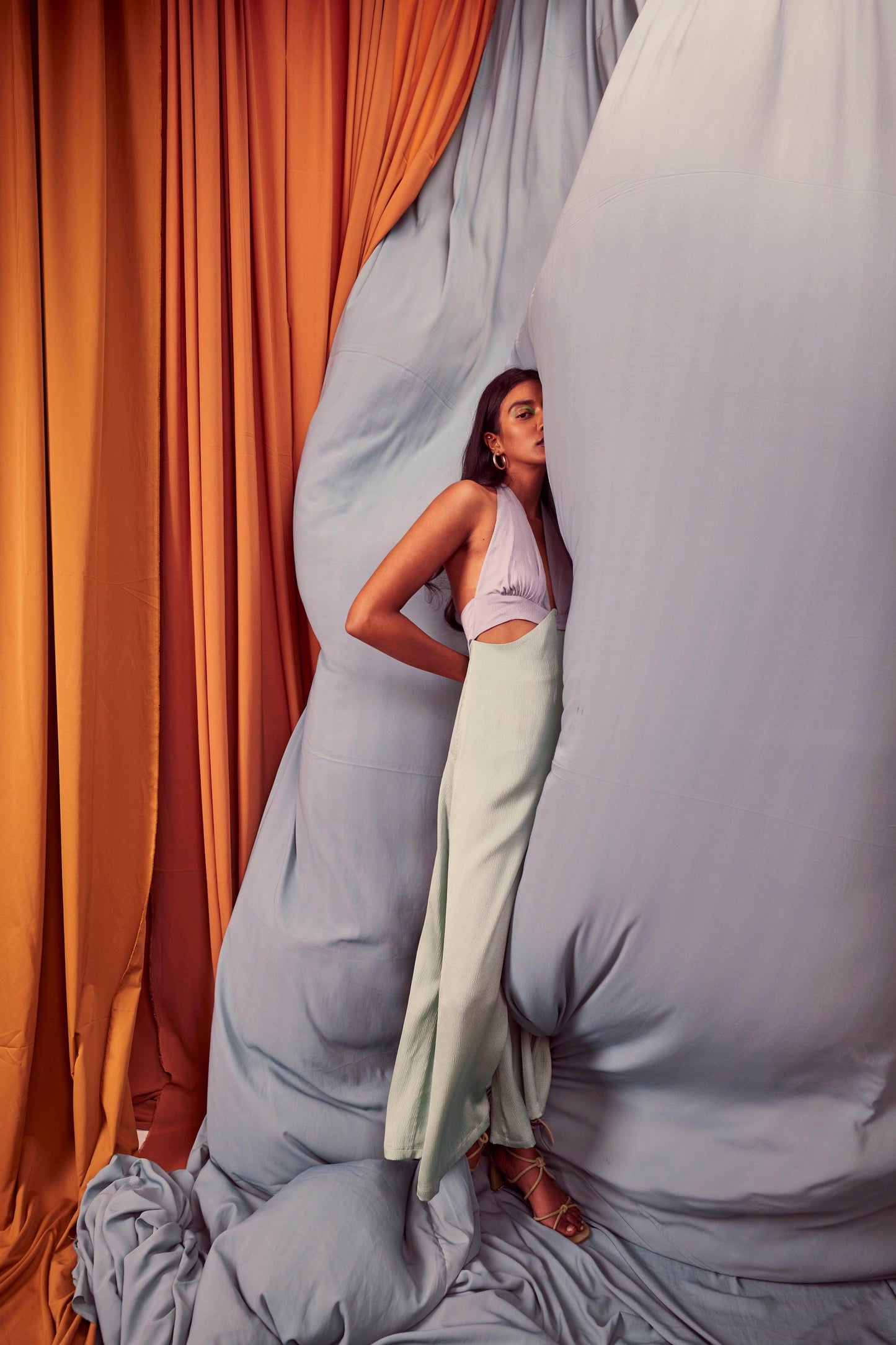 Seafoam and grey blocked jumpsuit in a flowy textured fabric. Wide-legged, halter neck with under bust cutout. Ties up behind the neck, zipper at the back, pockets on the side.