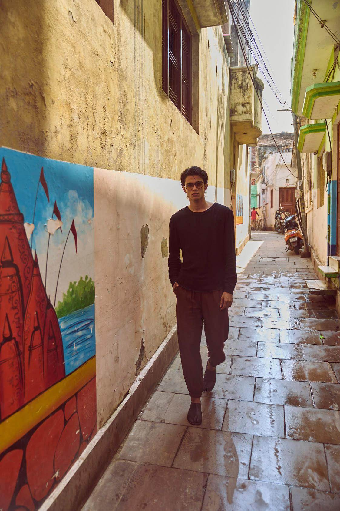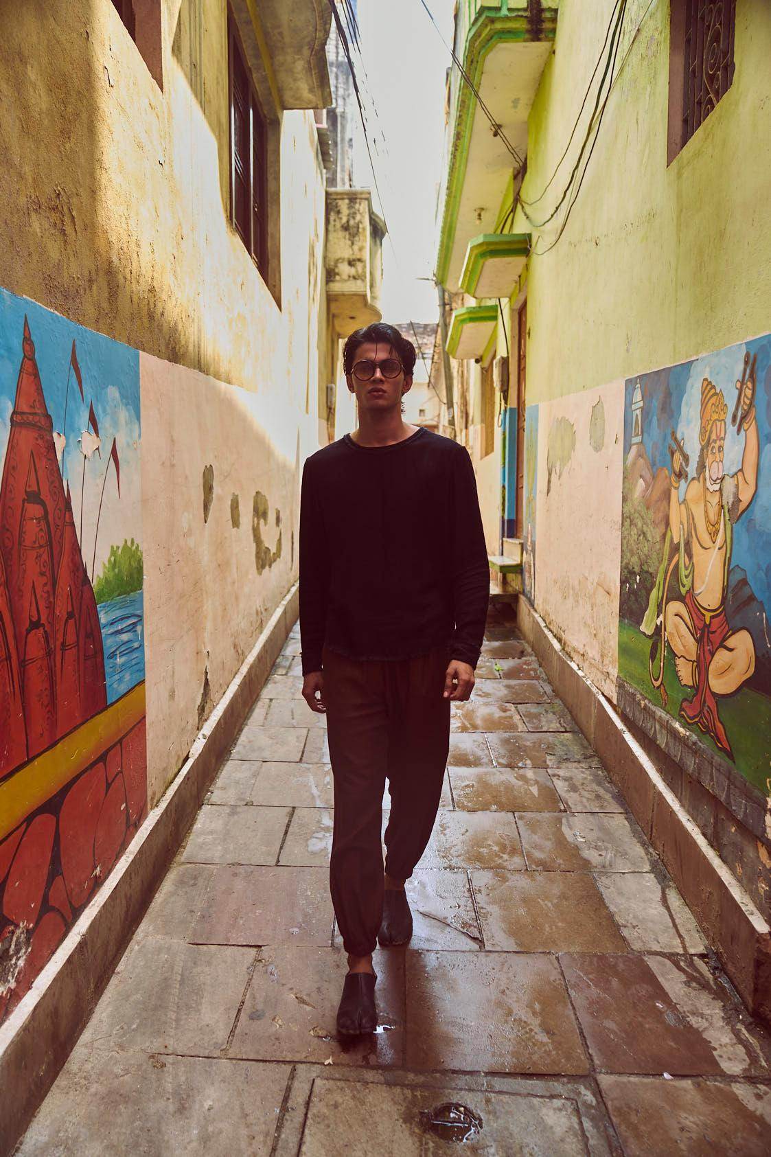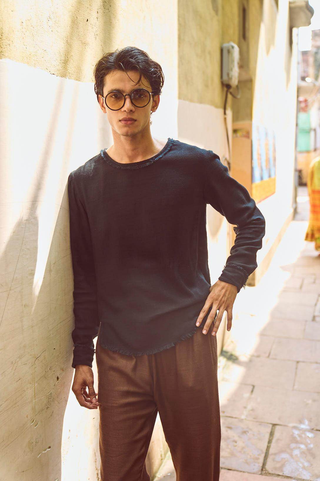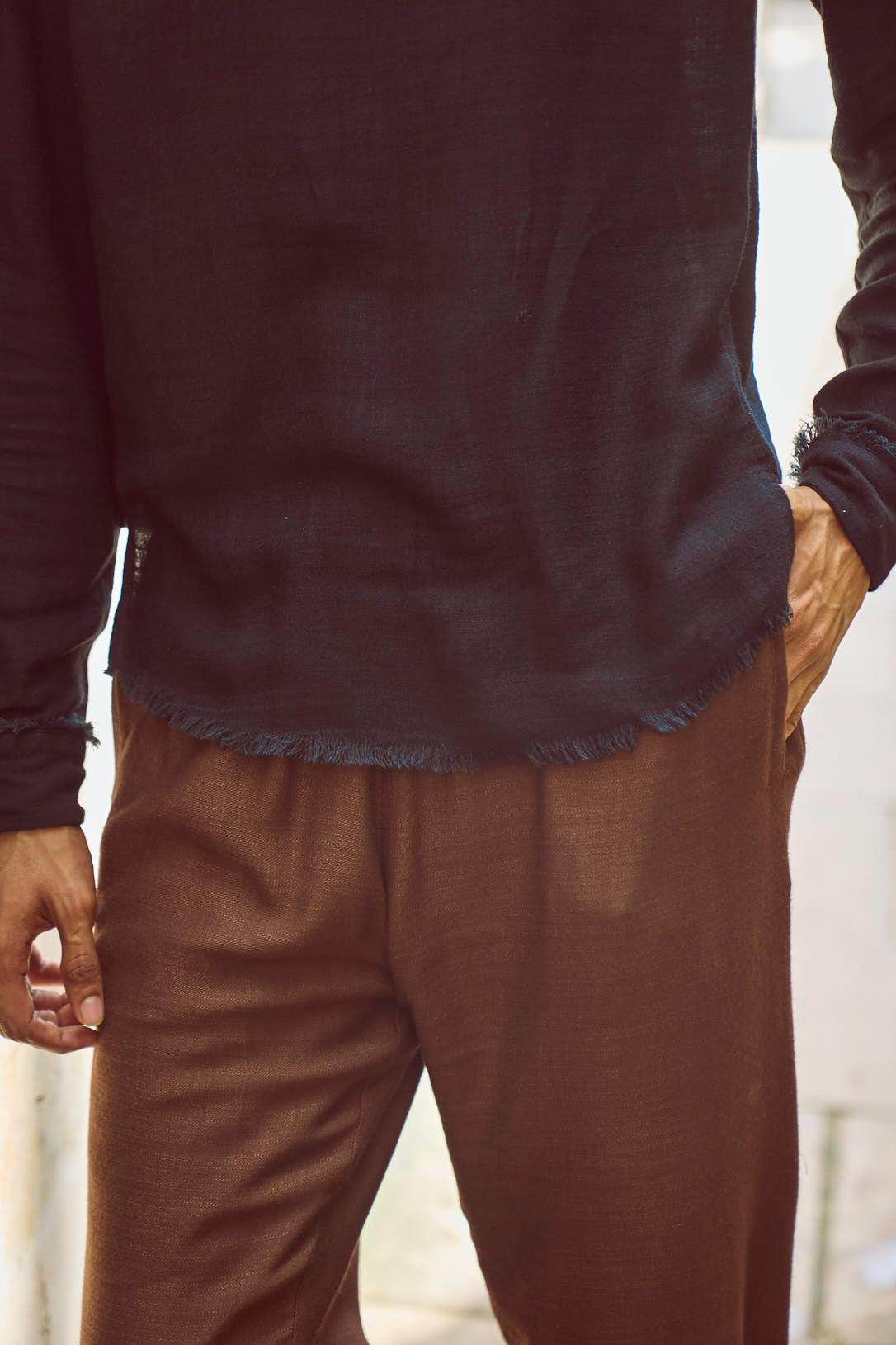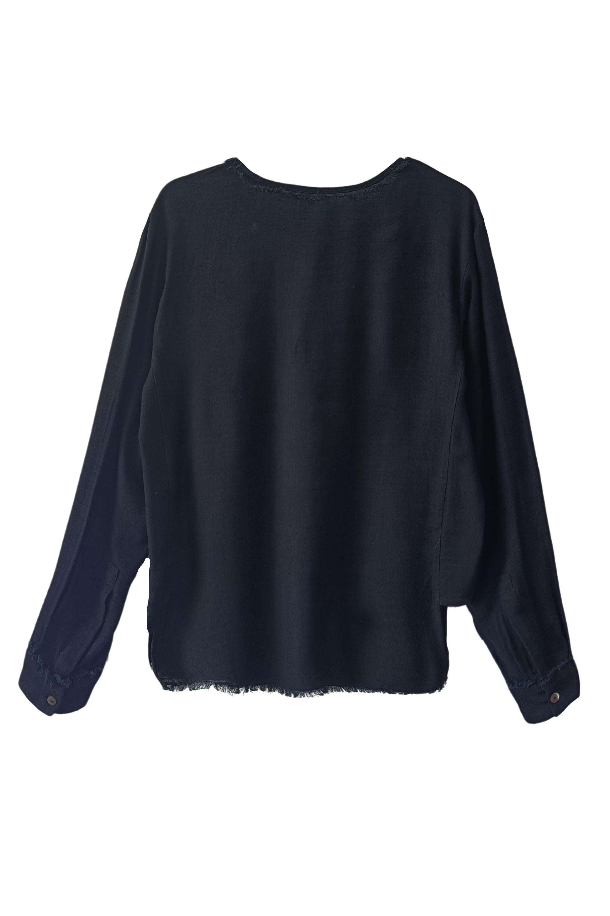 Black popover shirt in slub textured fabric. Raw hem detailing at the neckline, sleeve cuffs, and front and back hem of the shirt. Full sleeves with button closure at the cuffs. Long on the front and back with a shorter side panel.