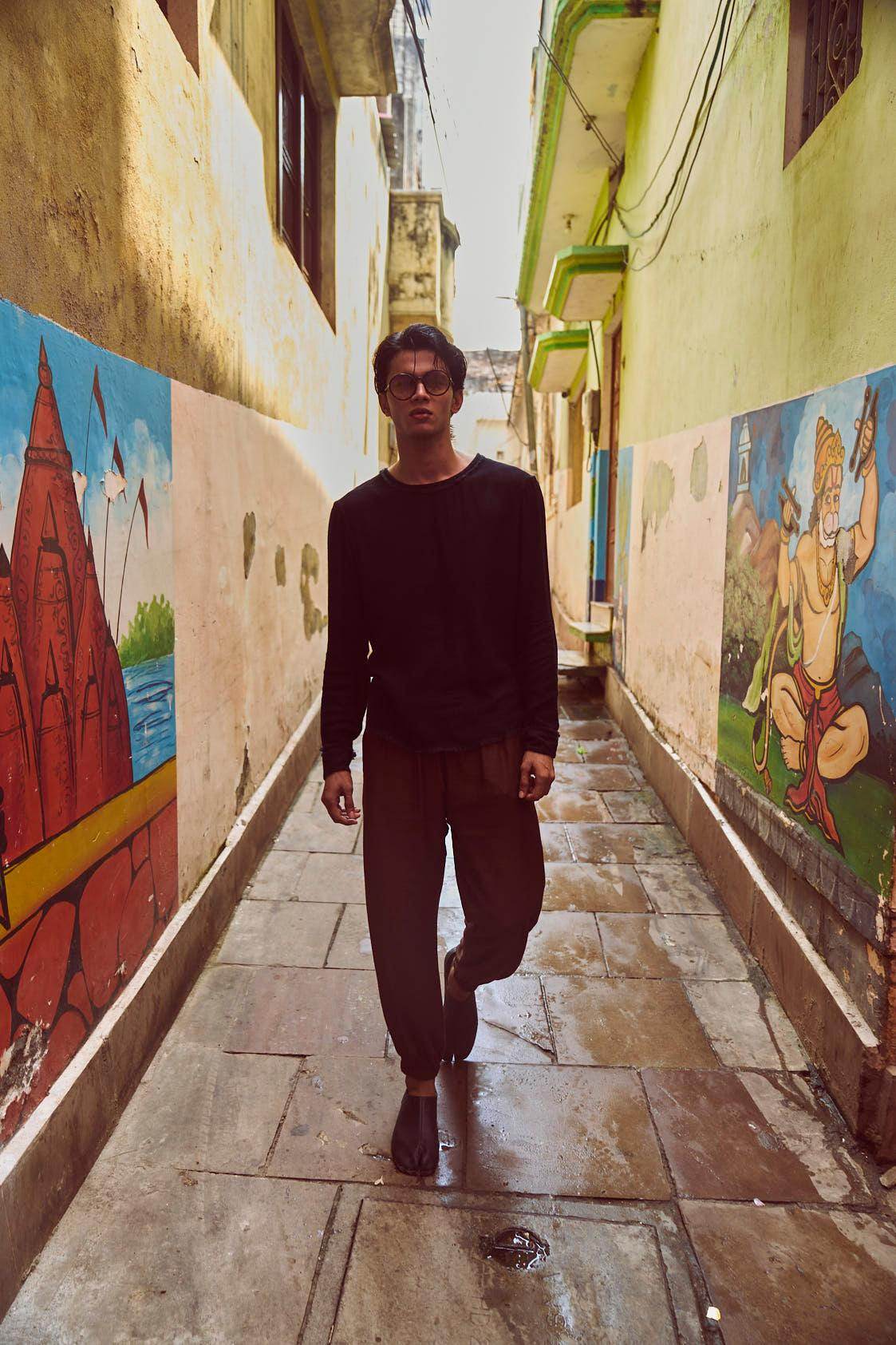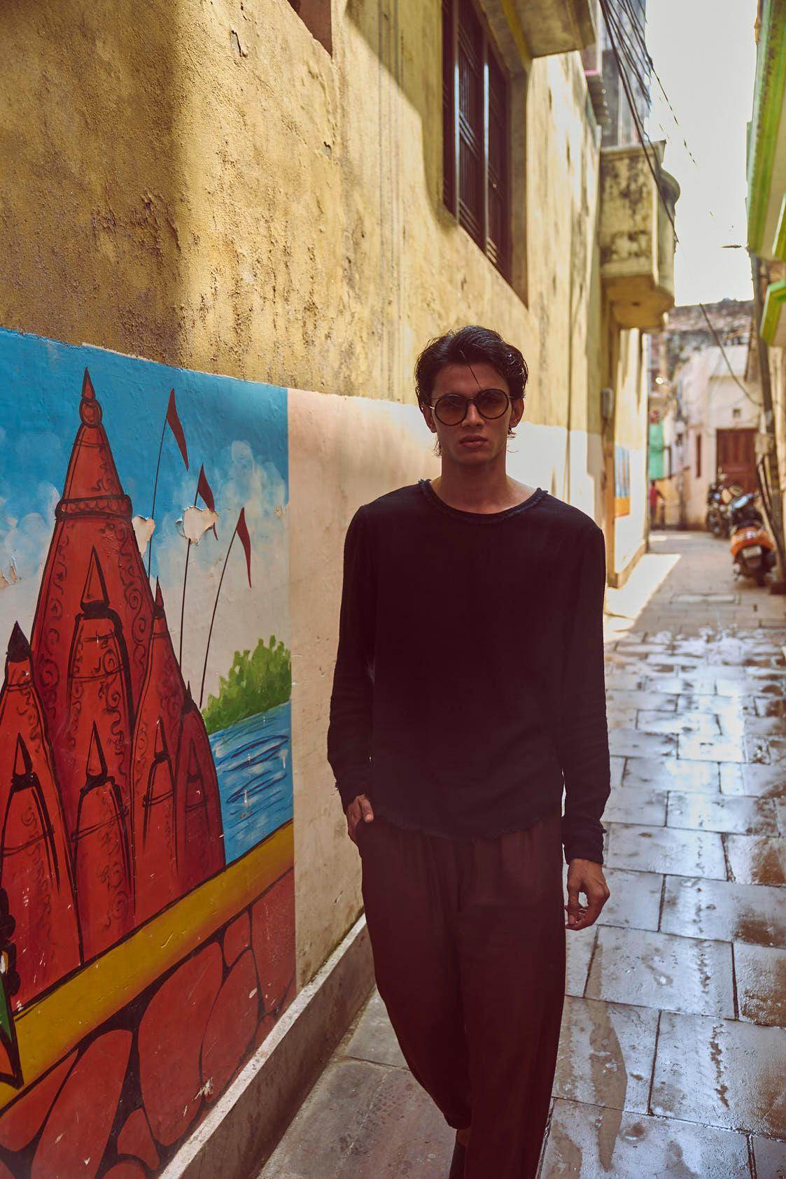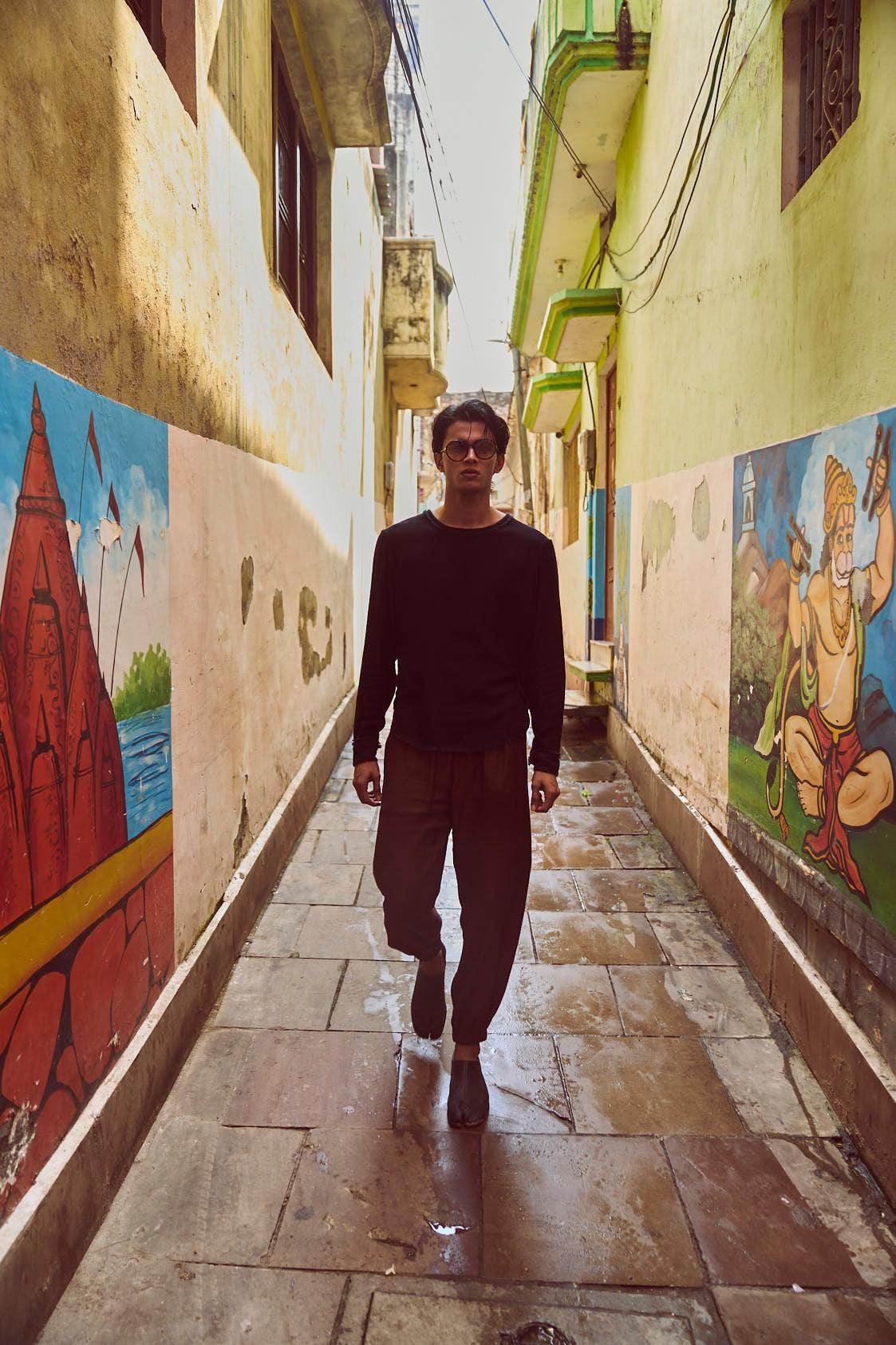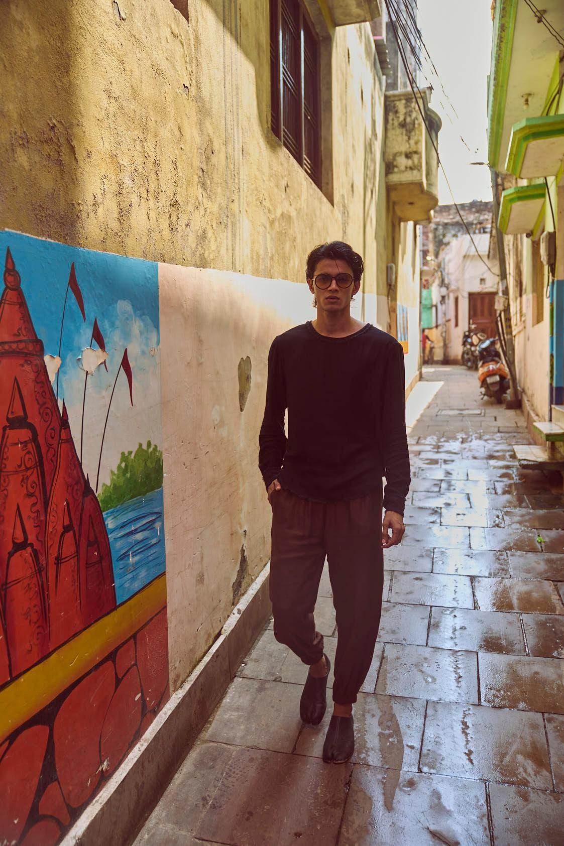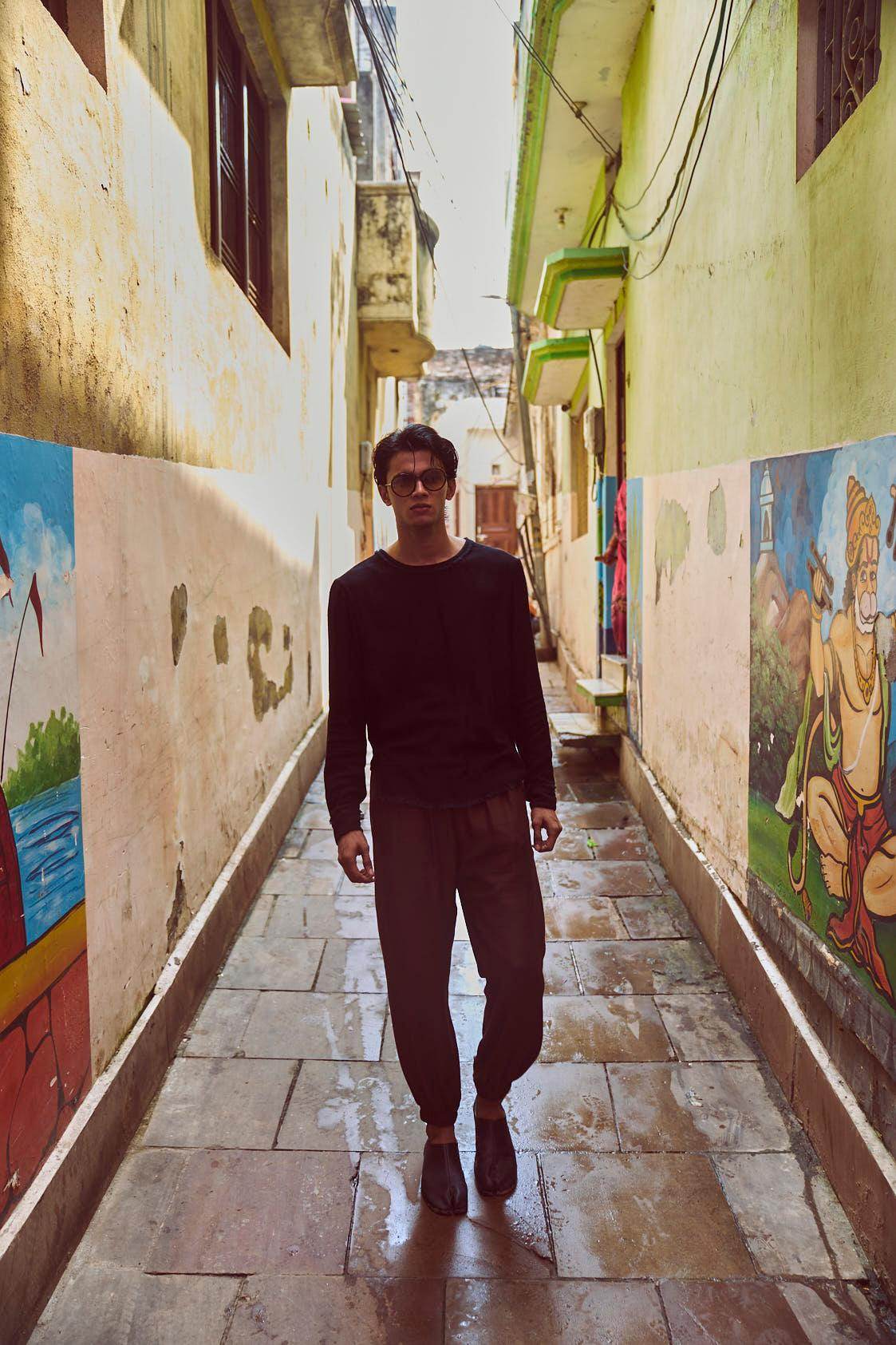 Black popover shirt in slub textured fabric. Raw hem detailing at the neckline, sleeve cuffs, and front and back hem of the shirt. Full sleeves with button closure at the cuffs. Long on the front and back with a shorter side panel.