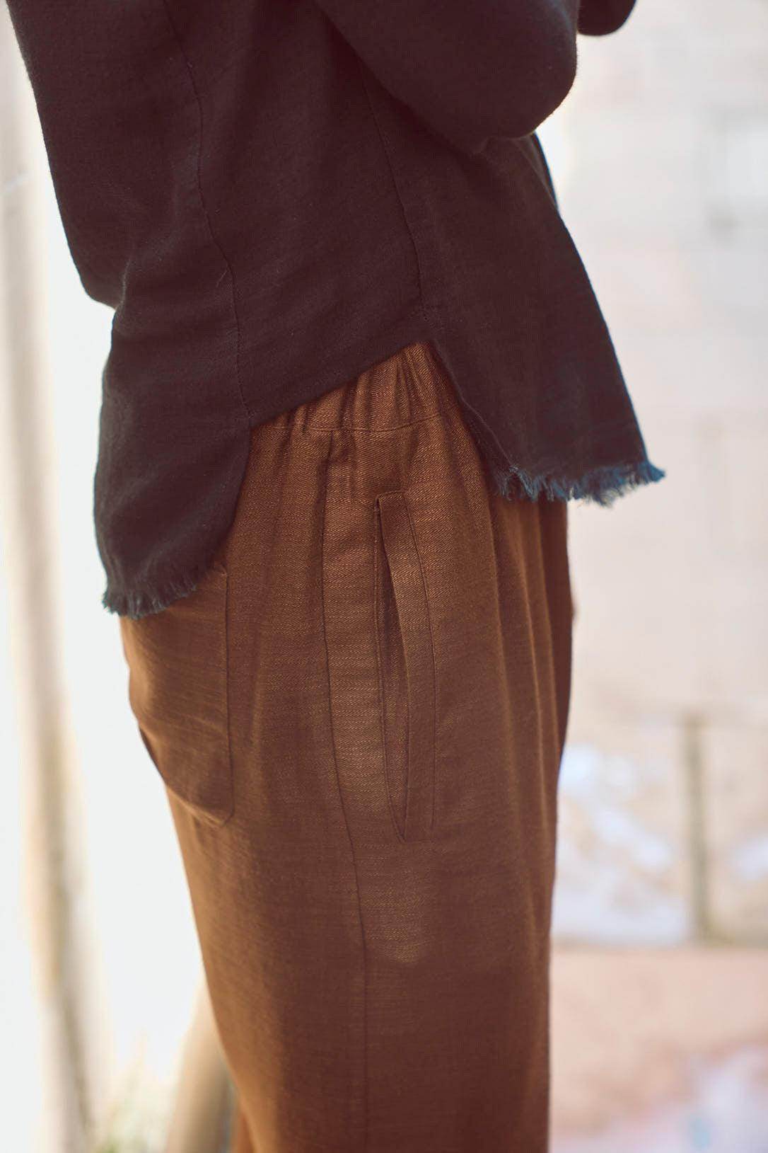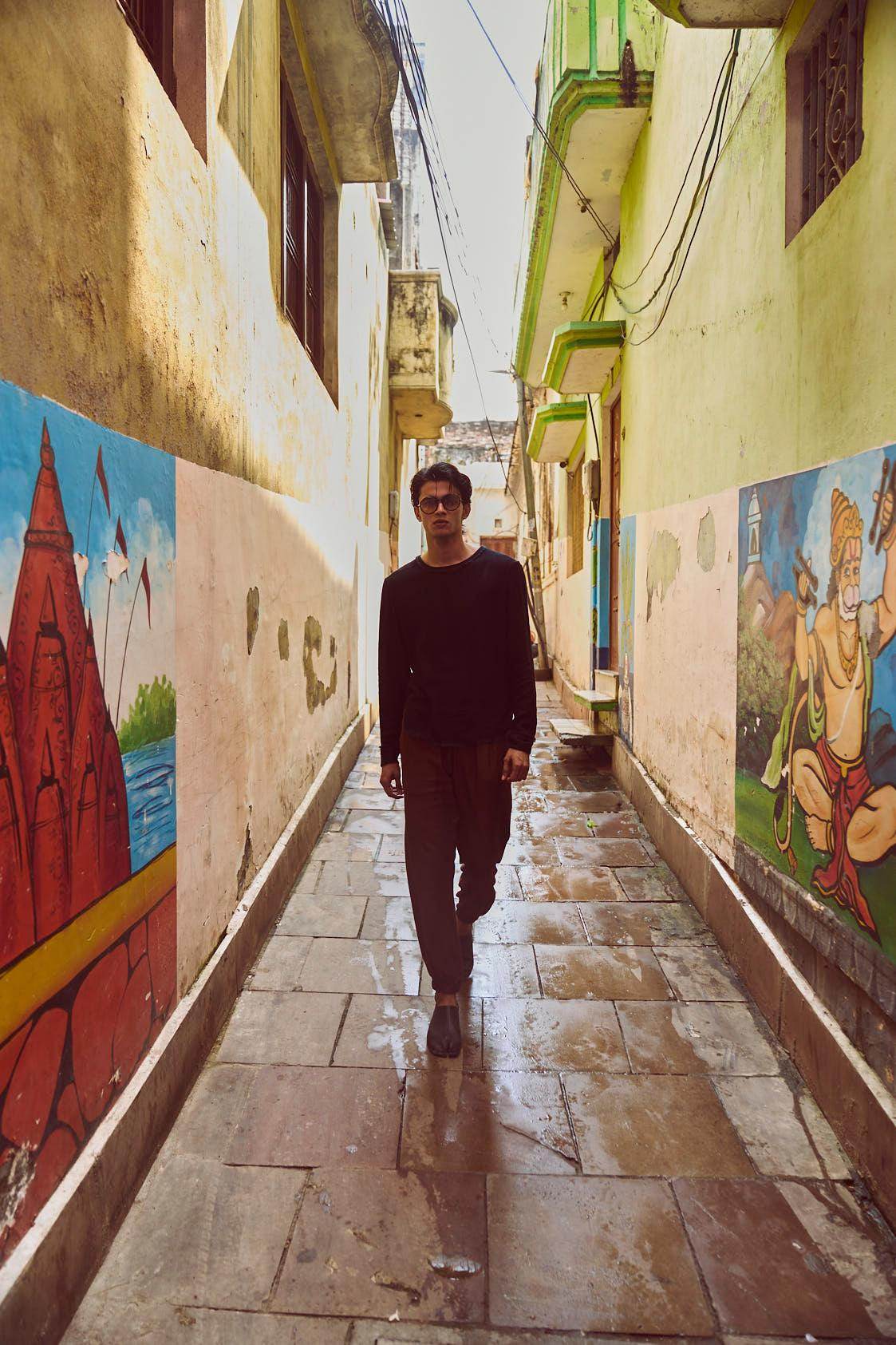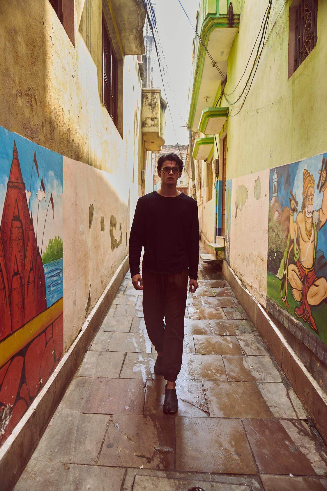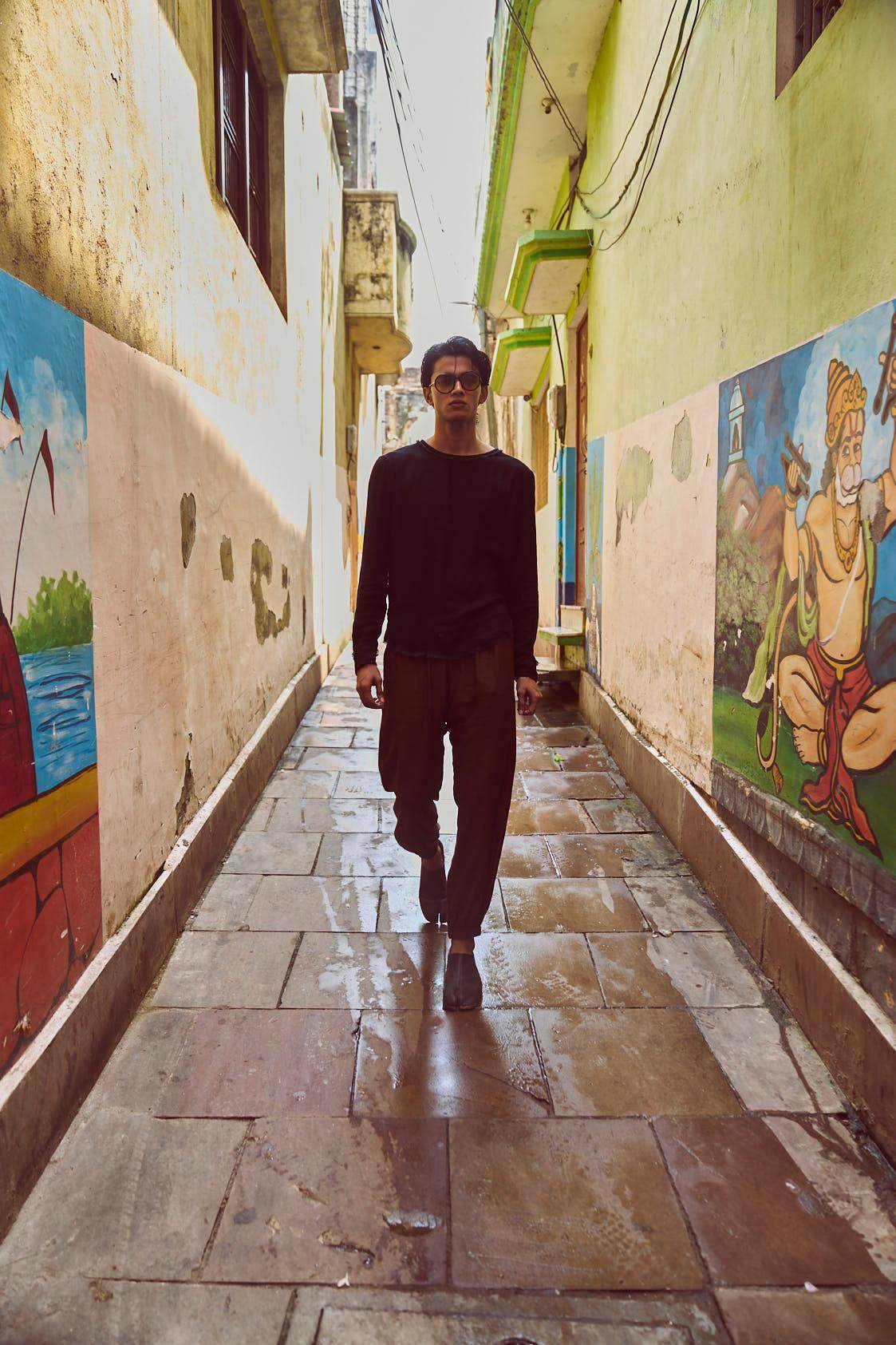 Black popover shirt in slub textured fabric. Raw hem detailing at the neckline, sleeve cuffs, and front and back hem of the shirt. Full sleeves with button closure at the cuffs. Long on the front and back with a shorter side panel.