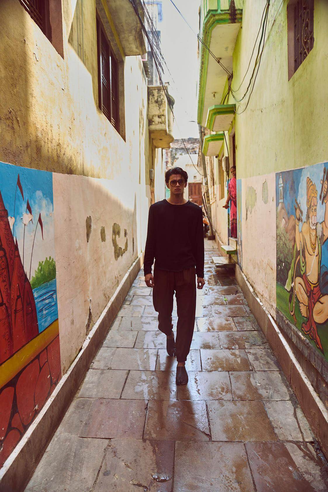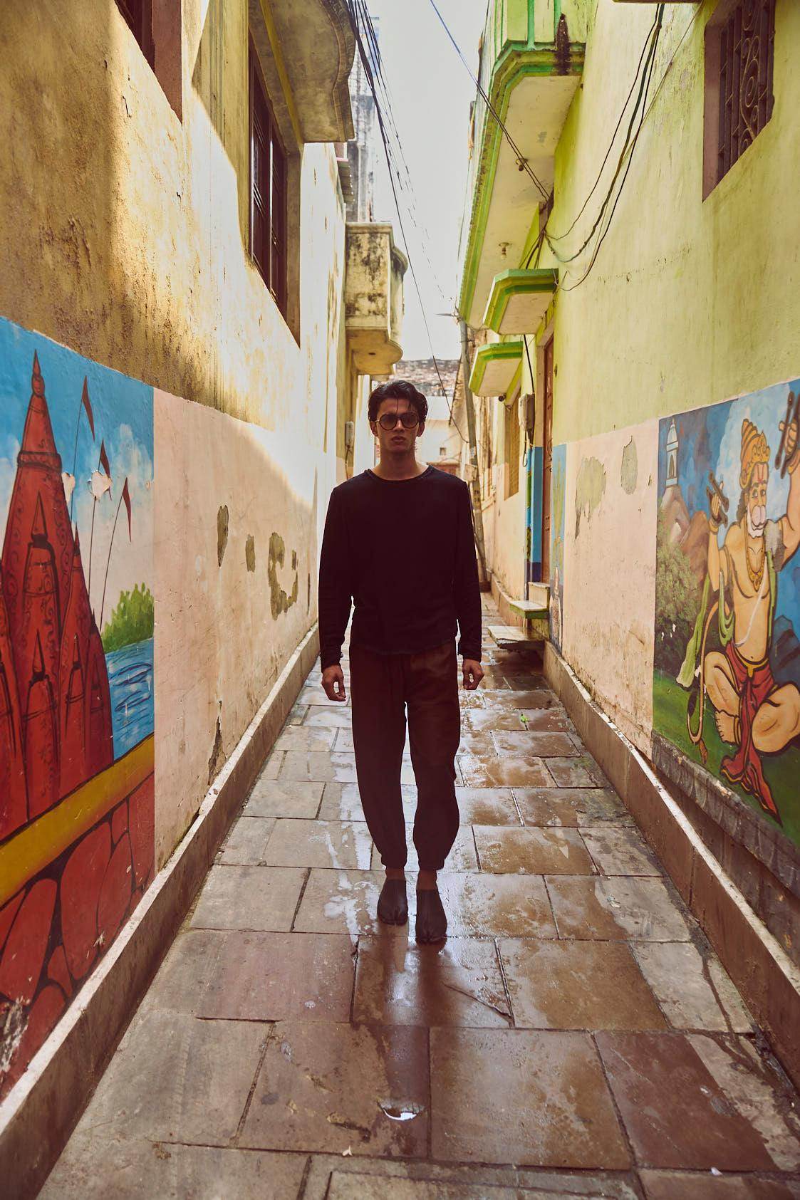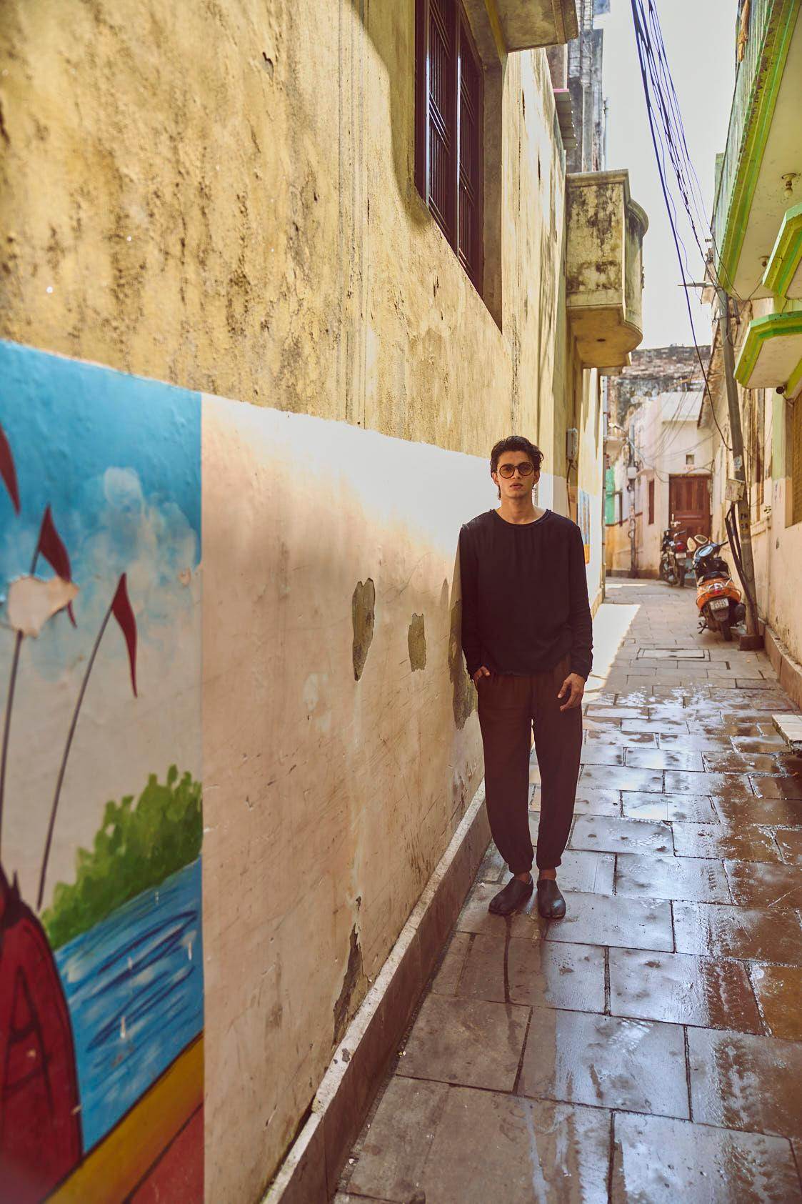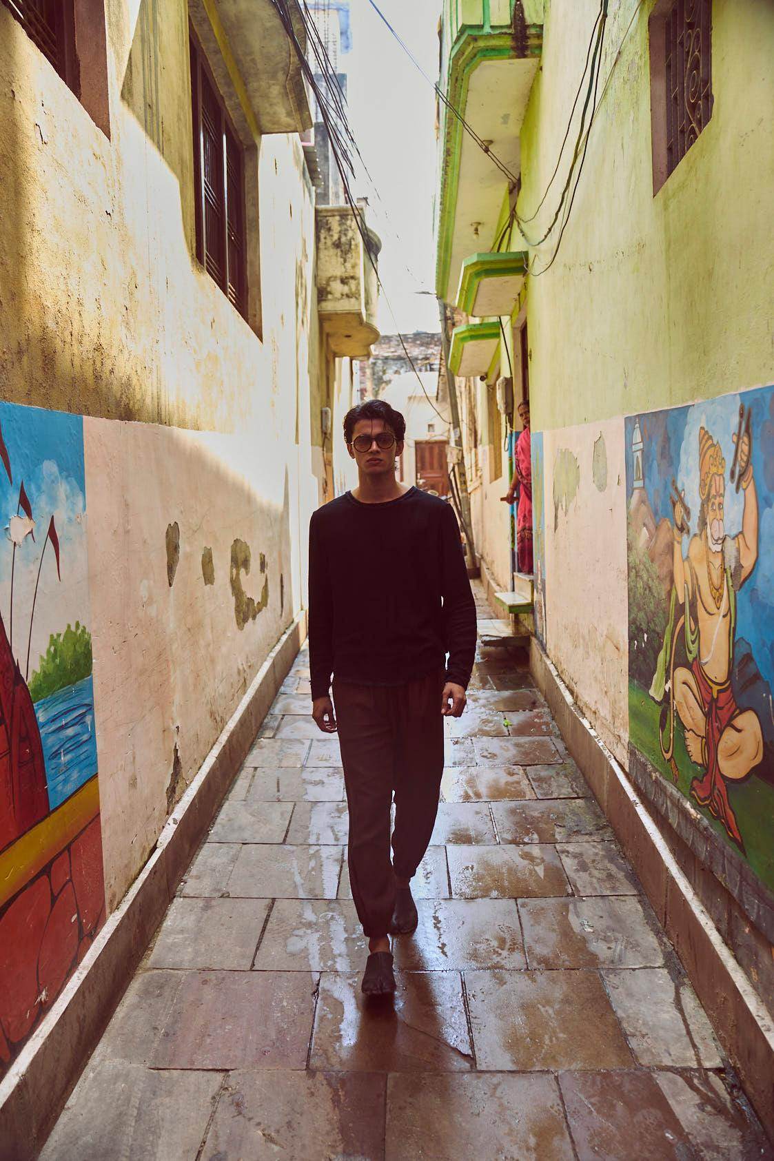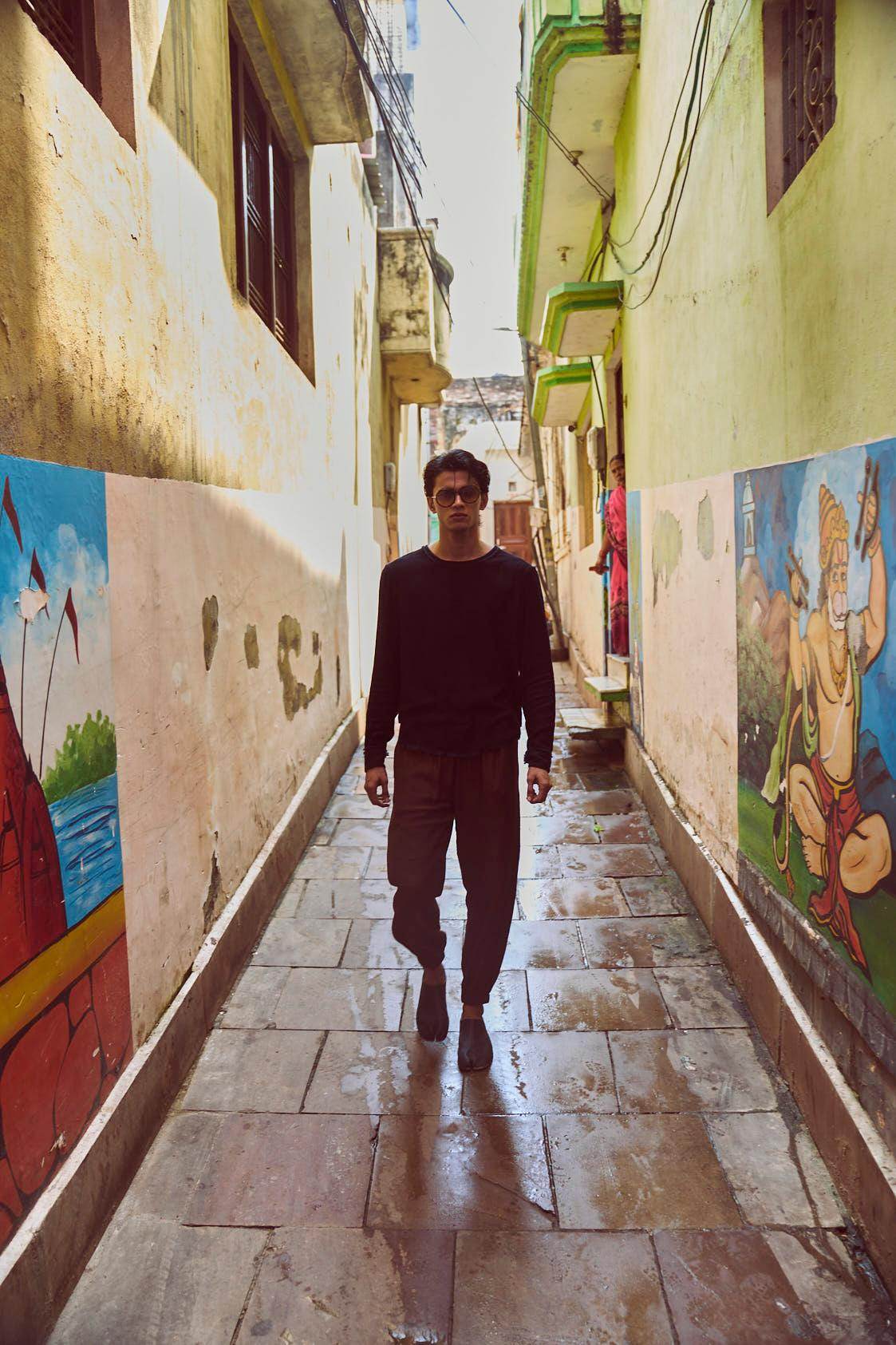 Black popover shirt in slub textured fabric. Raw hem detailing at the neckline, sleeve cuffs, and front and back hem of the shirt. Full sleeves with button closure at the cuffs. Long on the front and back with a shorter side panel.
