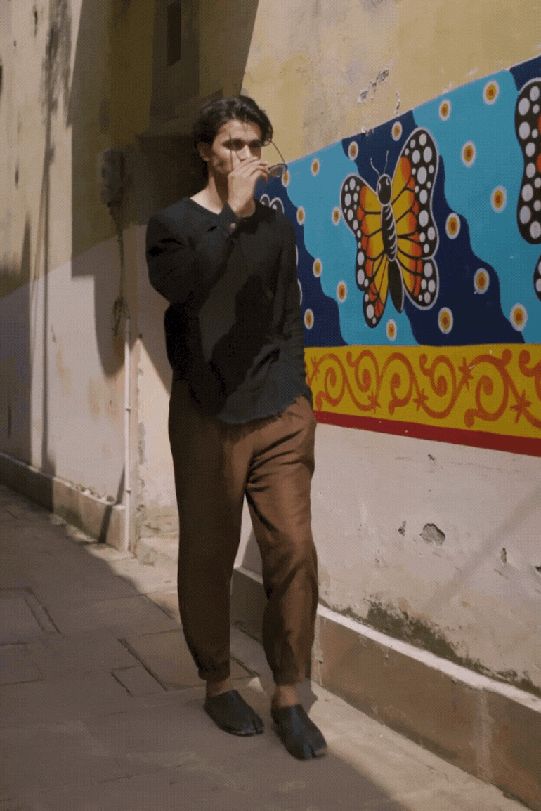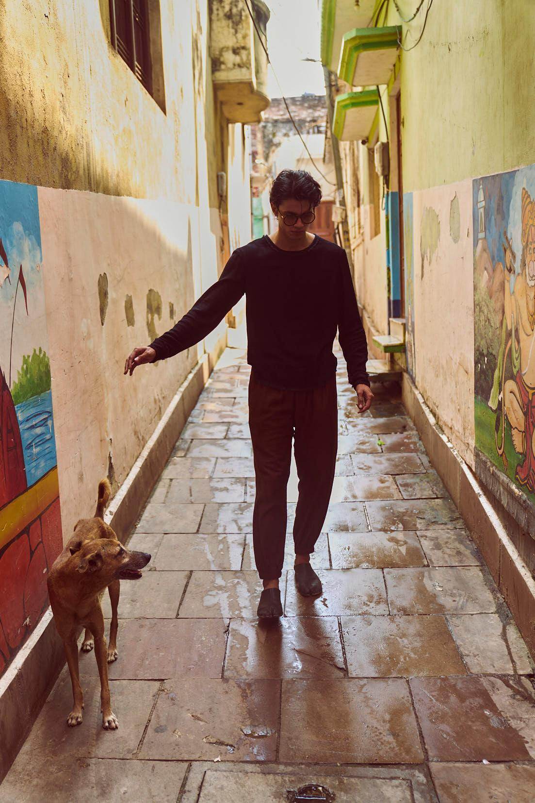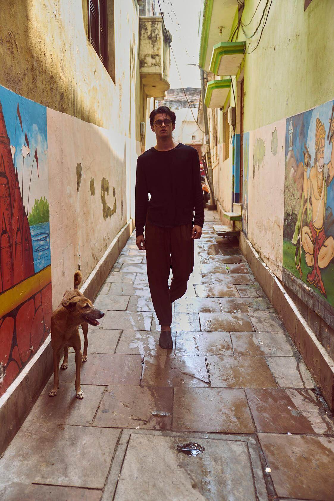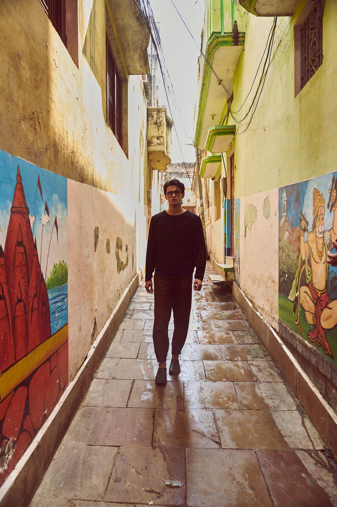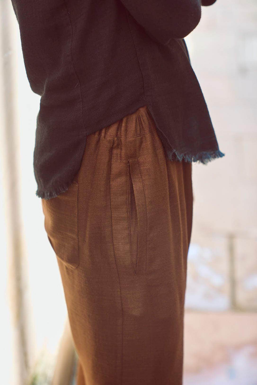 Black popover shirt in slub textured fabric. Raw hem detailing at the neckline, sleeve cuffs, and front and back hem of the shirt. Full sleeves with button closure at the cuffs. Long on the front and back with a shorter side panel.