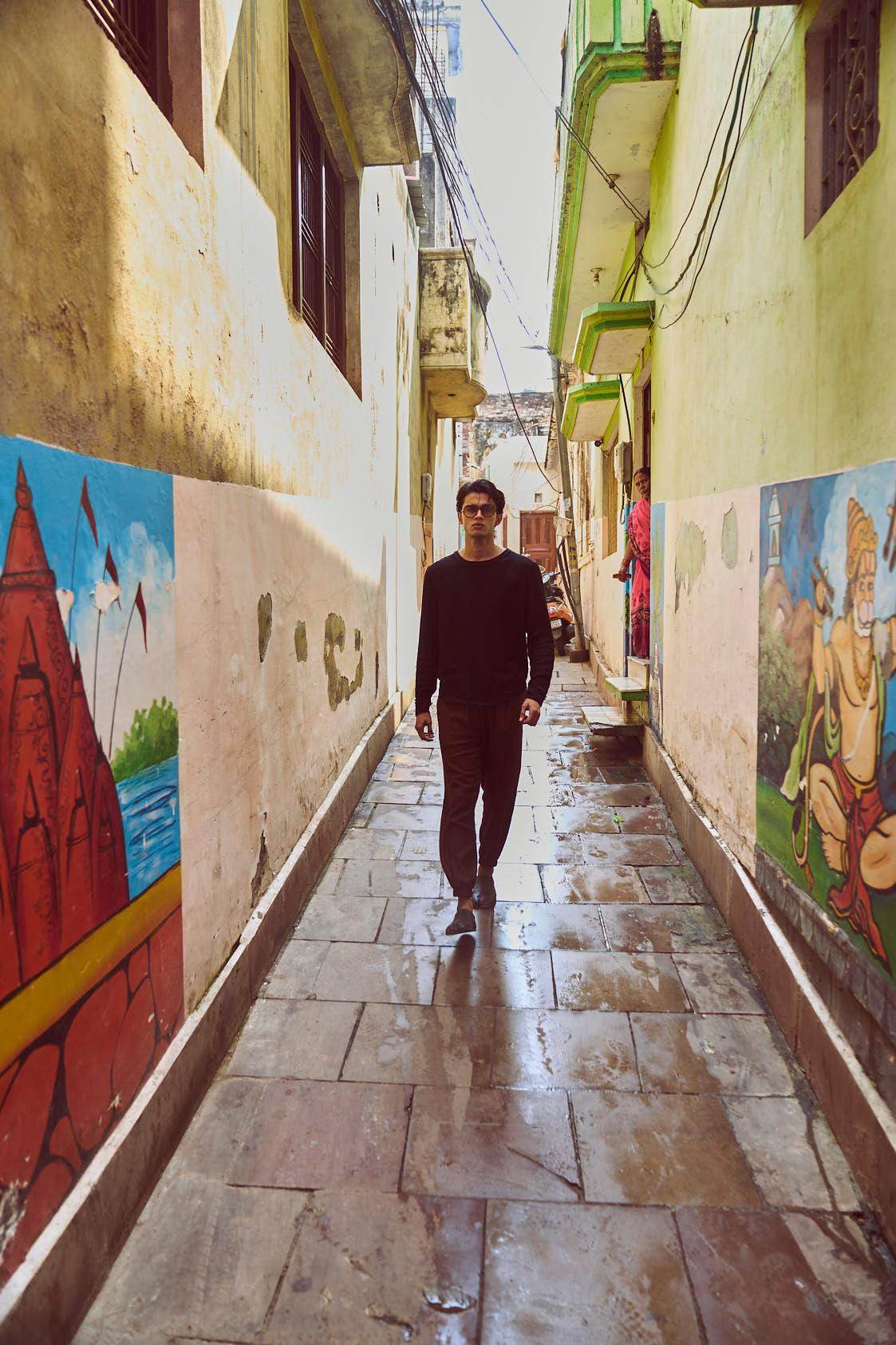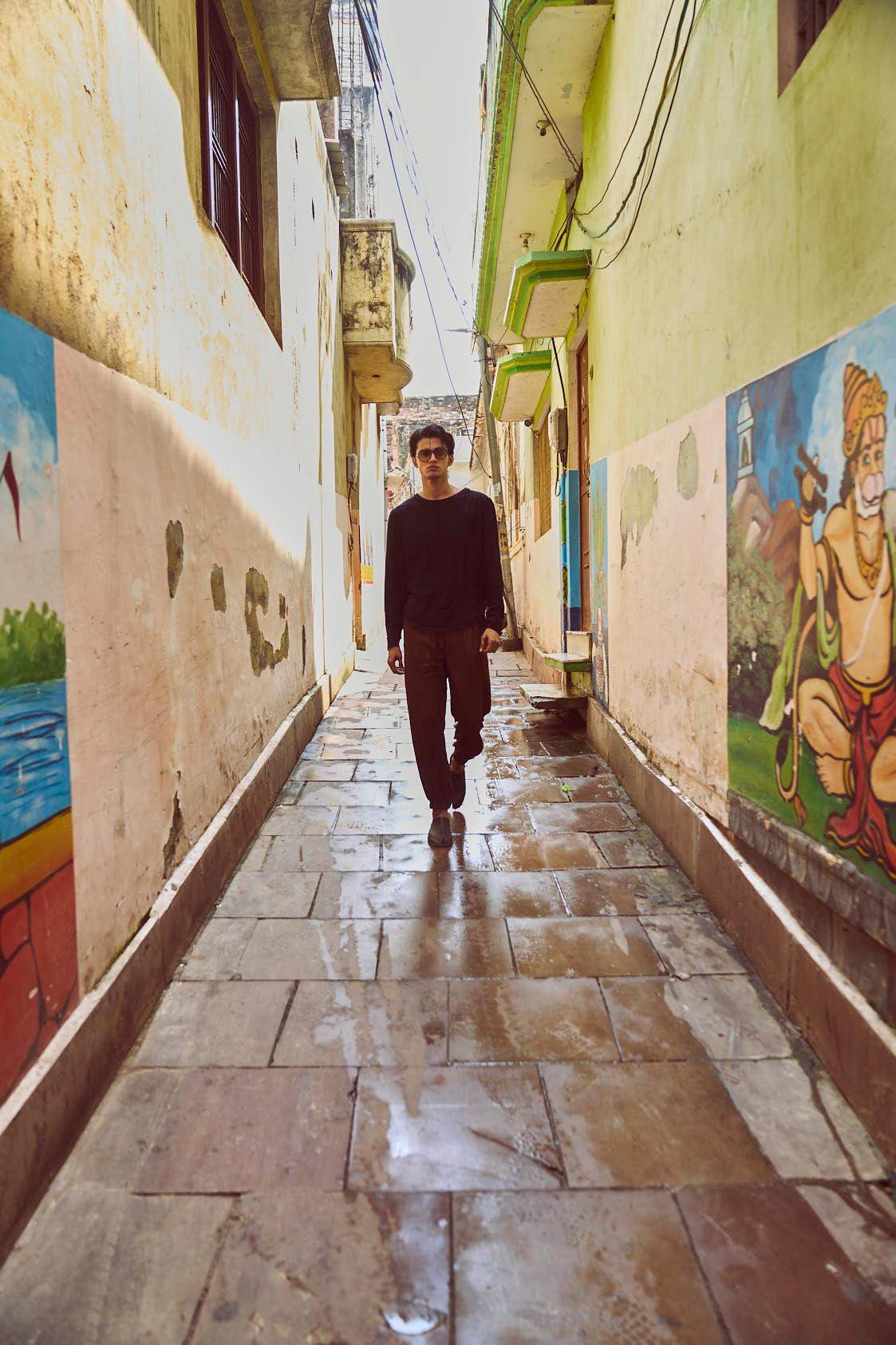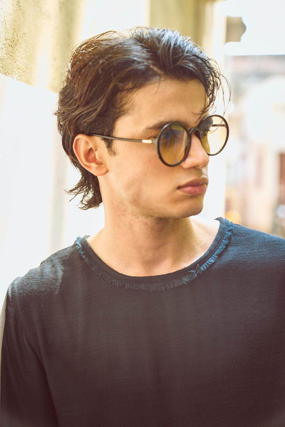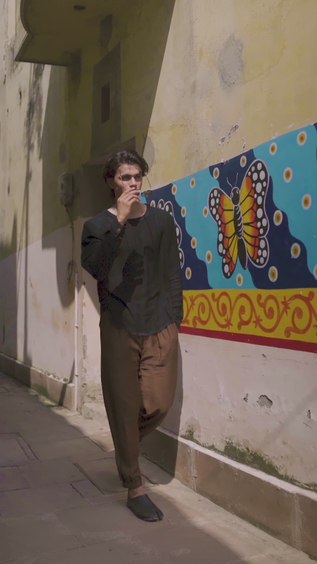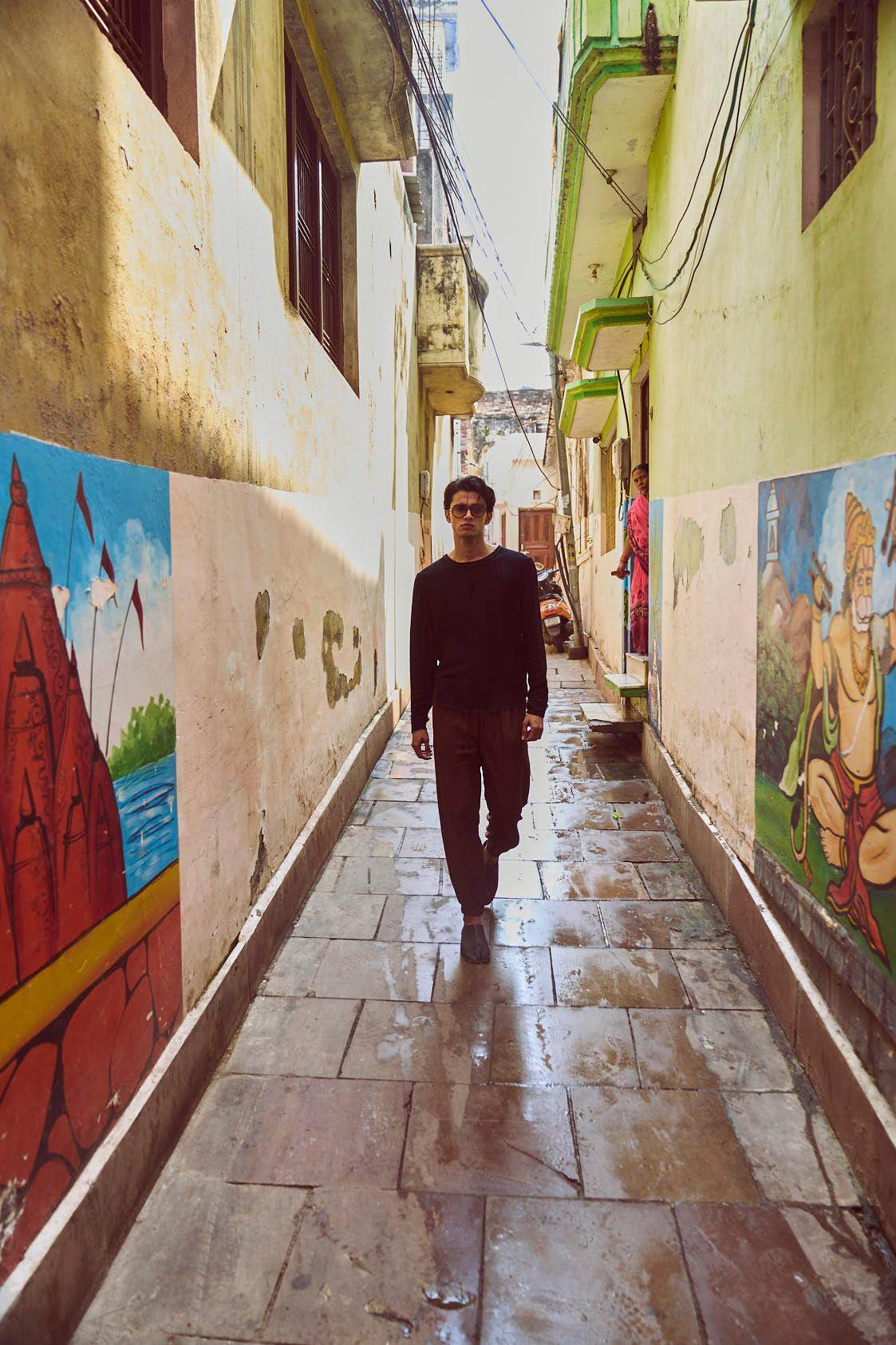 Black popover shirt in slub textured fabric. Raw hem detailing at the neckline, sleeve cuffs, and front and back hem of the shirt. Full sleeves with button closure at the cuffs. Long on the front and back with a shorter side panel.