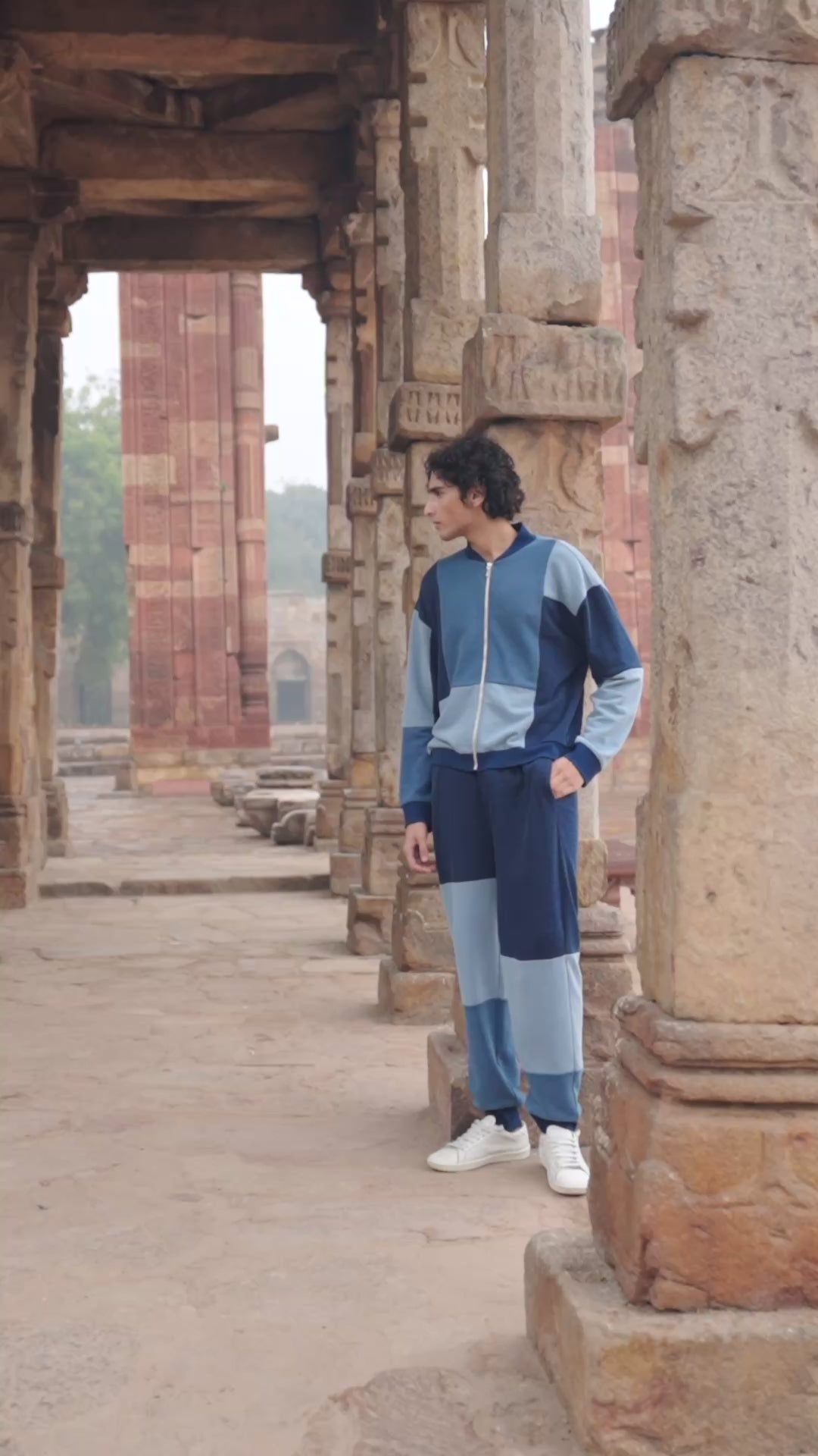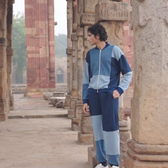 4 tones of denim colour blocked in a zip front, full sleeve sweatshirt. True indigo cotton french terry with varied levels of washing. Knitted rib on the collar, sleeve cuff and bottom hem. Silver zipper in the front.