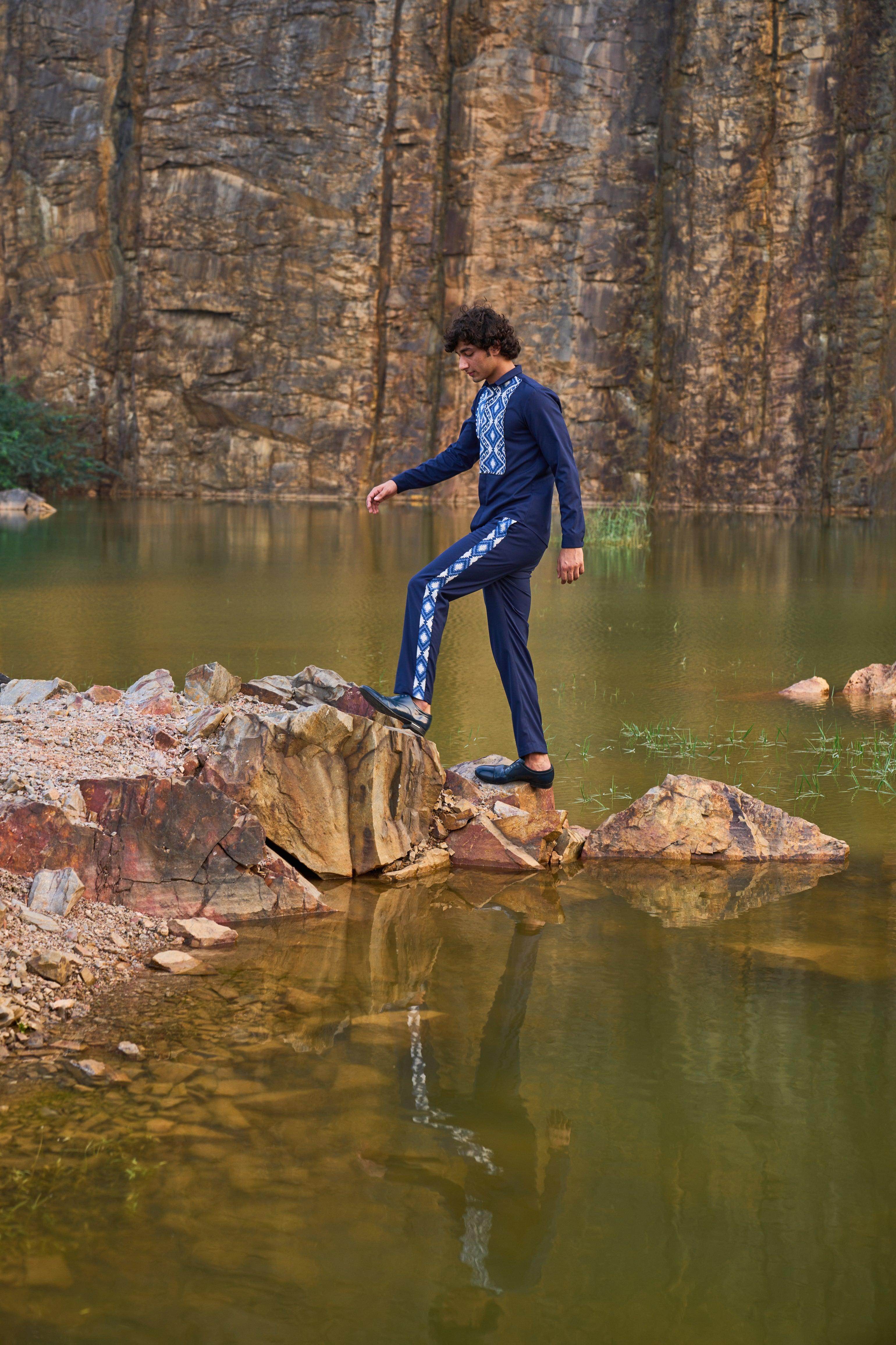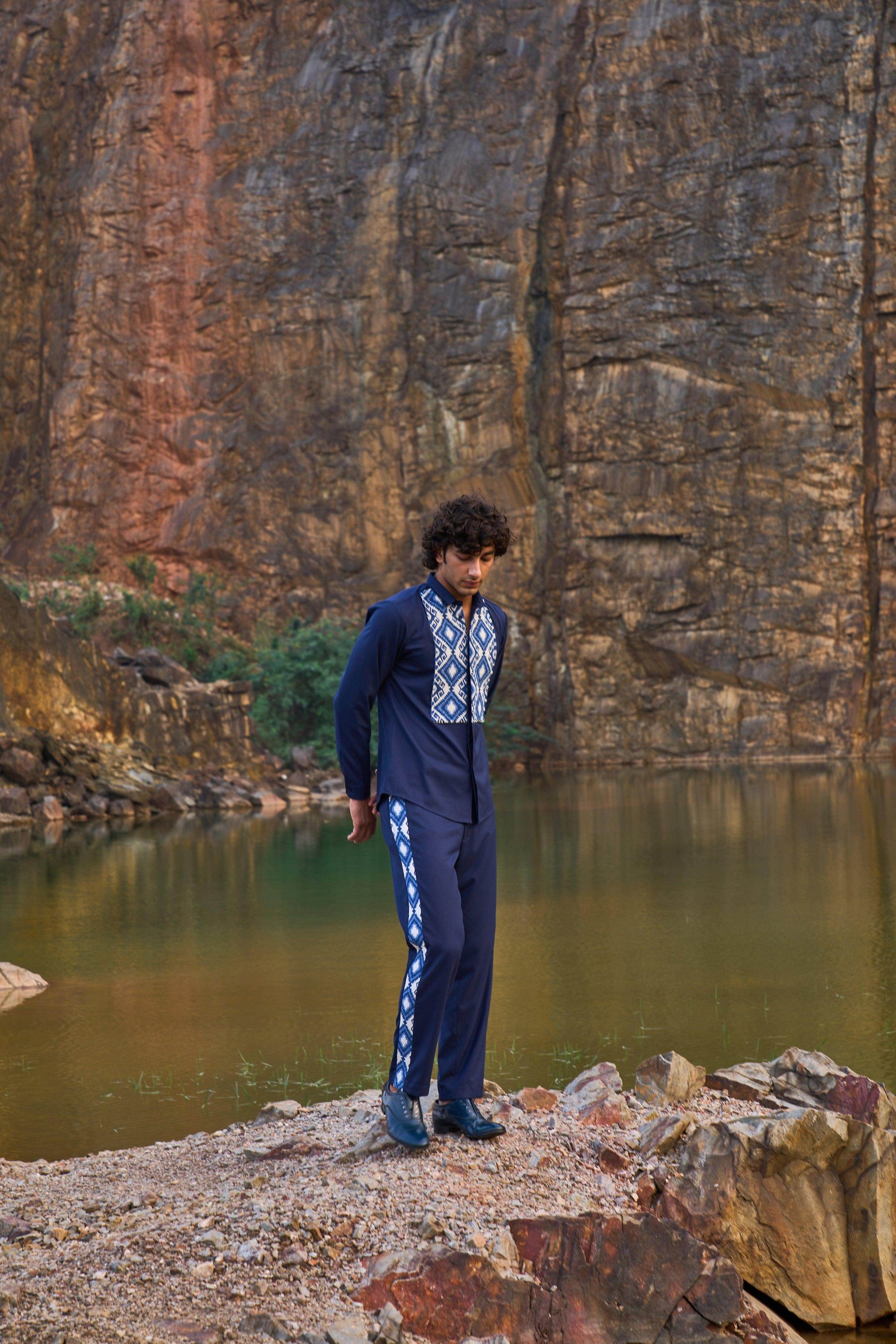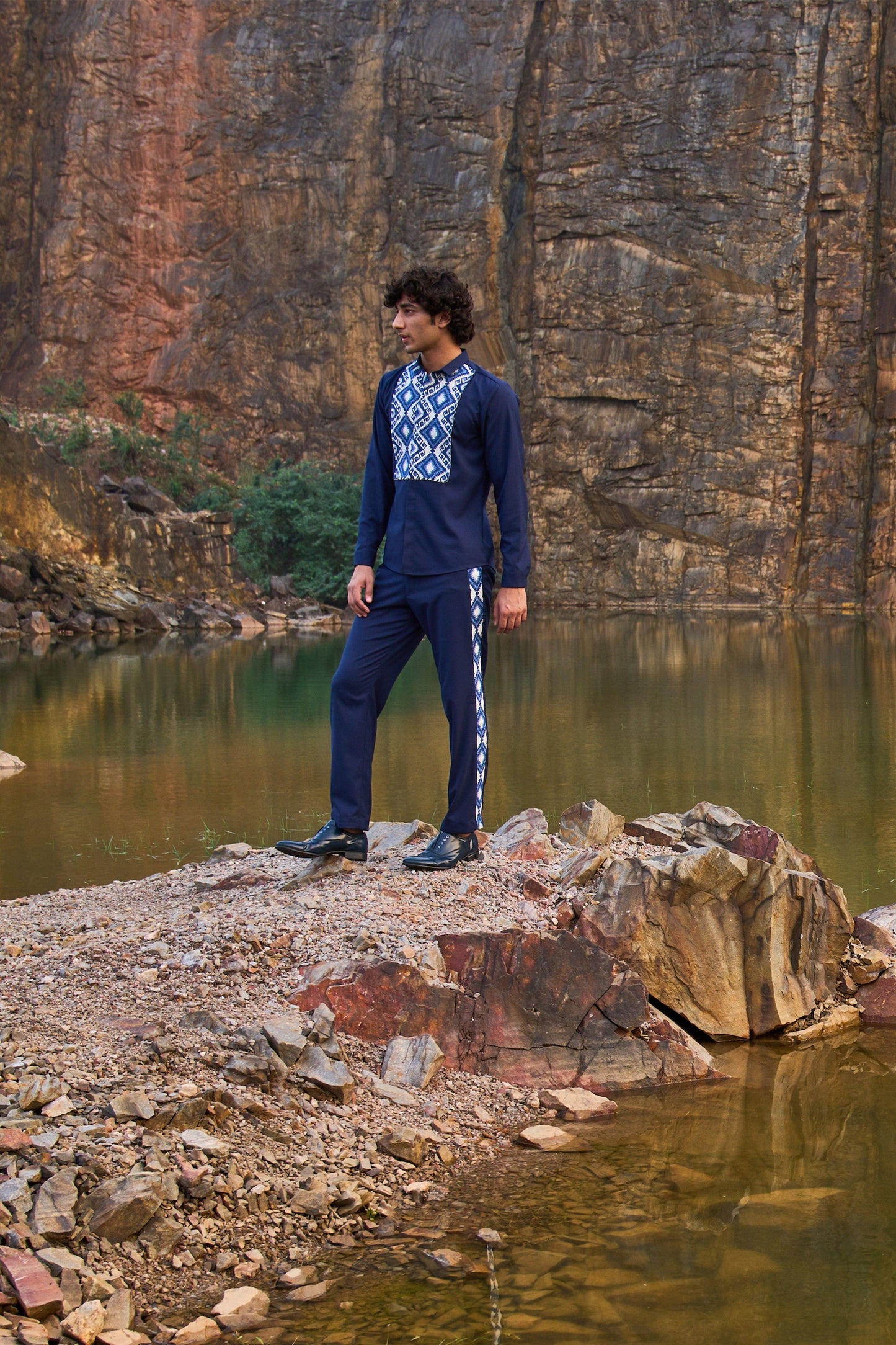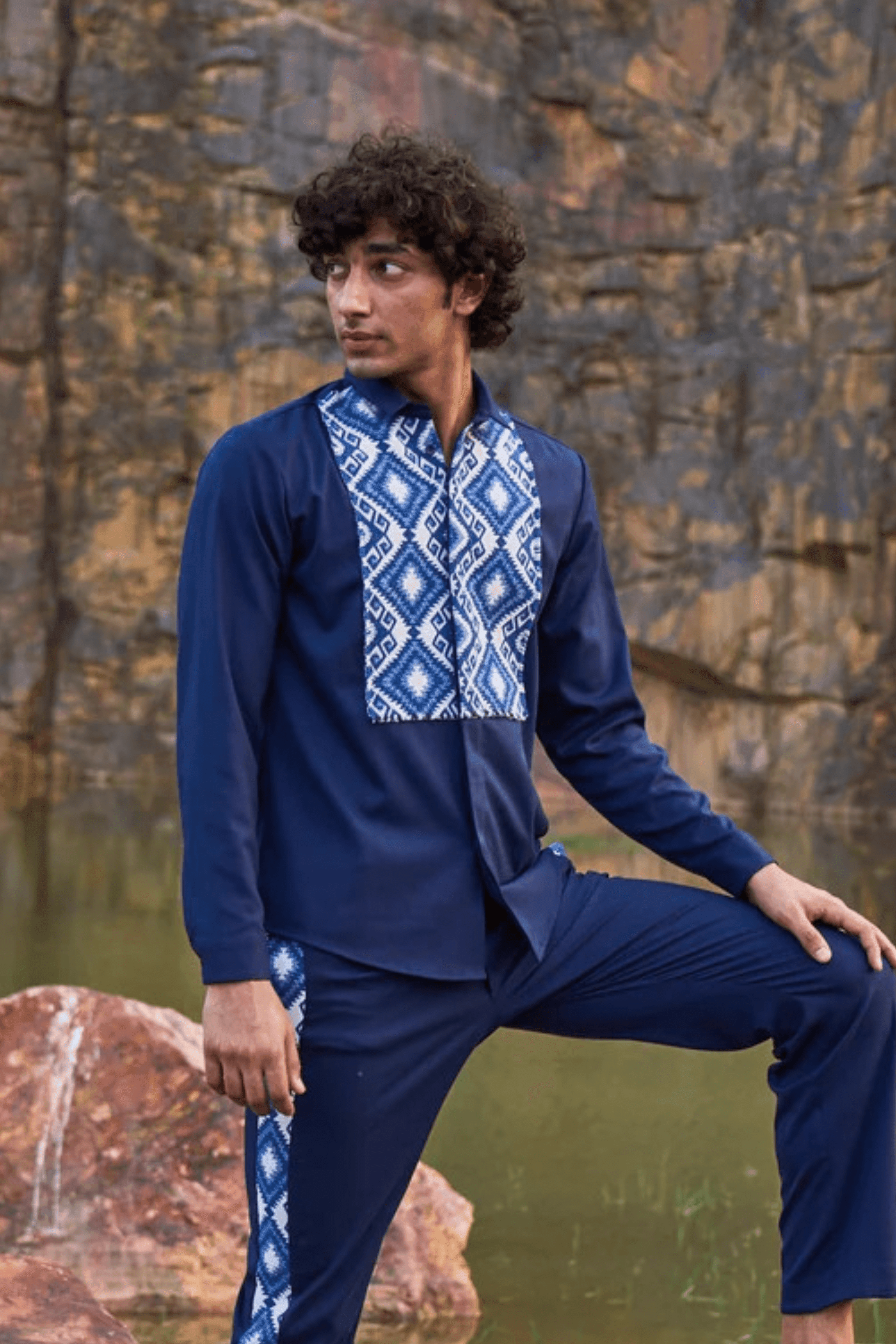 Blue button-down full sleeve shirt with a paneled patterned jacquard bib at the front. Concealed buttons. Regular fit. Made of all weather suiting material.