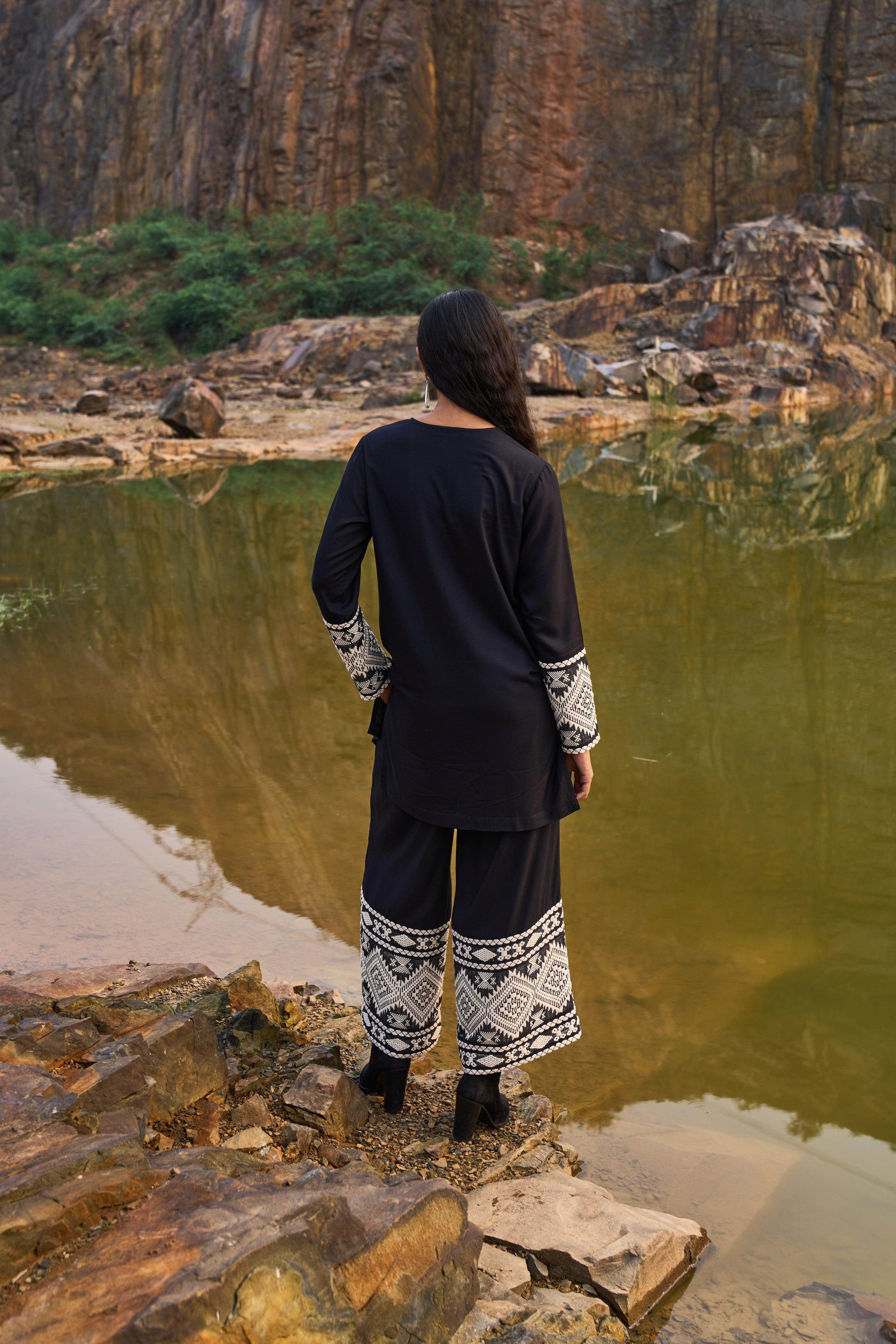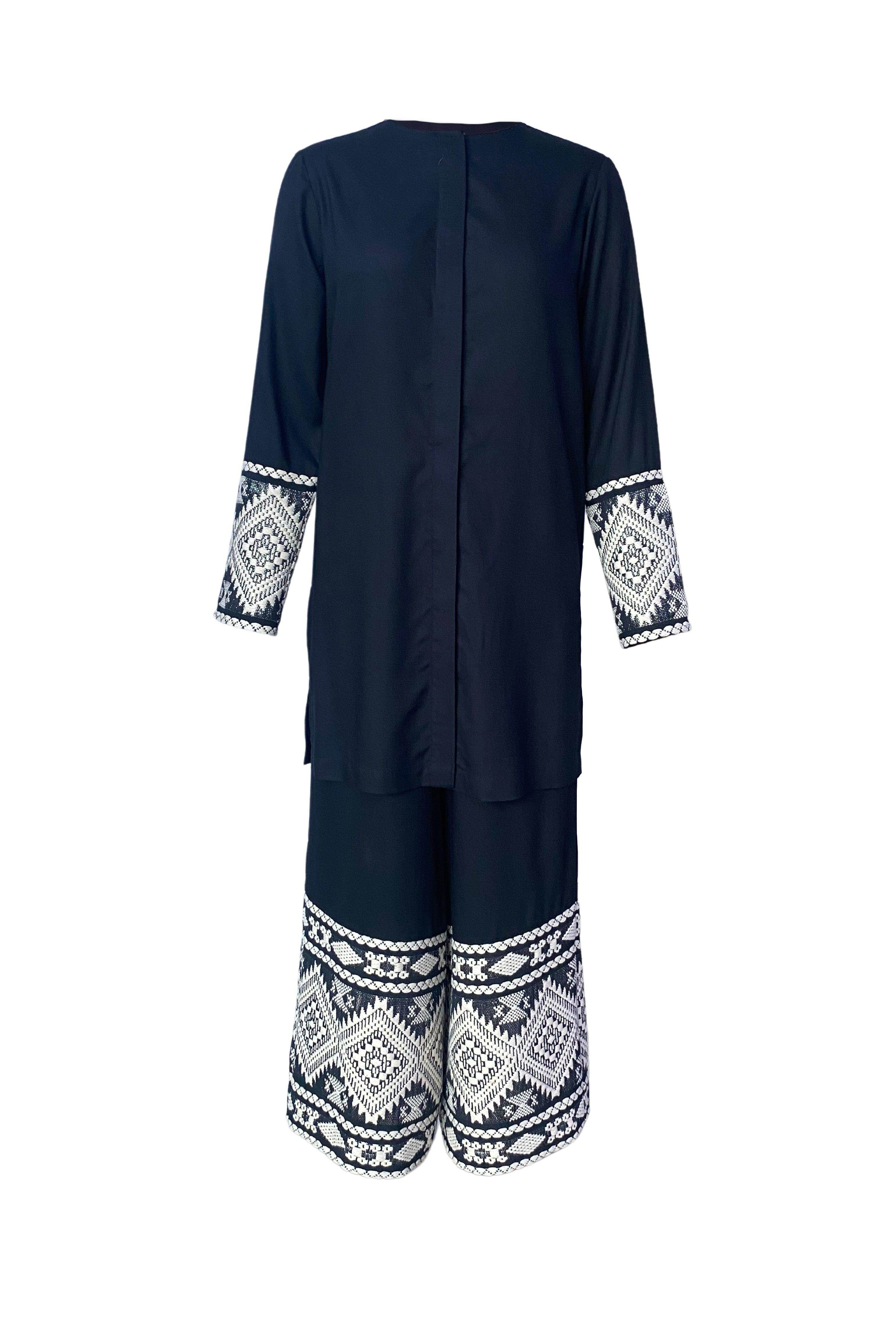 Black longline round neck top. Hand-woven jacquard panel with highlighted embroidery detailing at the cuffs. Full sleeves, concealed button placket with slits on the sides.