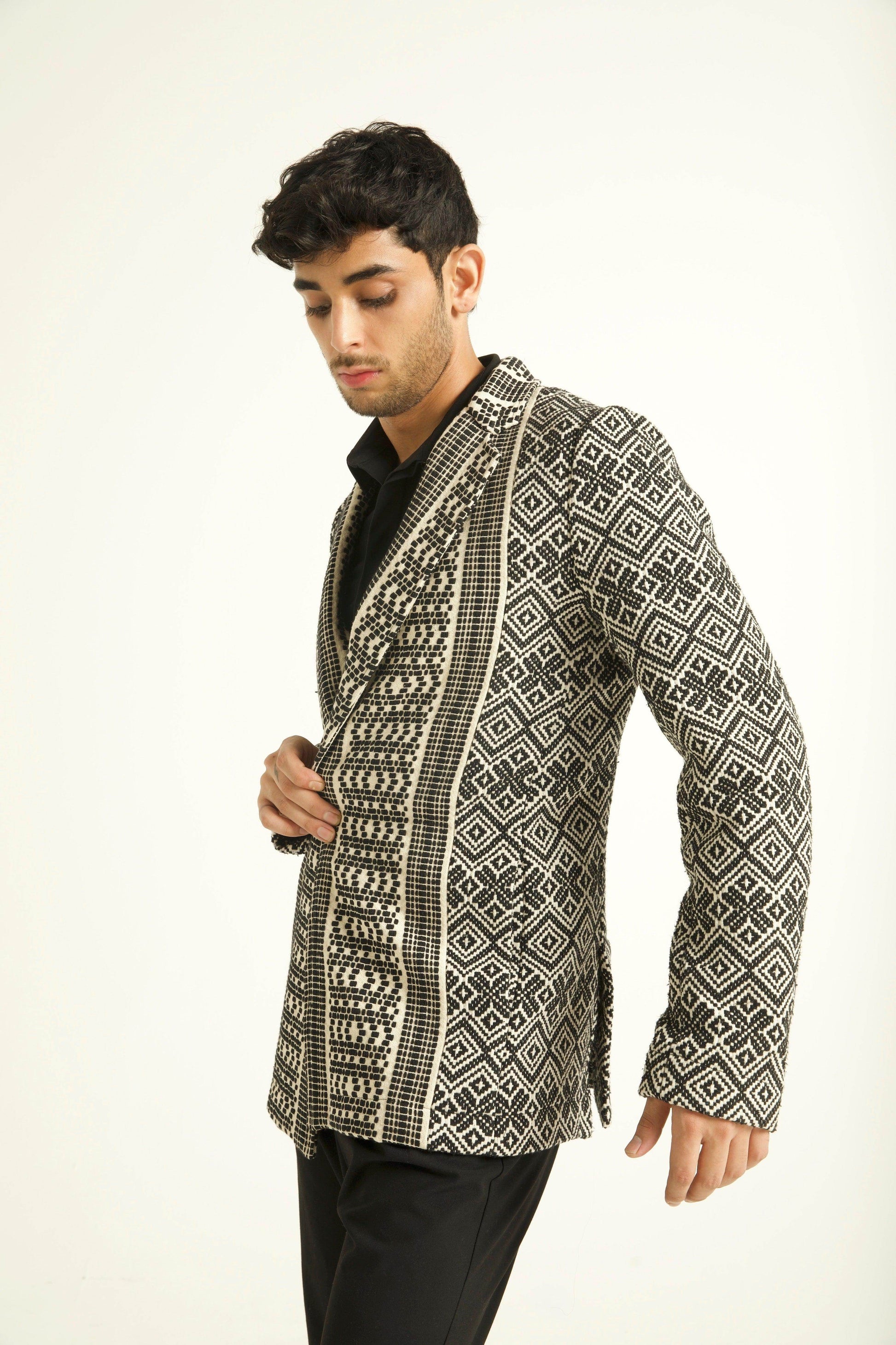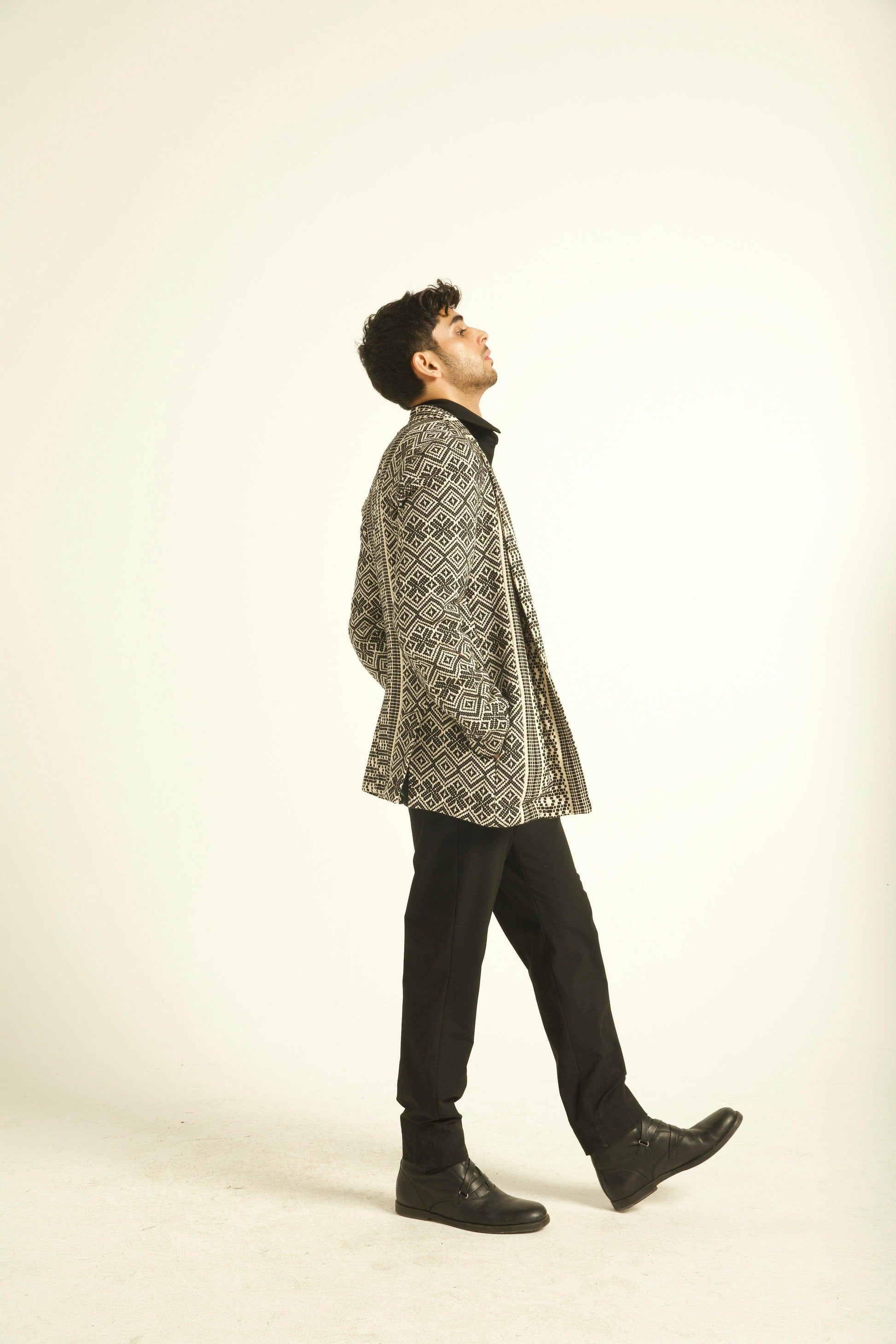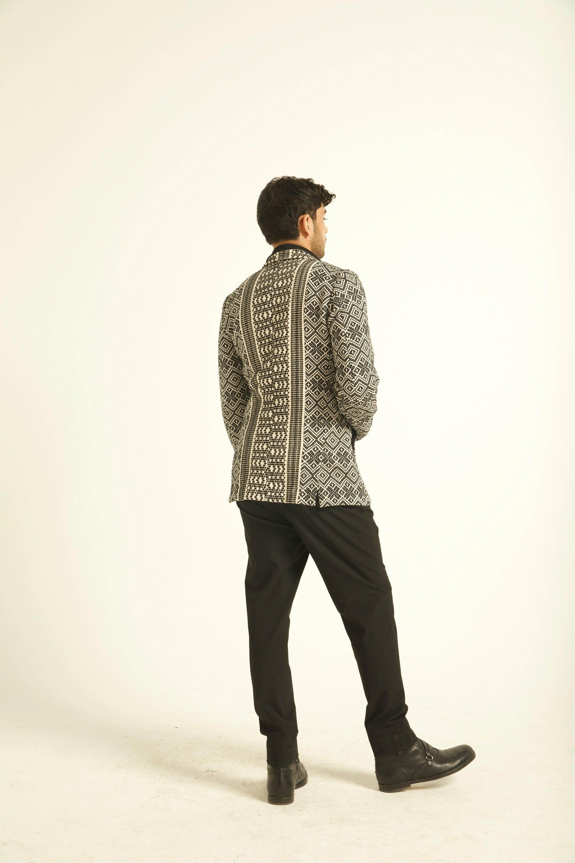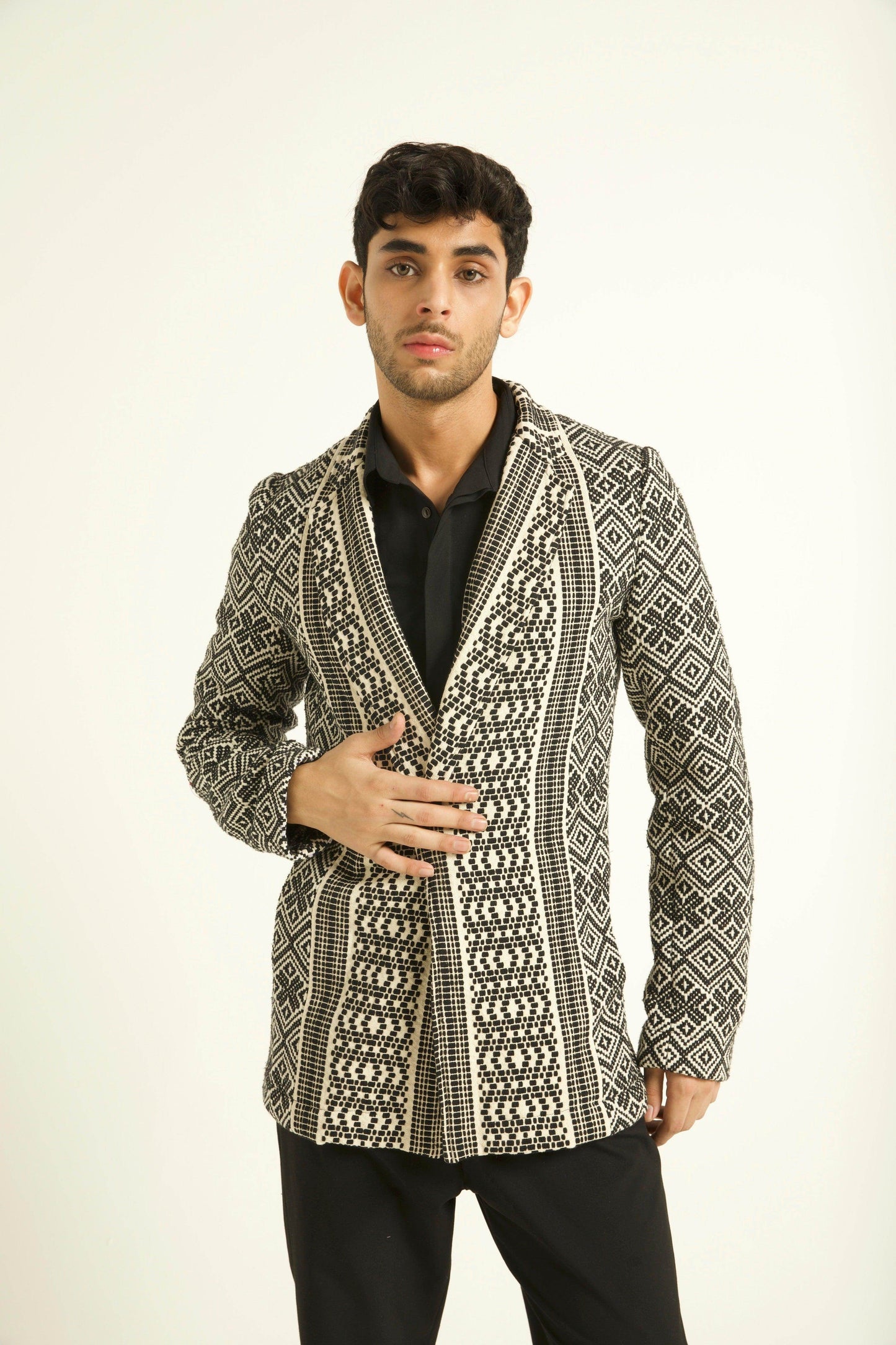 Blazer jacket made with panelled patterned jacquard fabrics. Lapels in the front, side pockets.