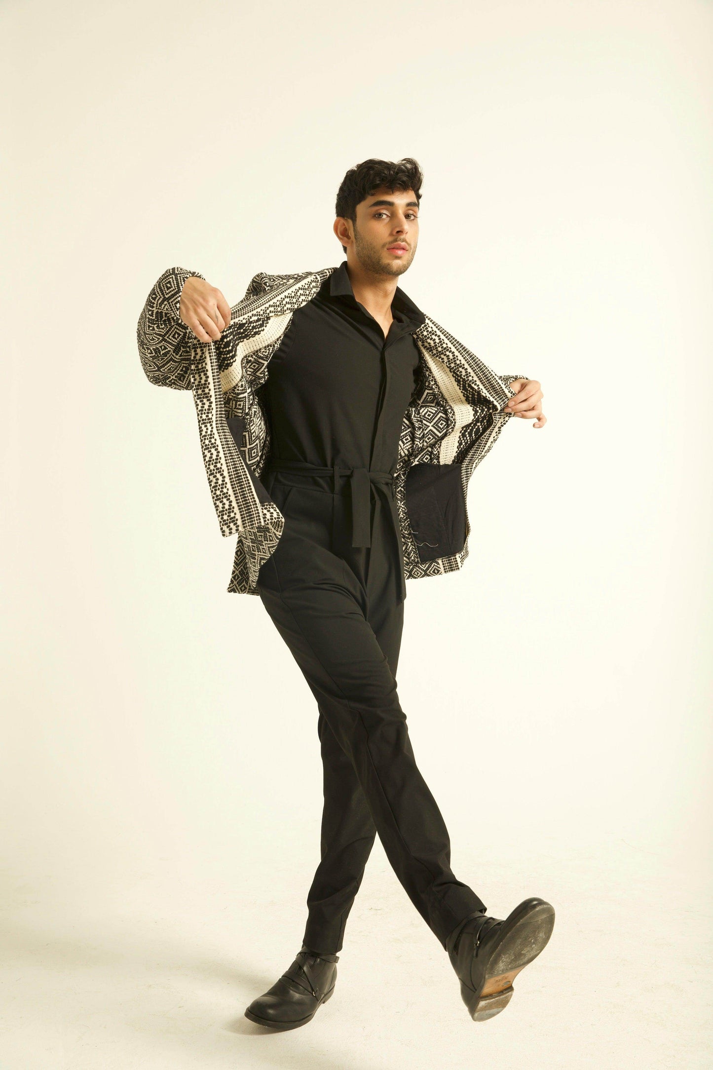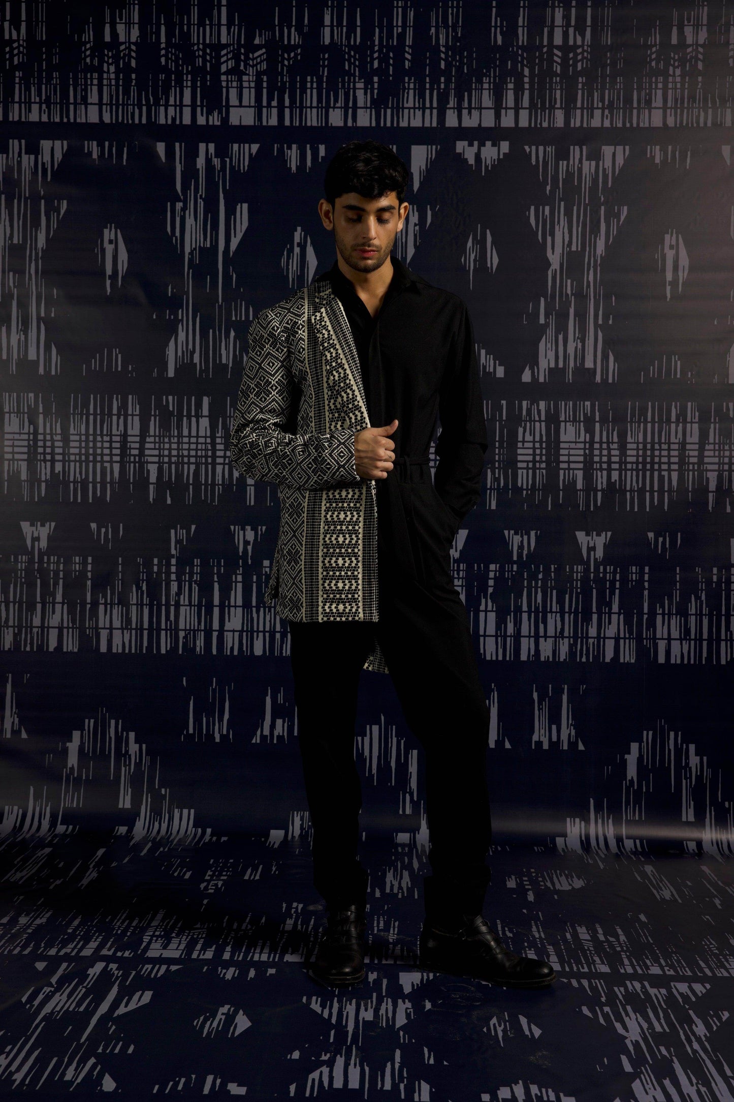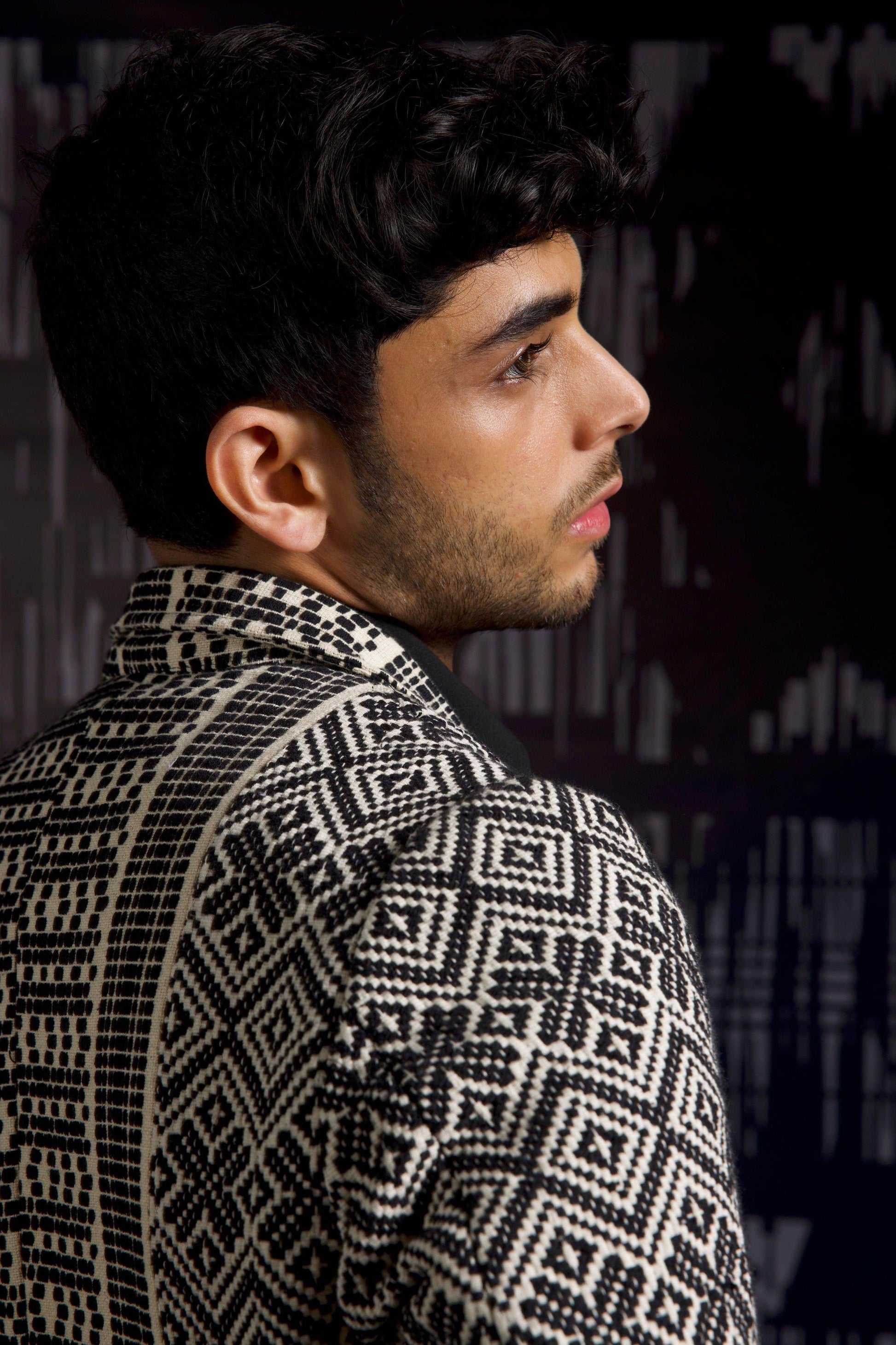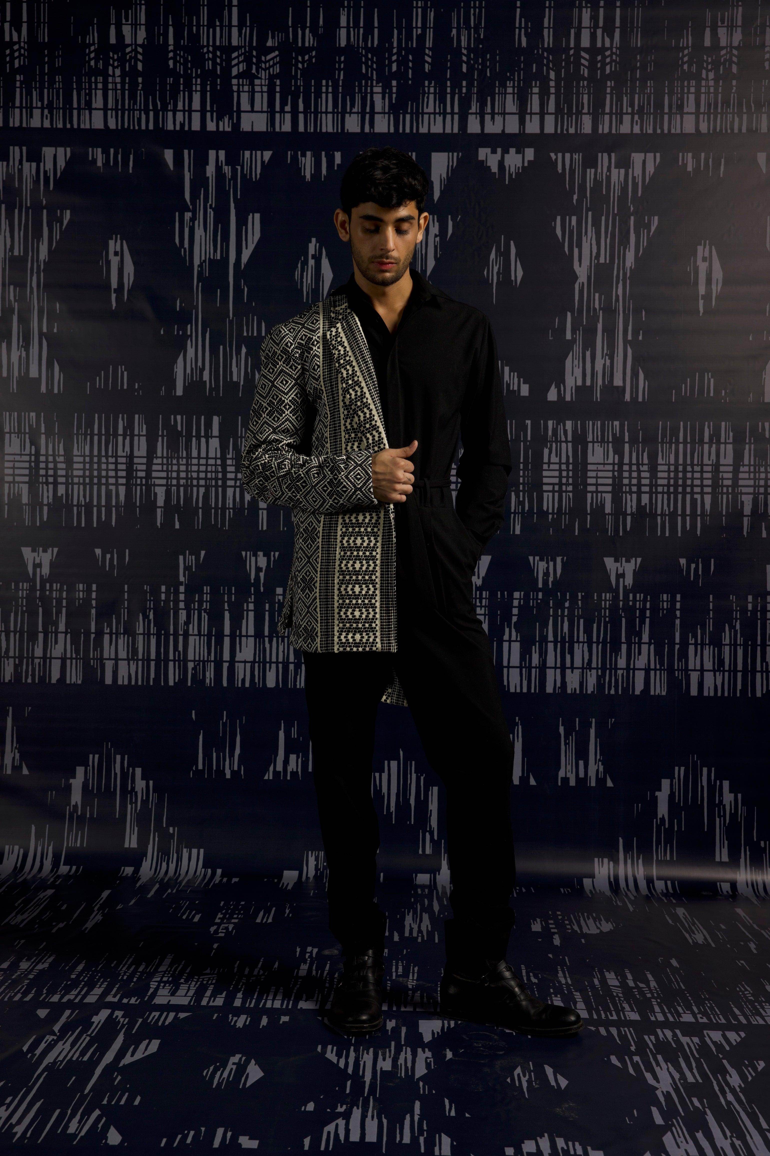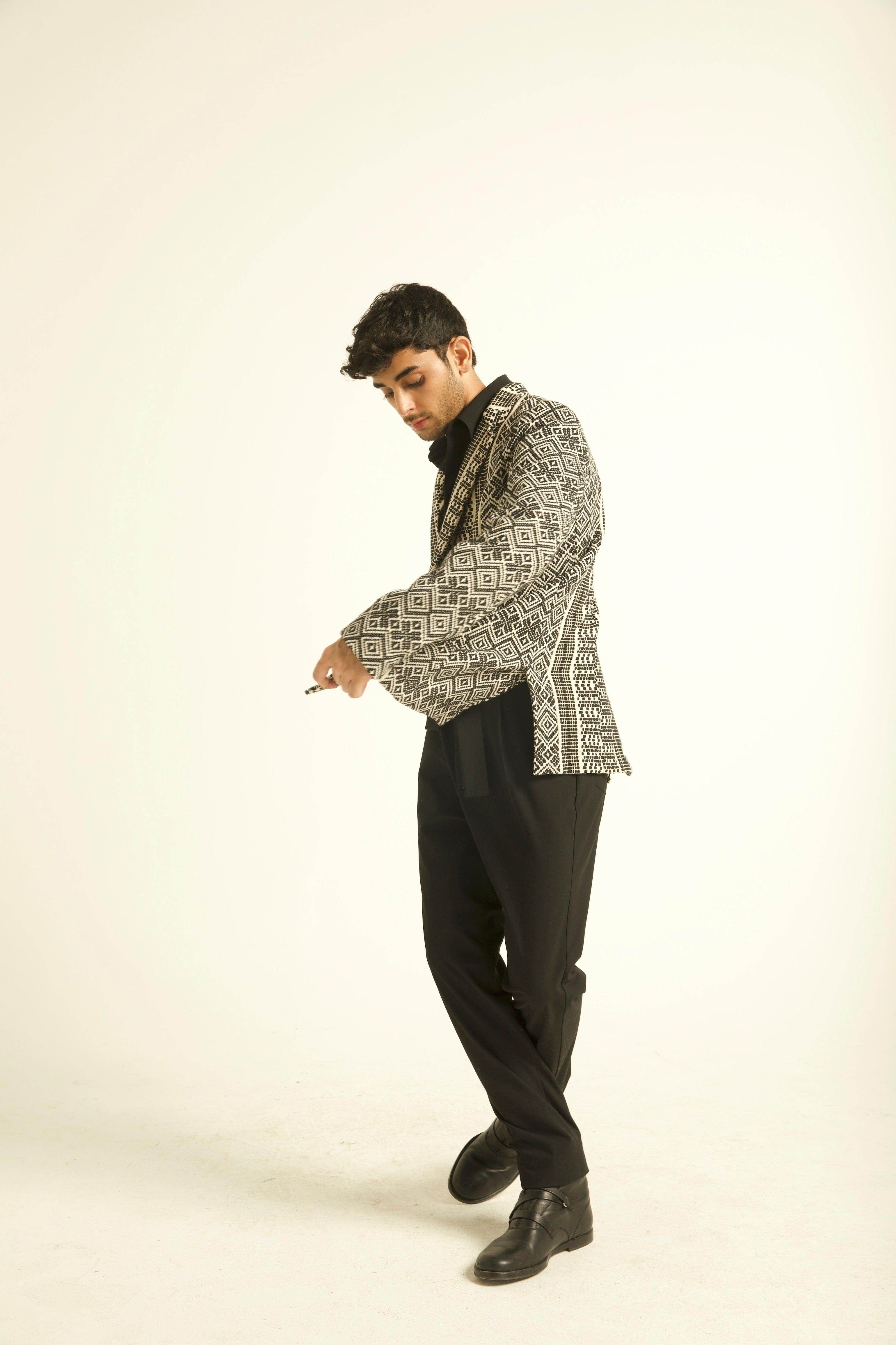 Blazer jacket made with panelled patterned jacquard fabrics. Lapels in the front, side pockets.