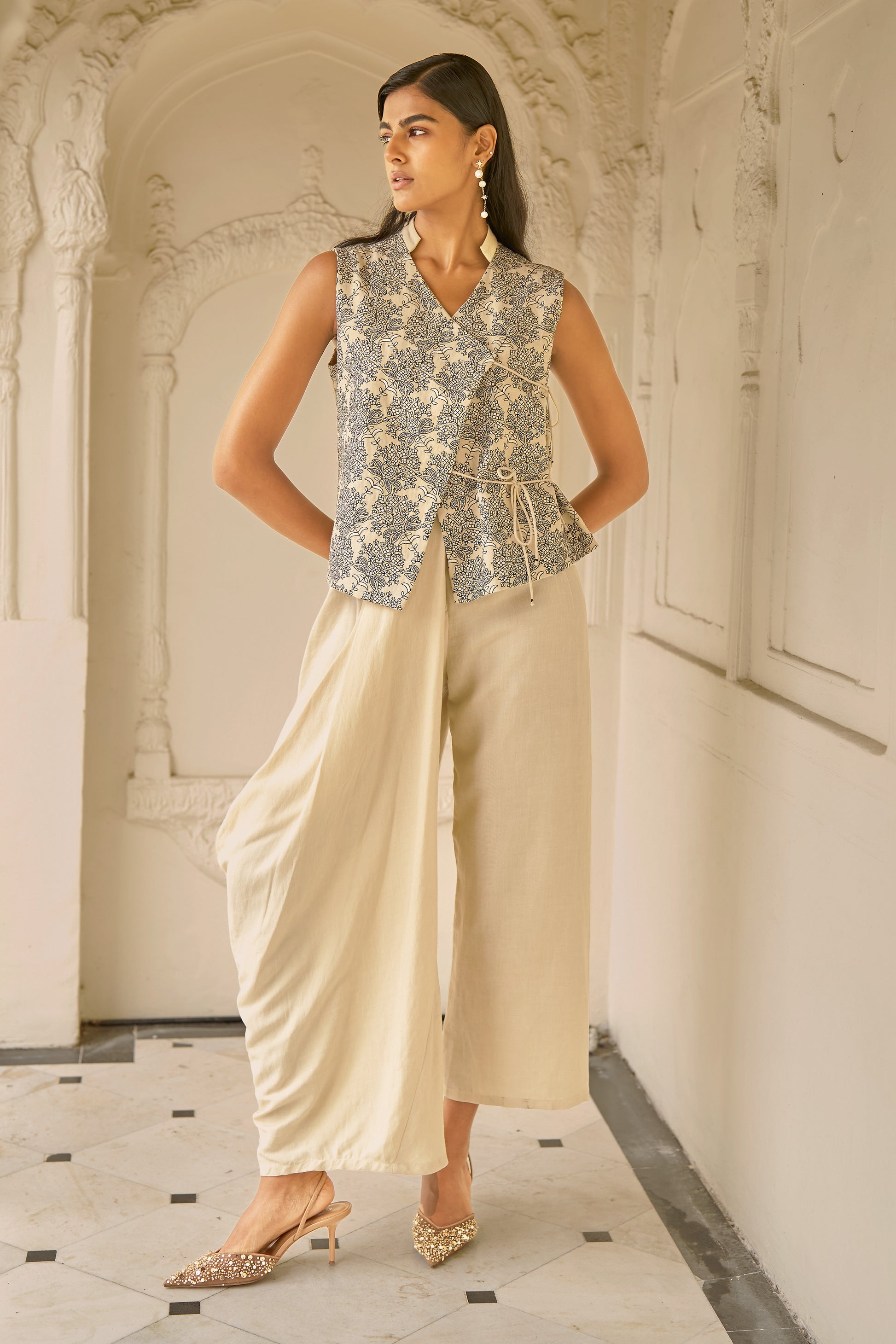 Beige waistcoat top in soft linen inspired by Angrakha style. All-over motifs embroidered in tones of ivory and black on an earthy base. Overlap front detail. Internal string tie-up with two additional tie-ups at the front. Band collar with V-neck detail.