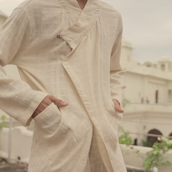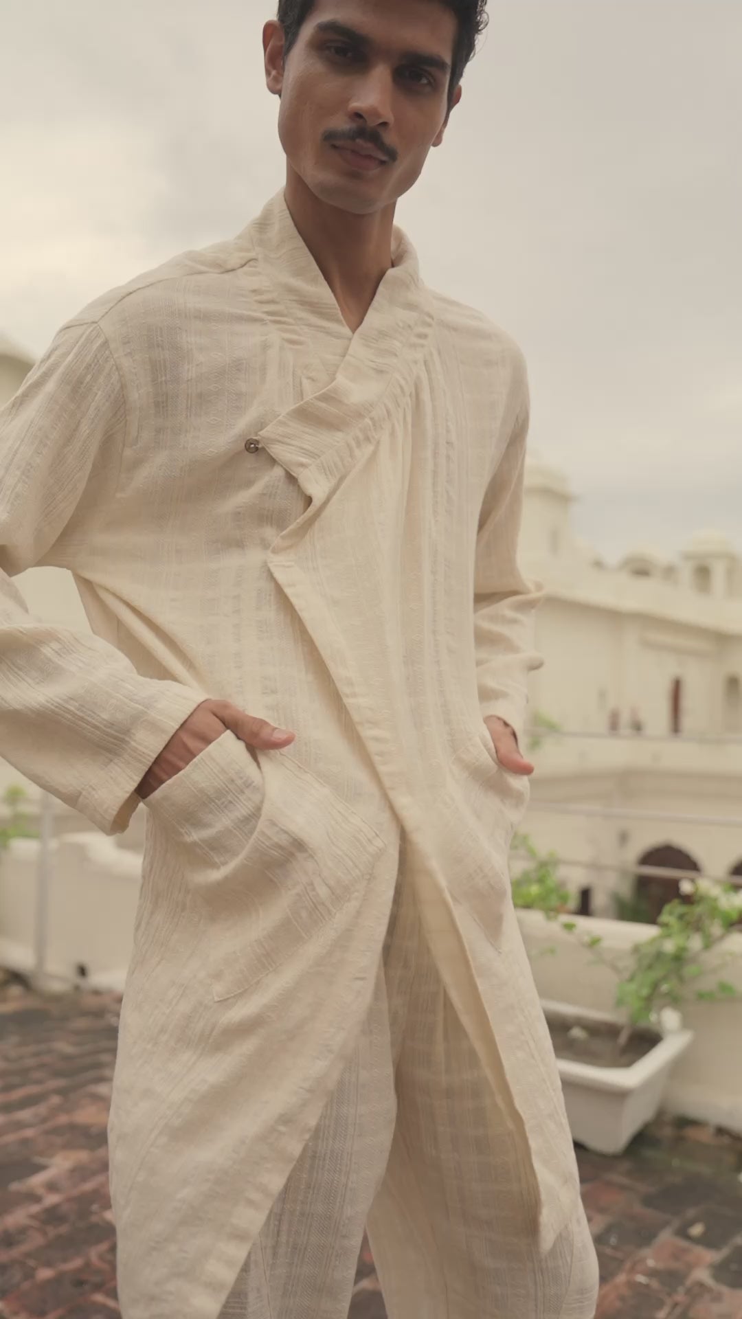 Relaxed-fit ivory pant in textured cotton-linen weave. Elasticated waistband with zip fly and hook/eye closure. Panelled construction across the knees. Pockets in the sides and back.