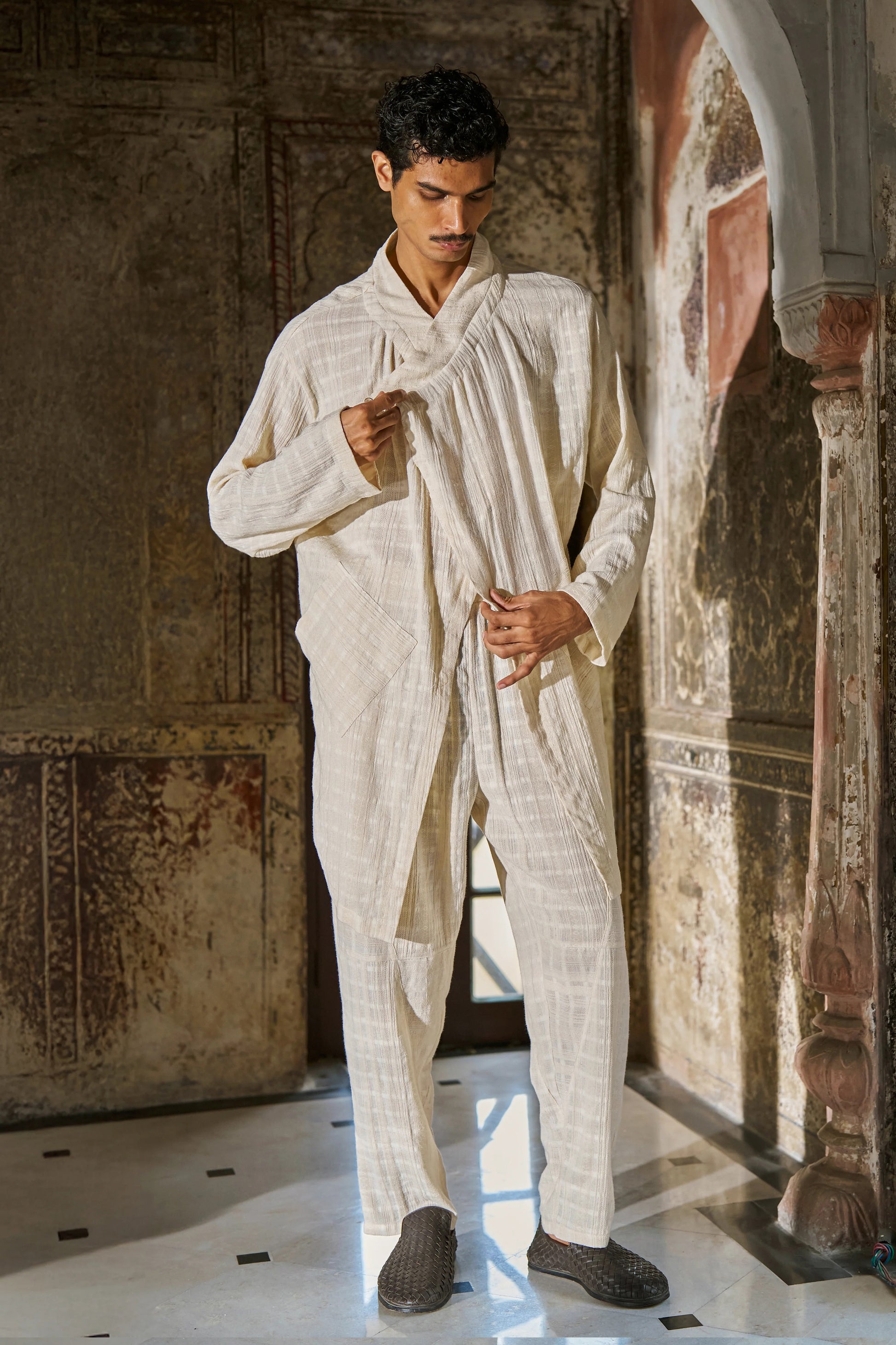 Longline ivory shirt in textured cotton-linen weave. Asymmetrical band collar with off-center single-button closure. Soft gathers fall from the neckline into a draped front panel. Full sleeves with oversized patch pockets in the sides. Straight hem.