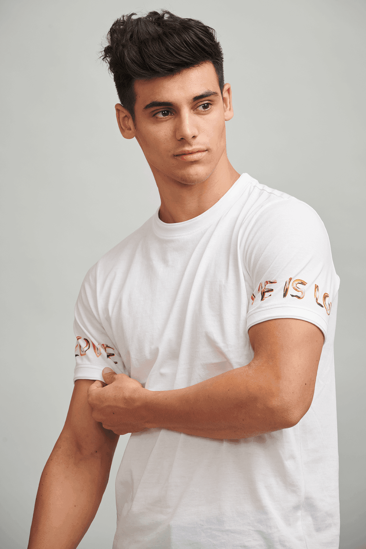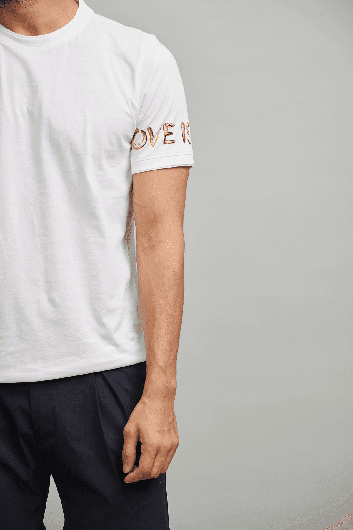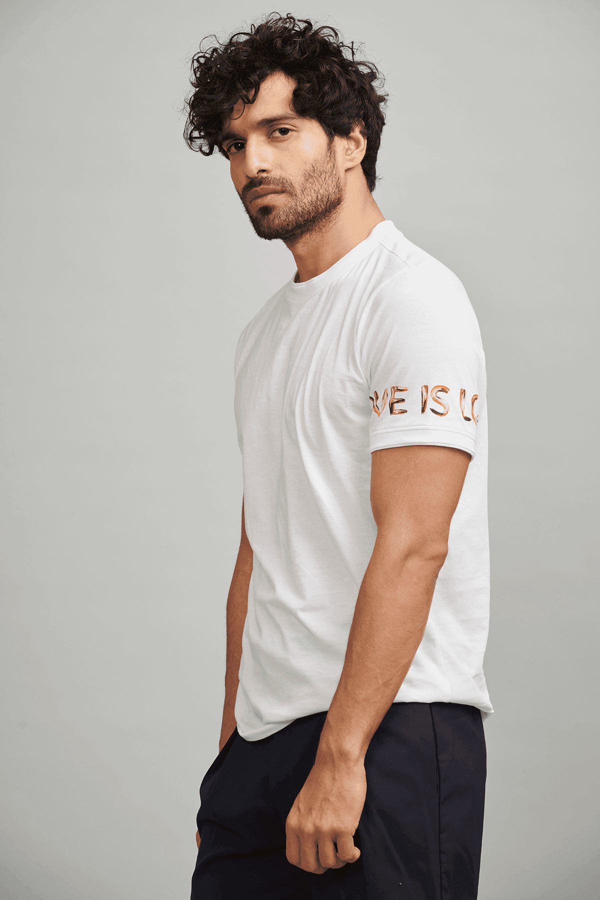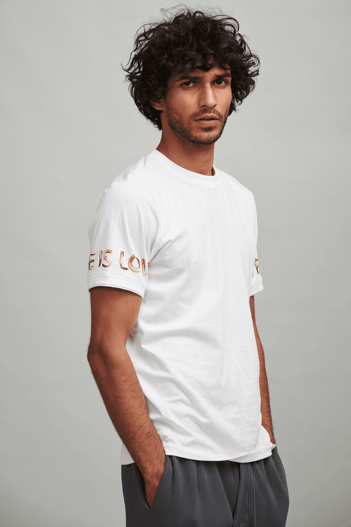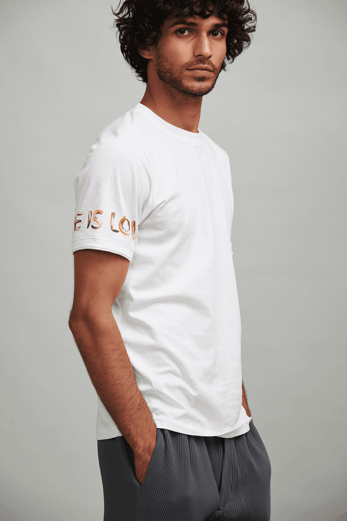 Basic short sleeve tee with multicolor 'LOVE IS LOVE' print on both sleeves. Tonal rib detail at neck and sleeve. Sustainably sourced organic cotton.
