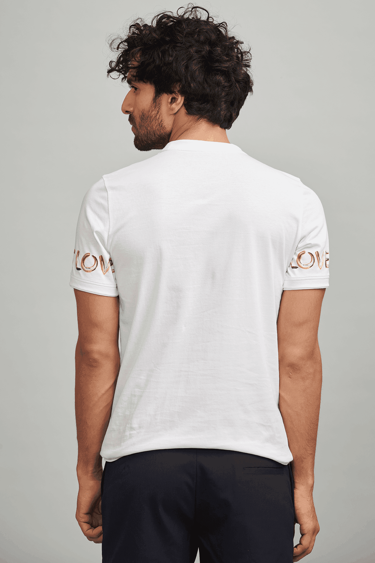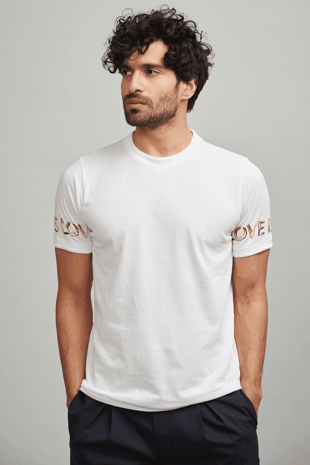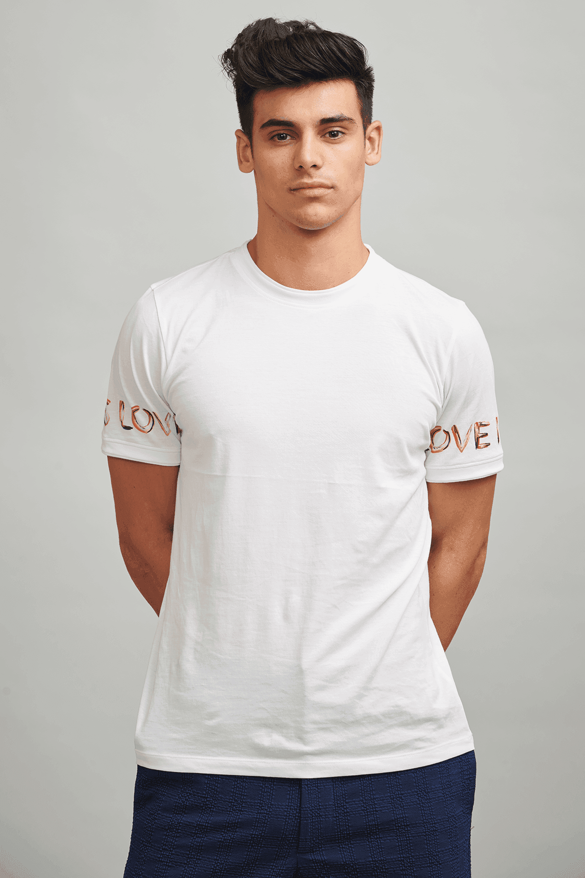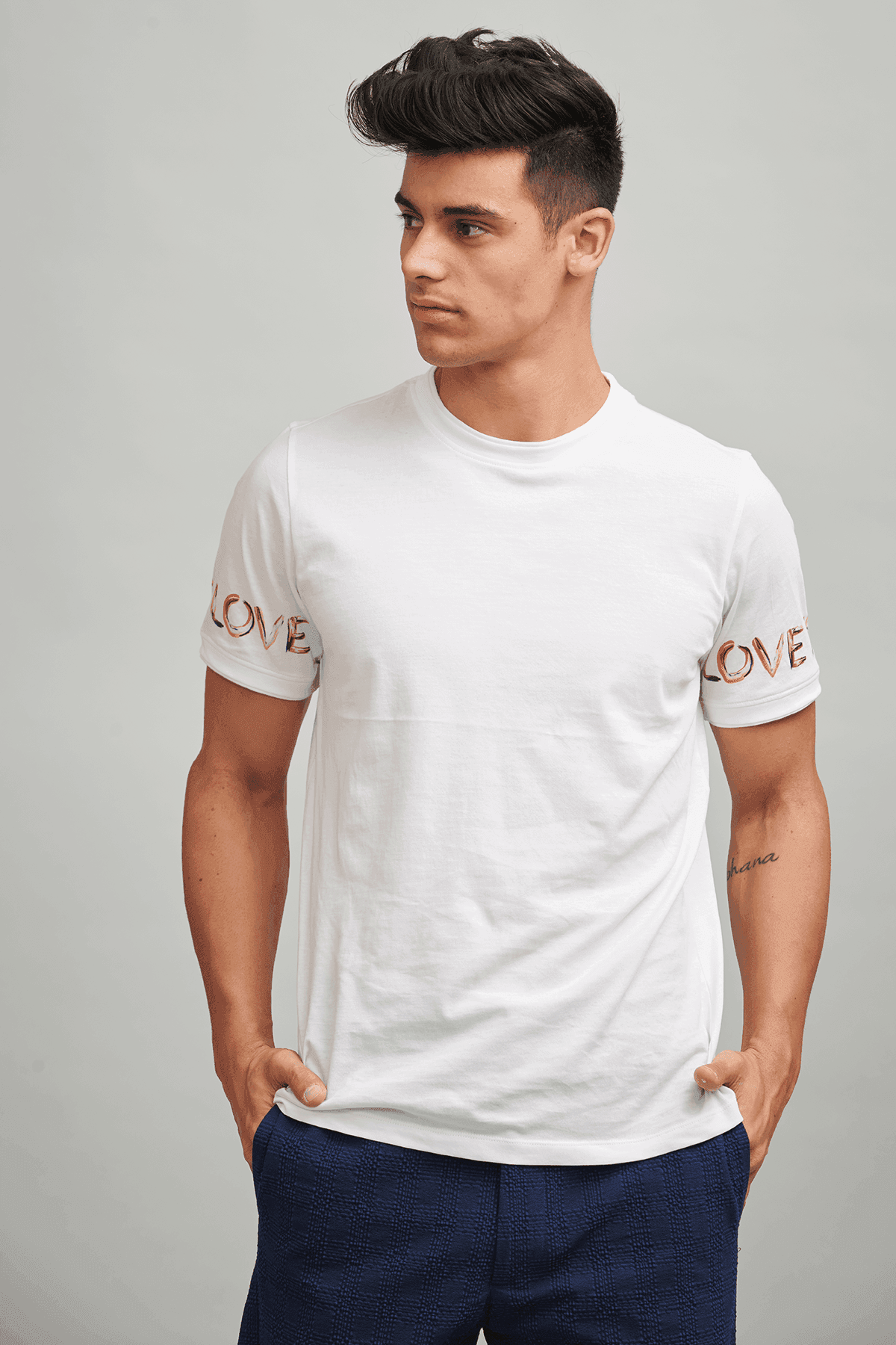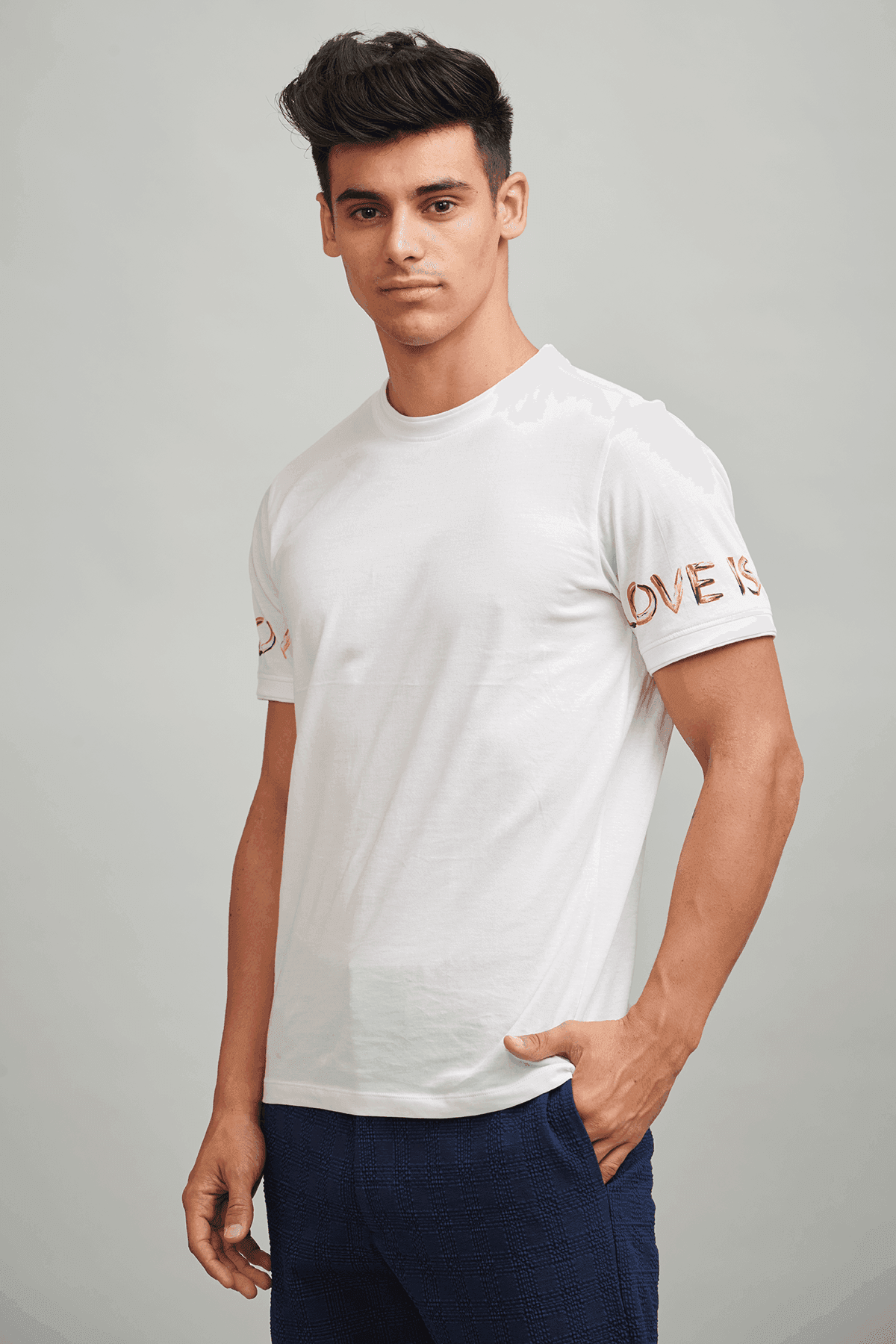 Basic short sleeve tee with multicolor 'LOVE IS LOVE' print on both sleeves. Tonal rib detail at neck and sleeve. Sustainably sourced organic cotton.