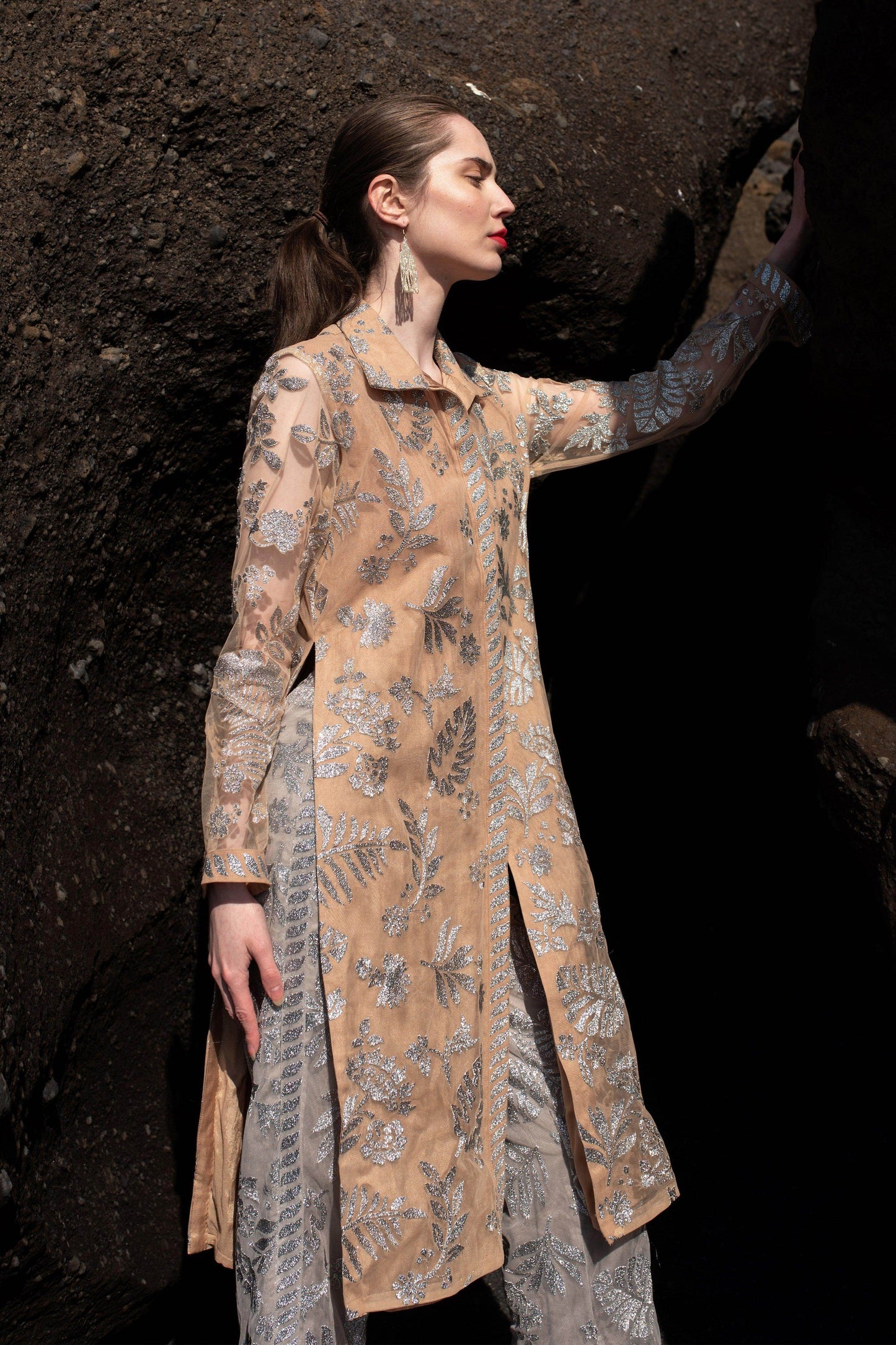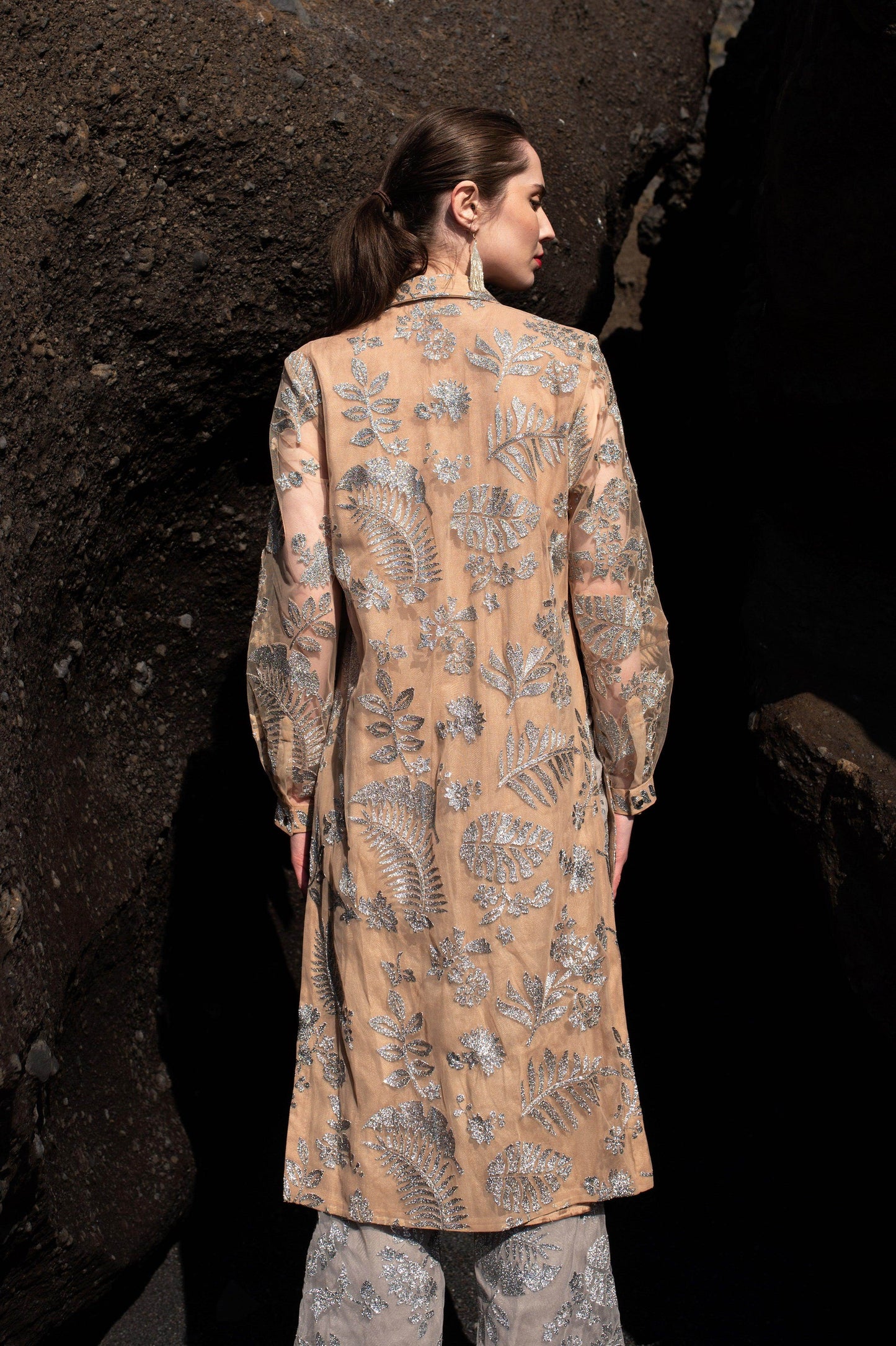 Soft nude tulle longline shirt with placed allover silver metallic thread embroidery in badla inspired stitches. Tropical themed motifs framed with geometric borders on the front placket and sleeve cuff. Waist-high slits on the sides of the shirt to show off the embroidery of the pants. Concealed button placket at the front and metallic button closure at the cuff. The back and front of the top are fully lined; sleeves are unlined.