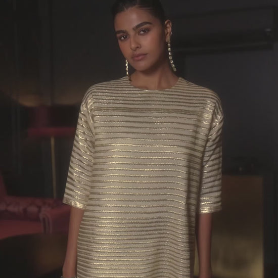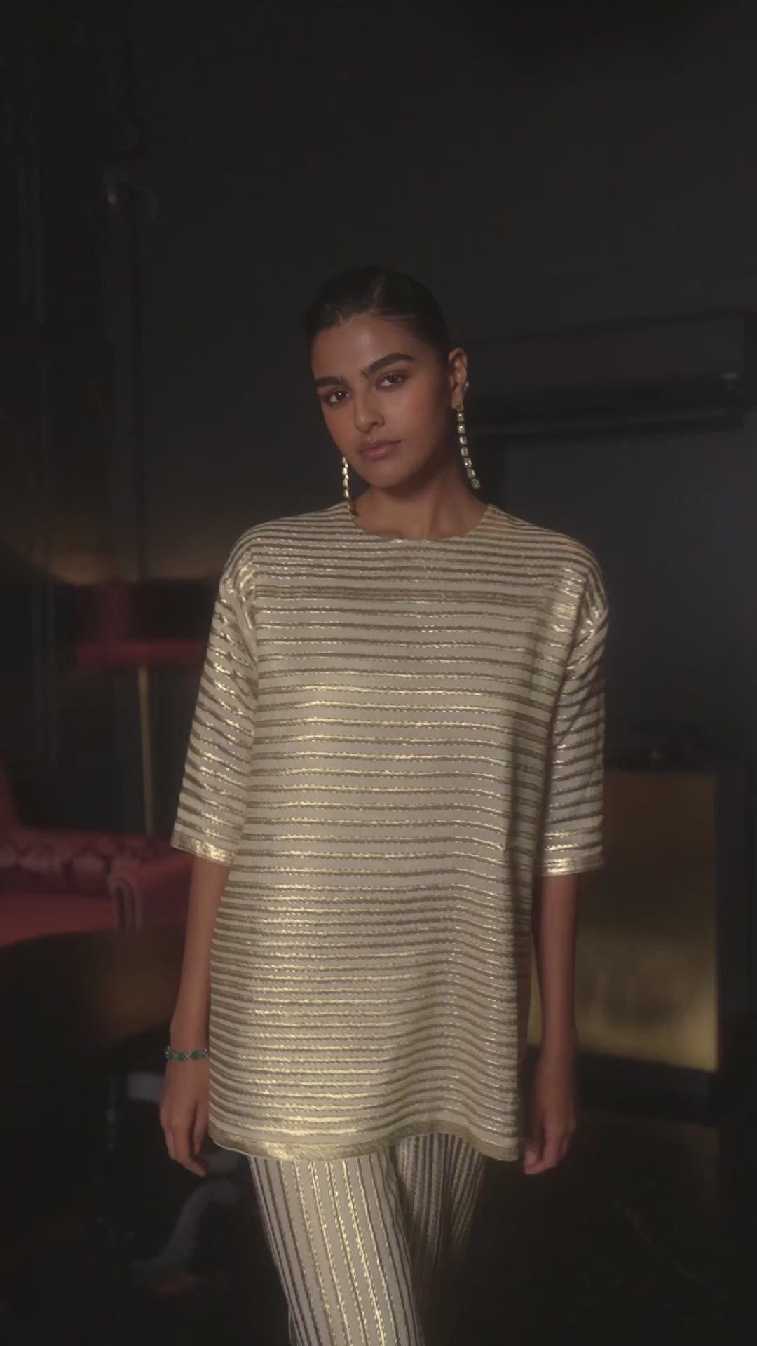 Relaxed fit top in metallic thread embroidery placed in variegated stripes, inspired by traditional gota ribbon work. Round neck with loop and metallic button closure at the back. Elbow-length sleeves with slits in the sides. Boxy fit. Garment is fully lined.