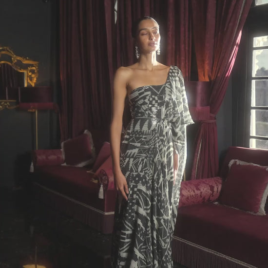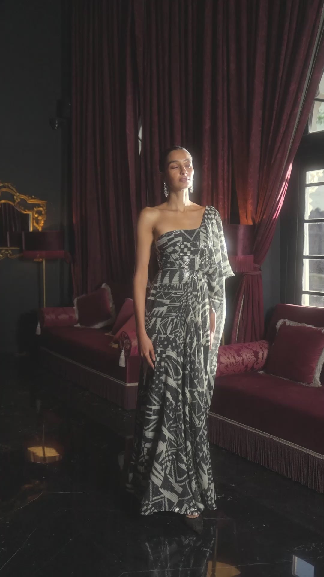 Sari-inspired drape gown in monochrome sequin embroidery with tribal-inspired geometric motifs in ivory and charcoal. Held together with a strap with a flowing drape panel over the wearer's left shoulder. Hand-applied pleats at the front open into a soft A-line flare towards the hem. Concealed side zip with hook/eye closure. Garment is fully lined. A statement gown ideal for cocktails, dinners, and galas.