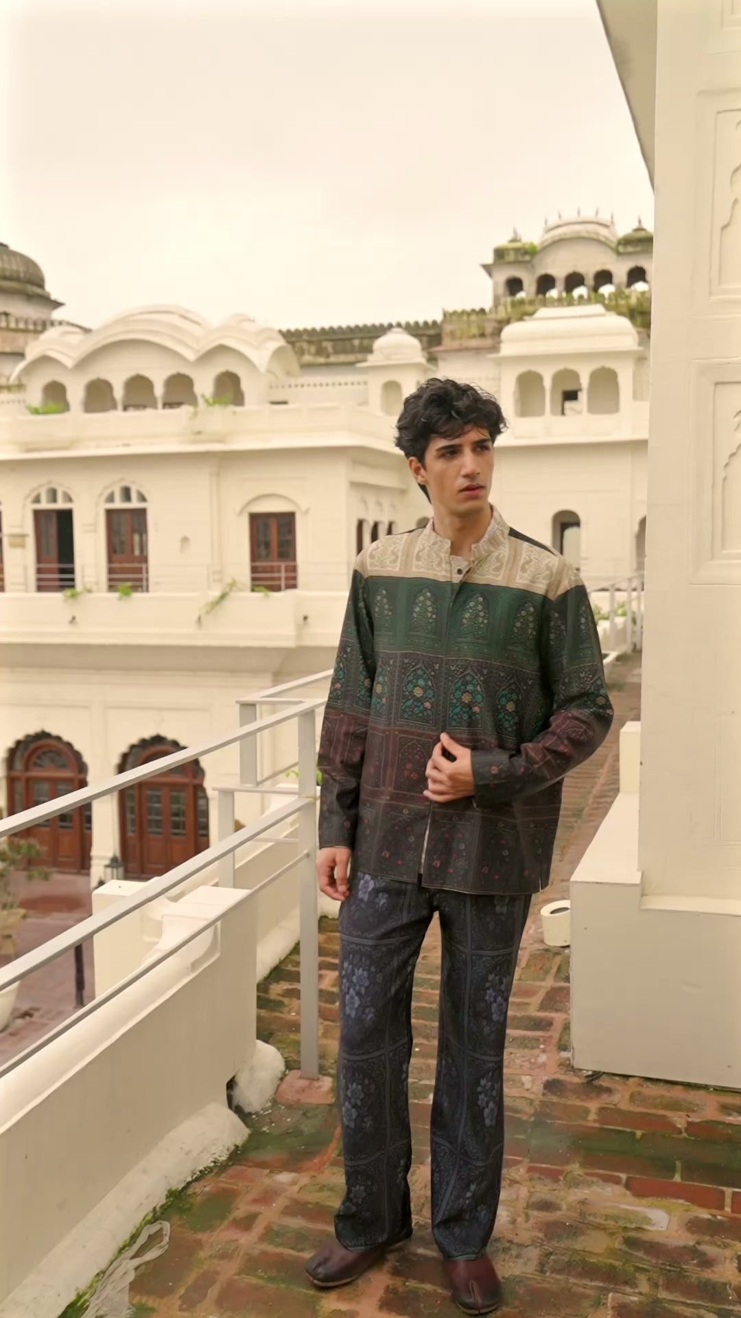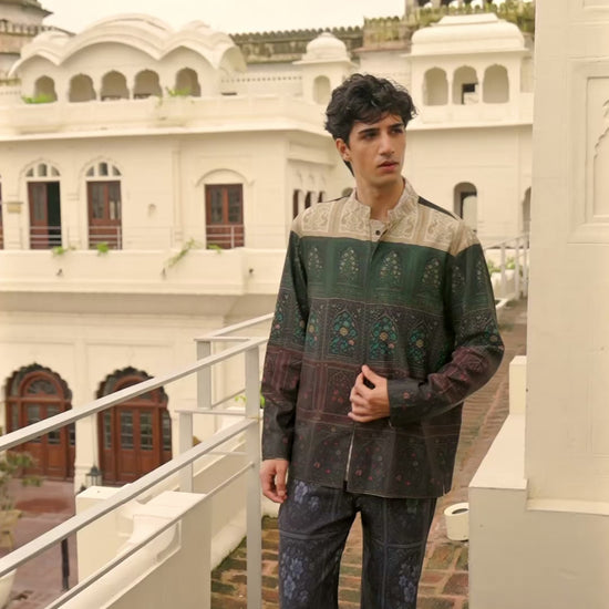 Relaxed fit shacket in a vivid Mughal-inspired floral panel print. Architectural arch motifs all over. Band collar with front button-down and concealed button placket. Straight fit with full sleeves in an all-over print. Can be worn as a standalone shirt or layered as a lightweight jacket.