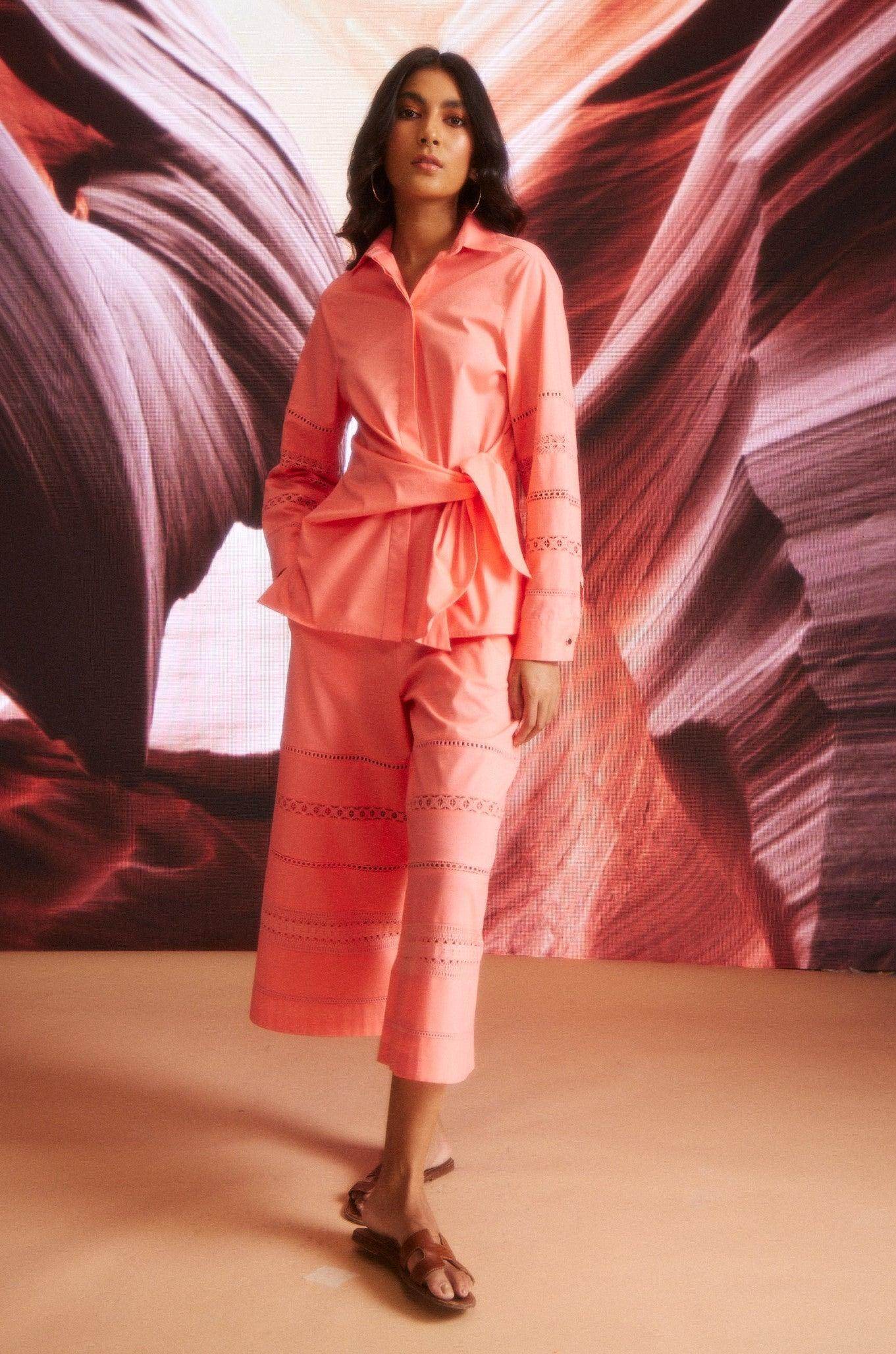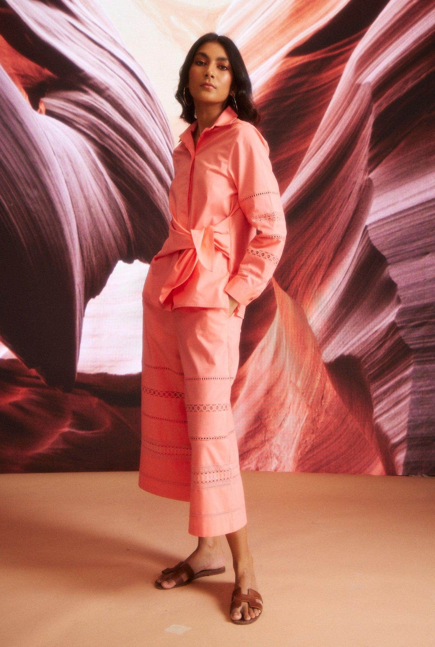 Pink cotton poplin coord set. Placed tonal lace inserts on the sleeves and pants. Button down full sleeves shirt with self-tie knot on the side. Paired with matching culottes, elasticated at the waist and pockets on the side.
