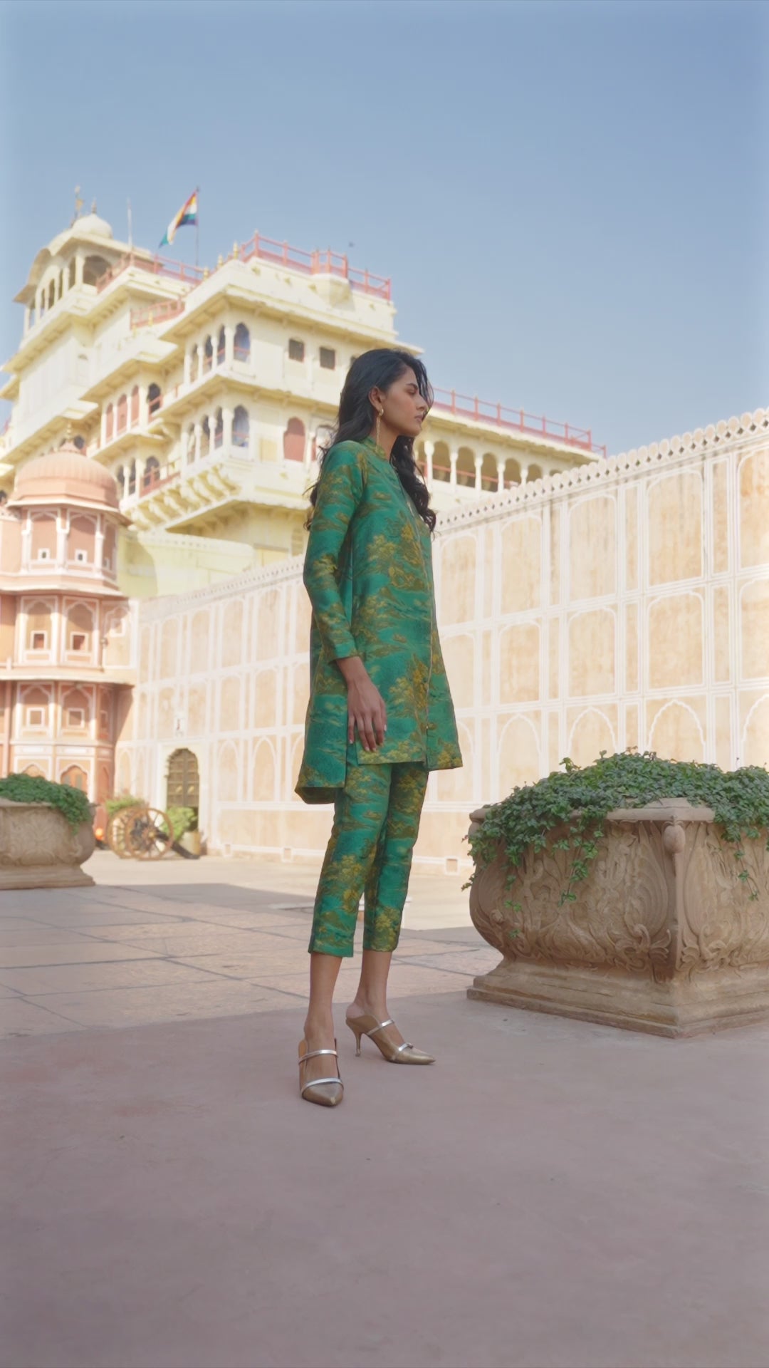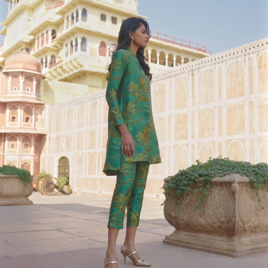 Band collar longline in a luxurious green tonal patterned jacquard weave fabric. Gold zipper with a signature puller in the front. V-neck and full sleeves. Unlined with a structured yet relaxed fit.