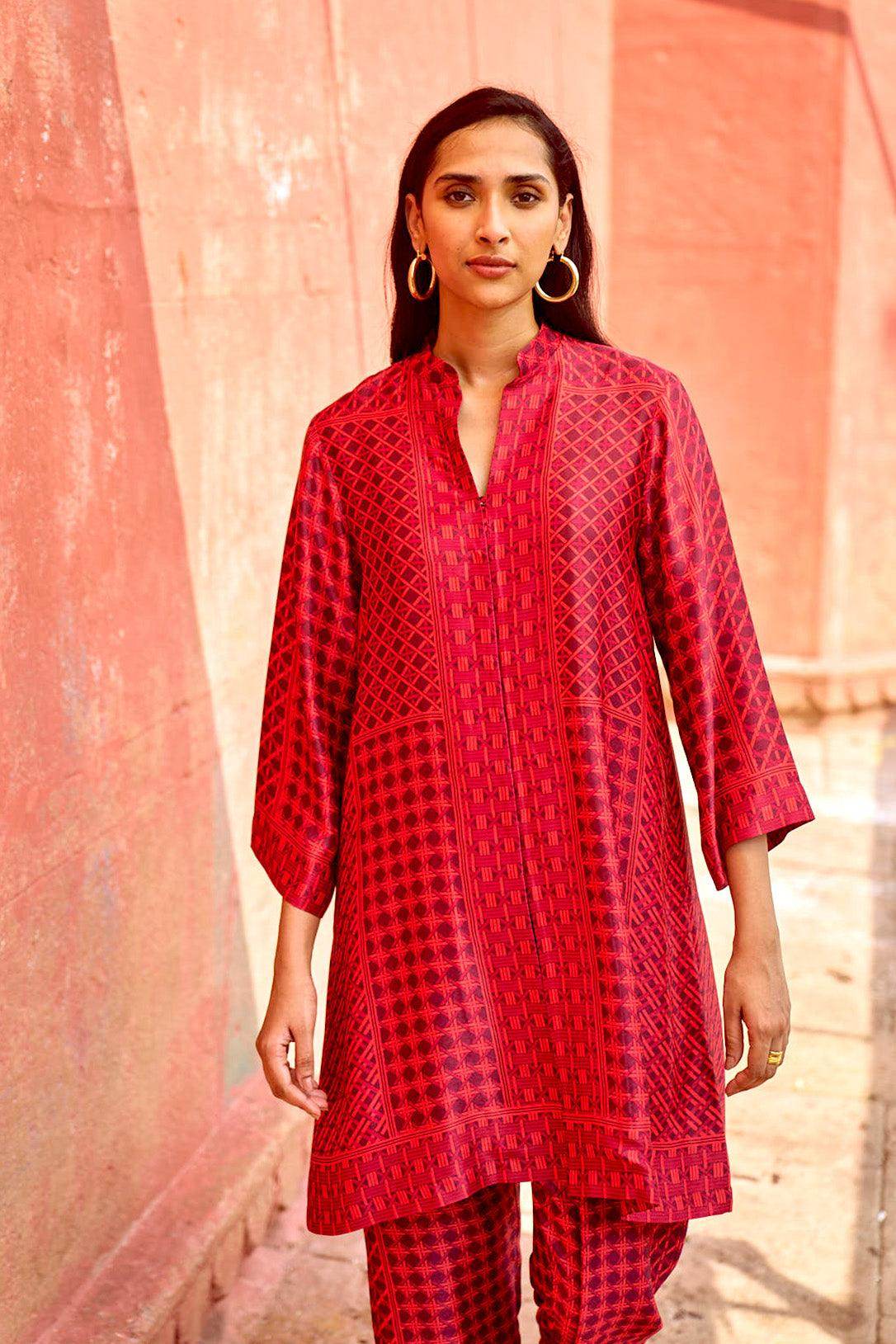 Printed full sleeved longline top in tones of red. Allover printed in placed patterns inspired by rattan weaves. Band collar. Hook and eye closure at the front. Relaxed fit. Can be worn as a top or a jacket. Paired with matching pants with an elasticated waist and pockets on the side. Relaxed fit.