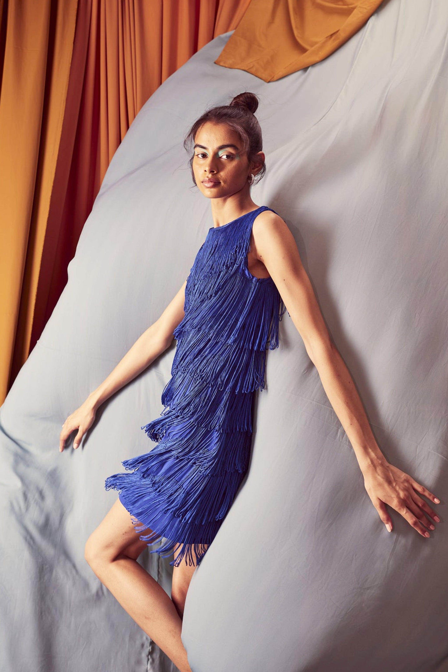 Layered fringe dress in royal blue. Keyhole at the back. Zipper on the side.