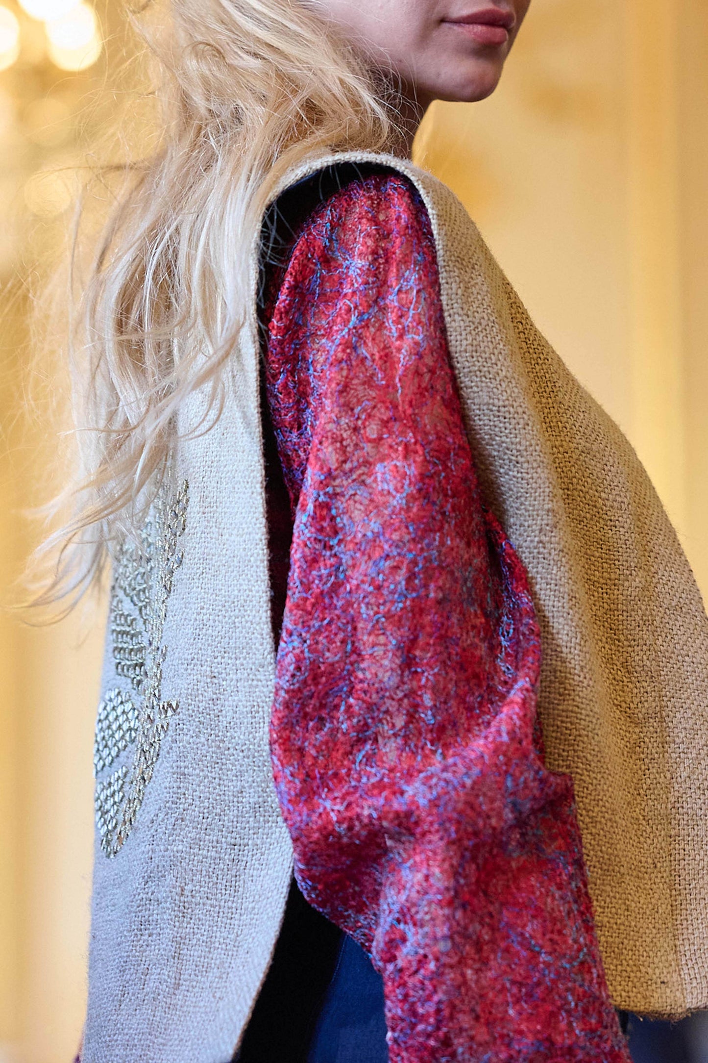 Hand-made textile, using an embroidery technique with overrun sewing thread. Button-down shirt with front placket and metallic stud buttons. The front and back are opaque, bishop style sleeves are semi-sheer. Each piece is unique.