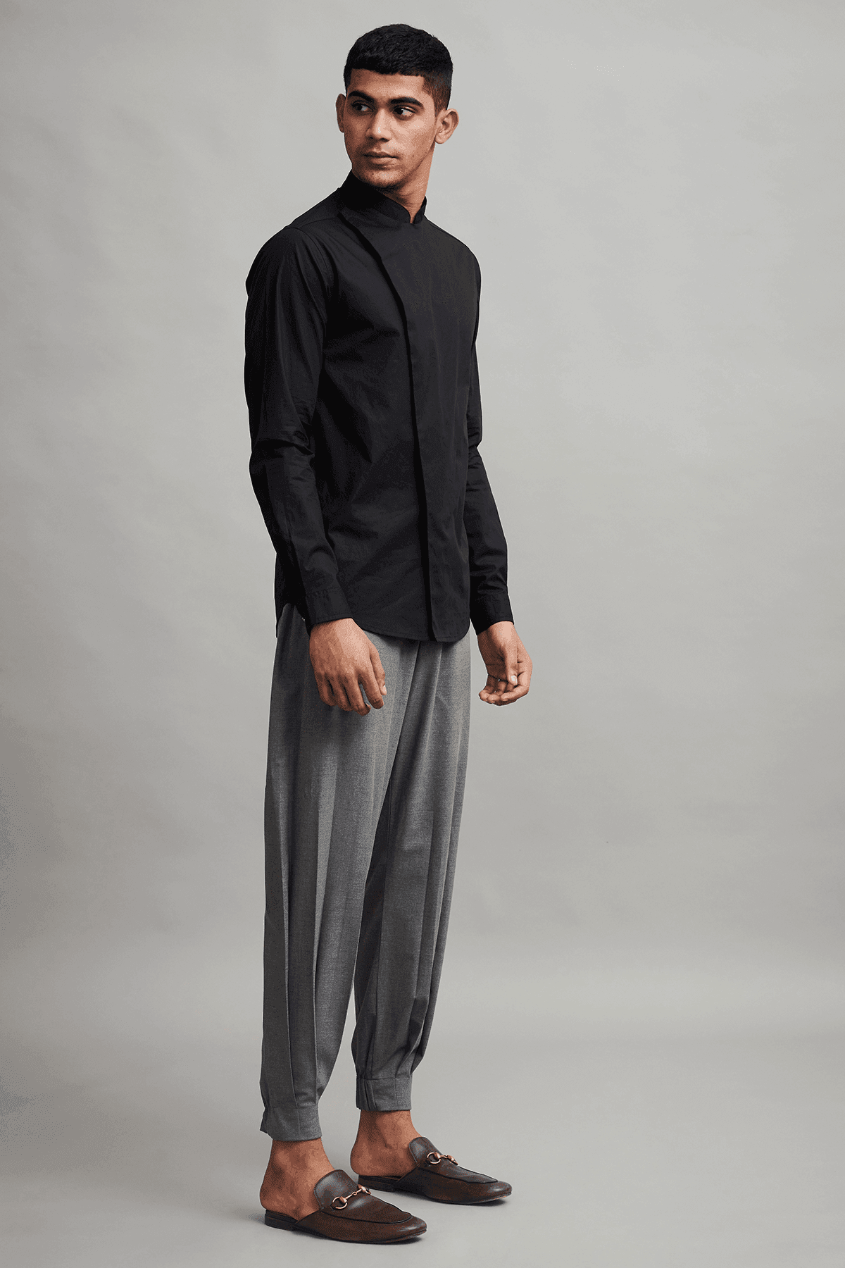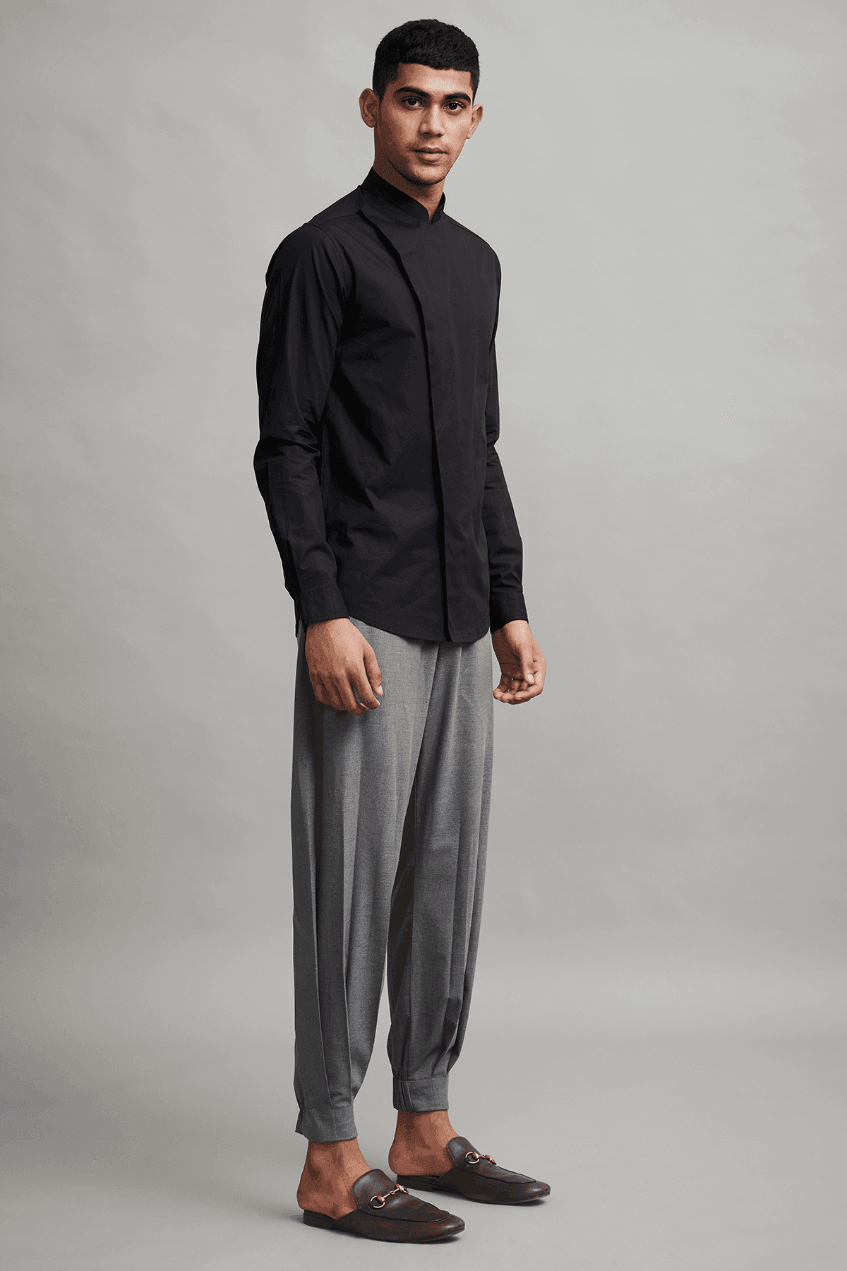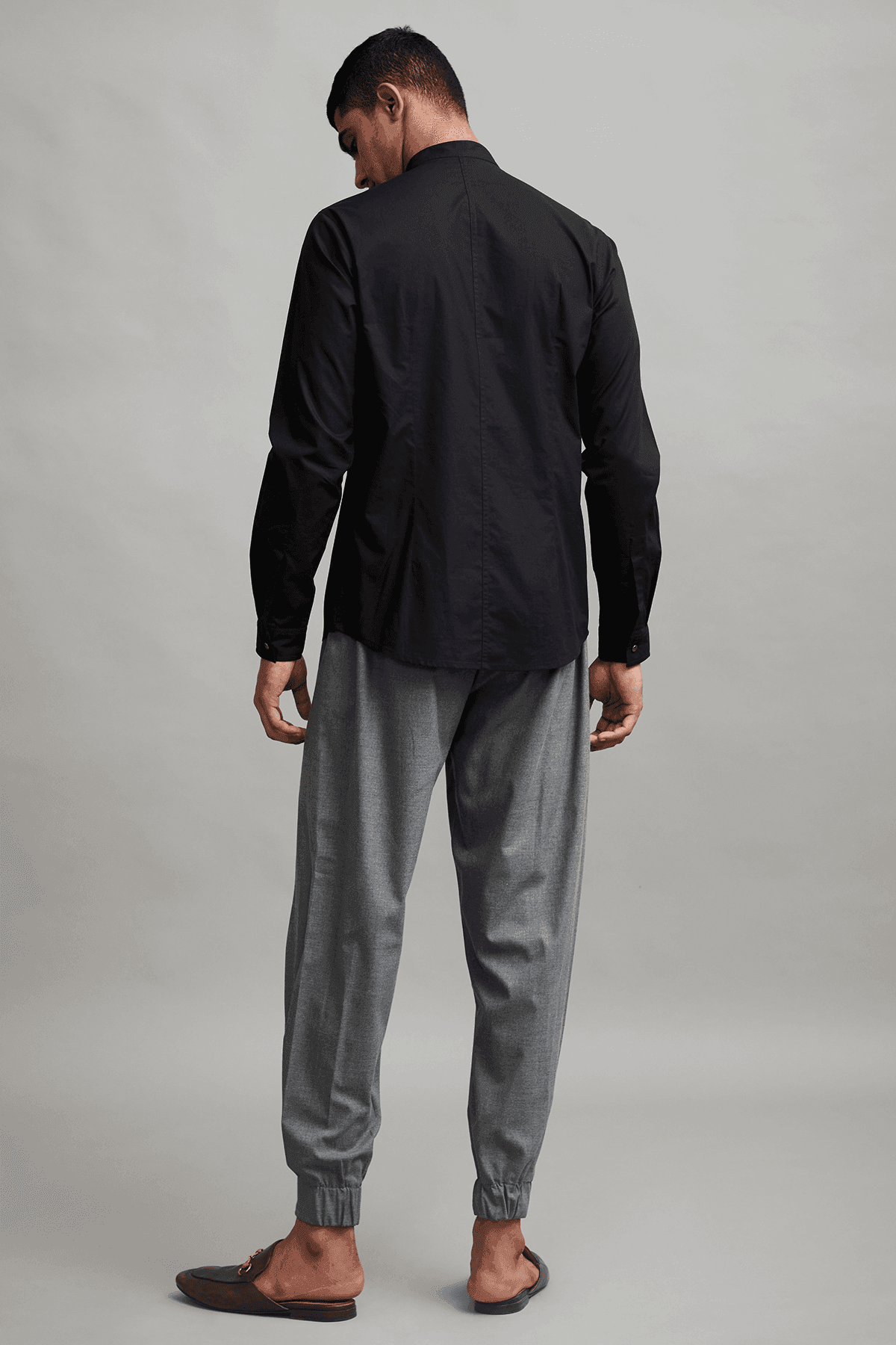Band collar. Asymmetric placket, slight front overlap. Concealed buttons. Regular fit poplin shirt