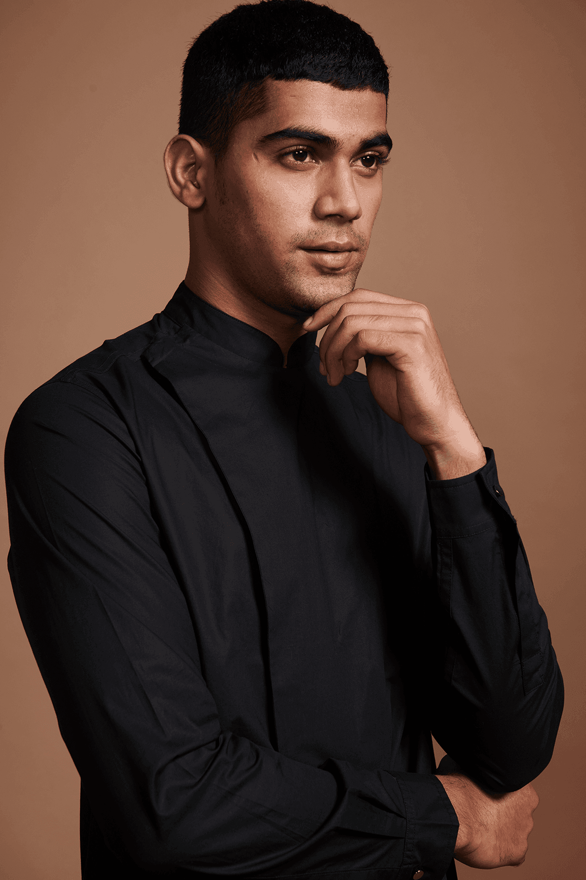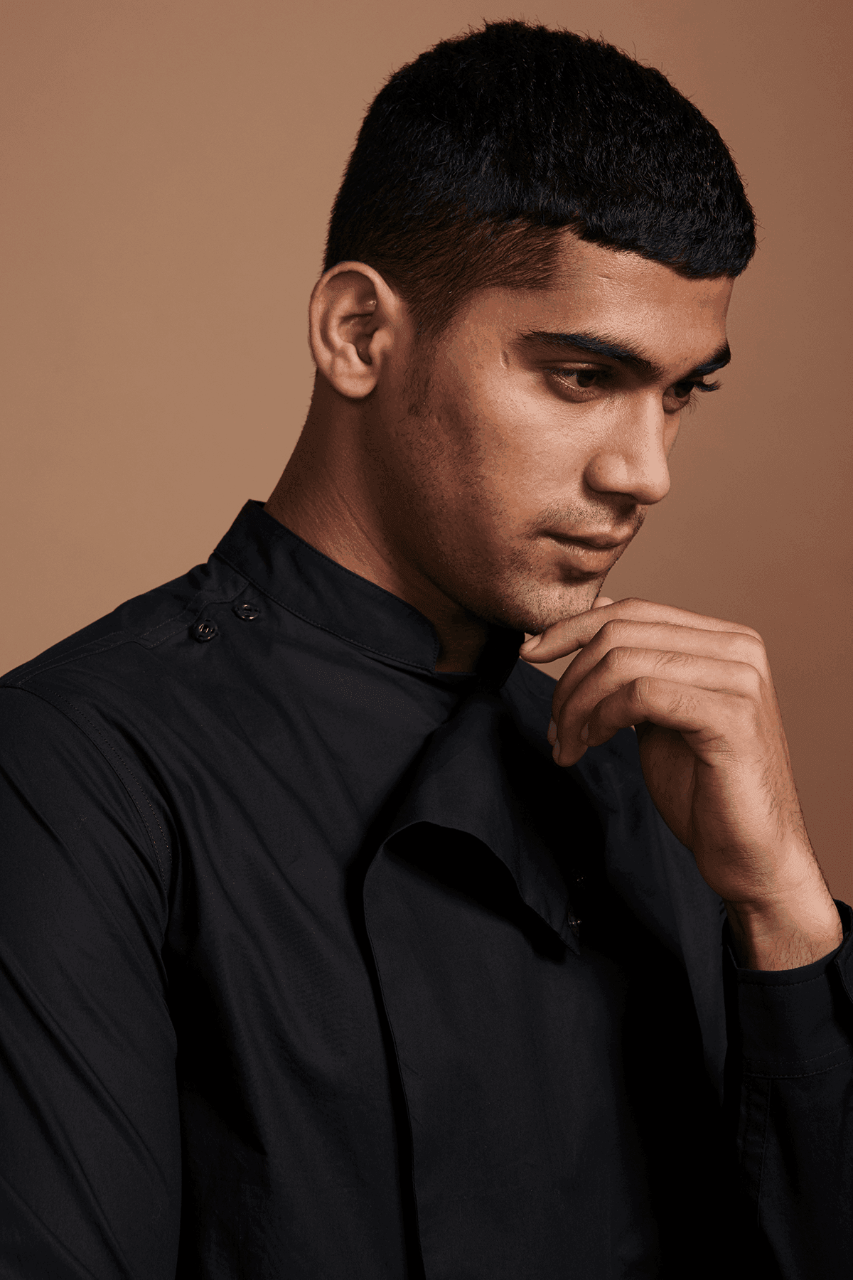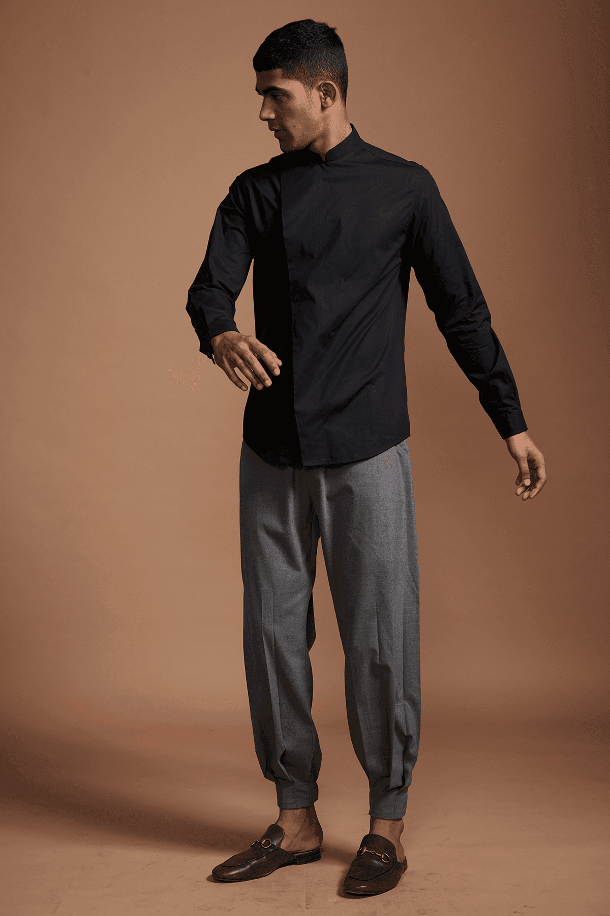 Band collar. Asymmetric placket, slight front overlap. Concealed buttons. Regular fit poplin shirt