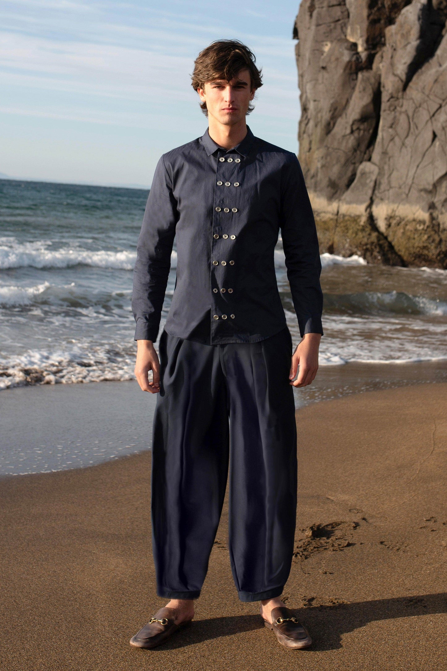 Navy full-sleeve cotton poplin shirt. Three rows of metallic show buttons down the center front to create an exaggerated button placket. Concealed snap button closure at front placket with metallic button closures on the sleeve cuffs. Regular fit.