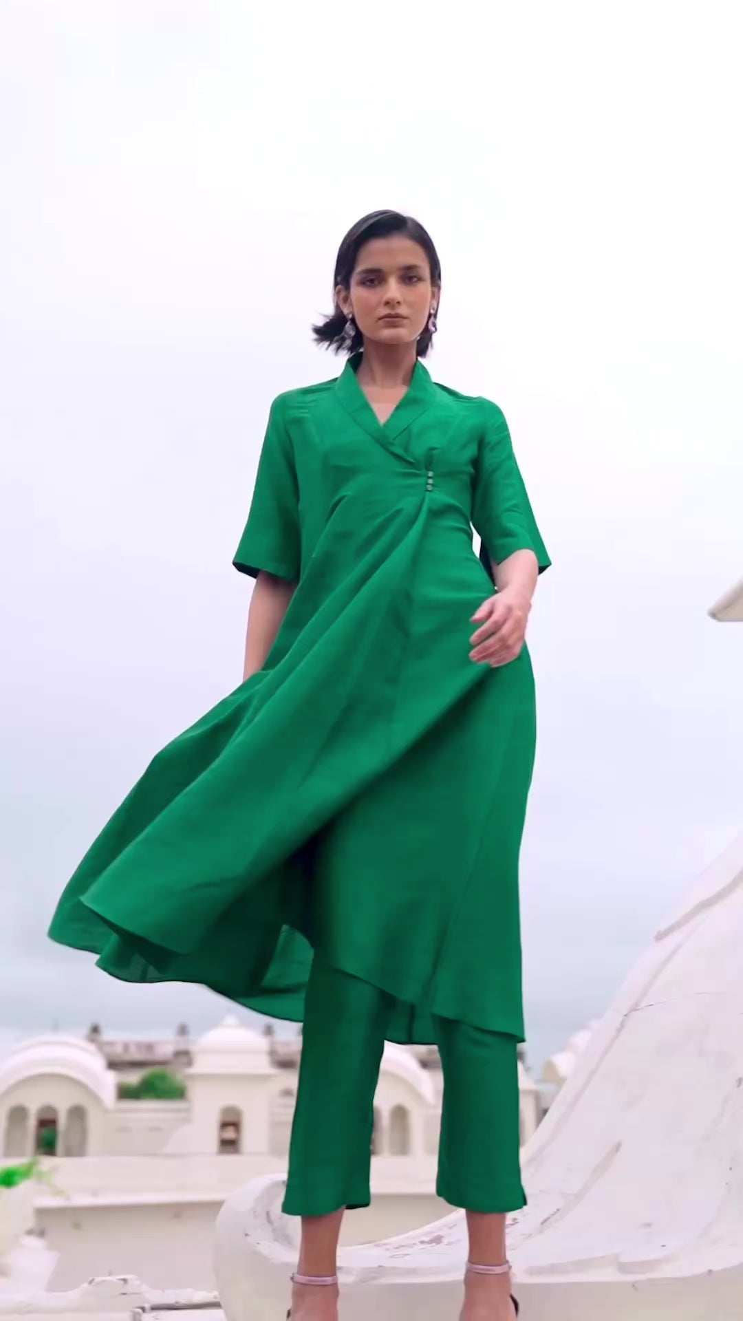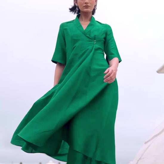 Blazer-inspired longline top in emerald organic viscose dupion with a raw silk textured finish. Shawl collar with an off-center fabric button closure and front overlap. A-line, cut in vertical panel that flares towards the hem. Half sleeves with cuffs lined in royal blue for a pop of contrast when turned up.