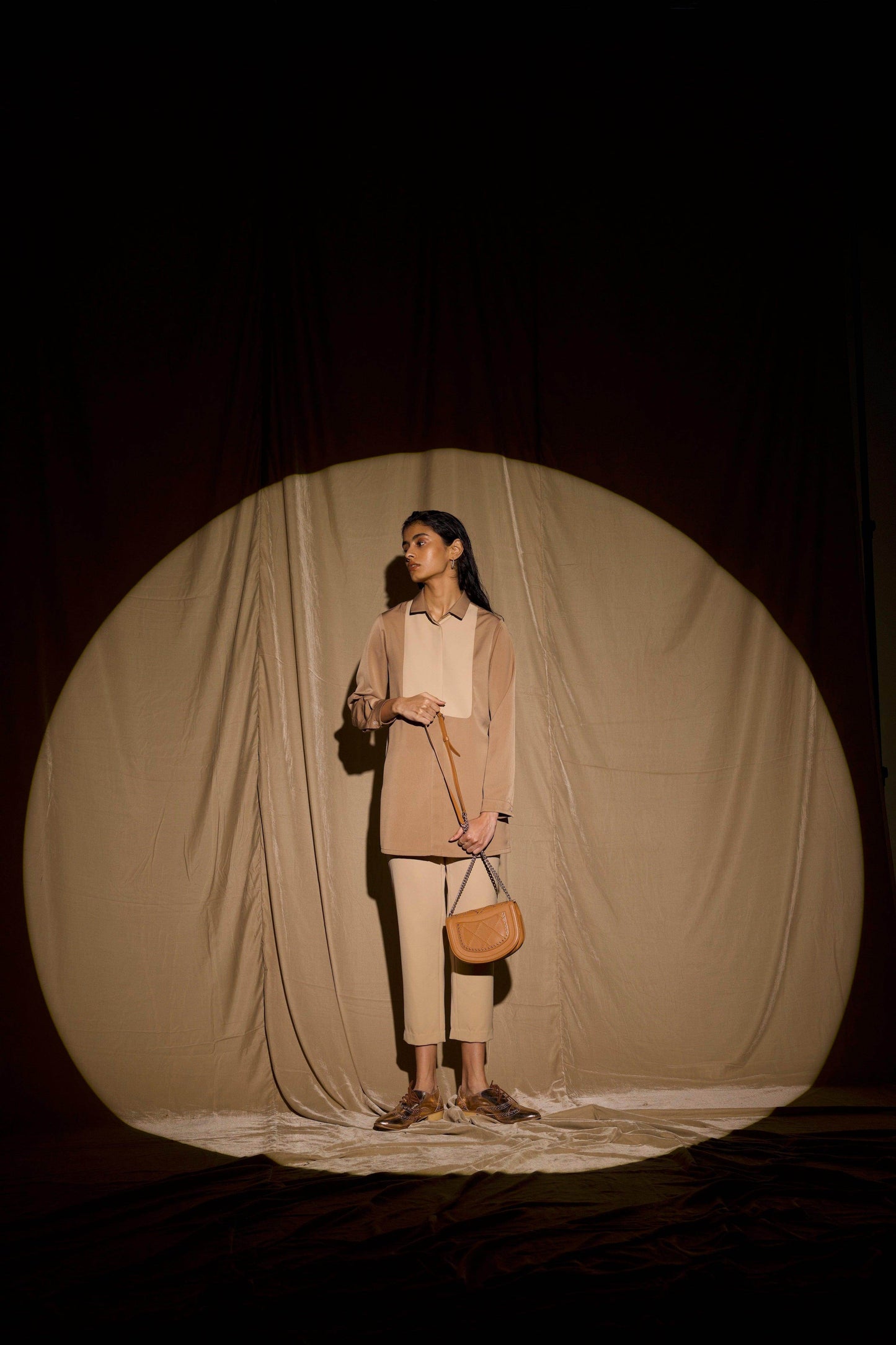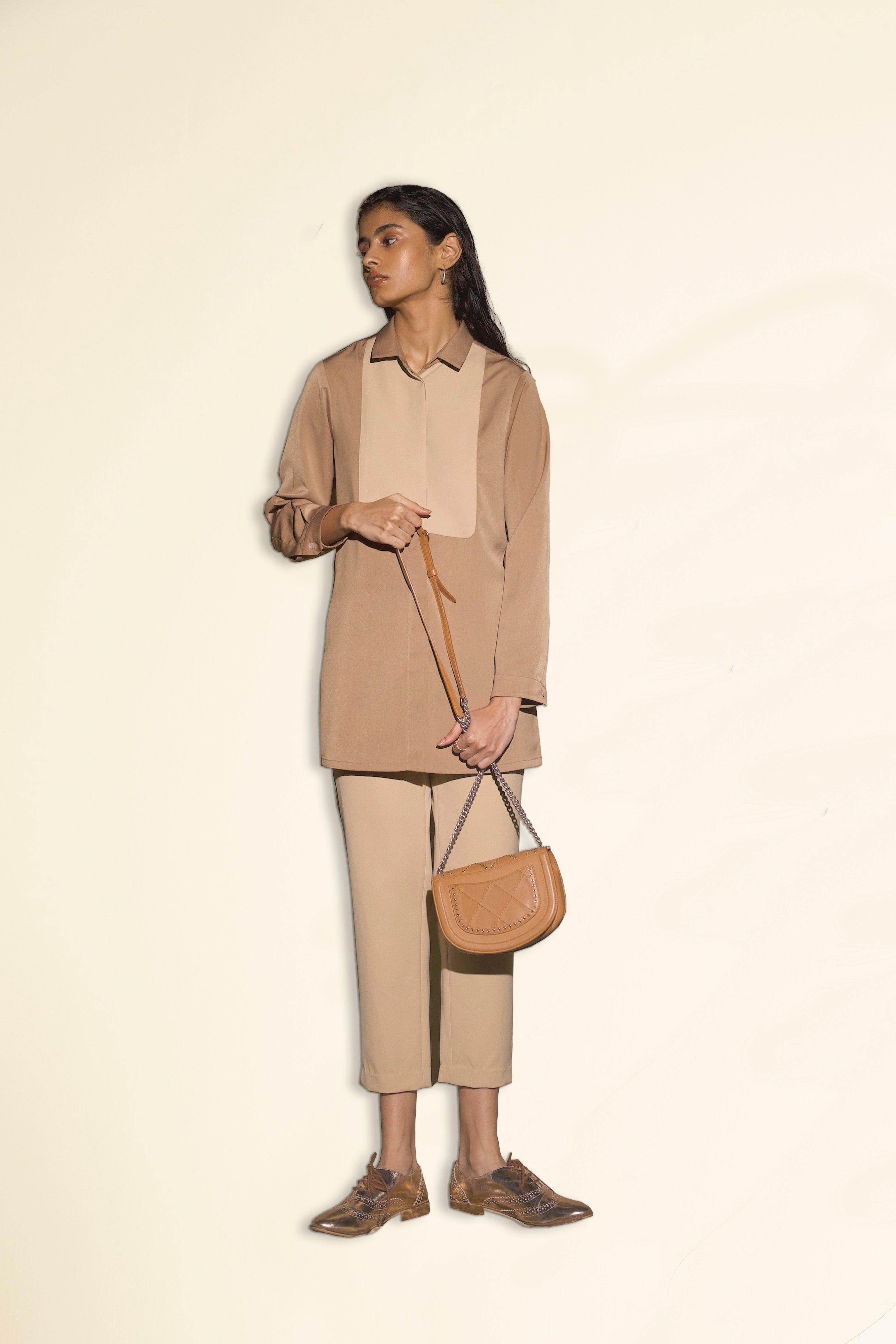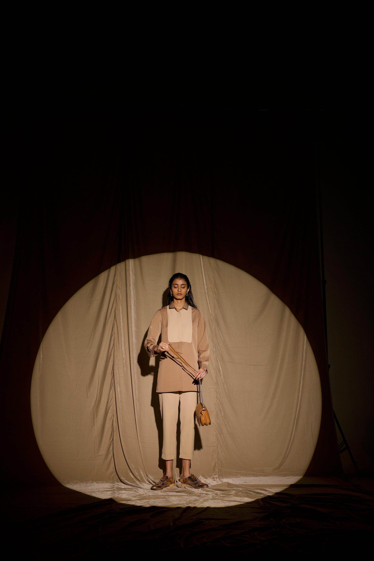 Beige pant with contrast khaki stripes down the sides. Straight fit.