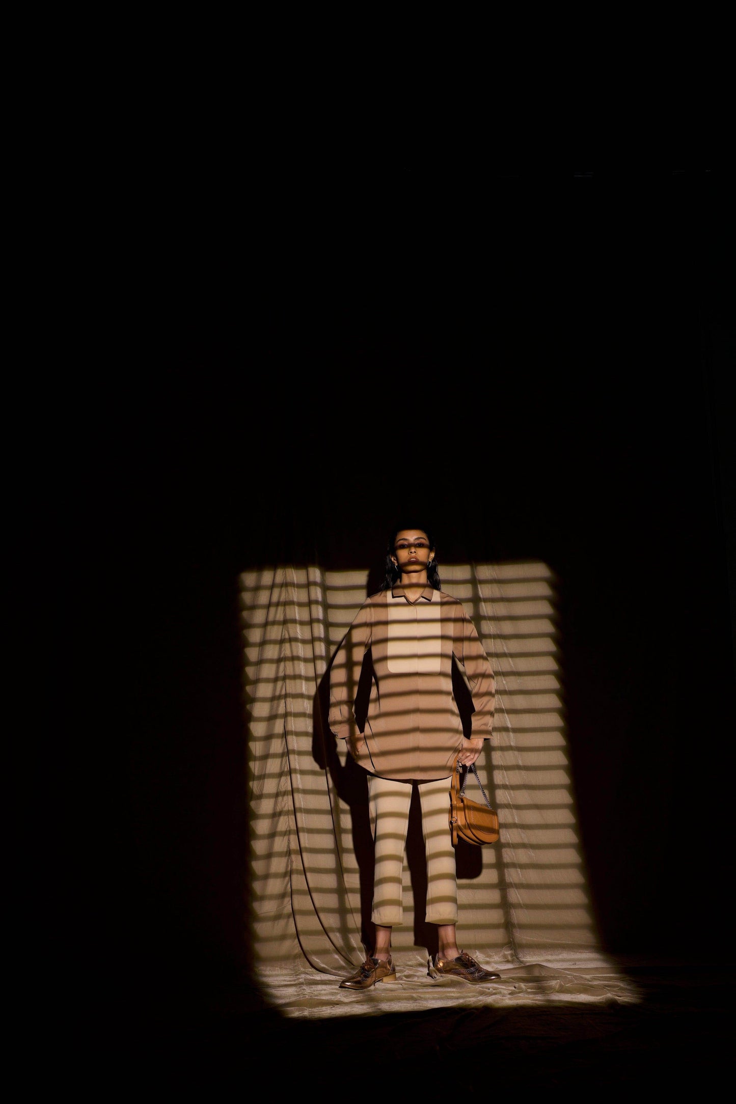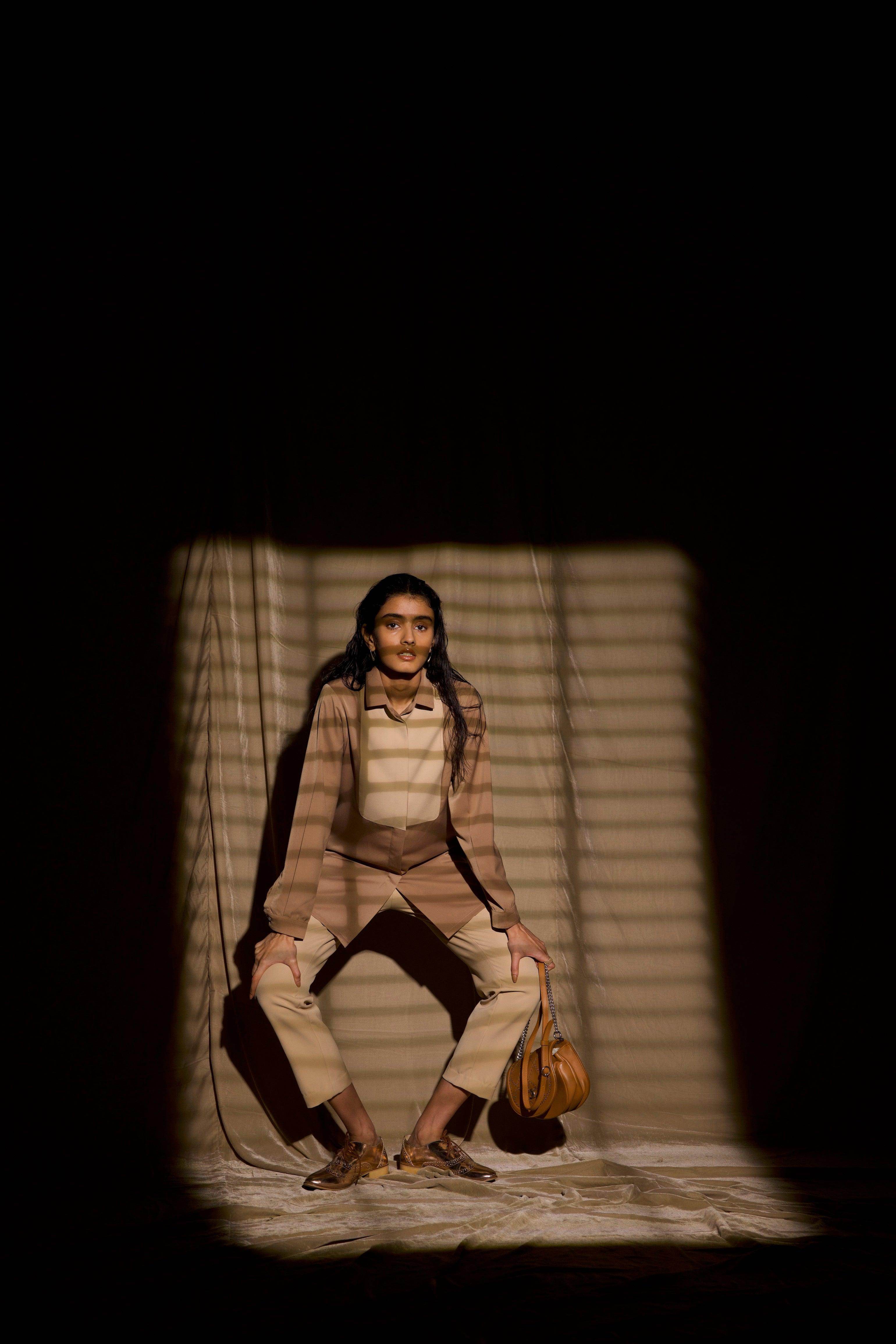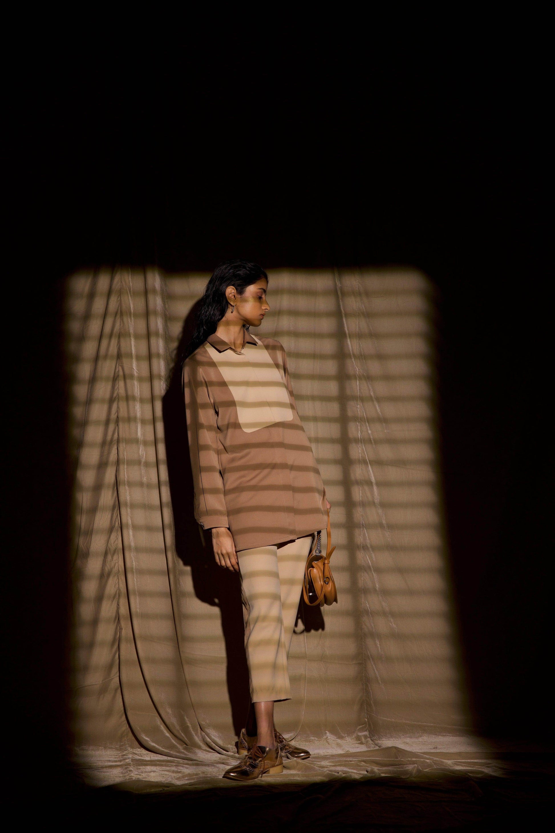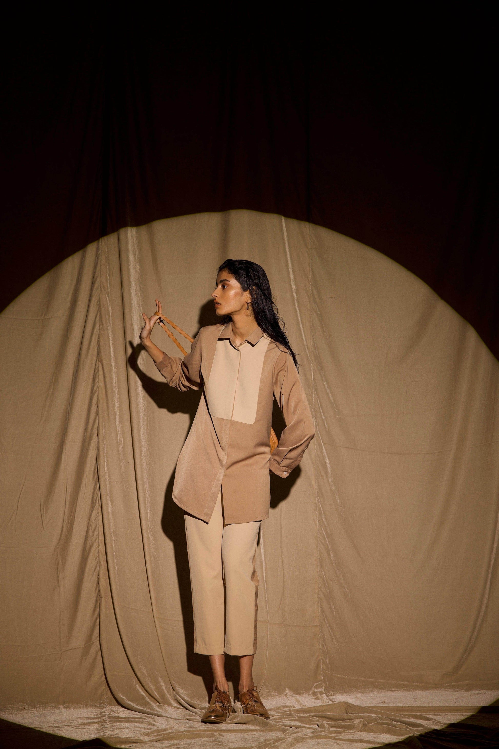 Beige pant with contrast khaki stripes down the sides. Straight fit.