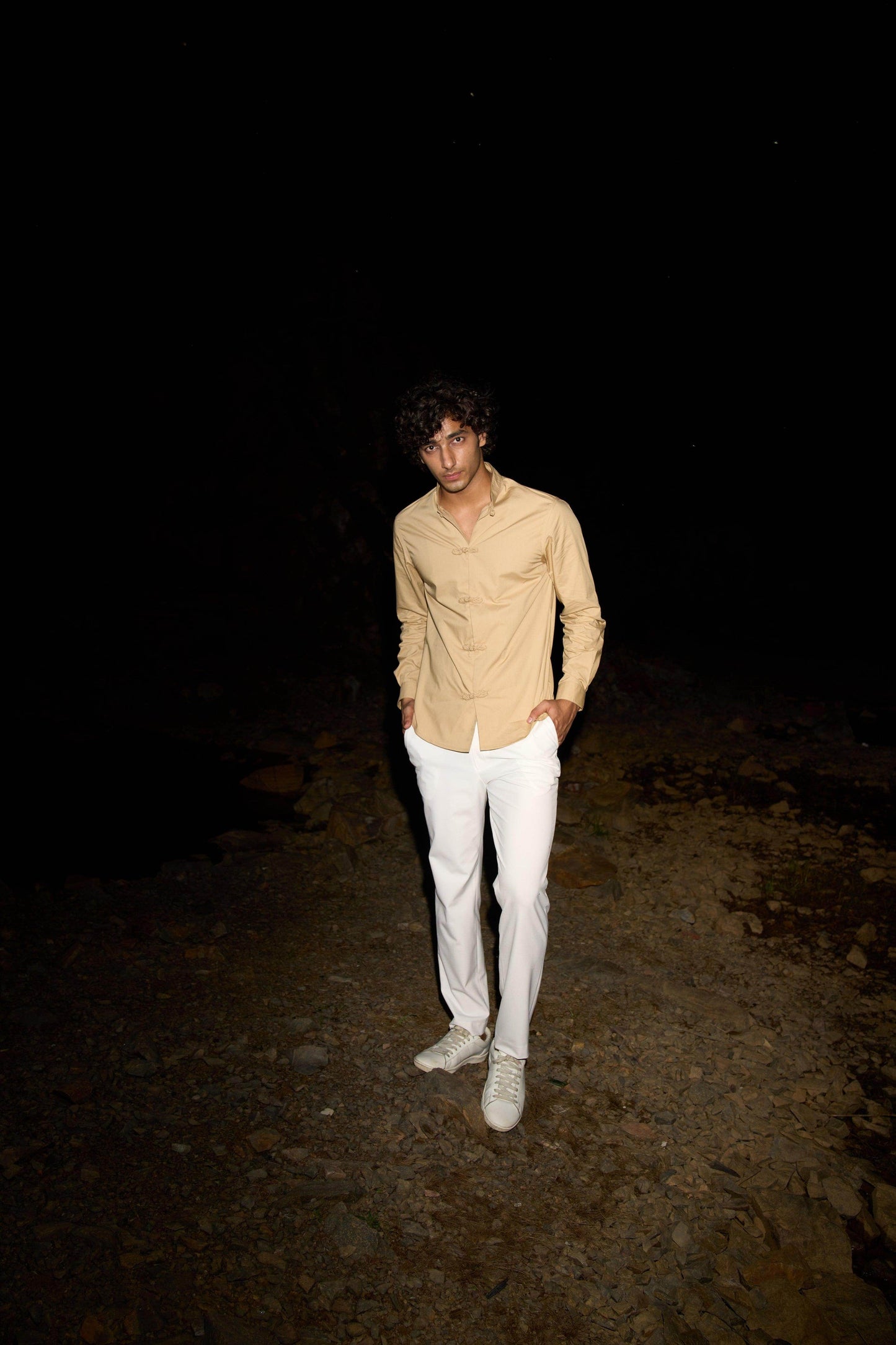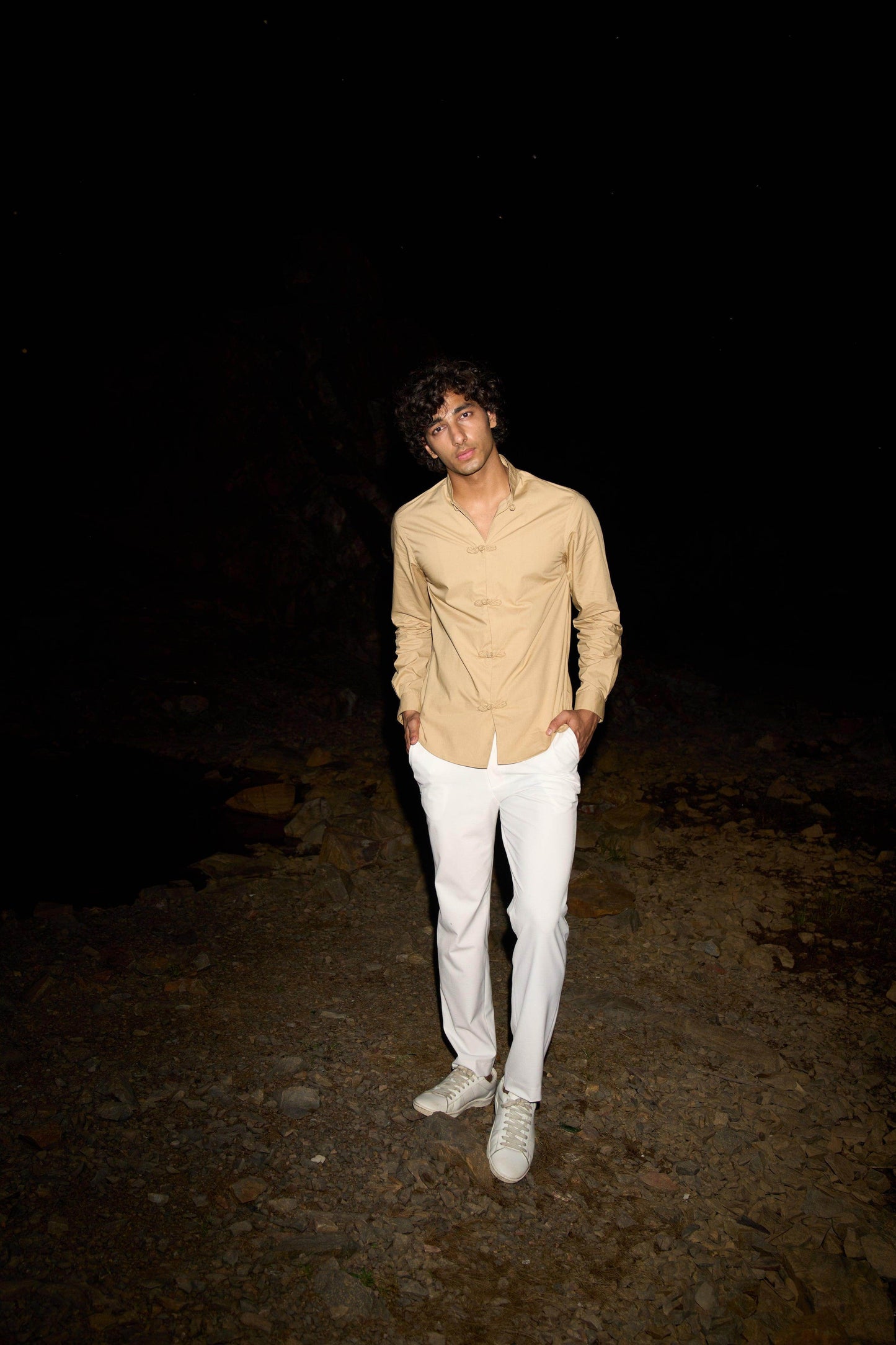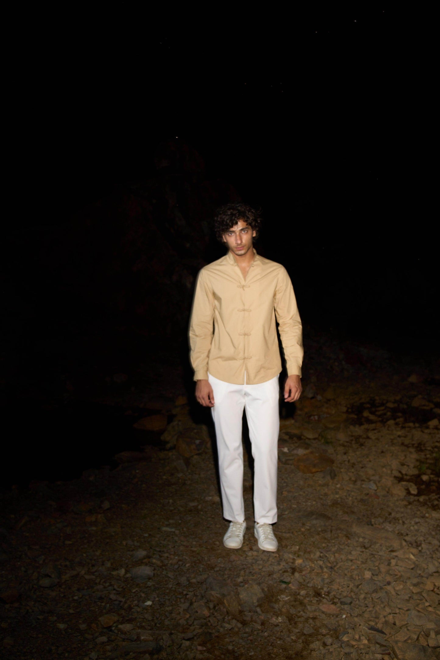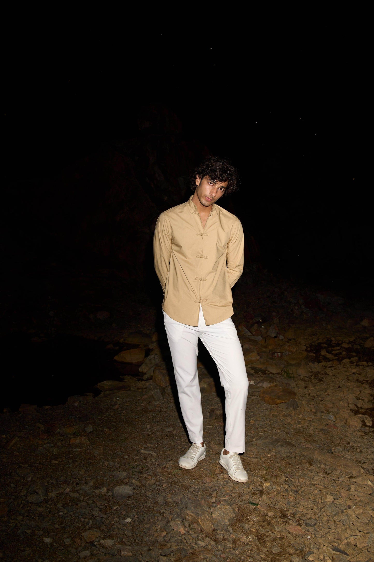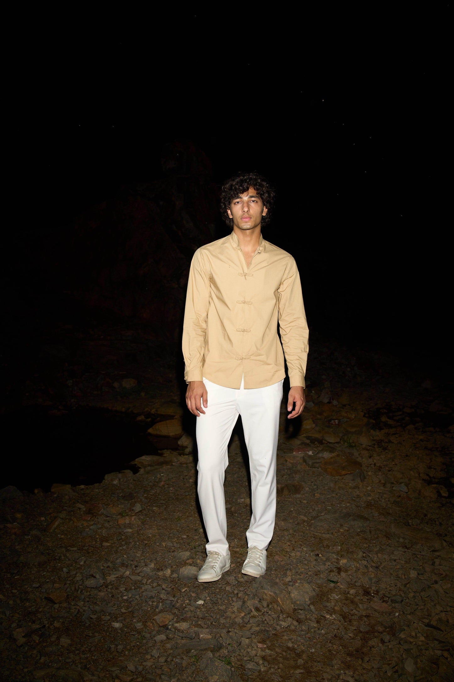 Beige band collar full sleeve shirt. With oriental style hand-knotted buttons and loop detailing. Regular fit poplin shirt.