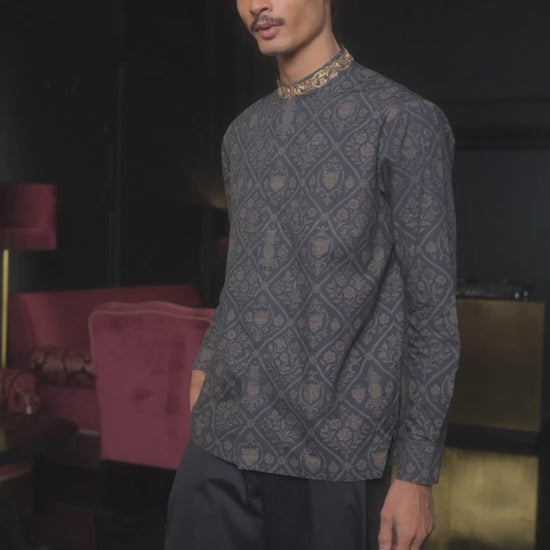 Straight fit shirt in a slate blue base patterned with lattice florals, pineapple emblems, and feline motifs. Zardozi embroidered band collar with hand-done gold dori work. Concealed button down placket. Full sleeves.