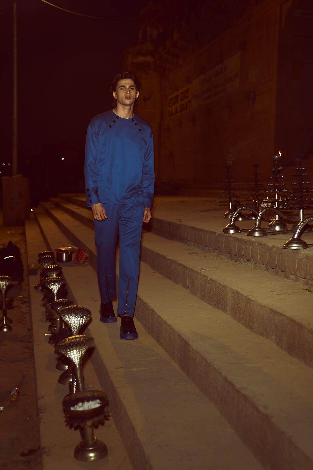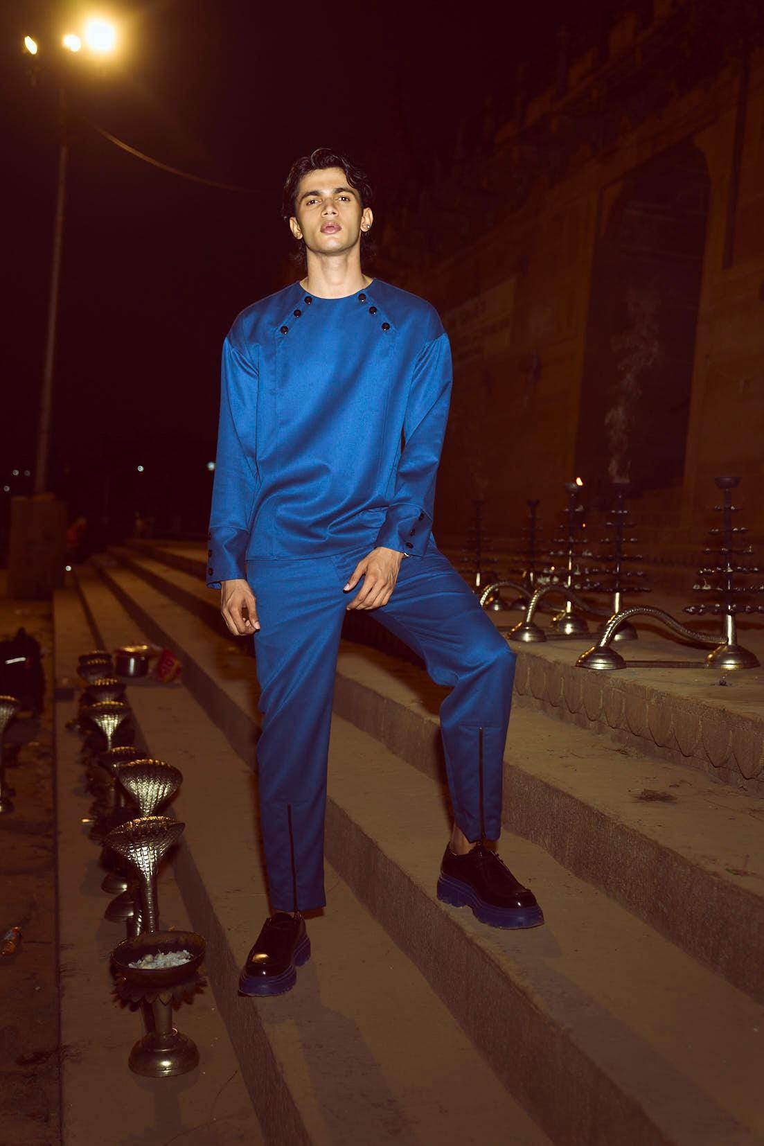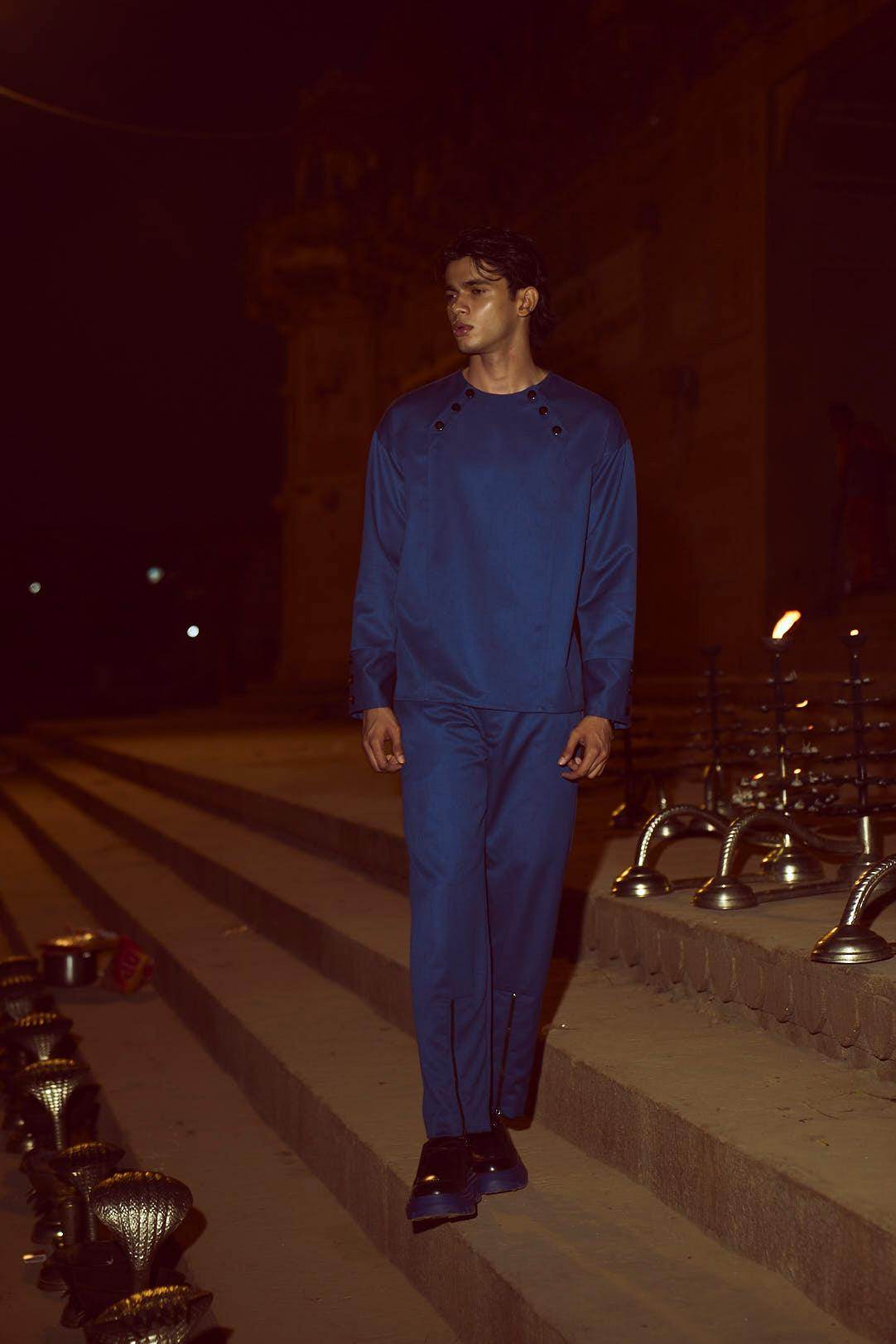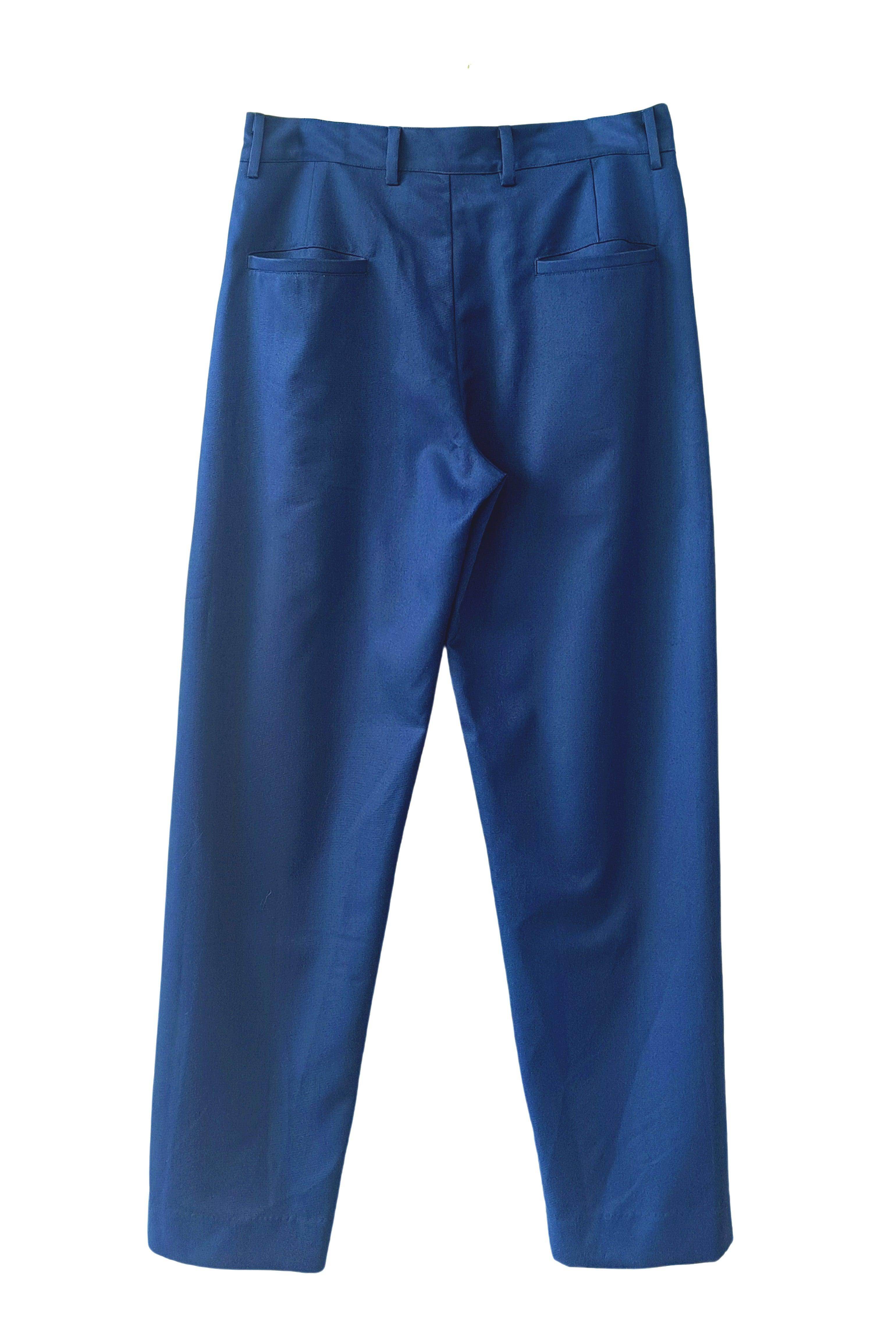 Blue pants in all weather suiting material. Zip at the cuffs. Wear it 2 ways, zipped up for a straight fit, or unzipped for wide-leg. Pockets on the side and back. Hook and zip closure at the front. Belt loops.